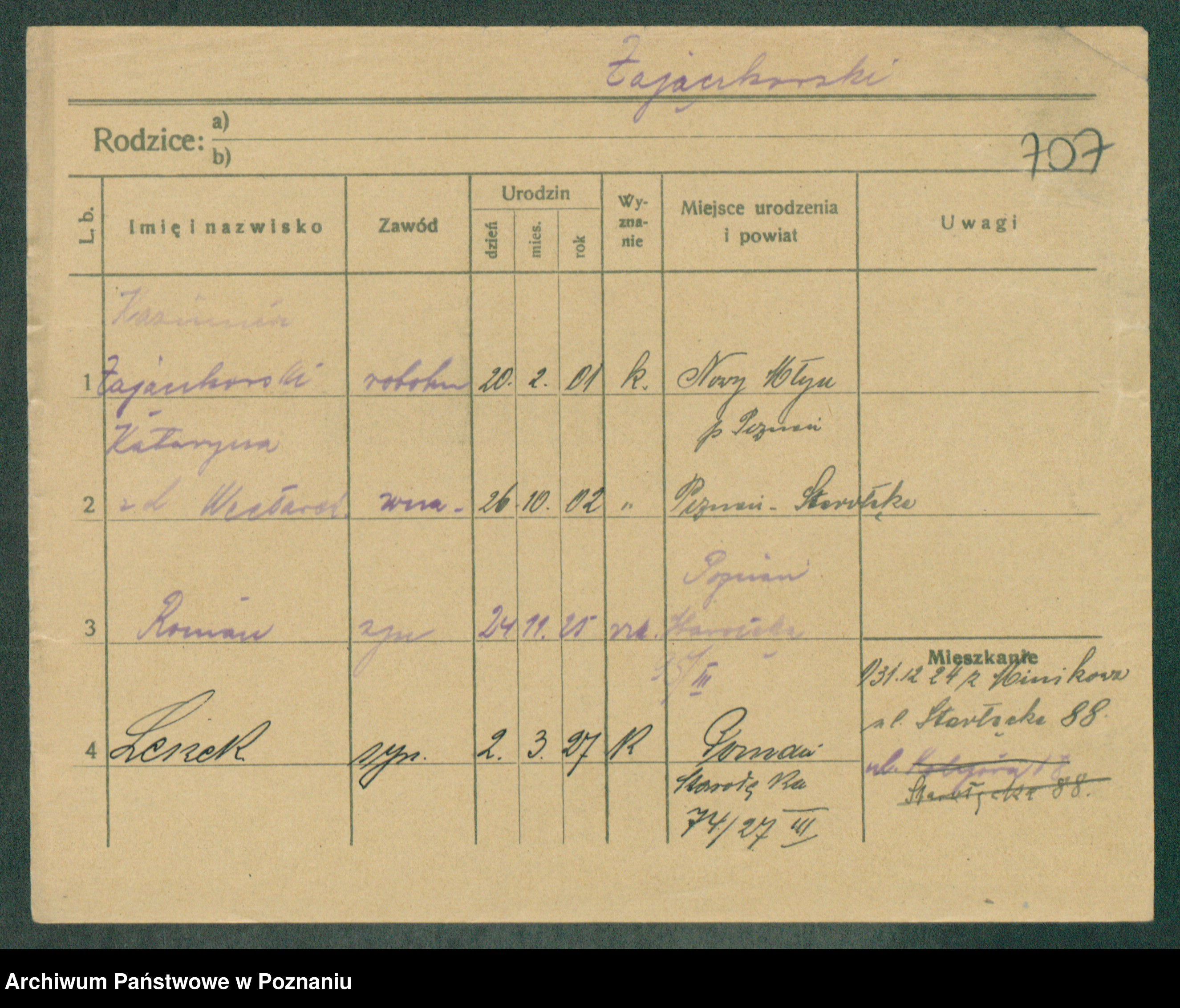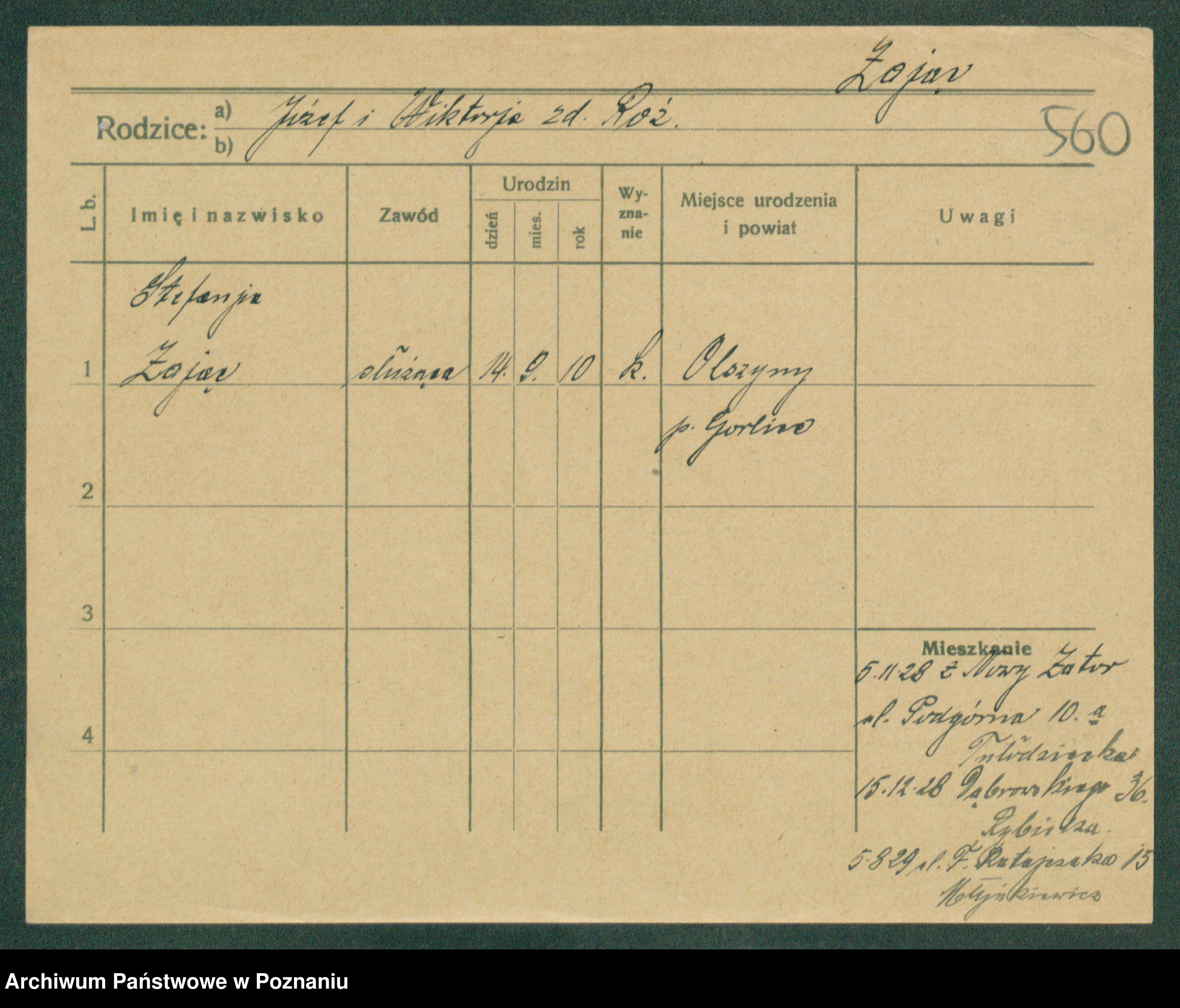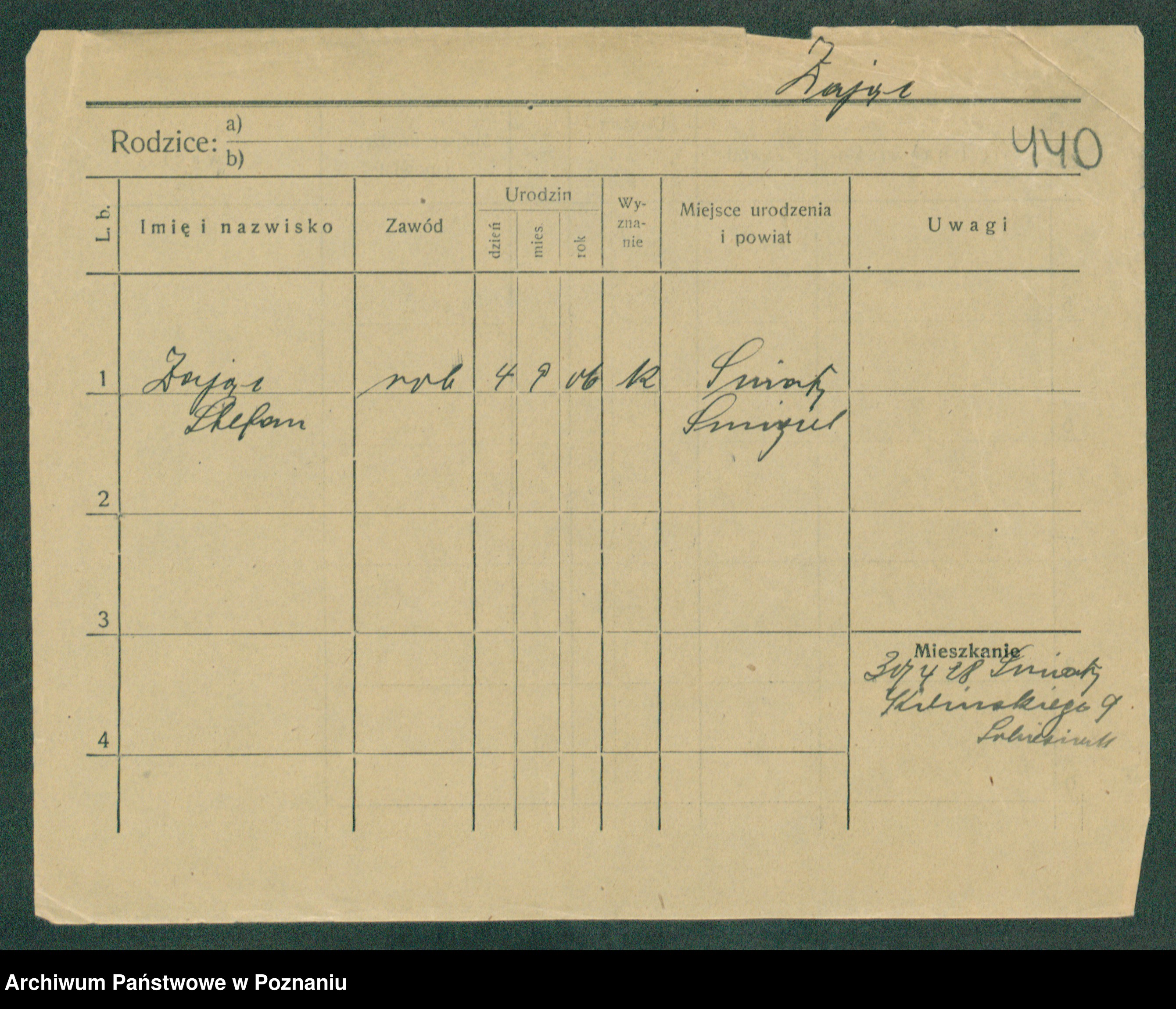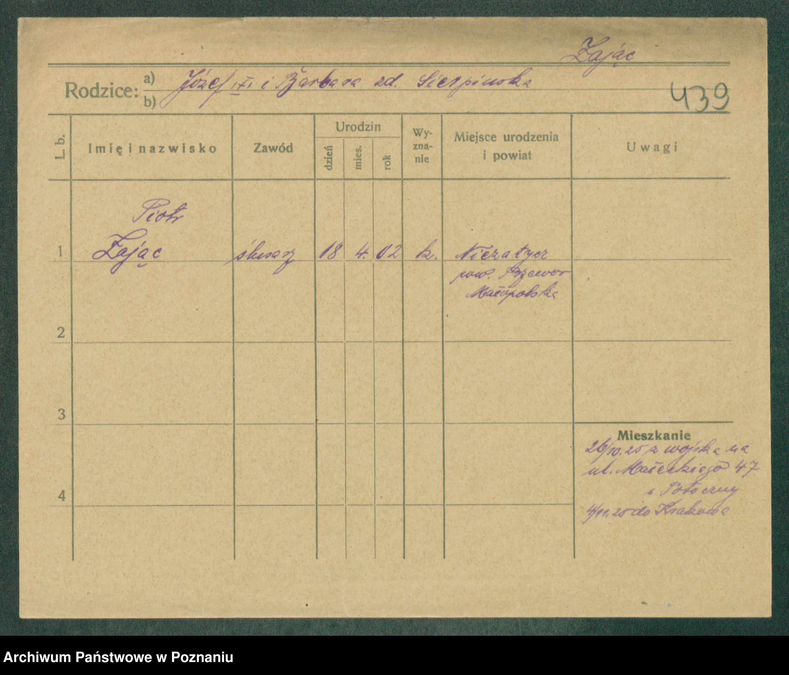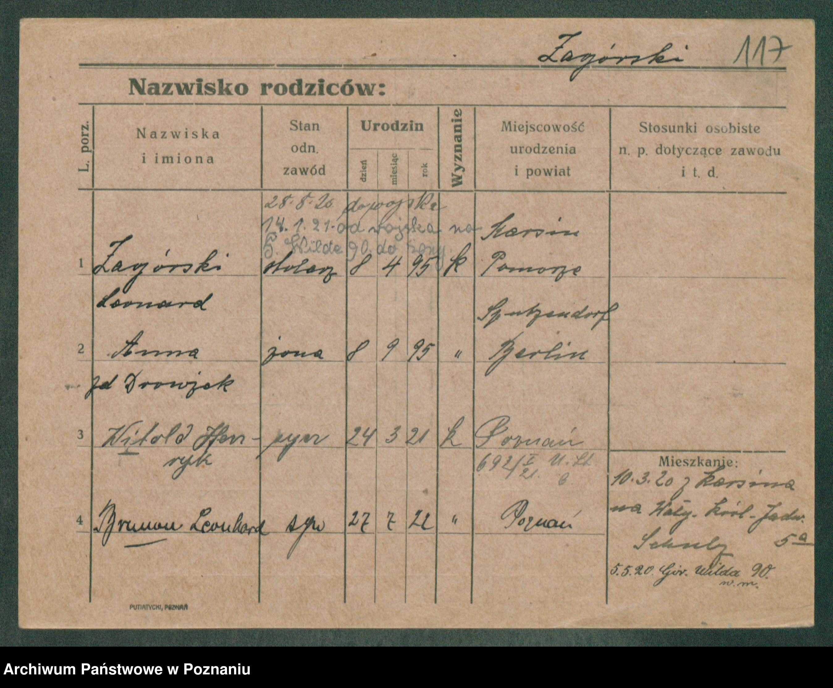 Podgląd karty osobowej dostępny jest po kliknięciu na nazwisko lub ikonkę karty. Można dokonywać powiększenia (ikony na górze) lub przechodzić między kolejnymi skanami (strzałki po bokach).