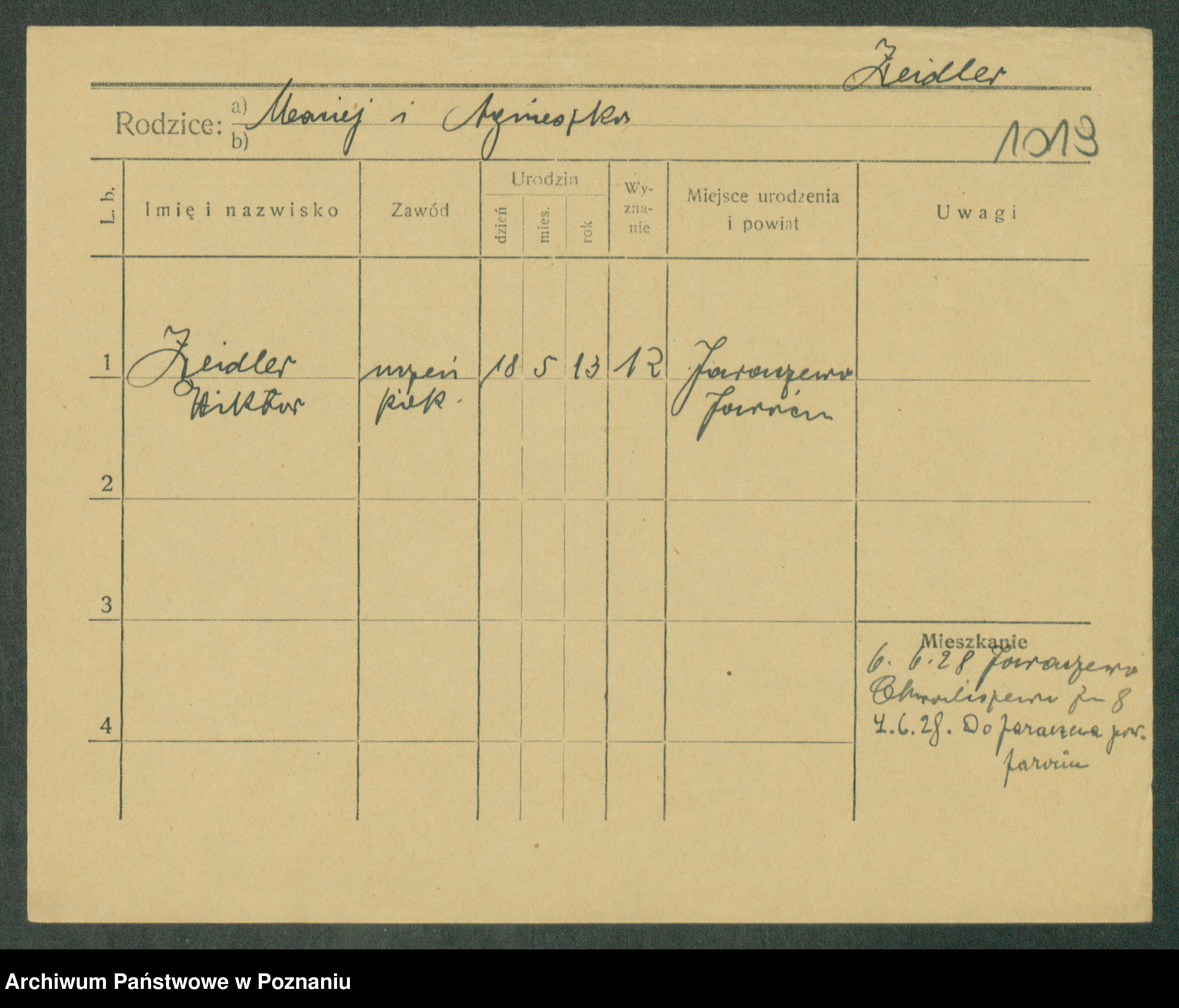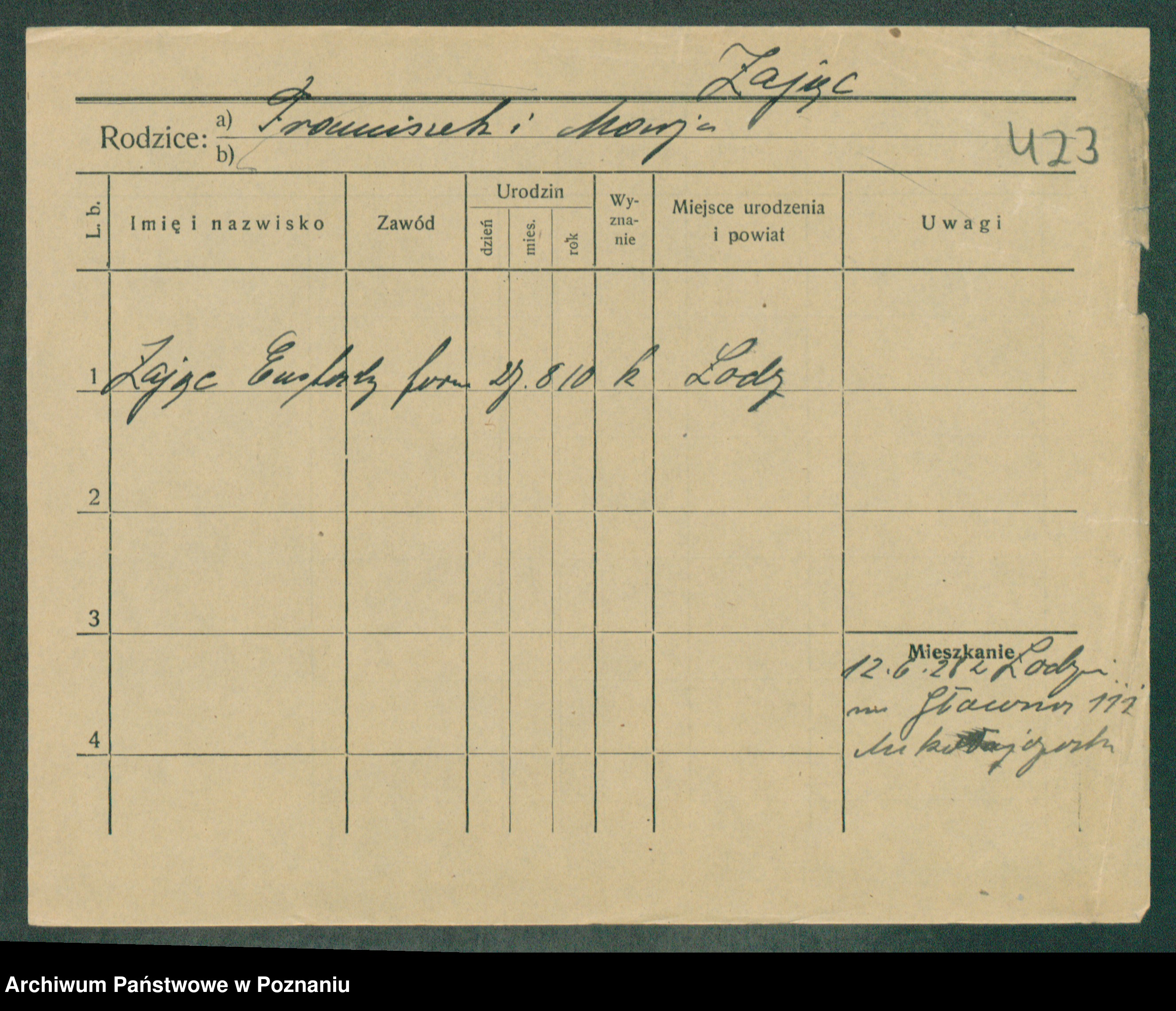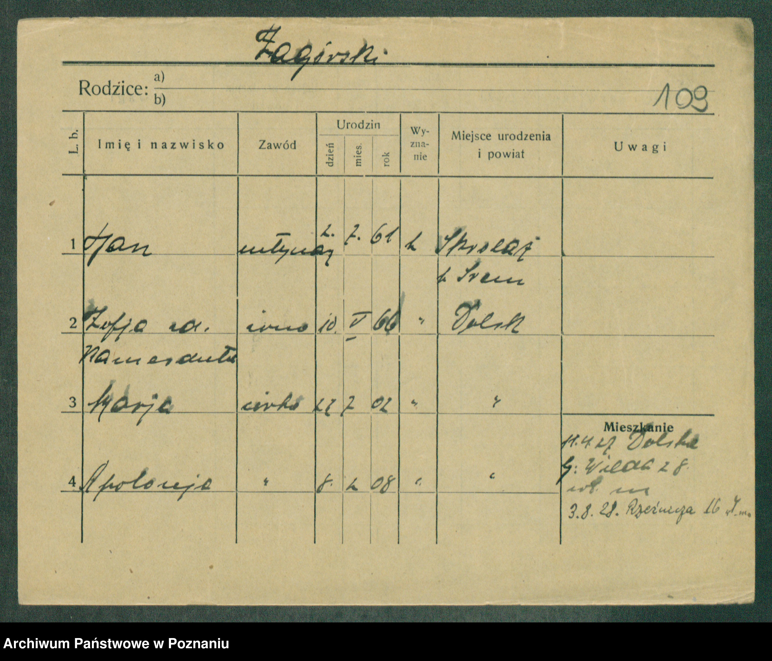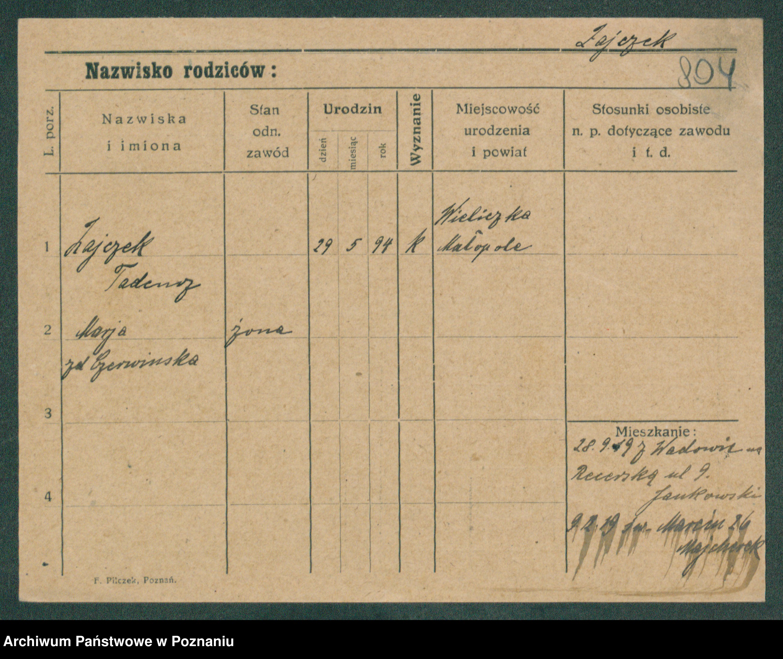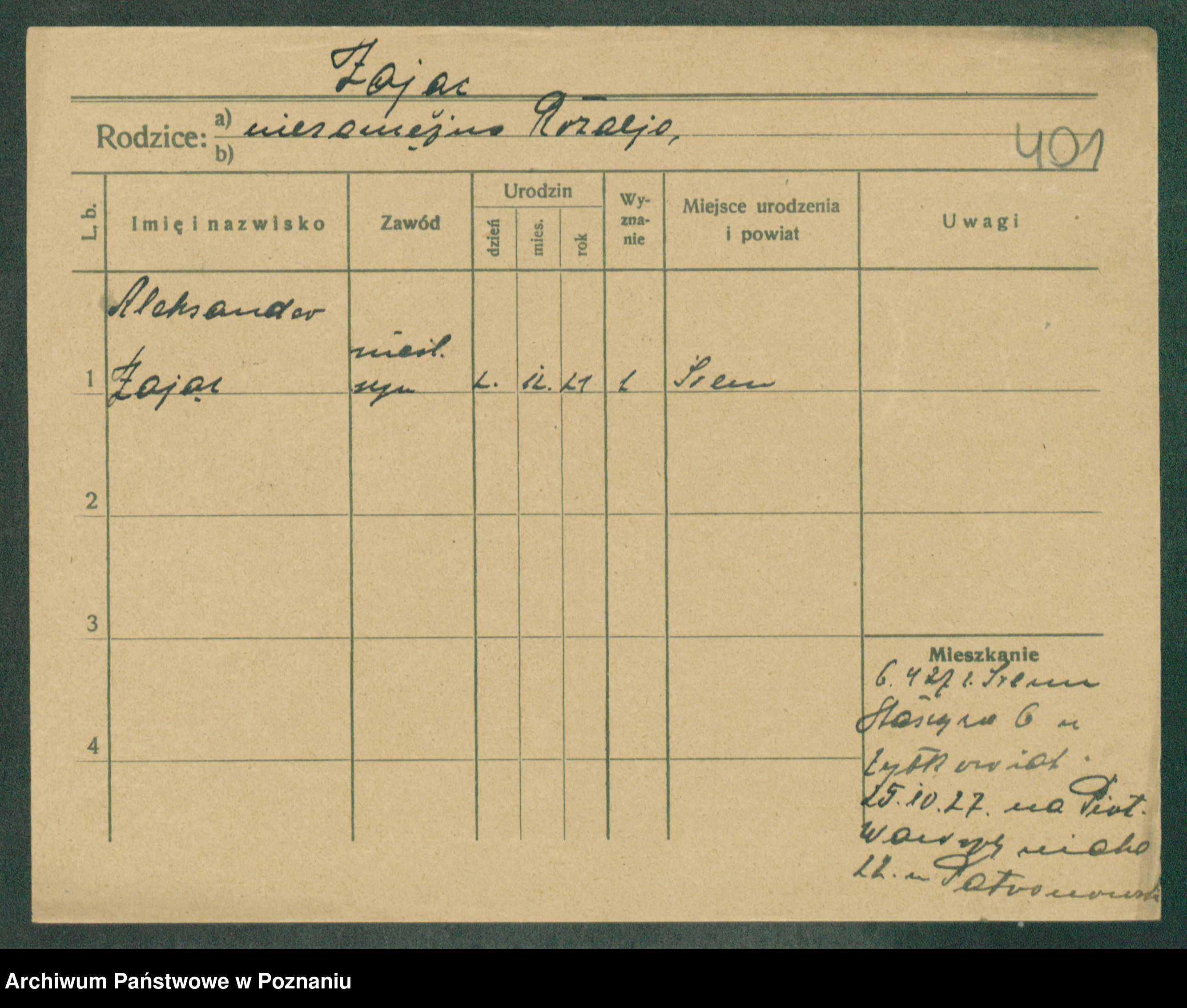 Podgląd karty osobowej dostępny jest po kliknięciu na nazwisko lub ikonkę karty. Można dokonywać powiększenia (ikony na górze) lub przechodzić między kolejnymi skanami (strzałki po bokach).