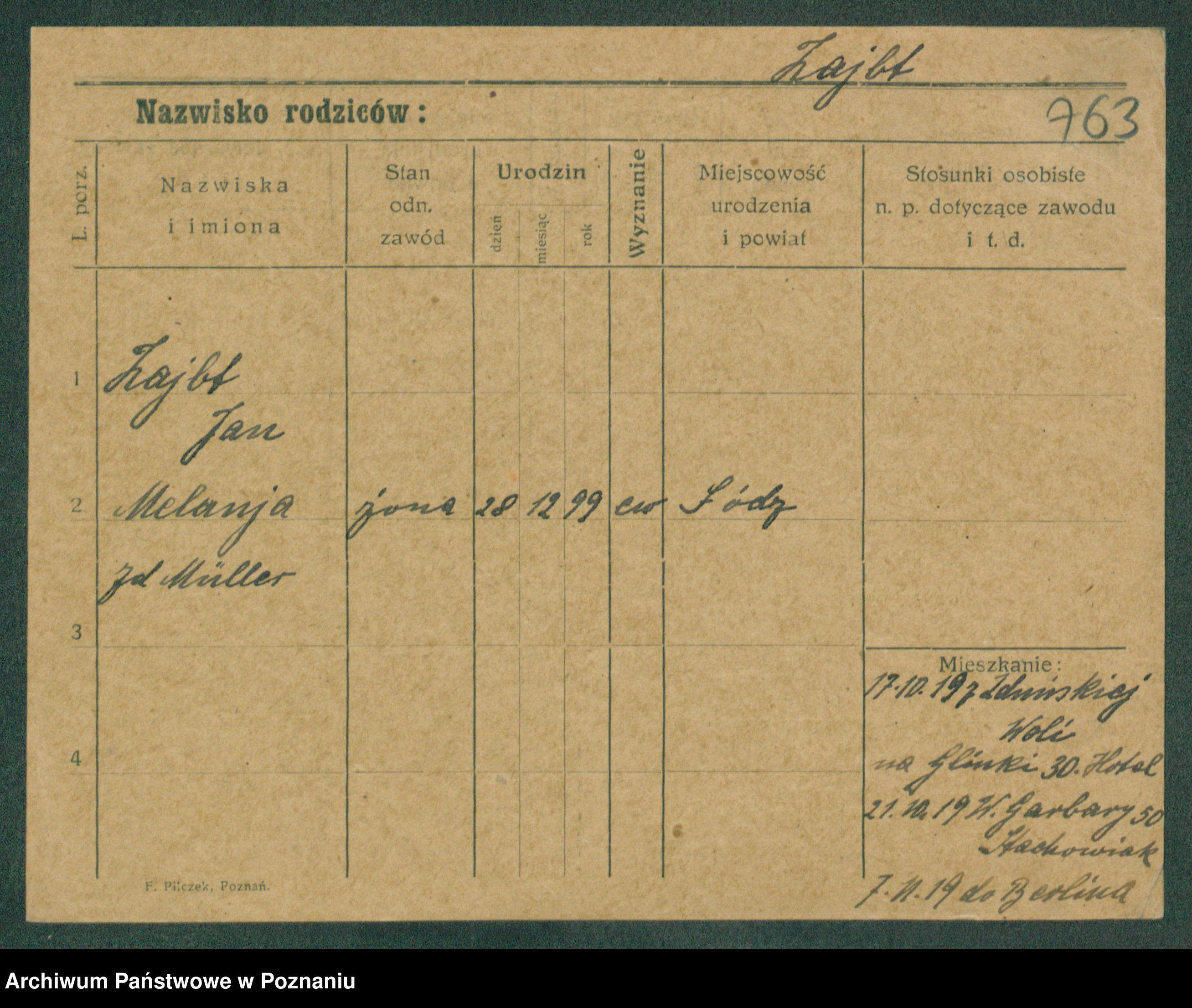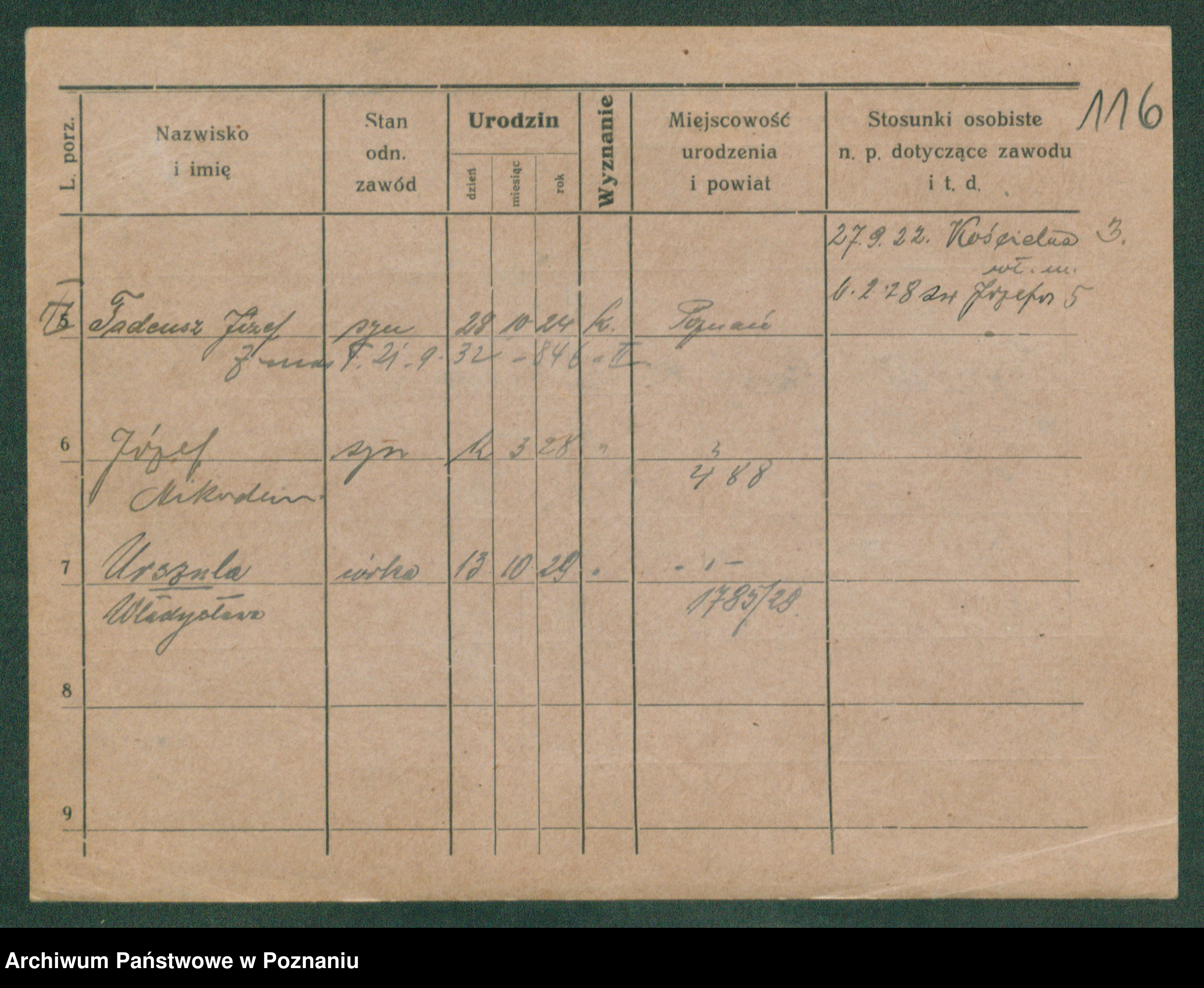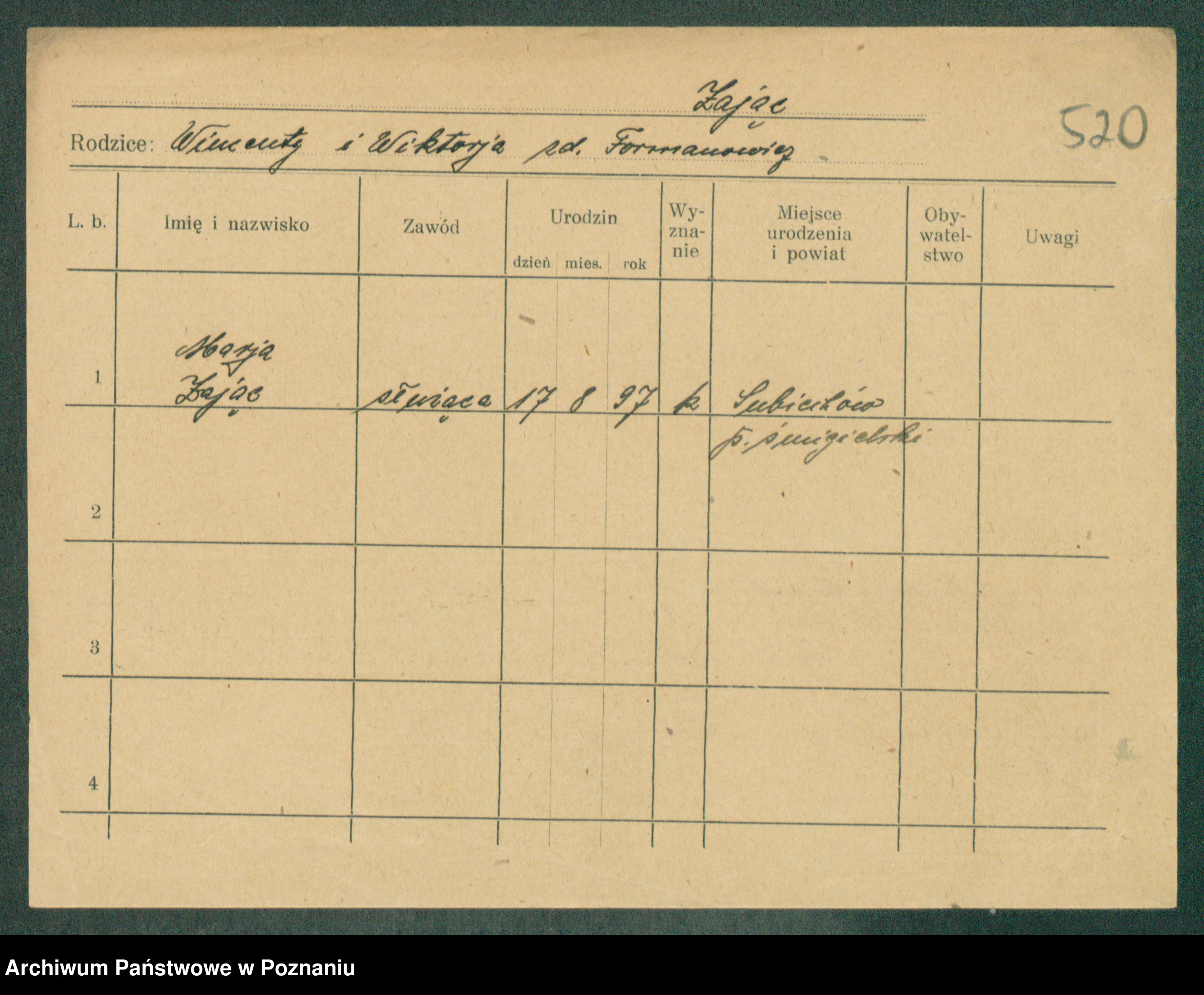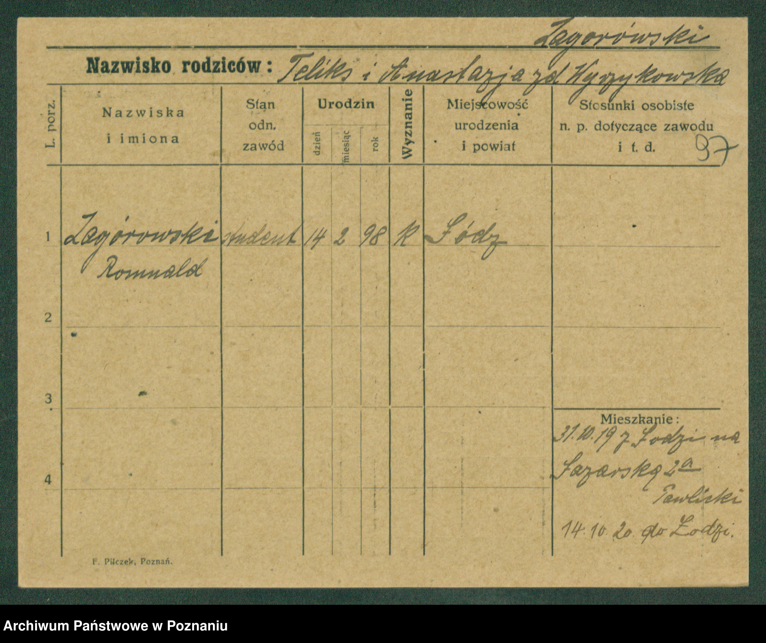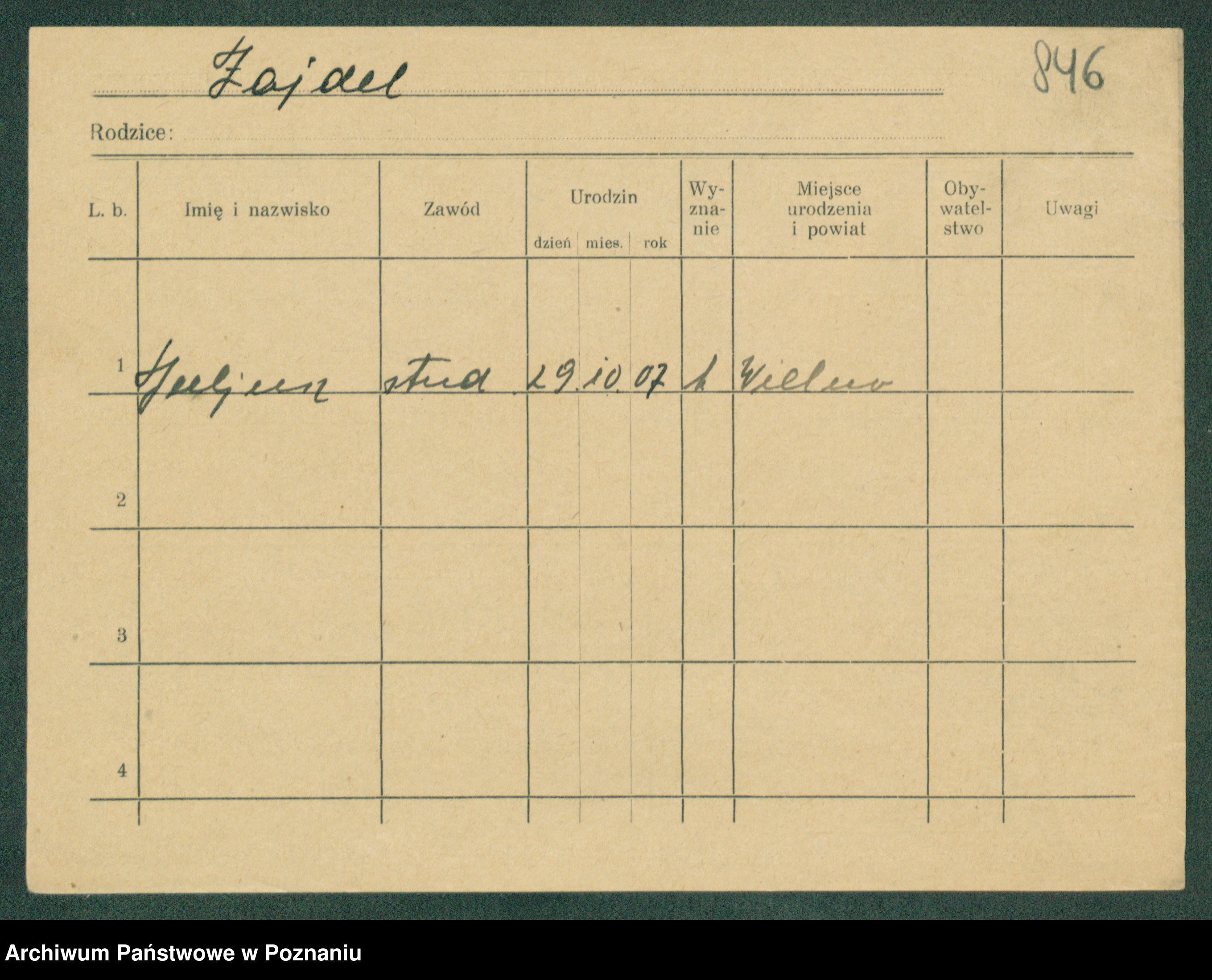 Podgląd karty osobowej dostępny jest po kliknięciu na nazwisko lub ikonkę karty. Można dokonywać powiększenia (ikony na górze) lub przechodzić między kolejnymi skanami (strzałki po bokach).