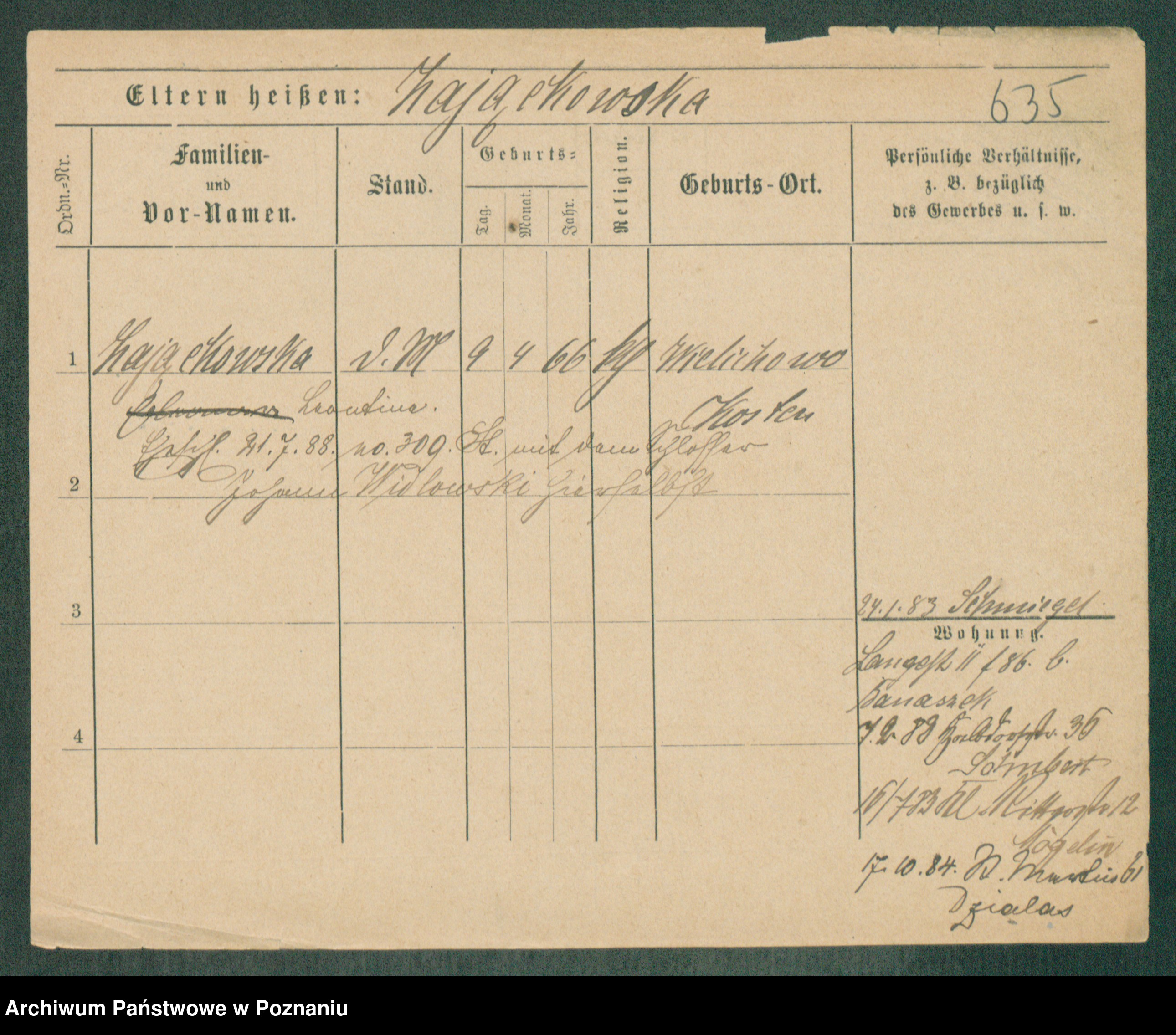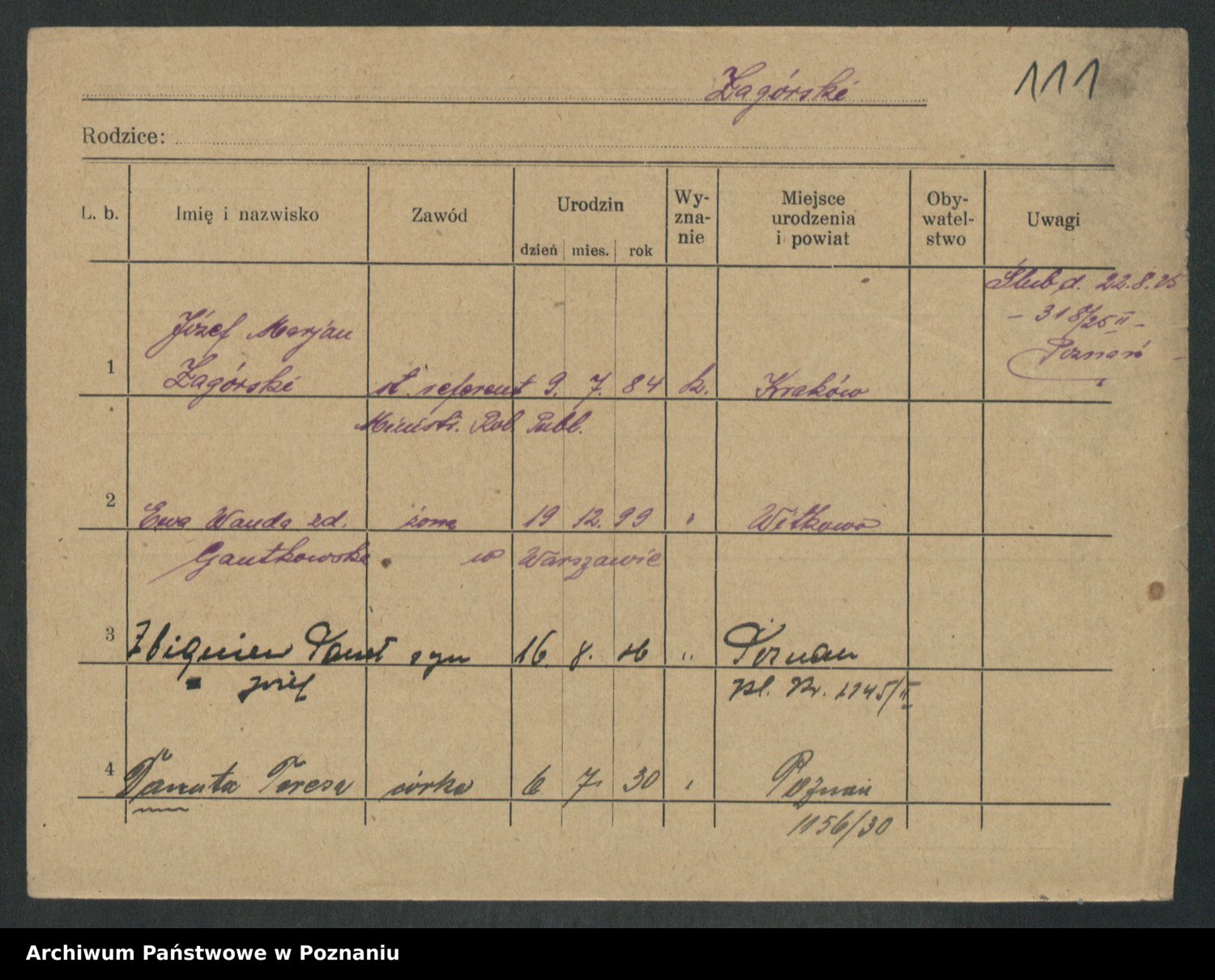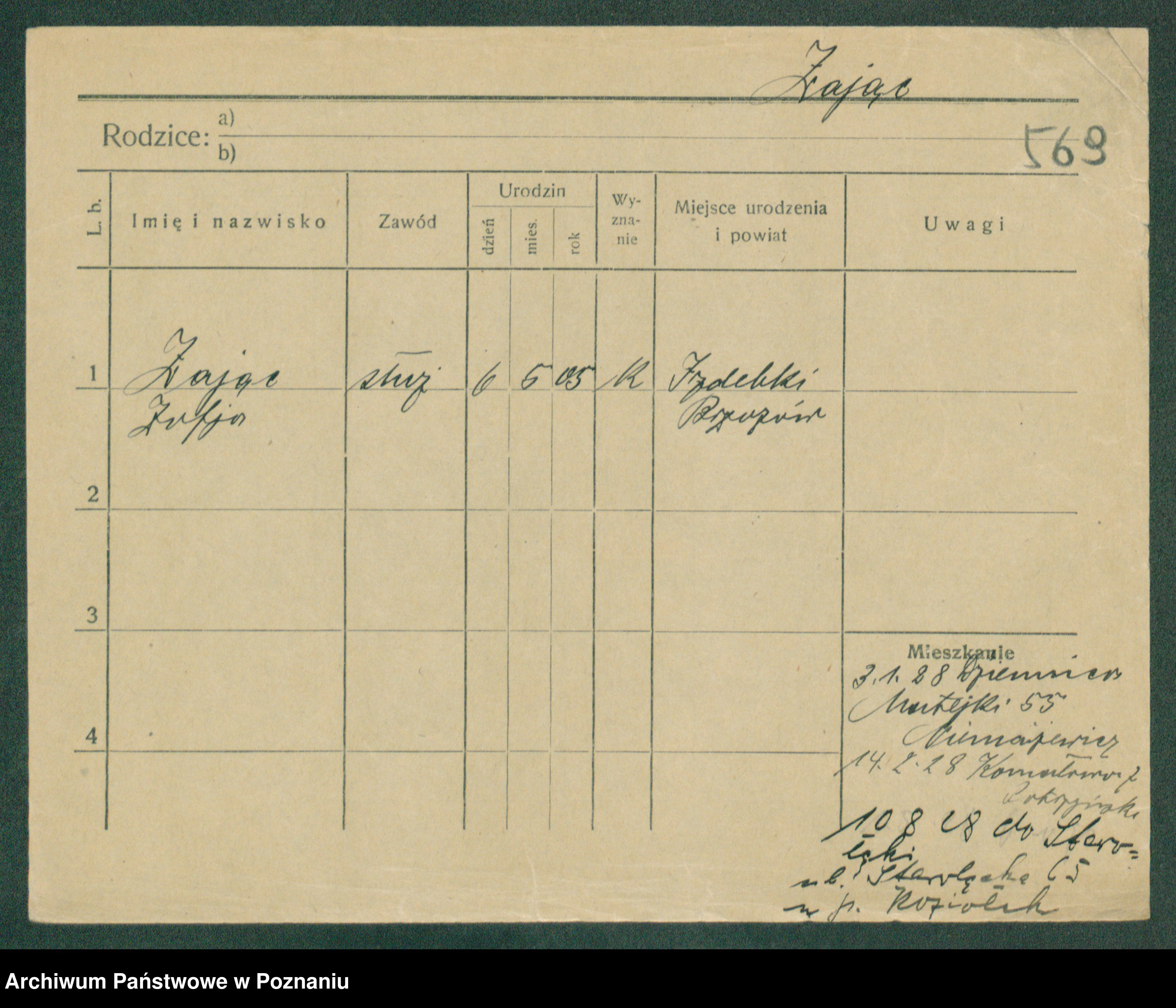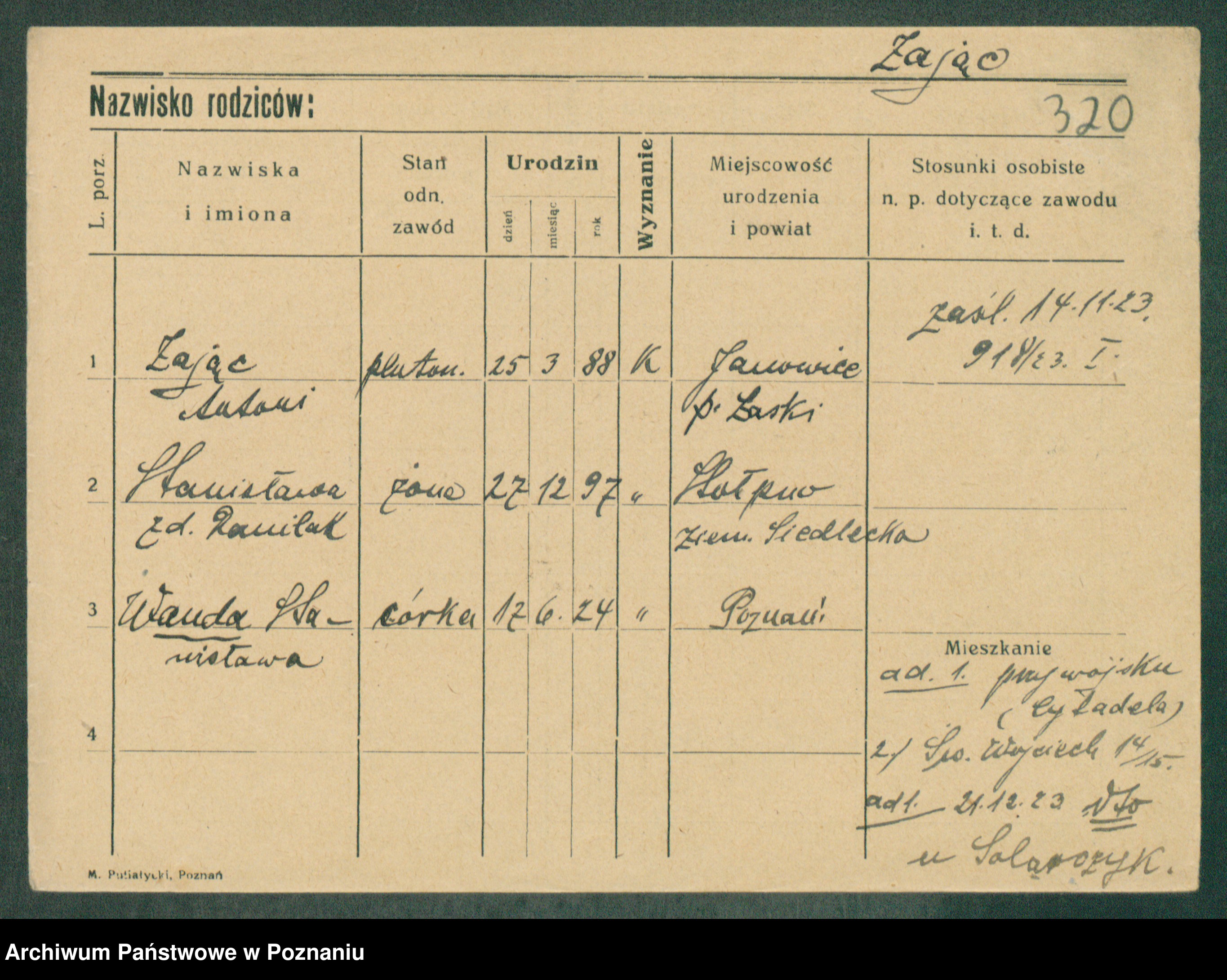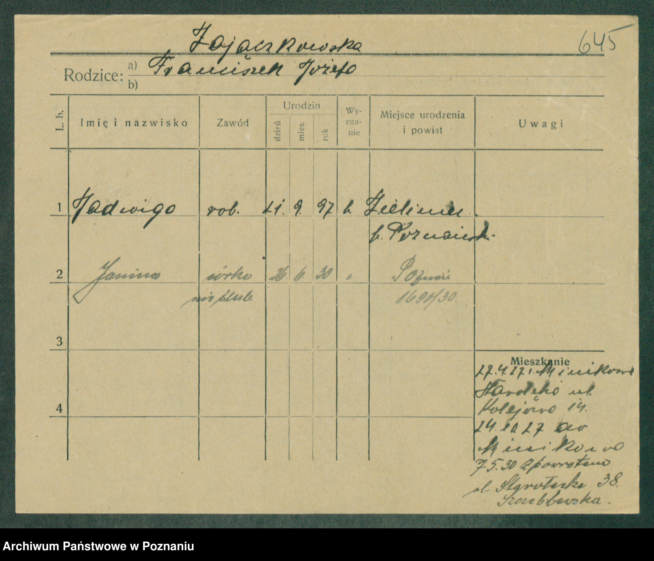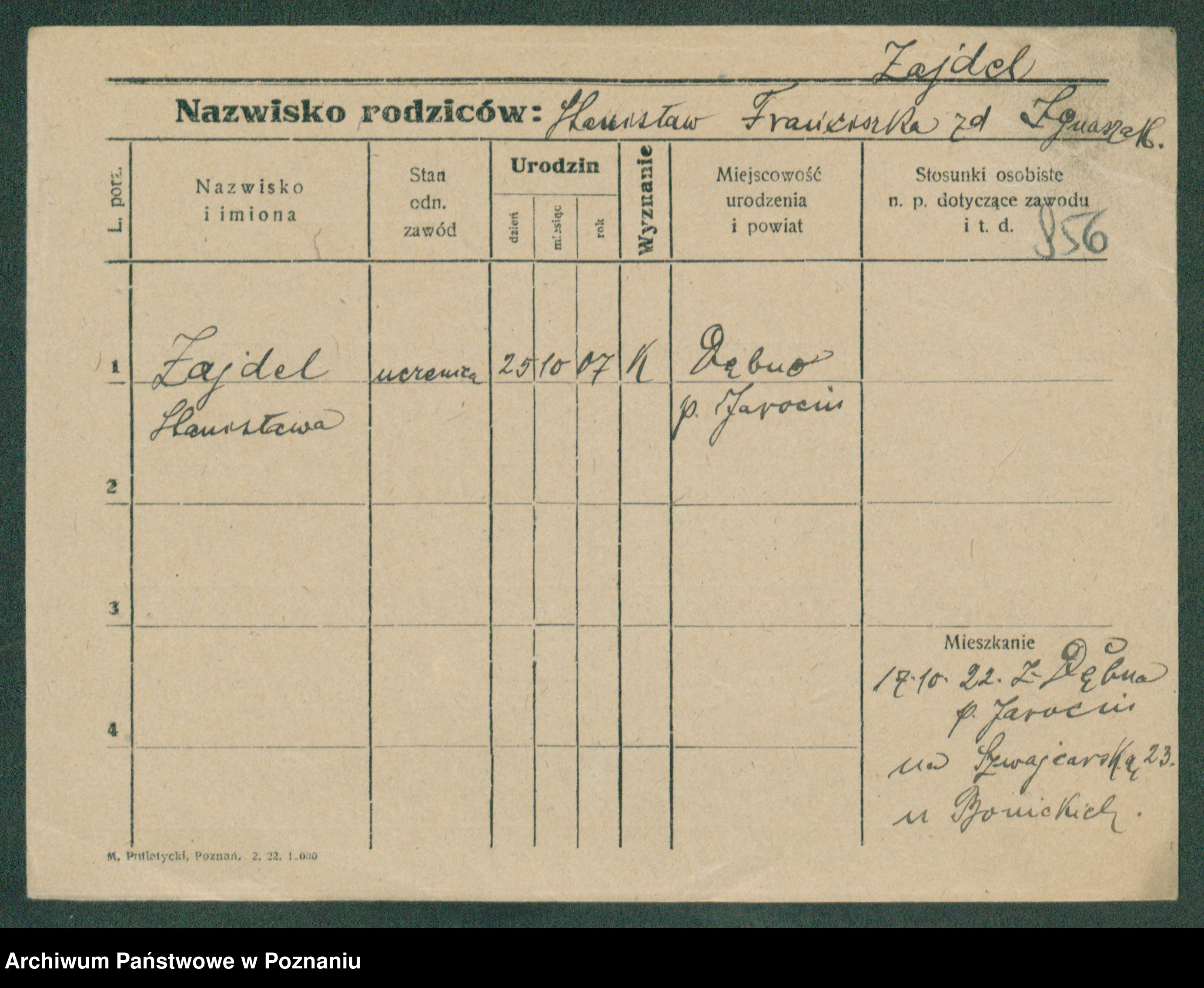 Podgląd karty osobowej dostępny jest po kliknięciu na nazwisko lub ikonkę karty. Można dokonywać powiększenia (ikony na górze) lub przechodzić między kolejnymi skanami (strzałki po bokach).
