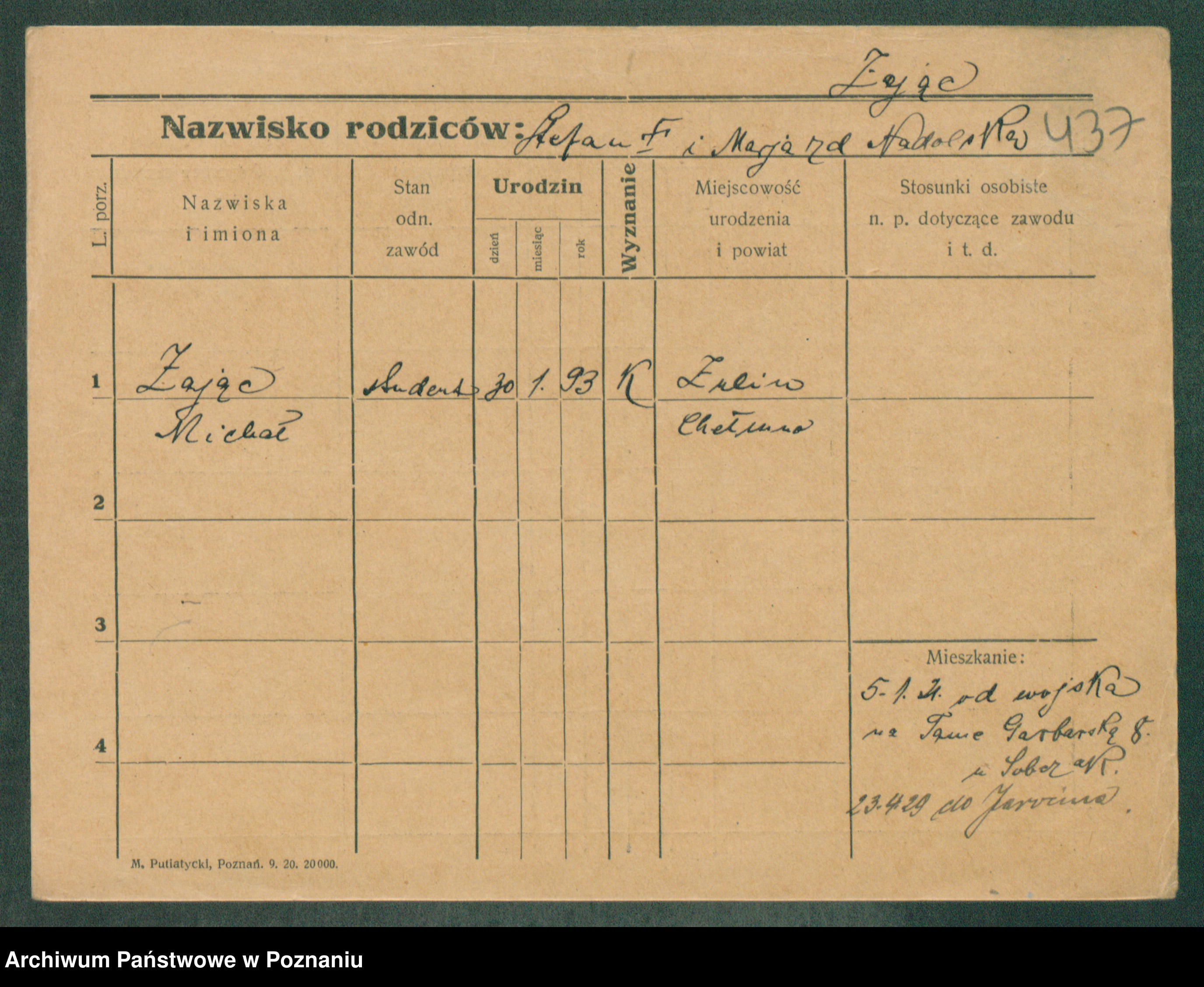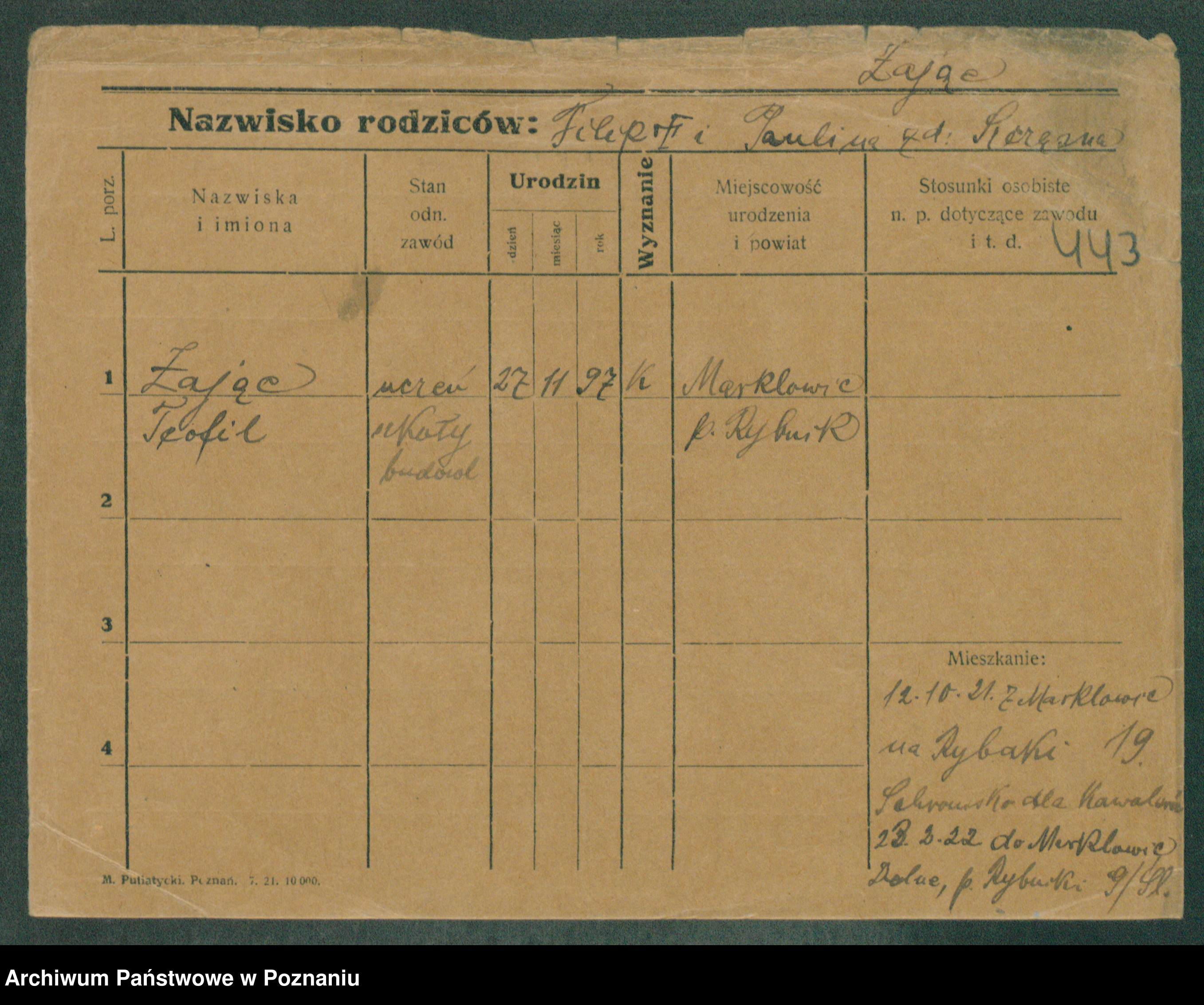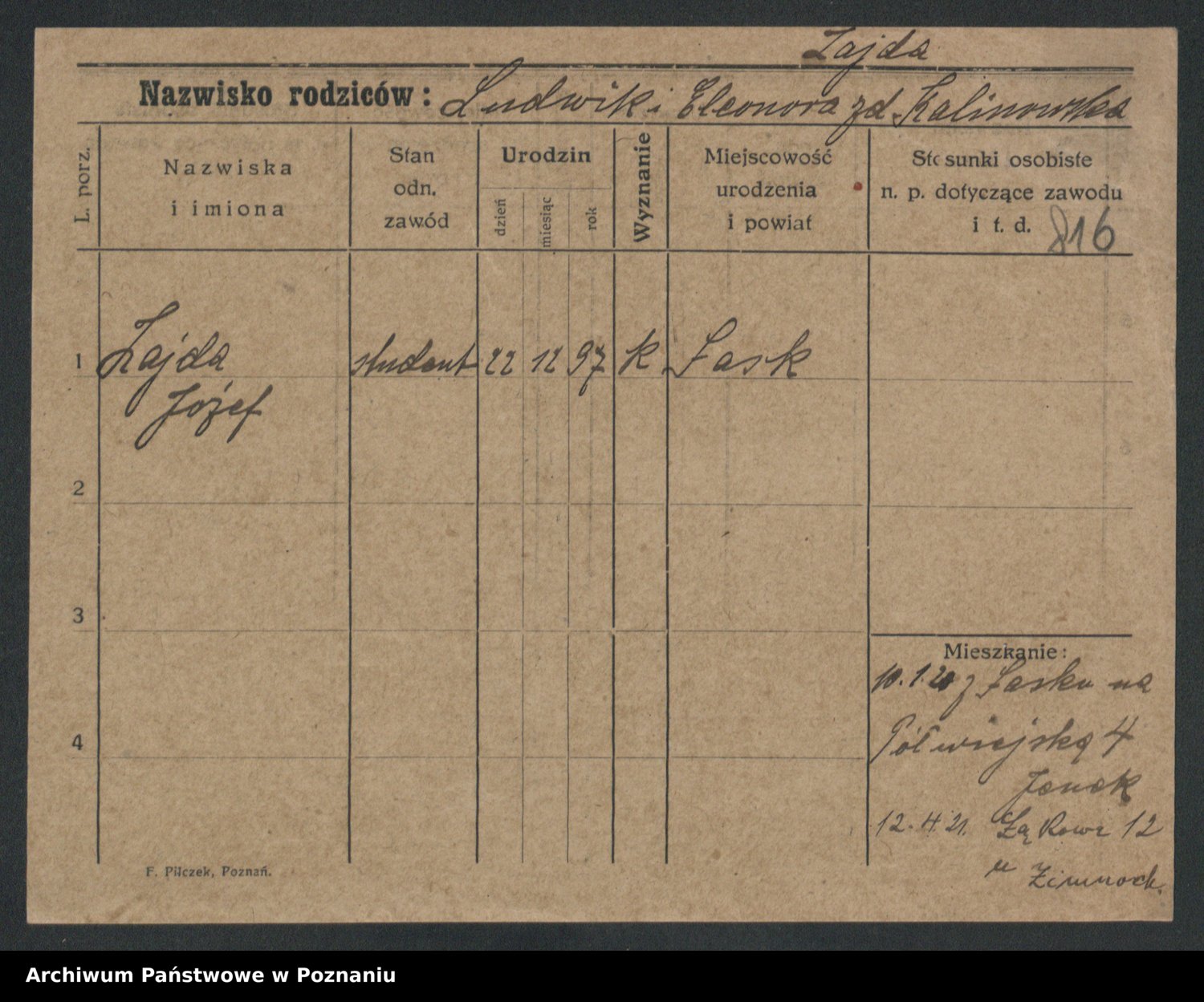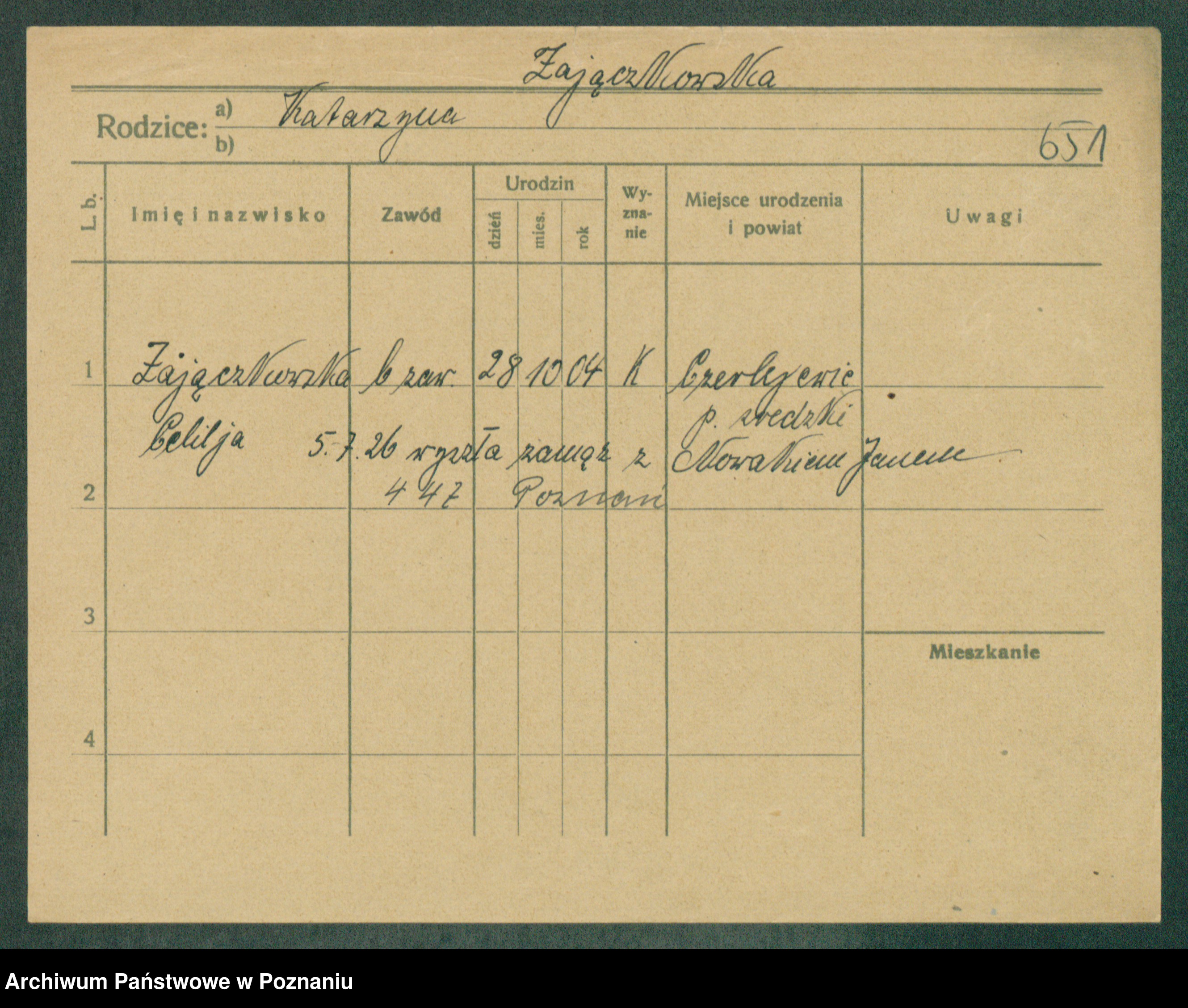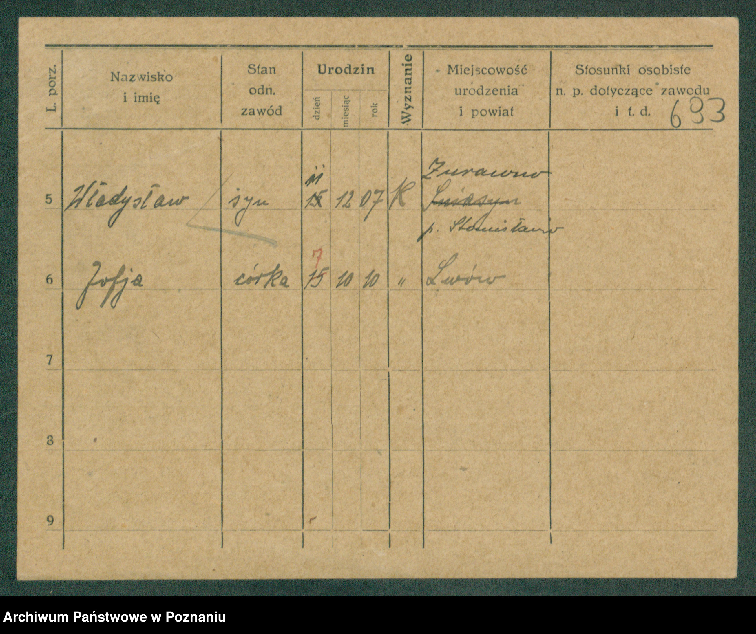Podgląd karty osobowej dostępny jest po kliknięciu na nazwisko lub ikonkę karty. Można dokonywać powiększenia (ikony na górze) lub przechodzić między kolejnymi skanami (strzałki po bokach).