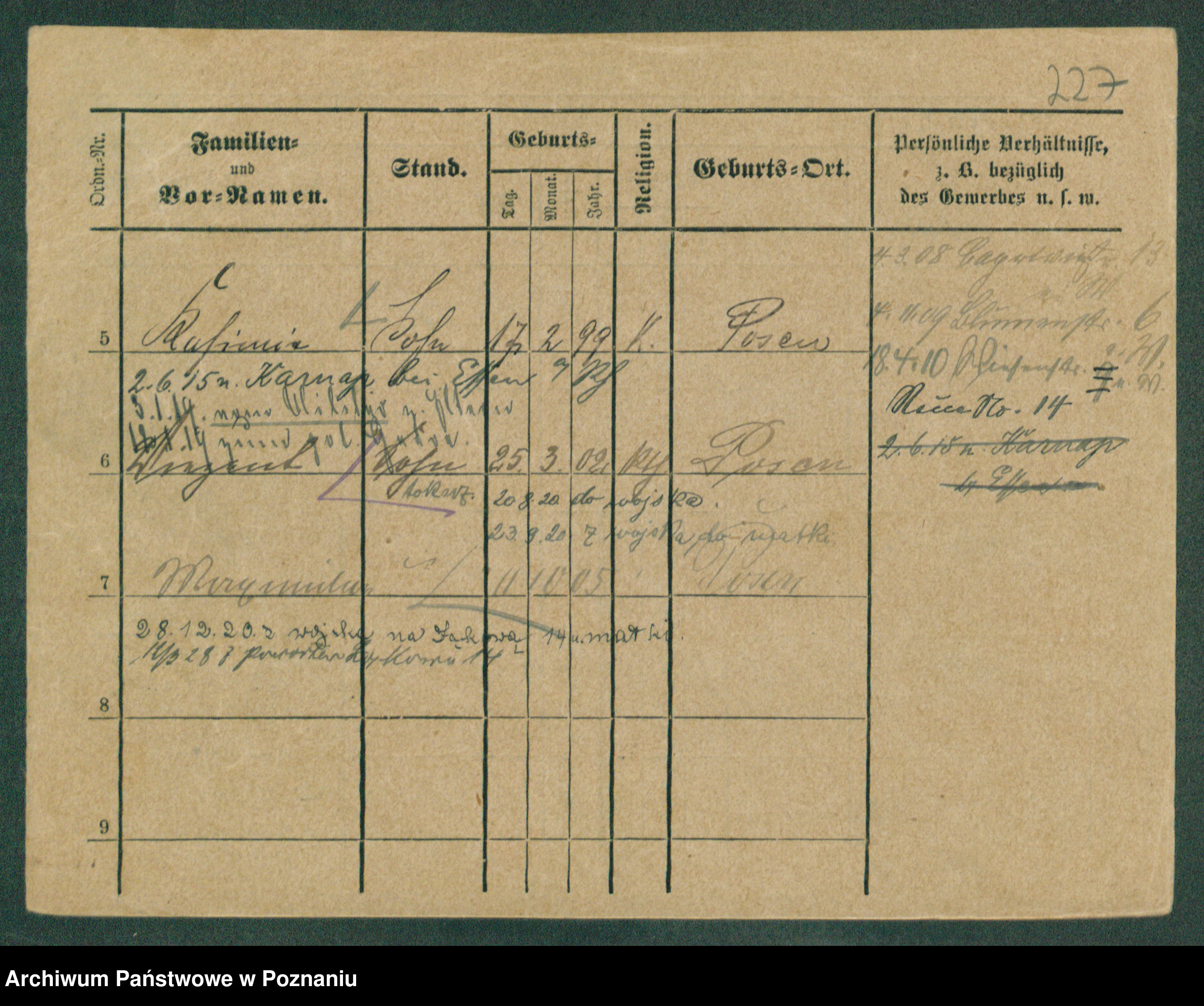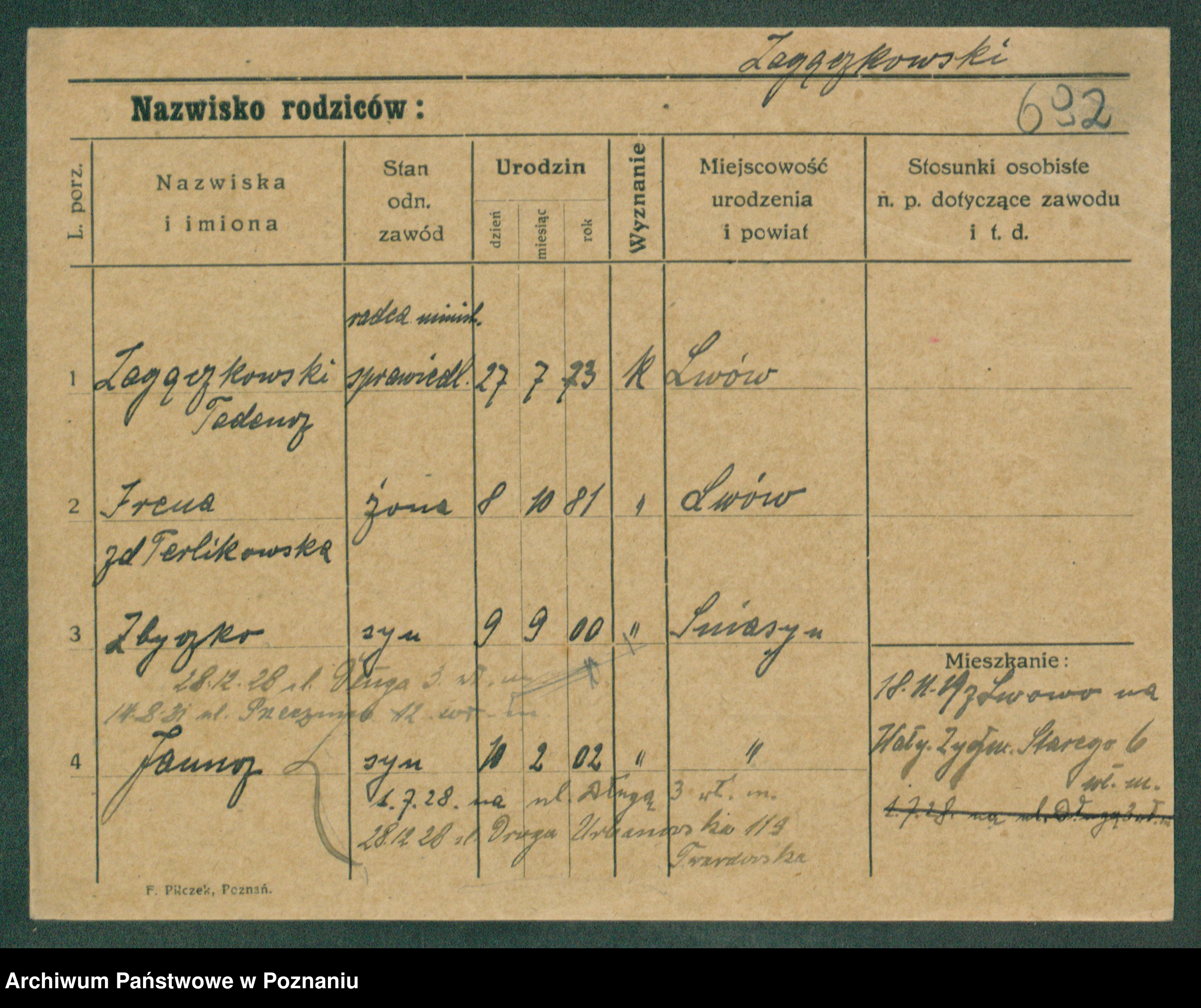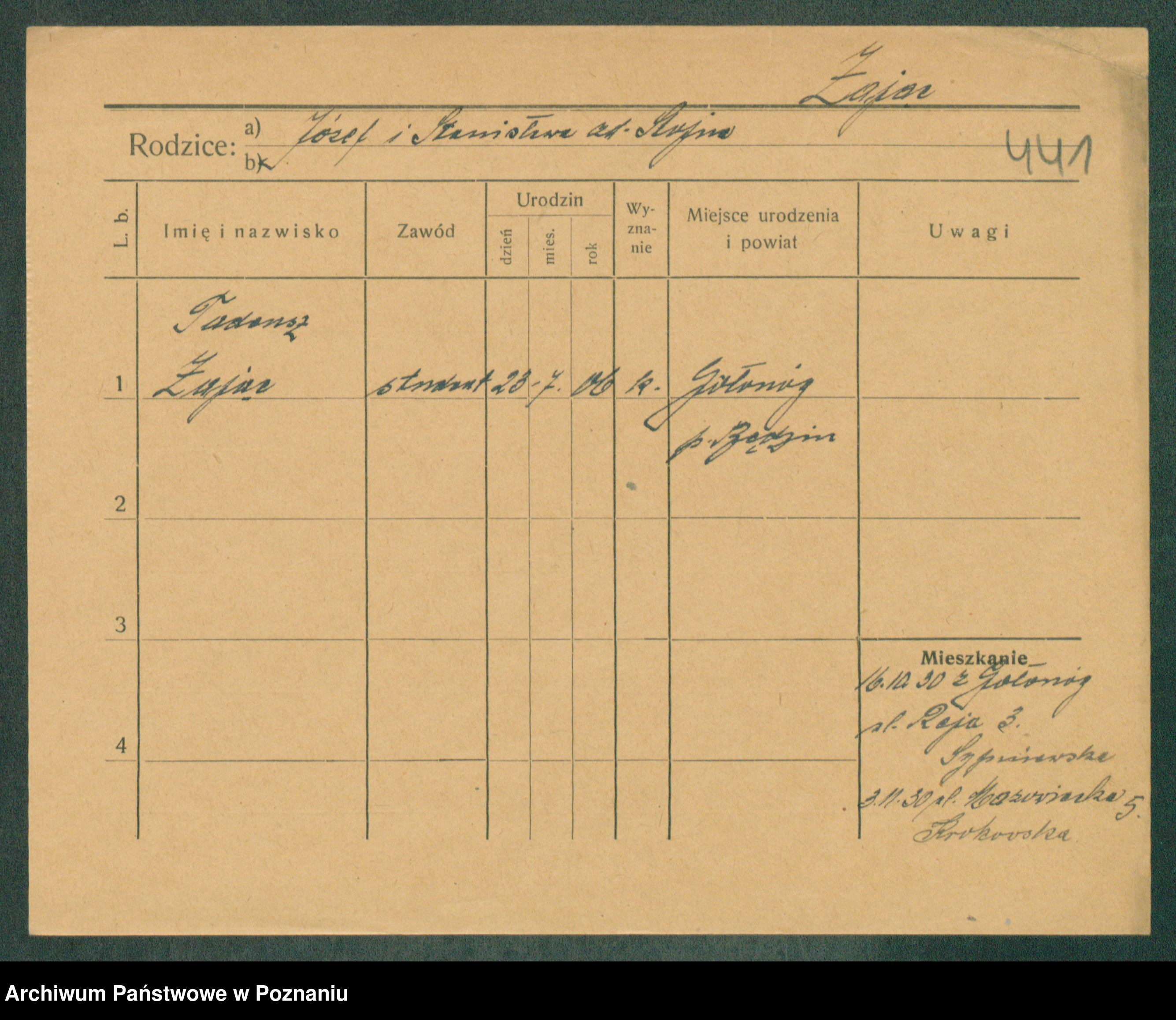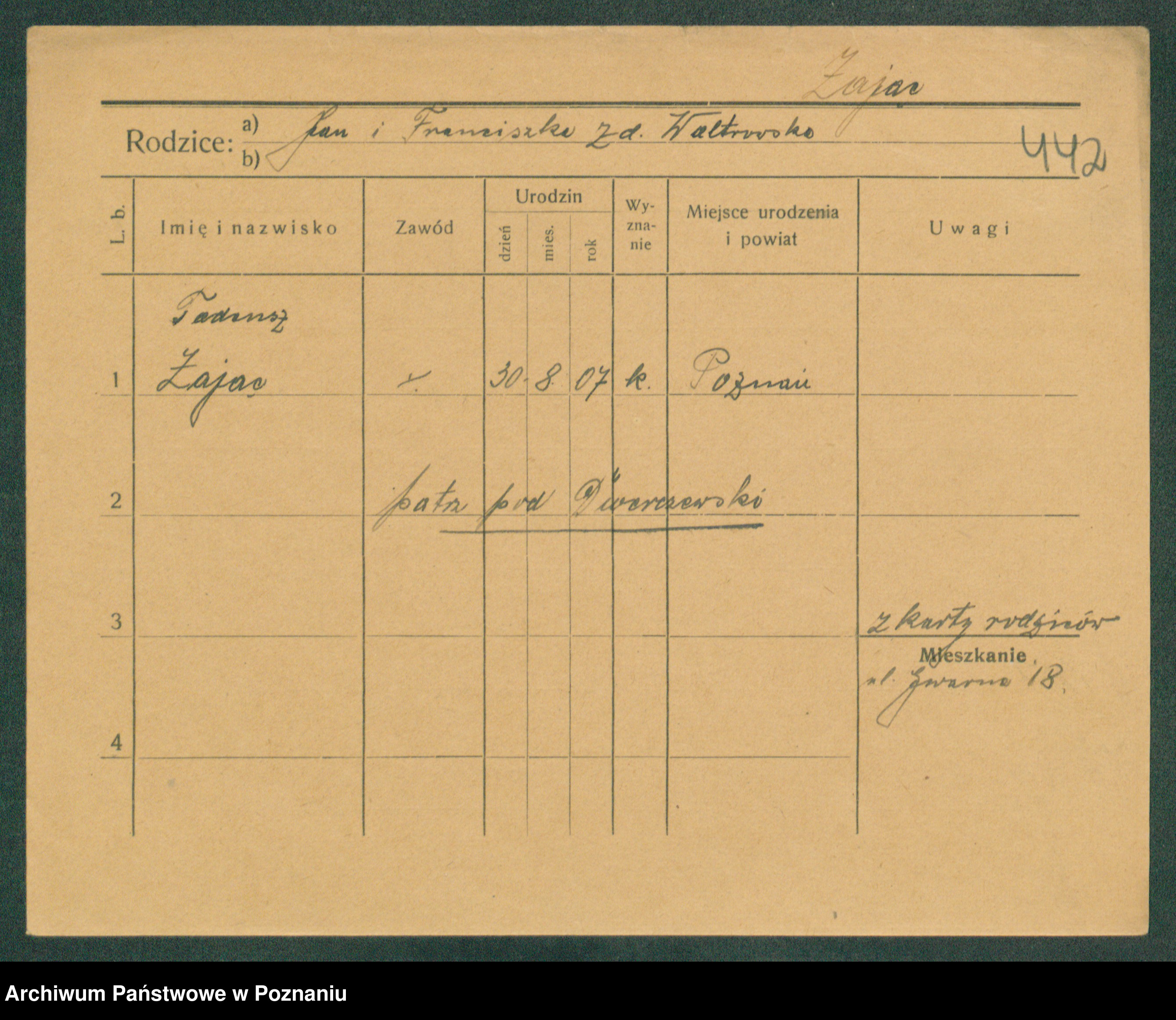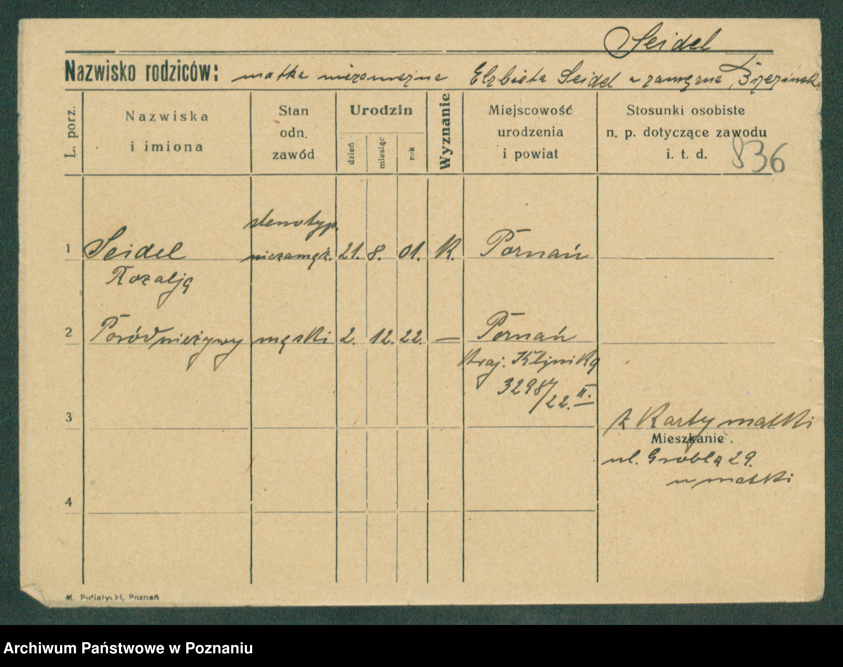 Podgląd karty osobowej dostępny jest po kliknięciu na nazwisko lub ikonkę karty. Można dokonywać powiększenia (ikony na górze) lub przechodzić między kolejnymi skanami (strzałki po bokach).