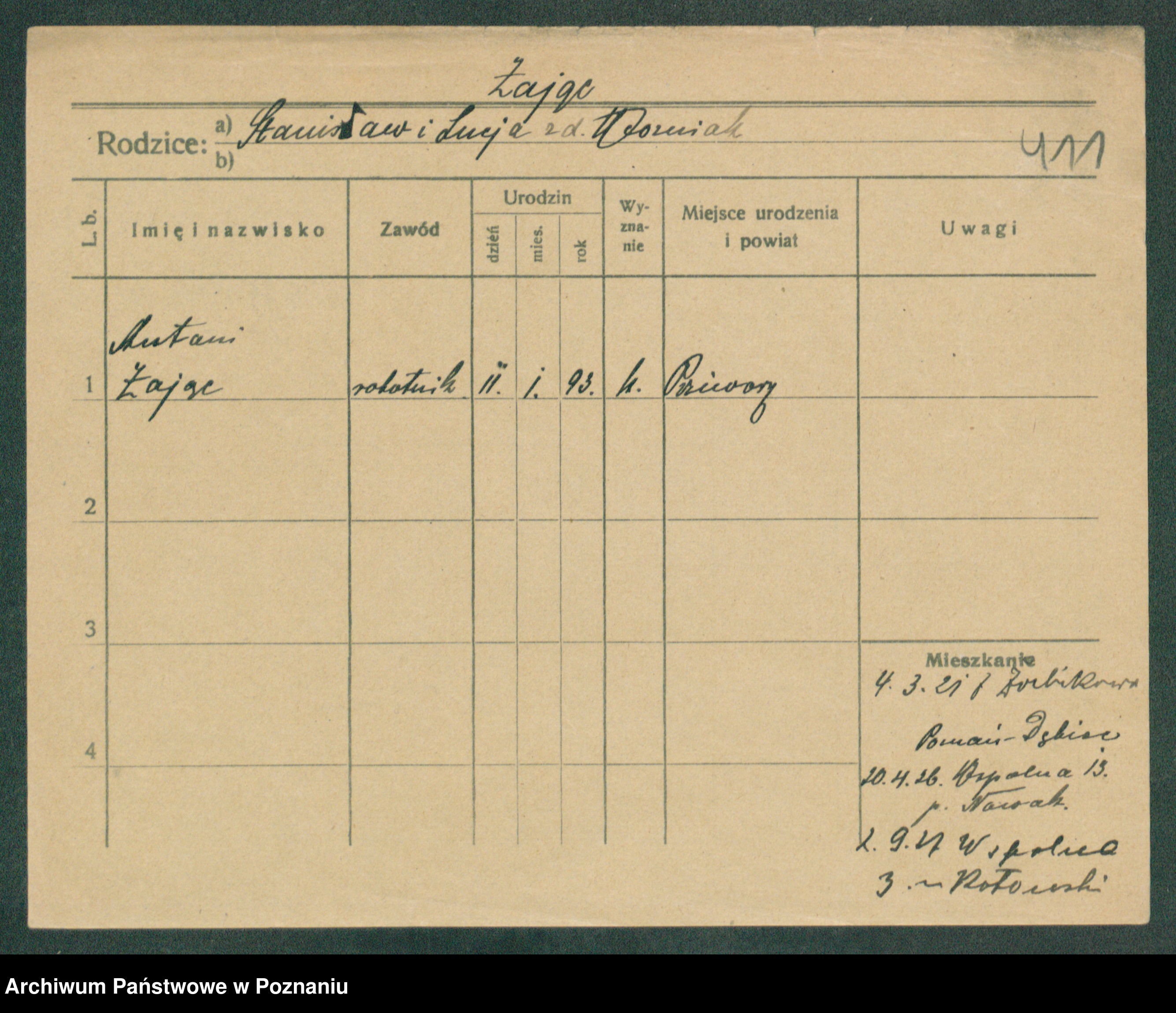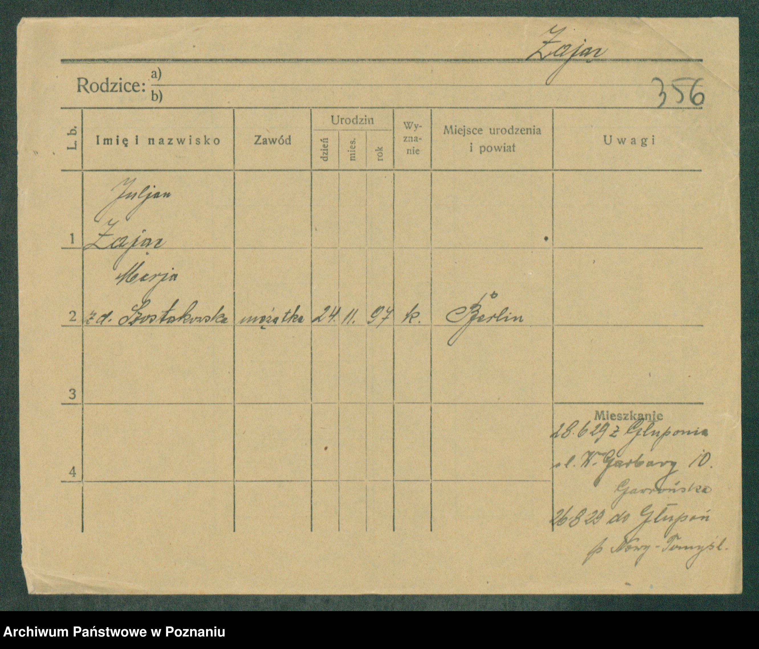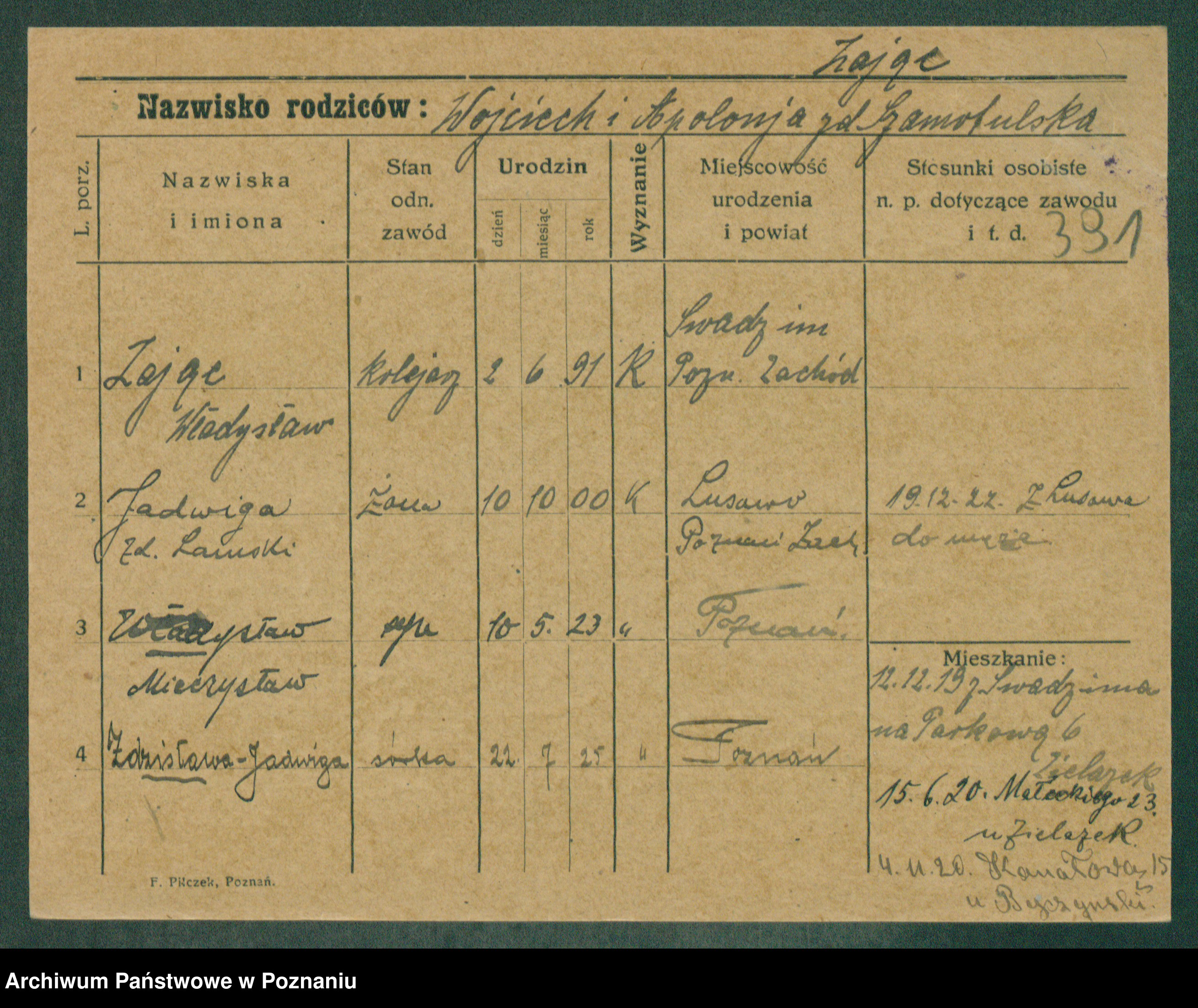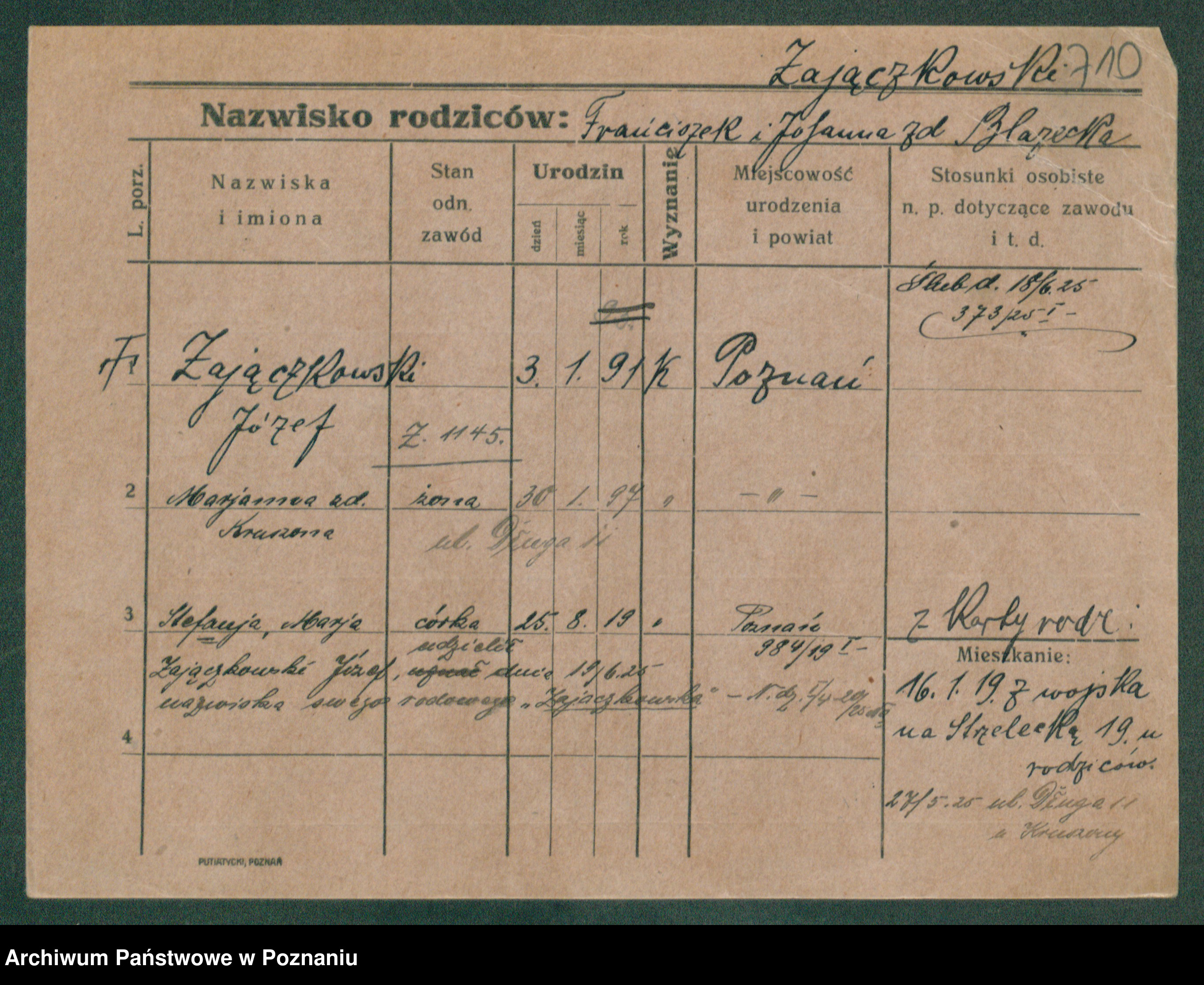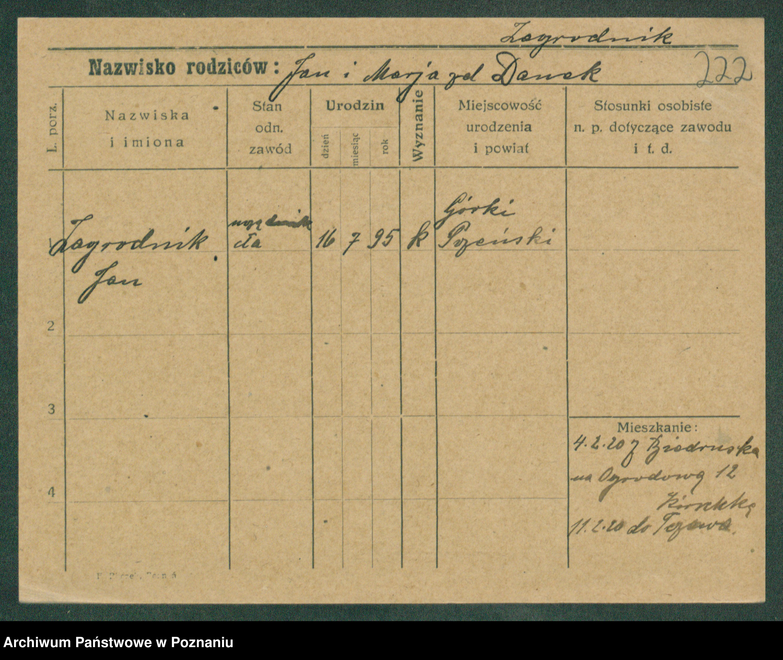 Podgląd karty osobowej dostępny jest po kliknięciu na nazwisko lub ikonkę karty. Można dokonywać powiększenia (ikony na górze) lub przechodzić między kolejnymi skanami (strzałki po bokach).