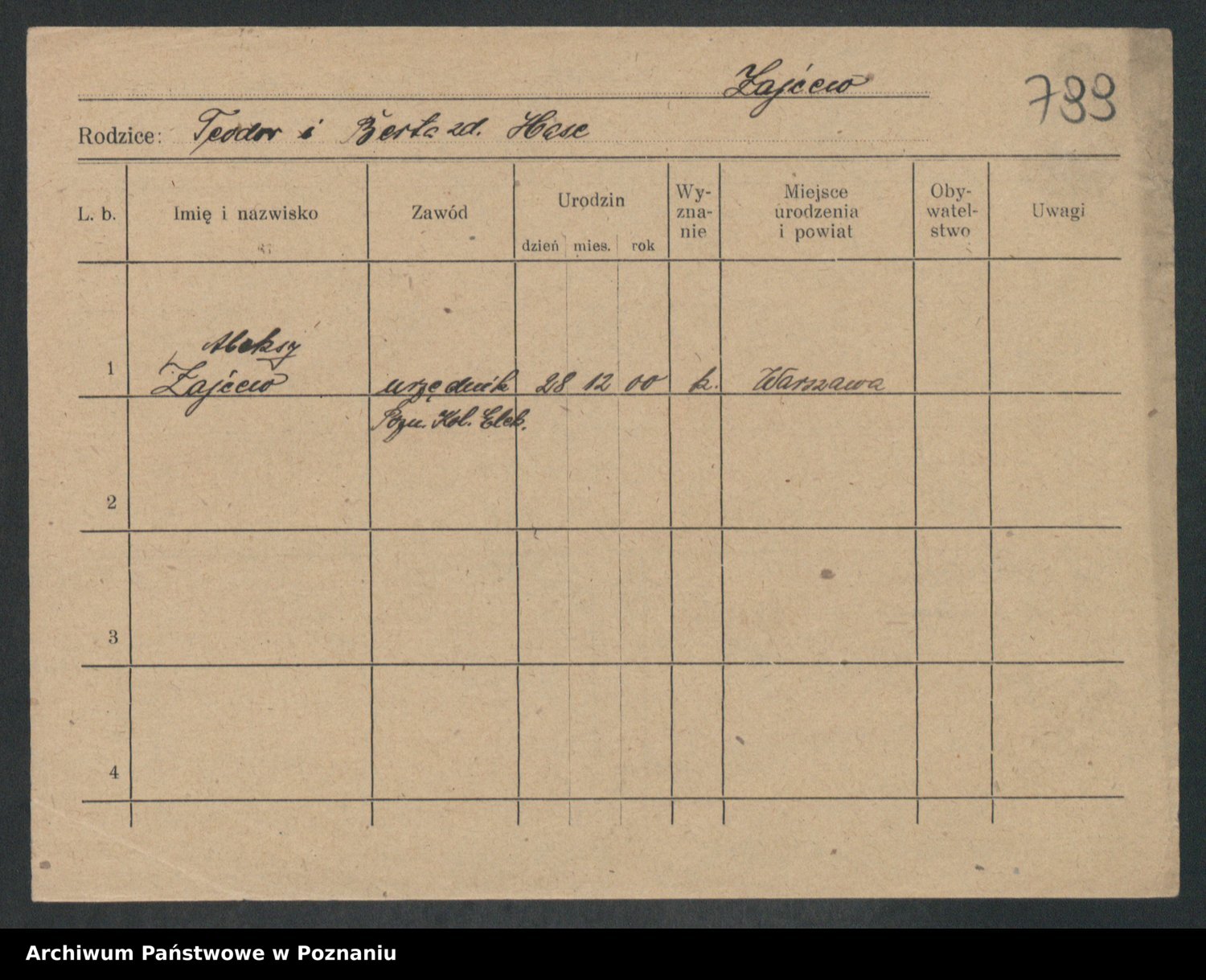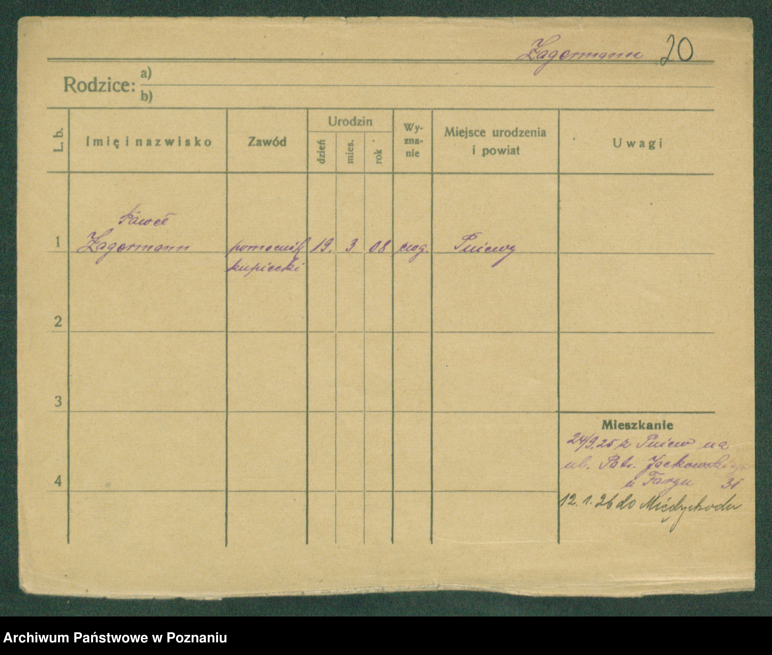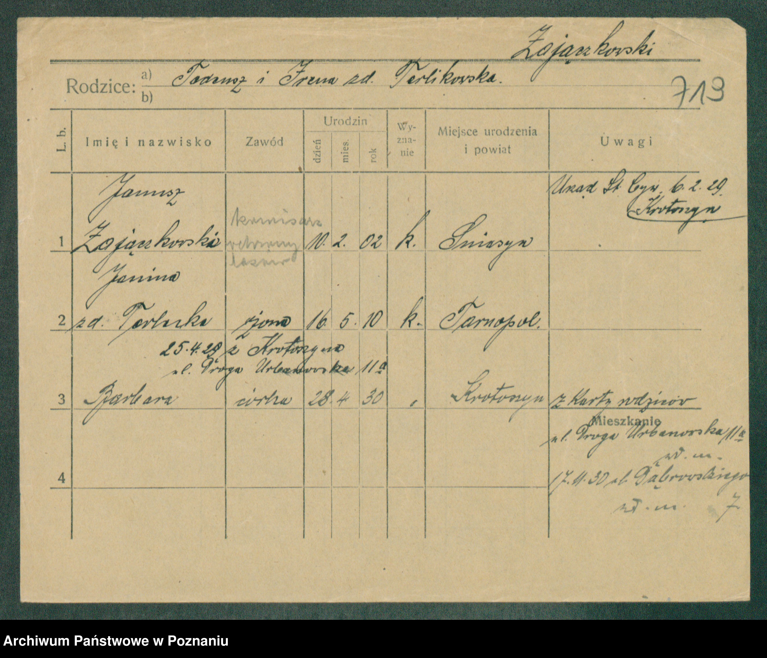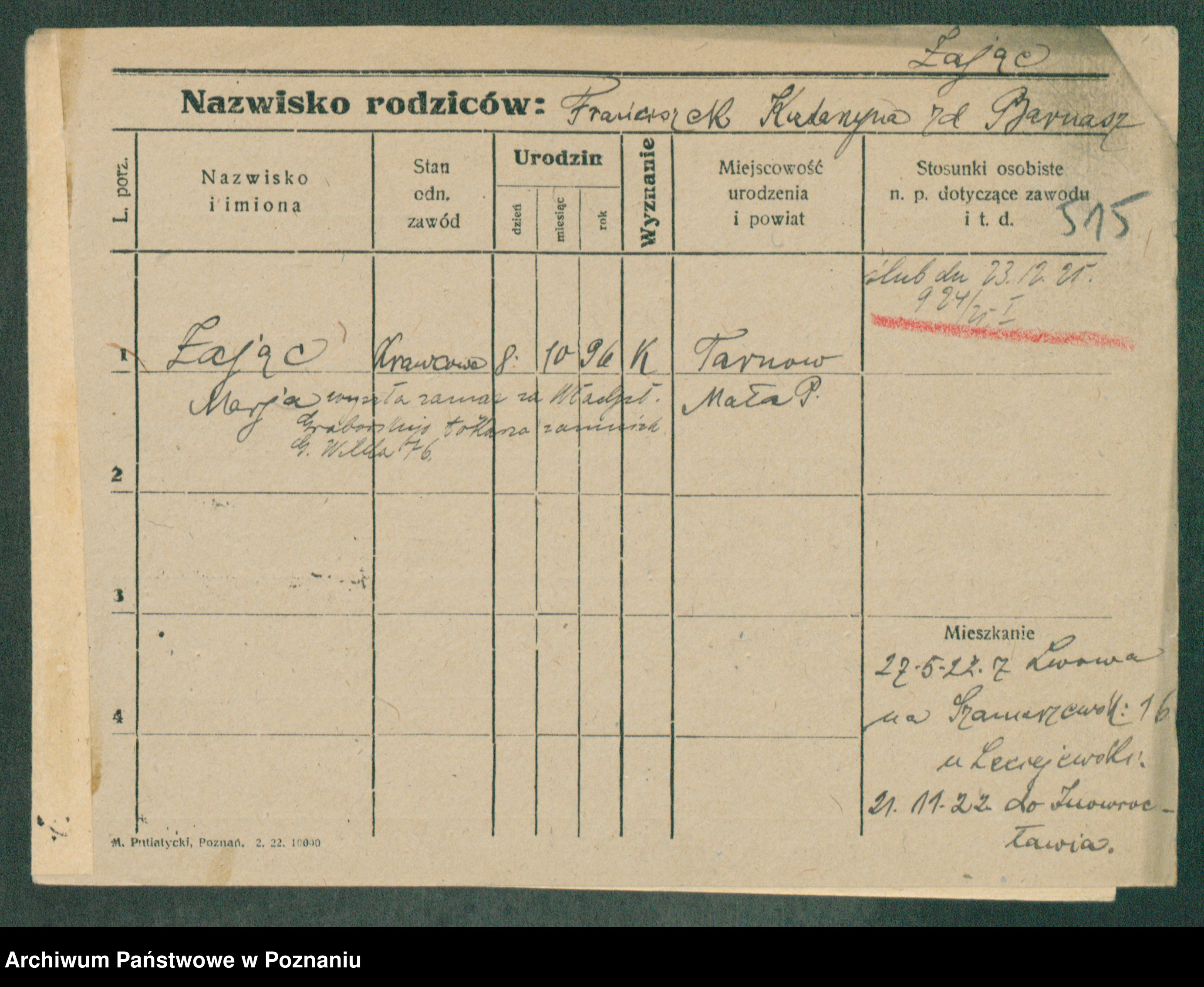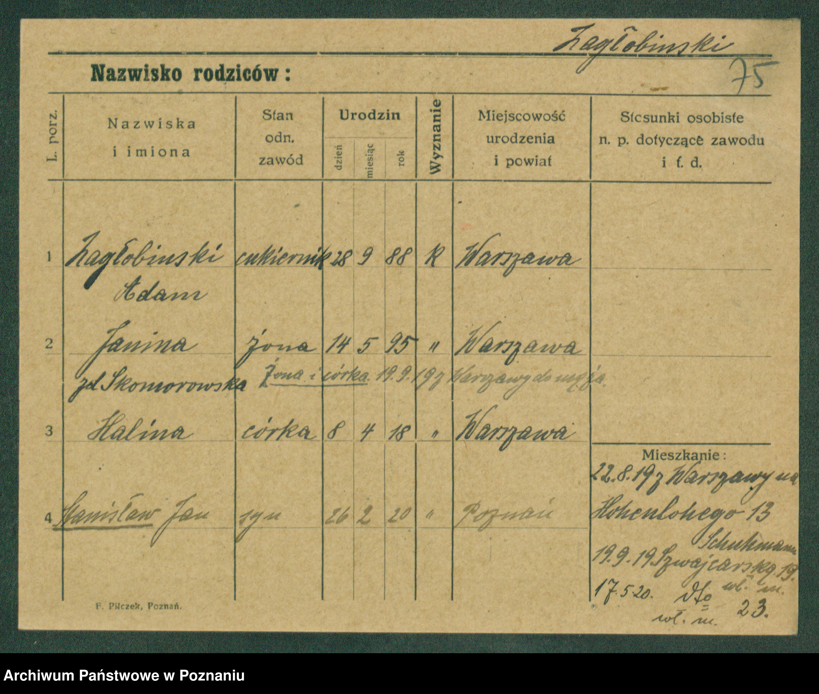 Podgląd karty osobowej dostępny jest po kliknięciu na nazwisko lub ikonkę karty. Można dokonywać powiększenia (ikony na górze) lub przechodzić między kolejnymi skanami (strzałki po bokach).