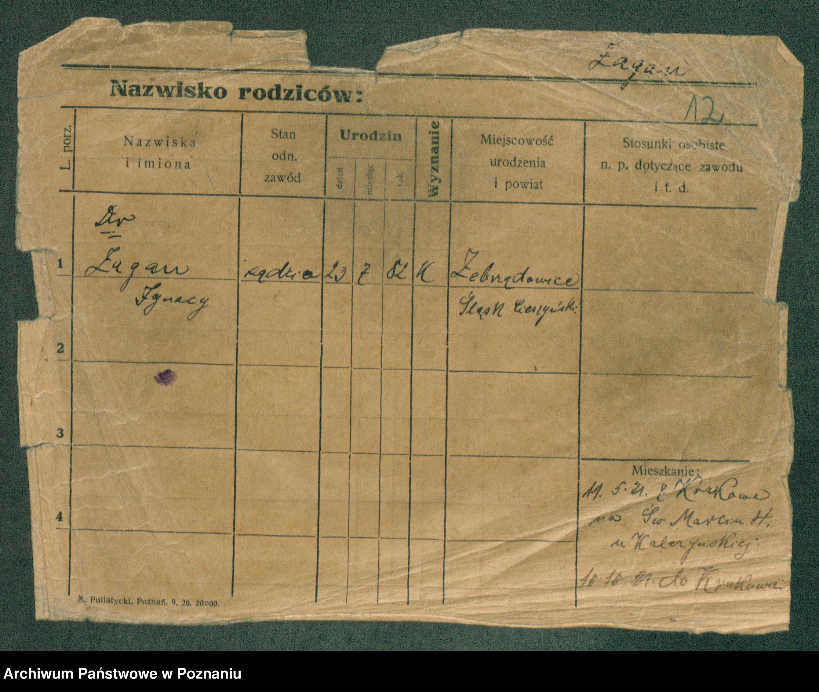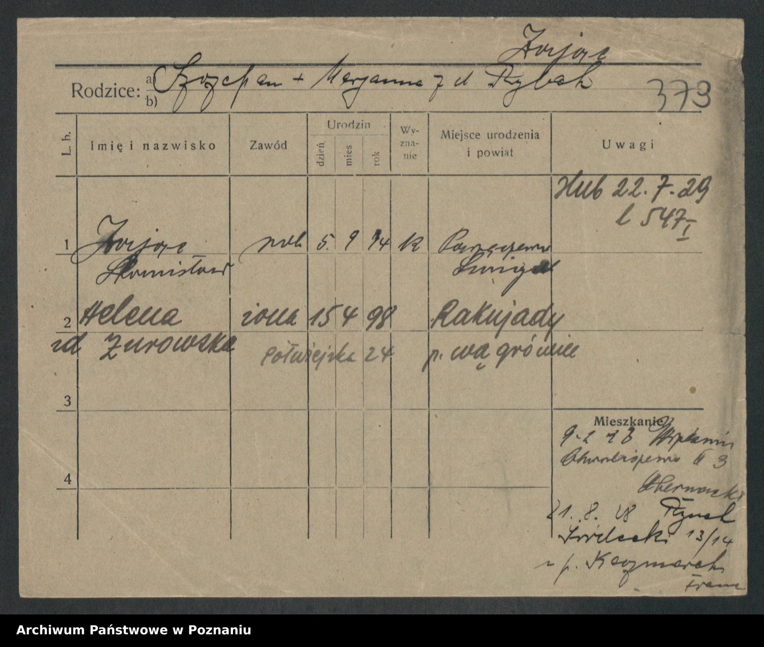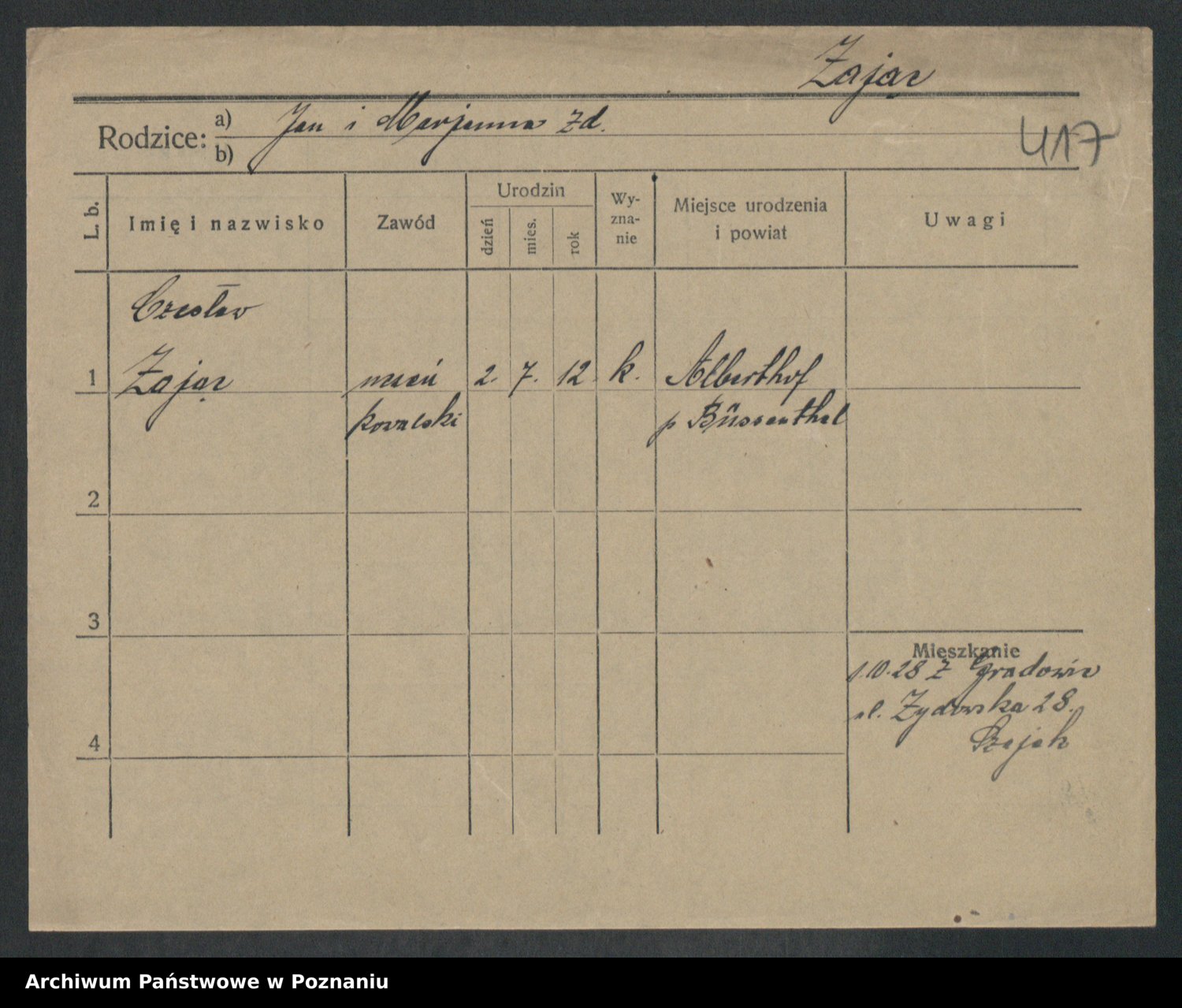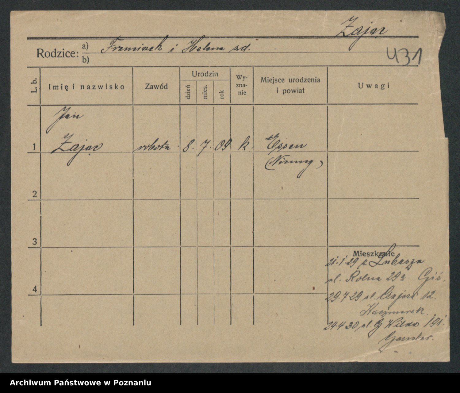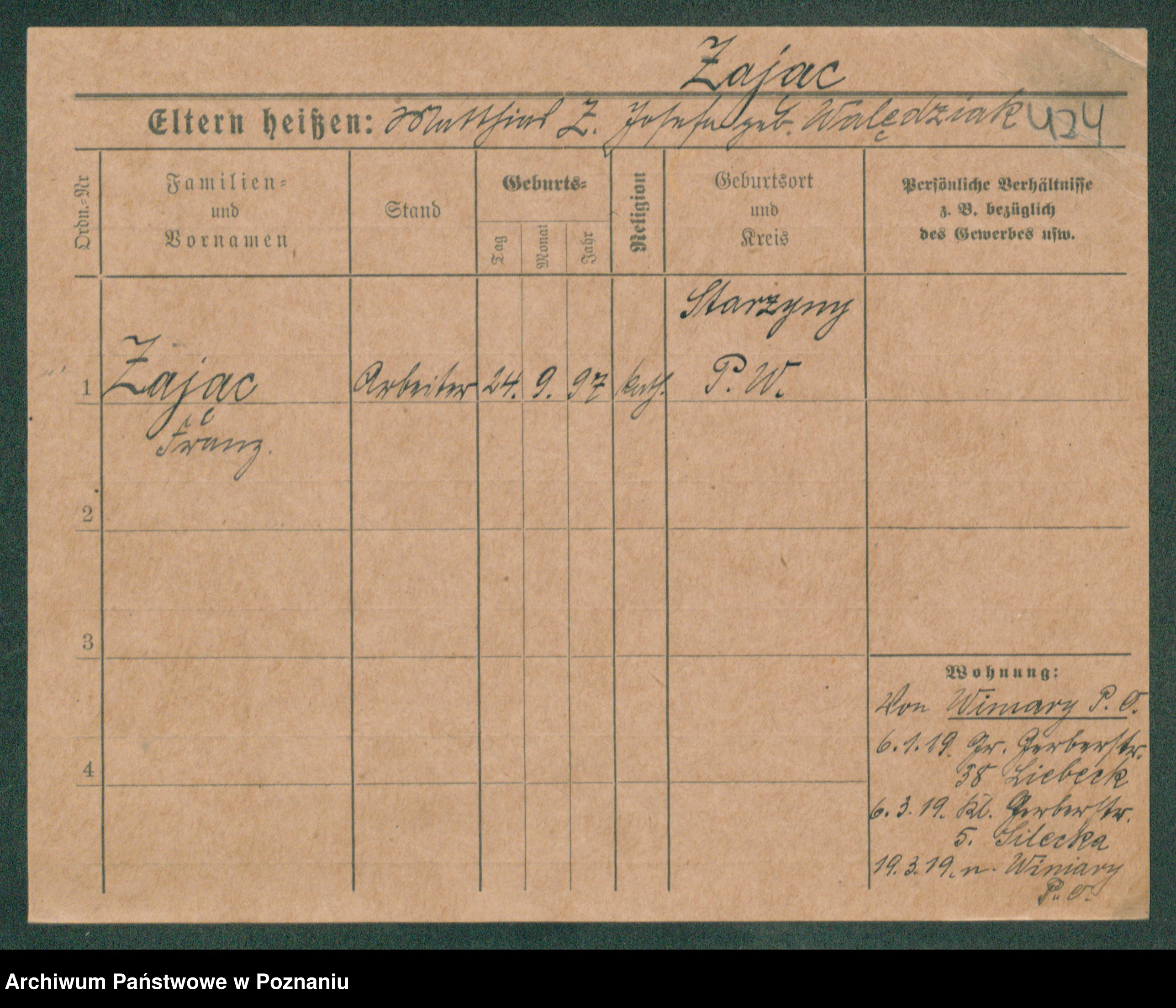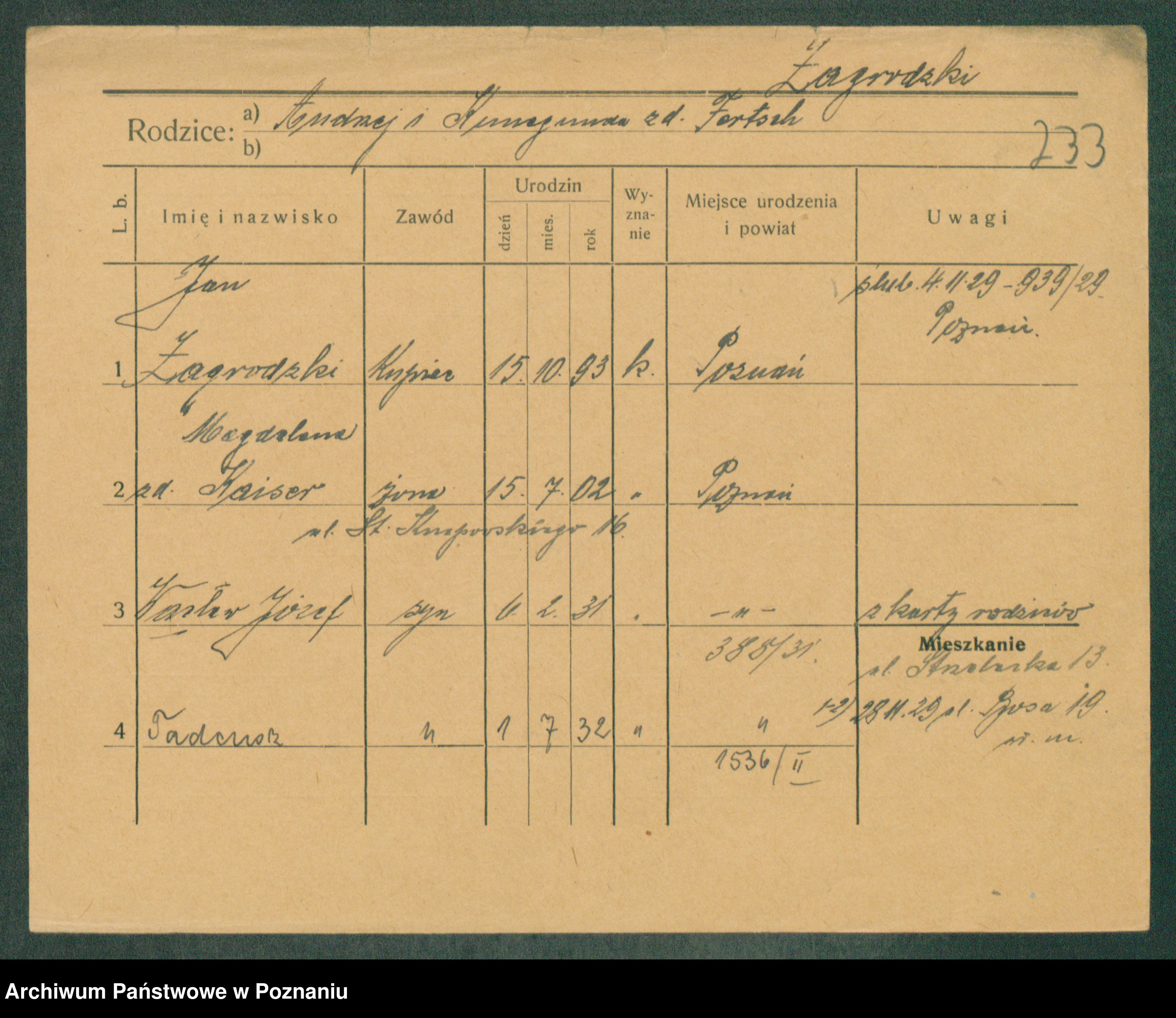 Podgląd karty osobowej dostępny jest po kliknięciu na nazwisko lub ikonkę karty. Można dokonywać powiększenia (ikony na górze) lub przechodzić między kolejnymi skanami (strzałki po bokach).