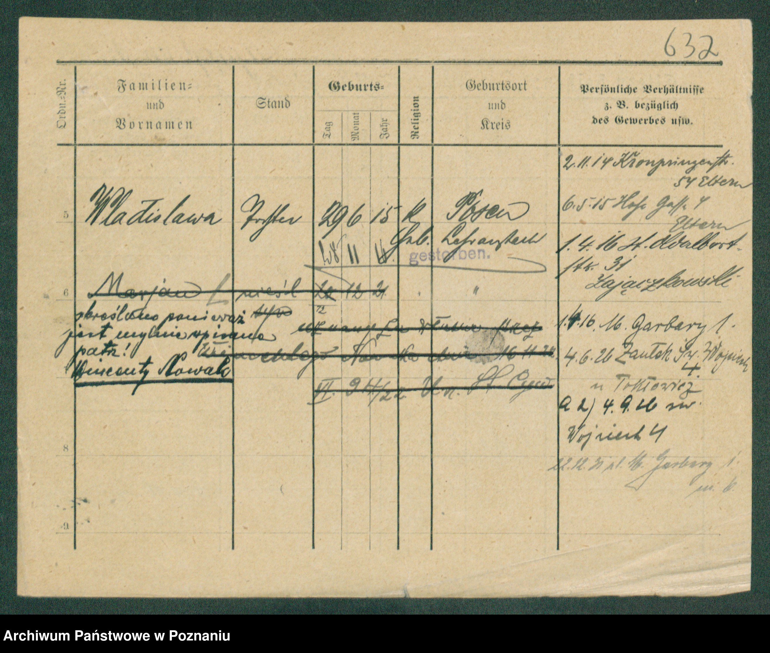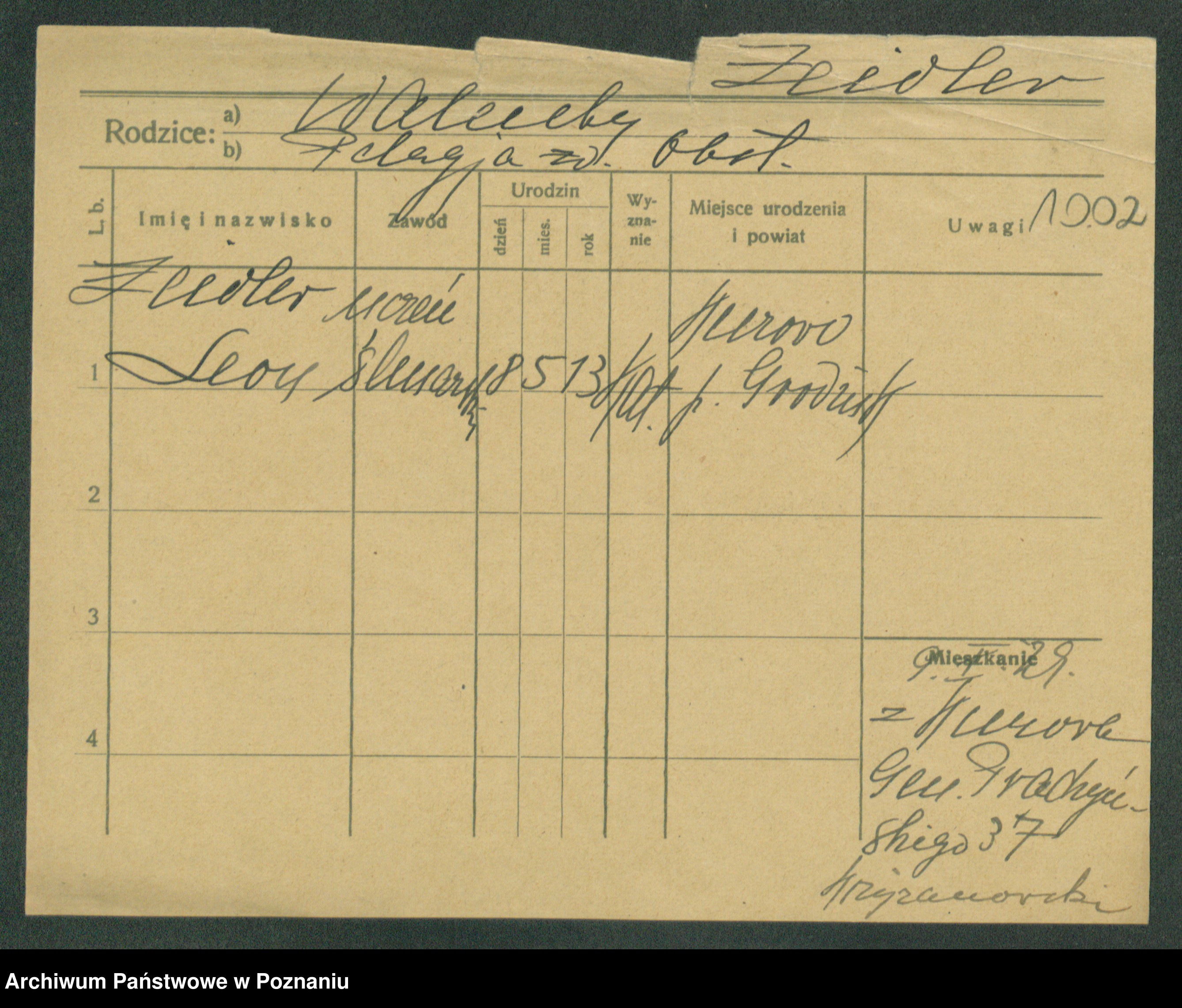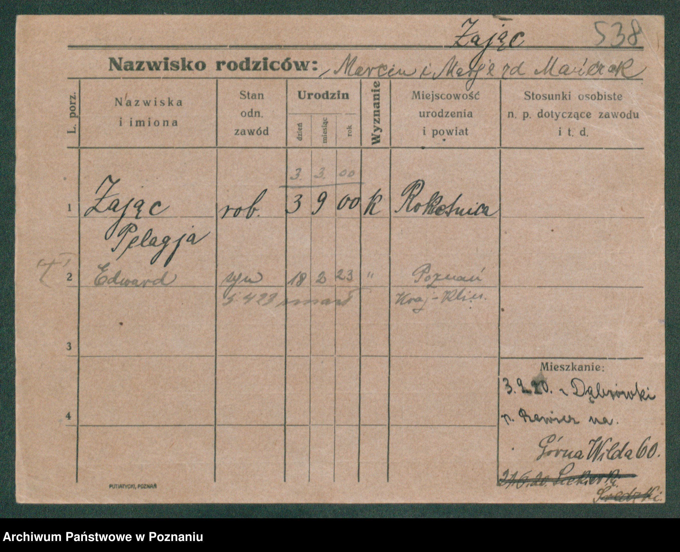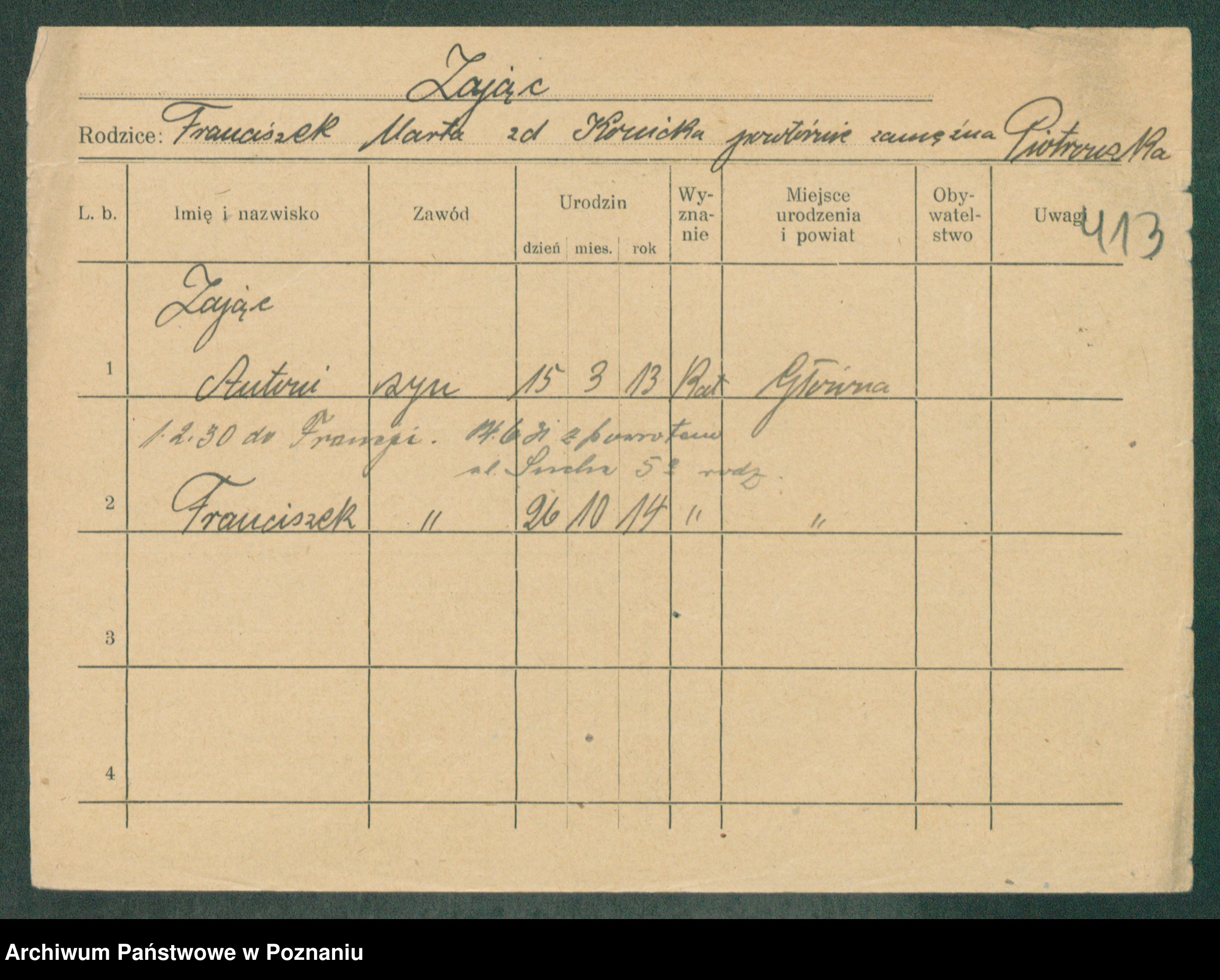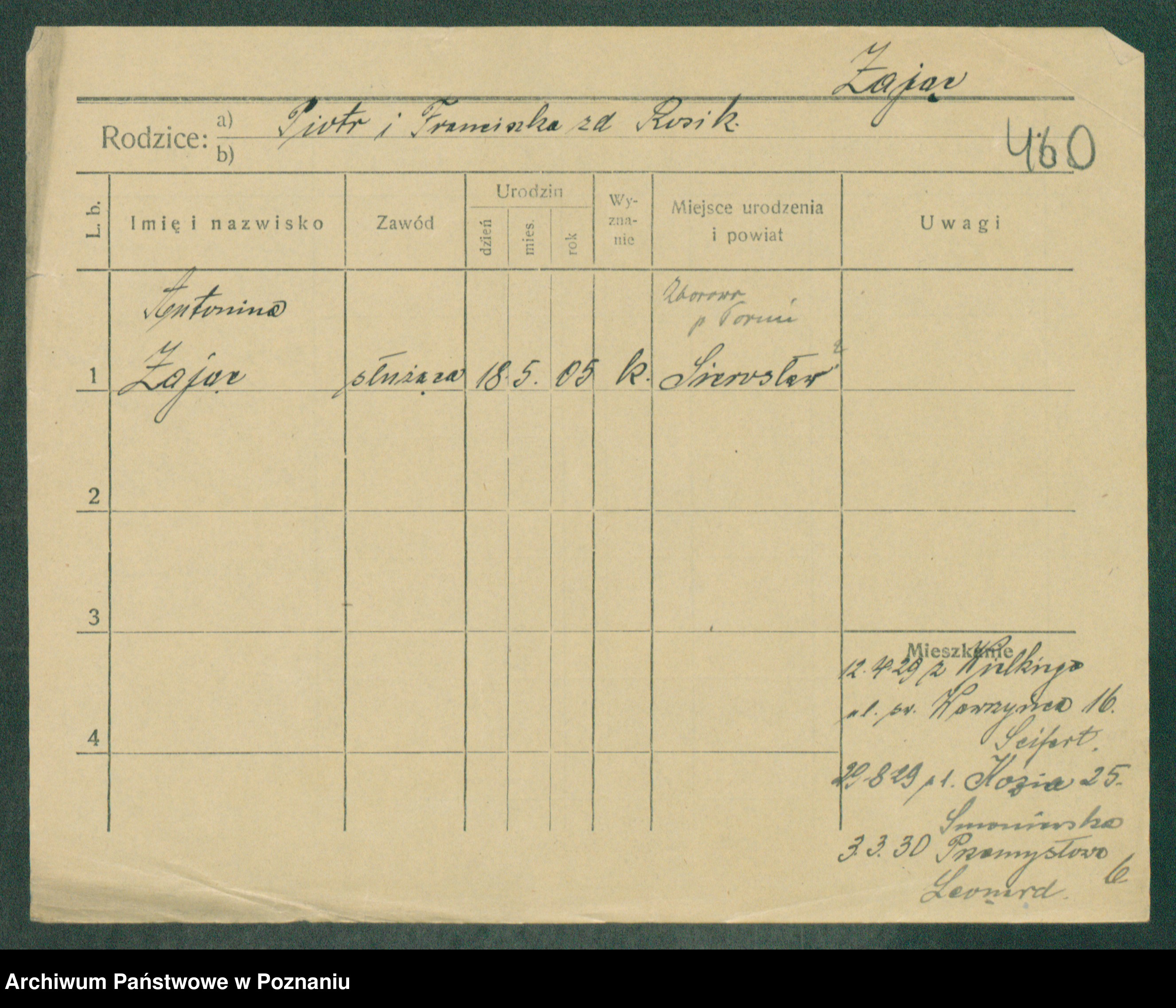 Podgląd karty osobowej dostępny jest po kliknięciu na nazwisko lub ikonkę karty. Można dokonywać powiększenia (ikony na górze) lub przechodzić między kolejnymi skanami (strzałki po bokach).