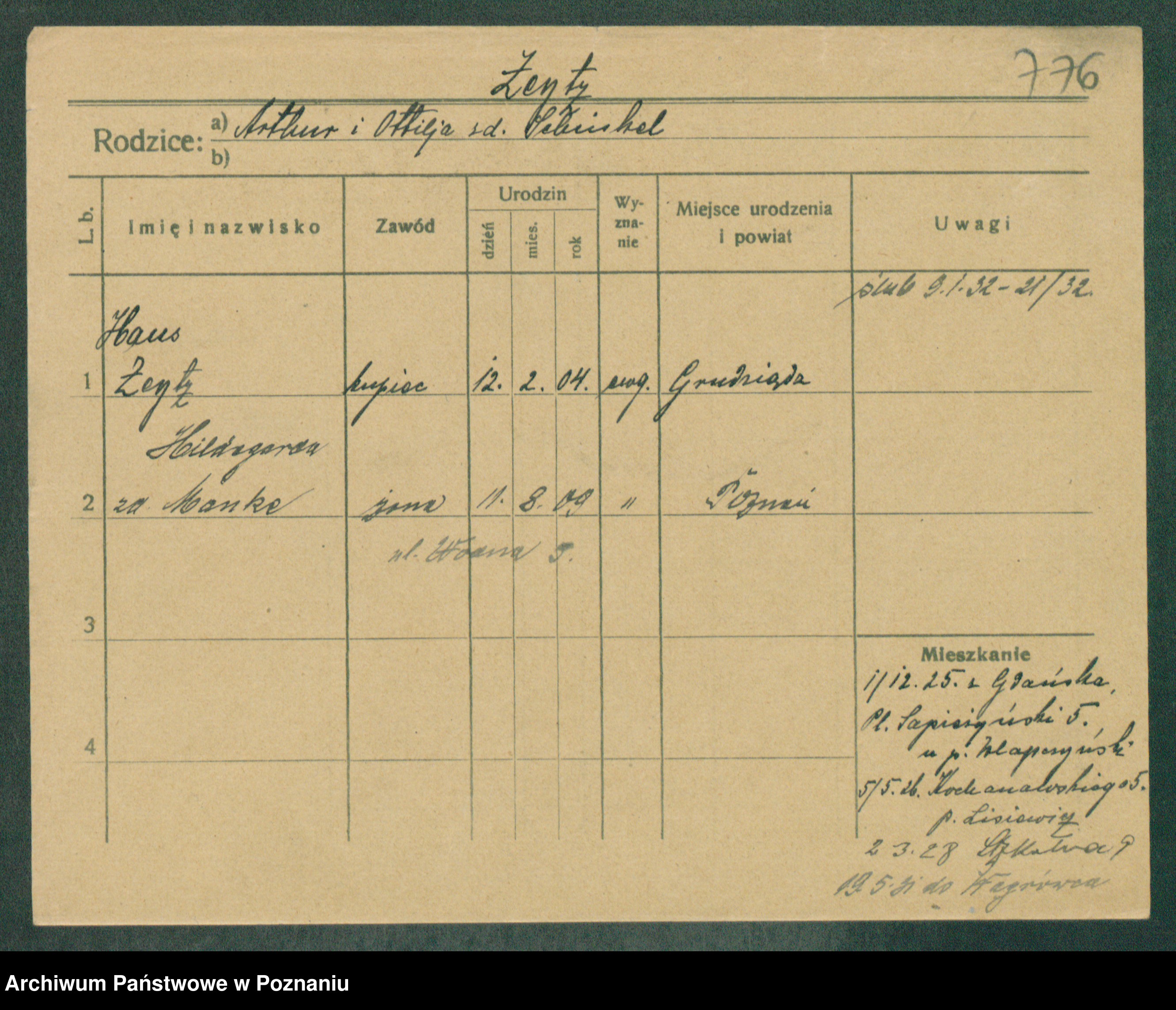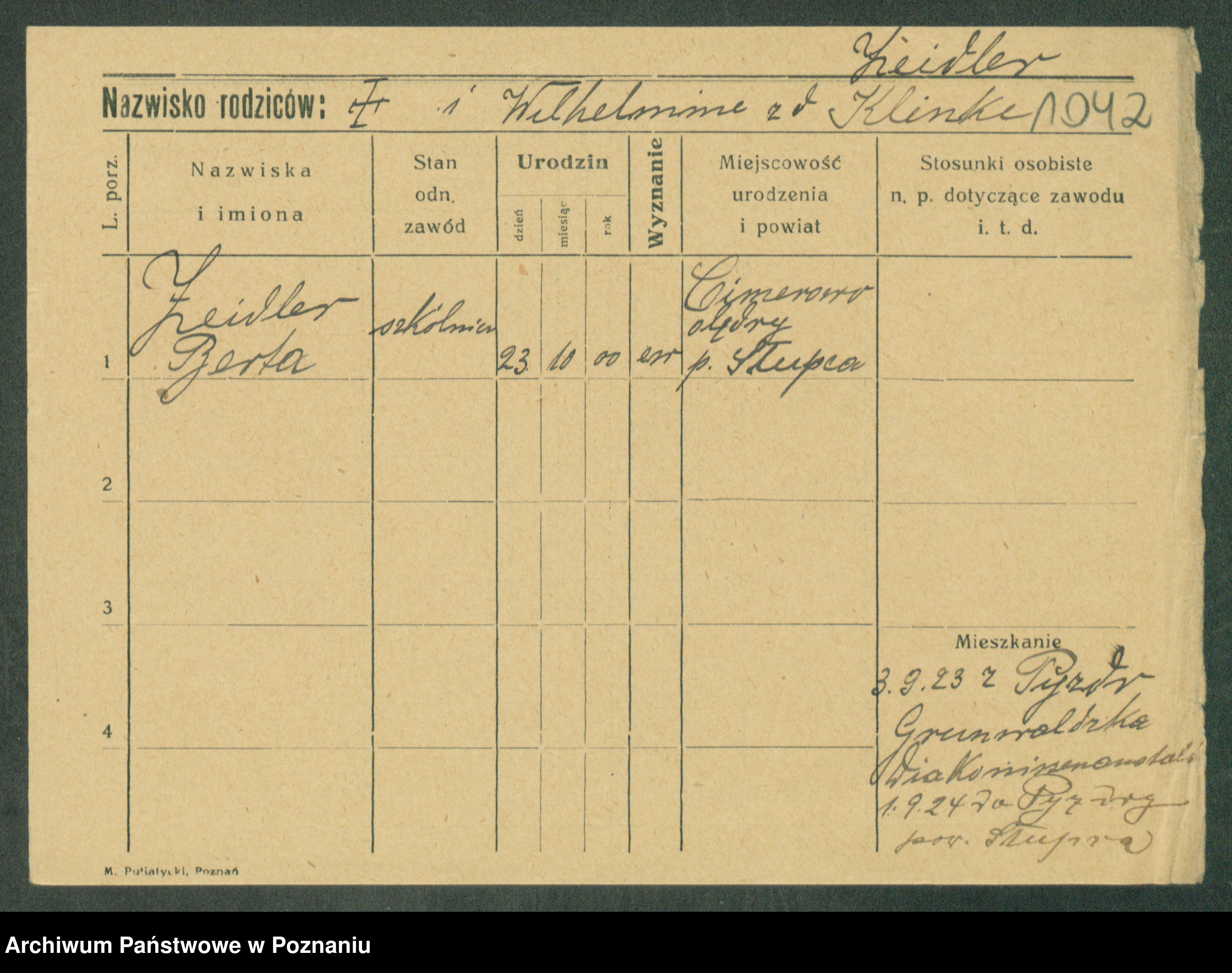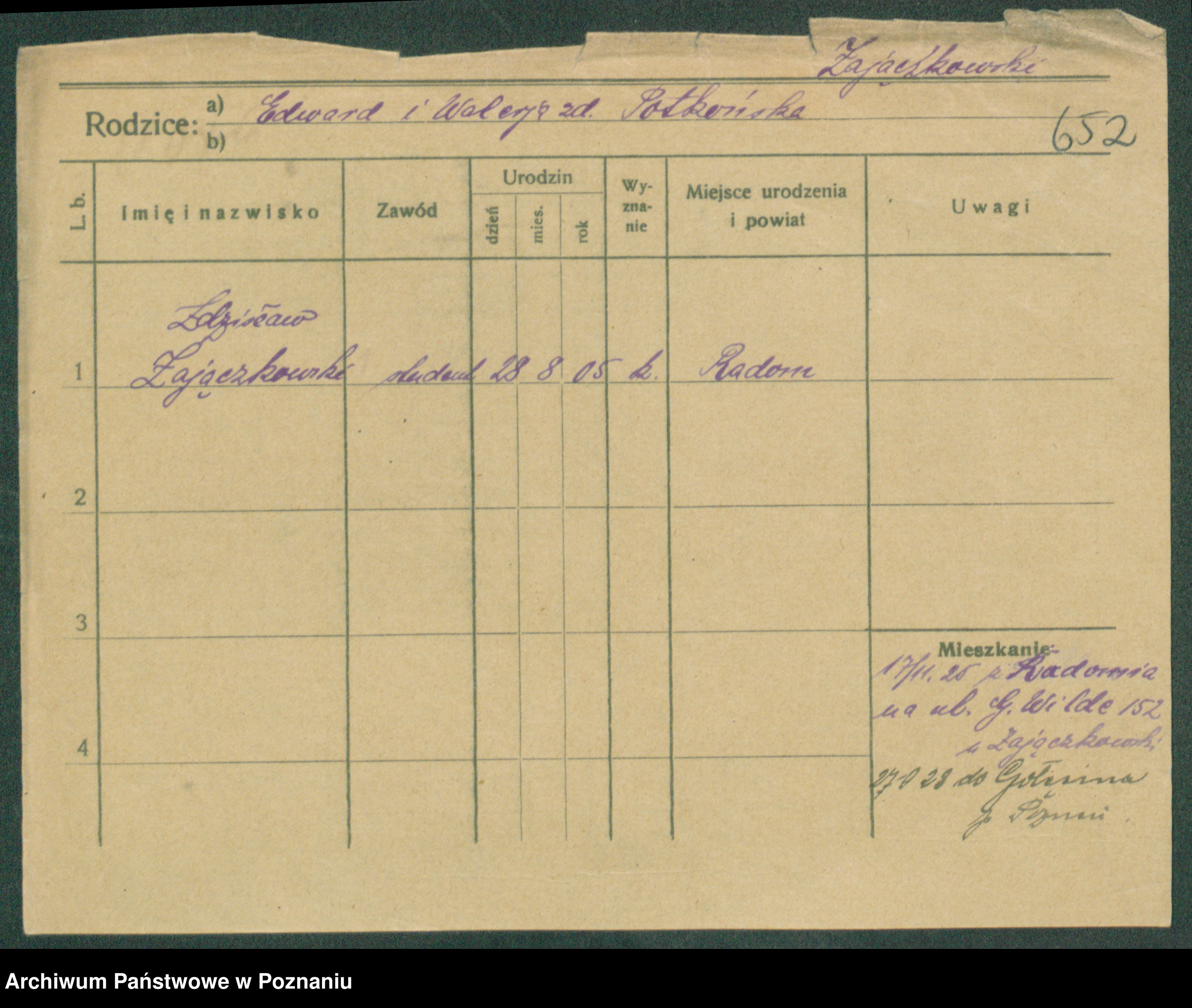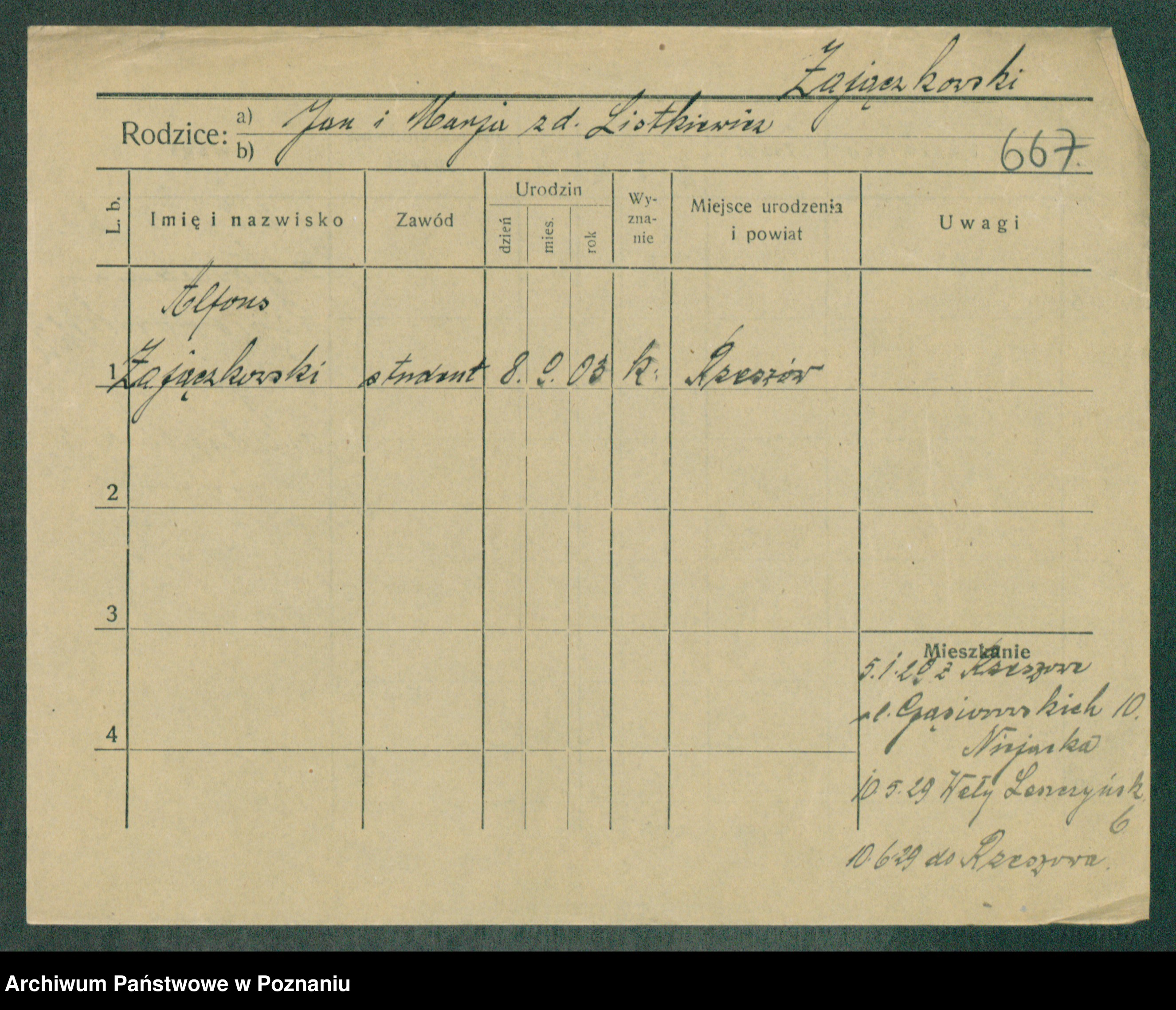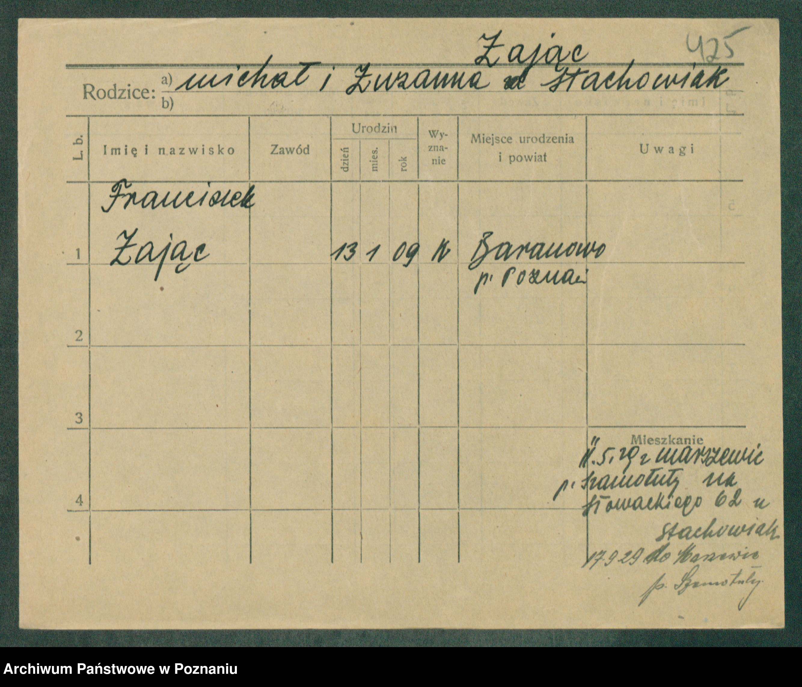 Podgląd karty osobowej dostępny jest po kliknięciu na nazwisko lub ikonkę karty. Można dokonywać powiększenia (ikony na górze) lub przechodzić między kolejnymi skanami (strzałki po bokach).