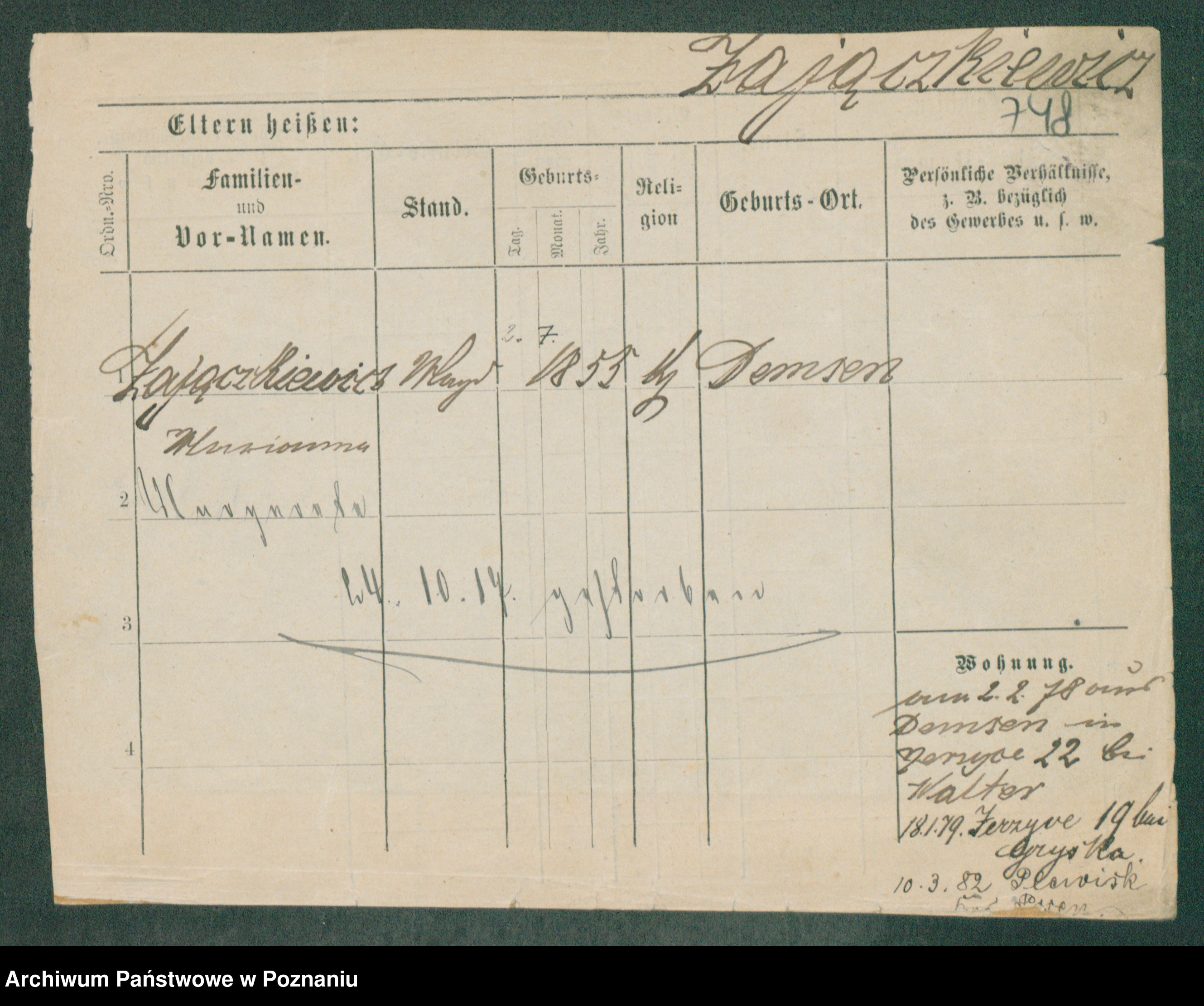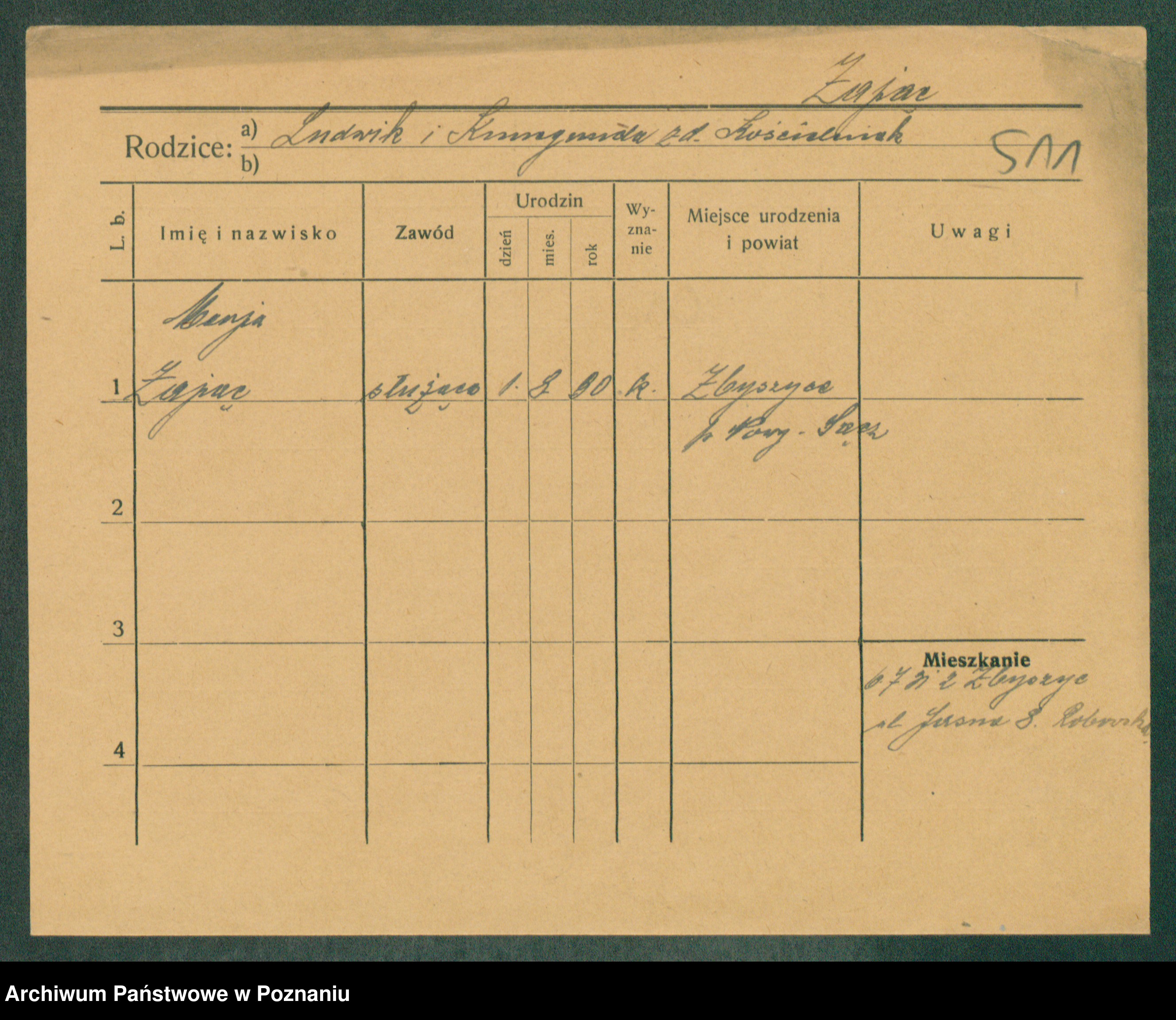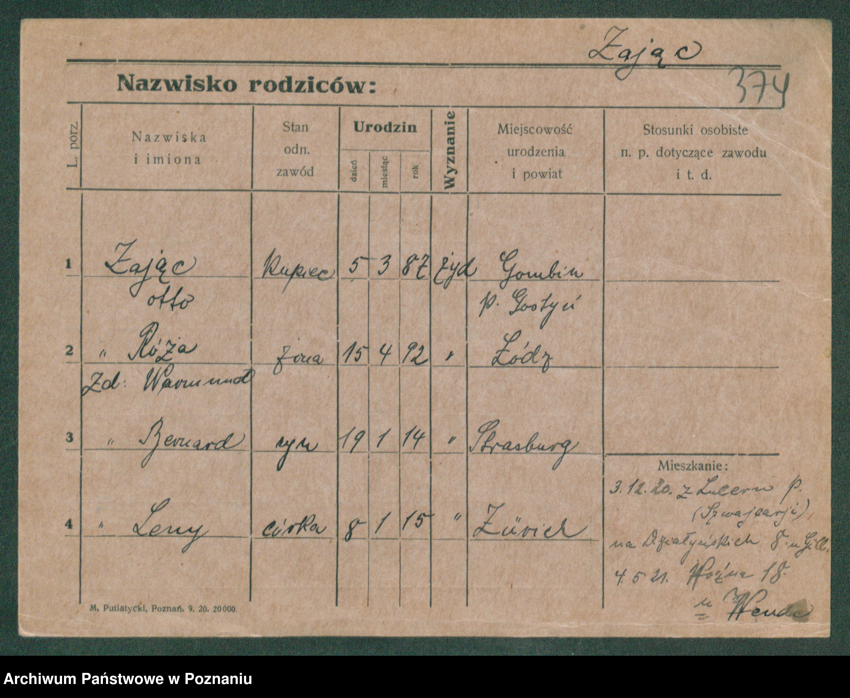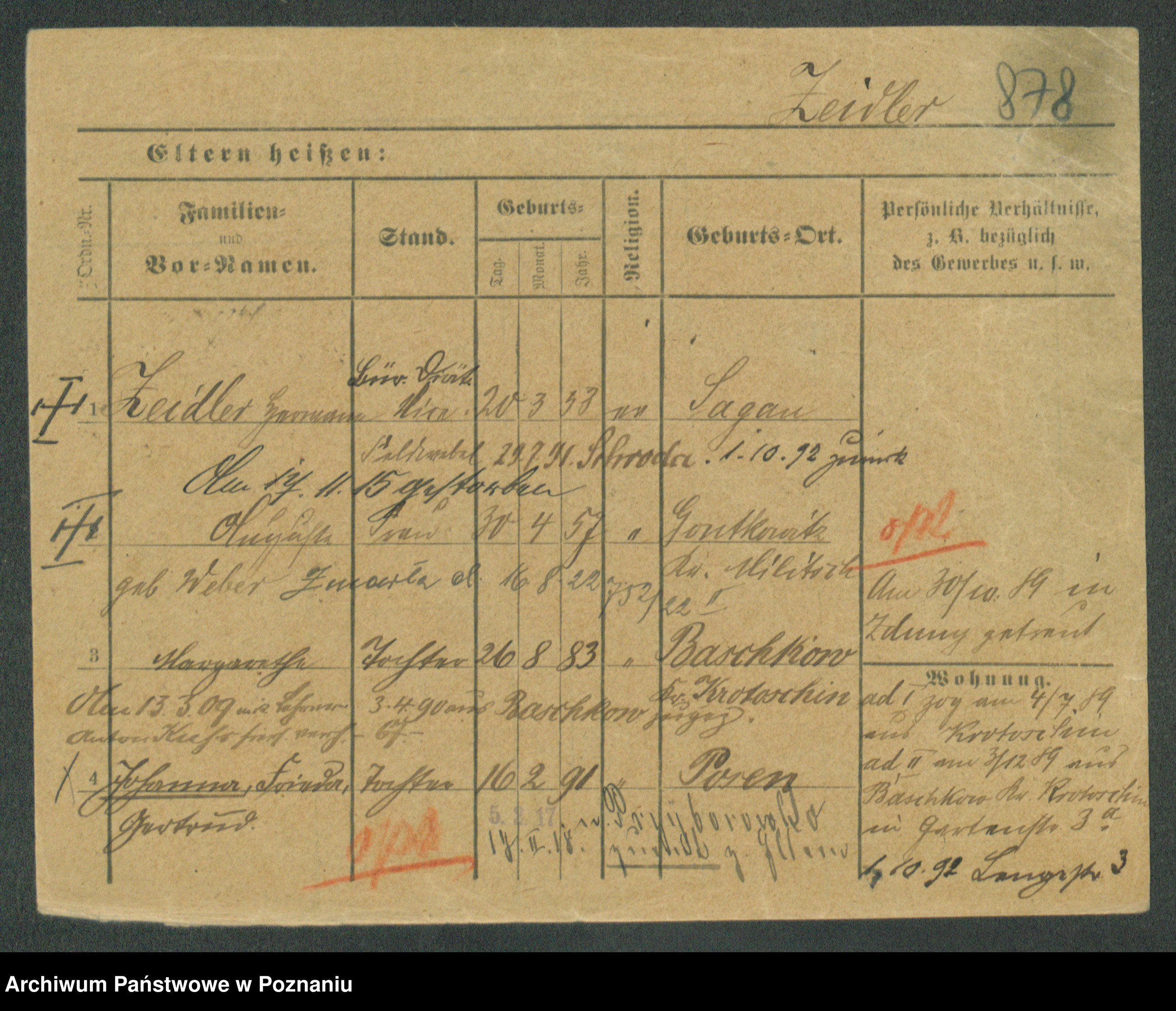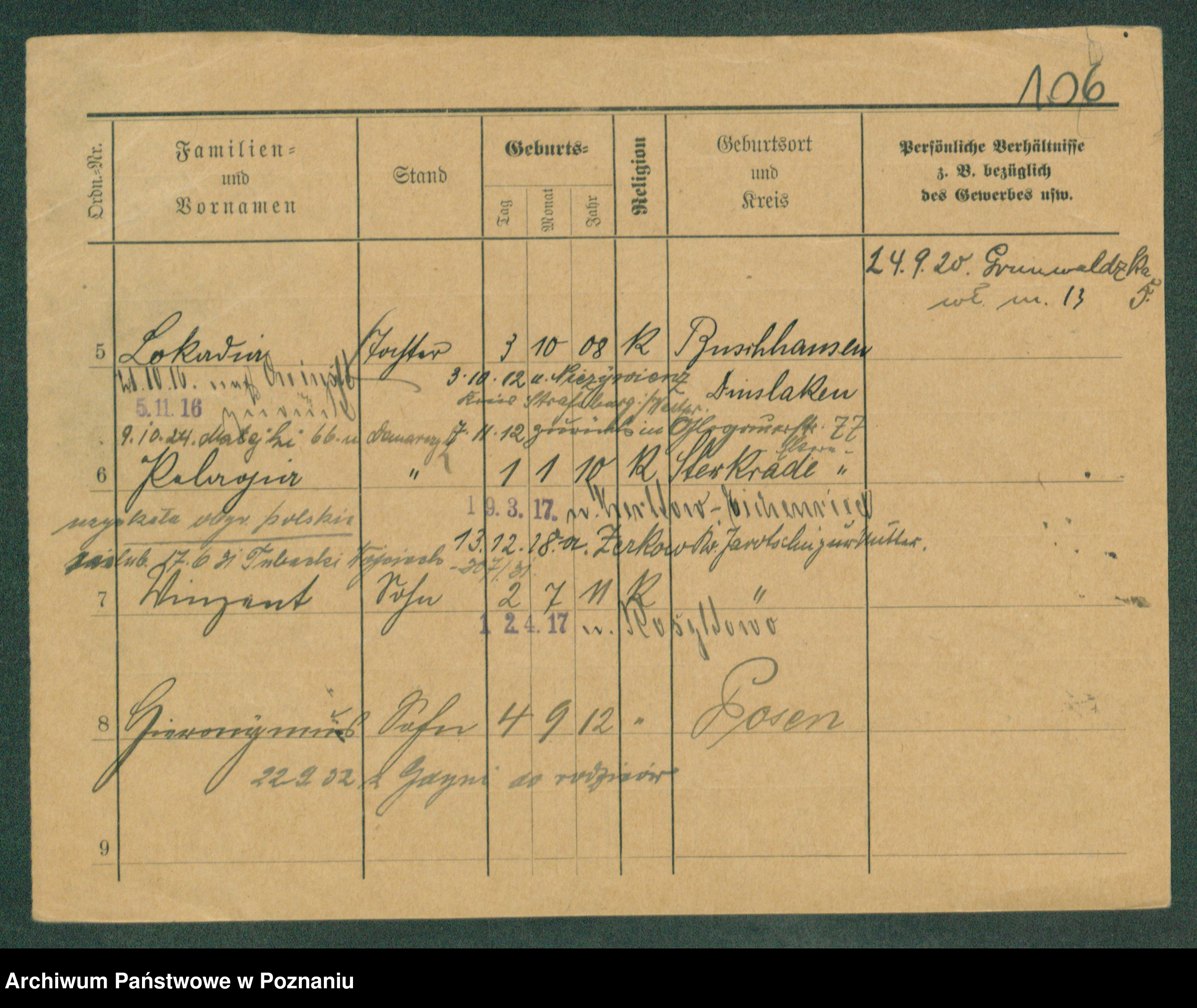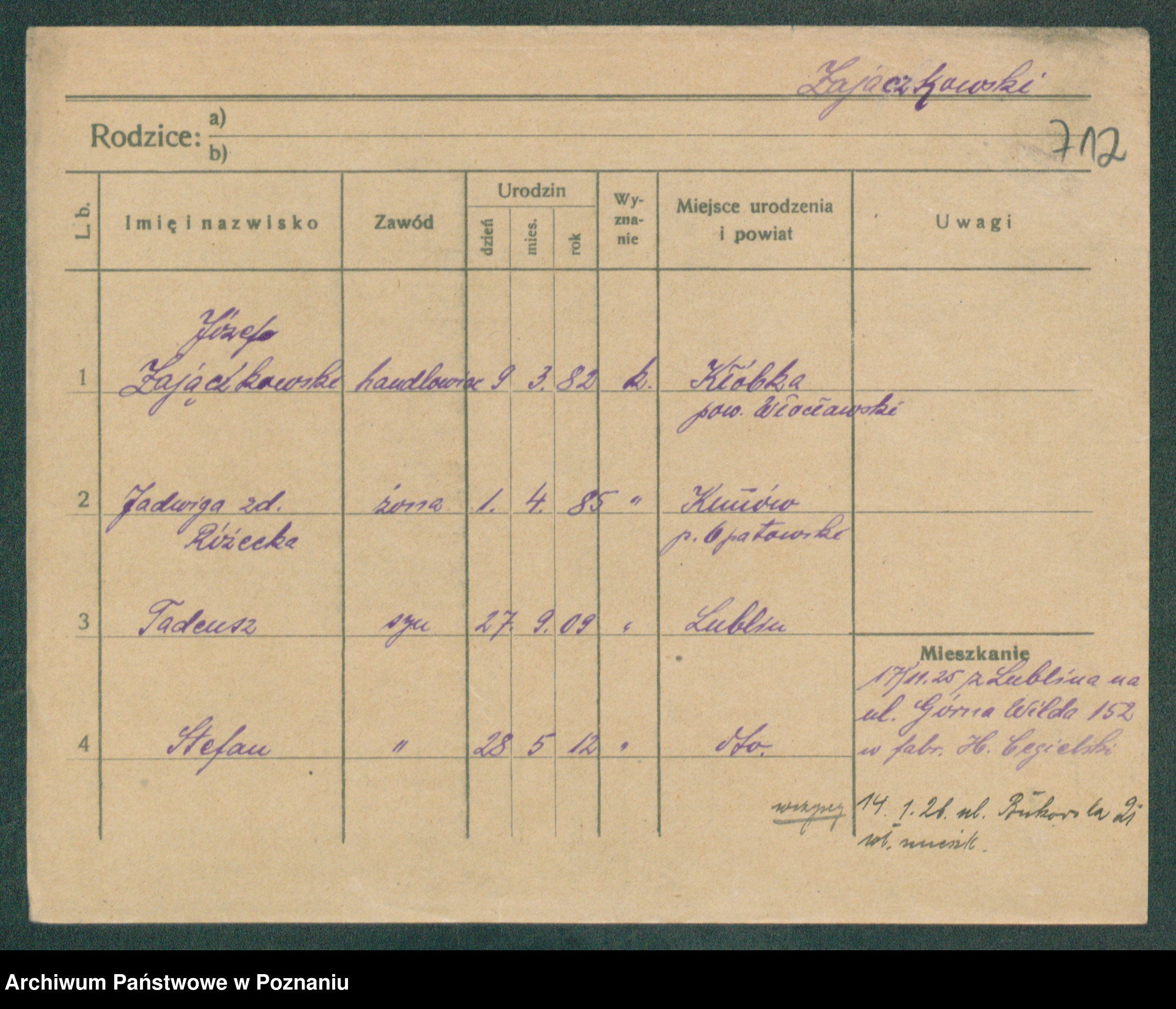 Podgląd karty osobowej dostępny jest po kliknięciu na nazwisko lub ikonkę karty. Można dokonywać powiększenia (ikony na górze) lub przechodzić między kolejnymi skanami (strzałki po bokach).