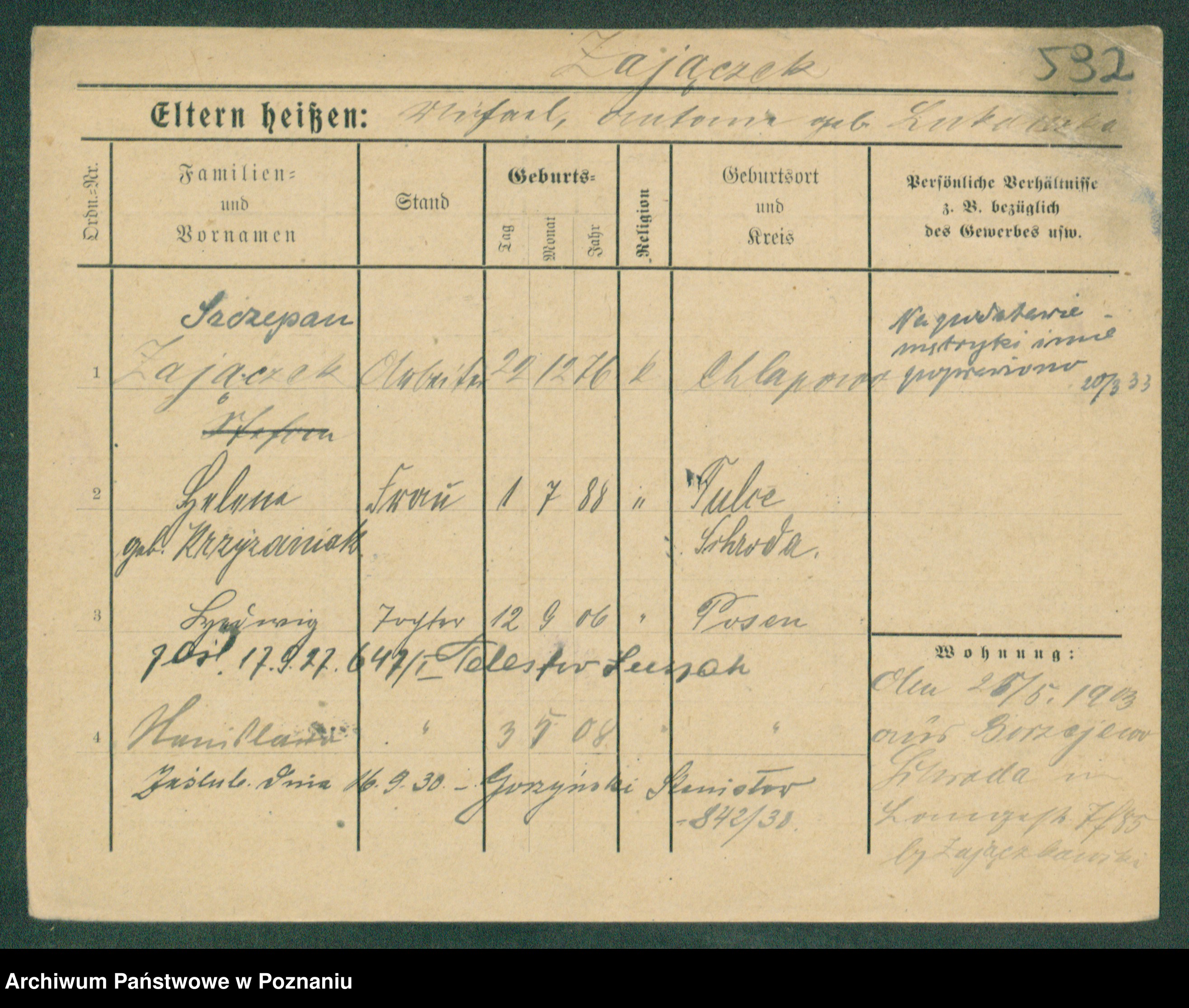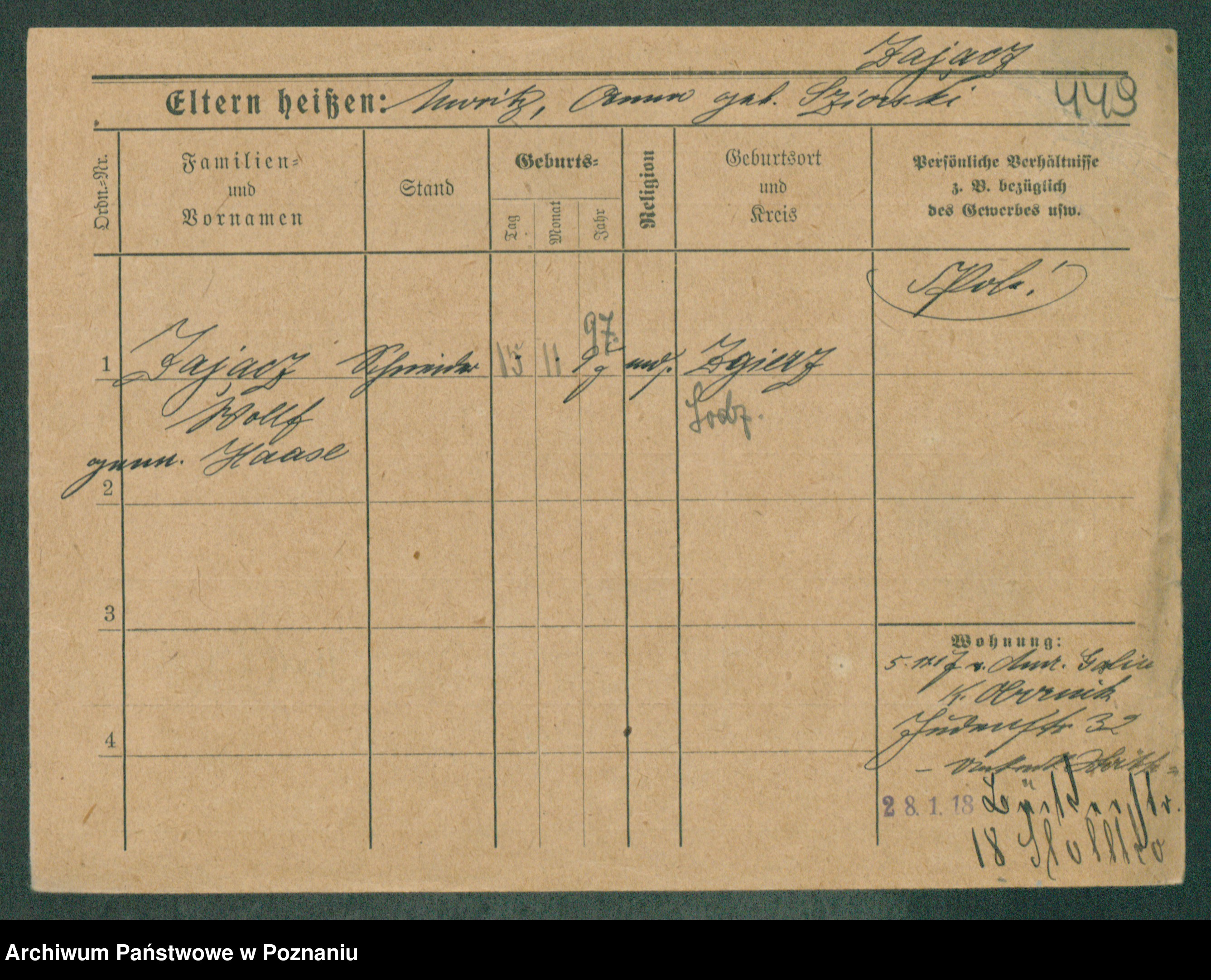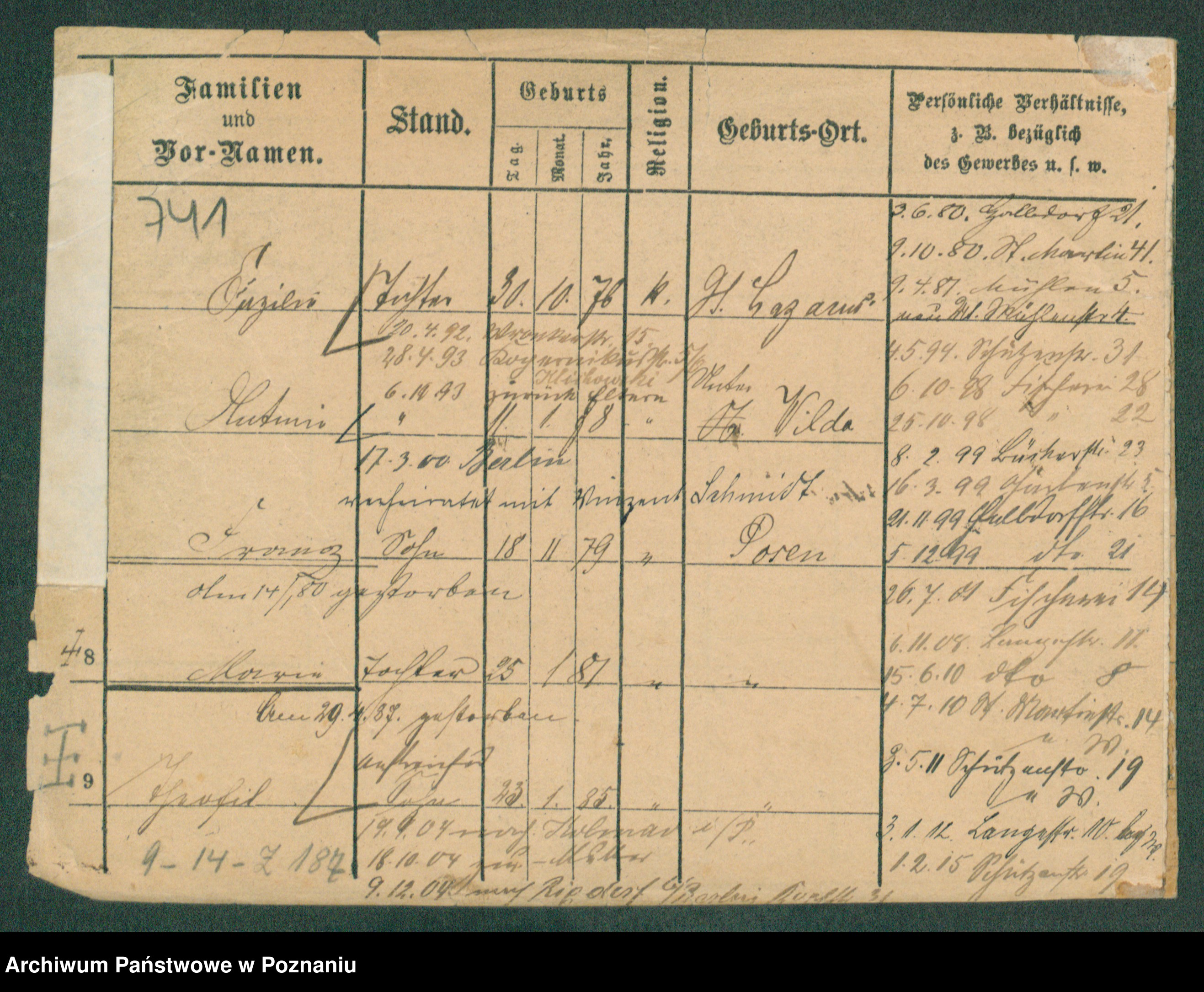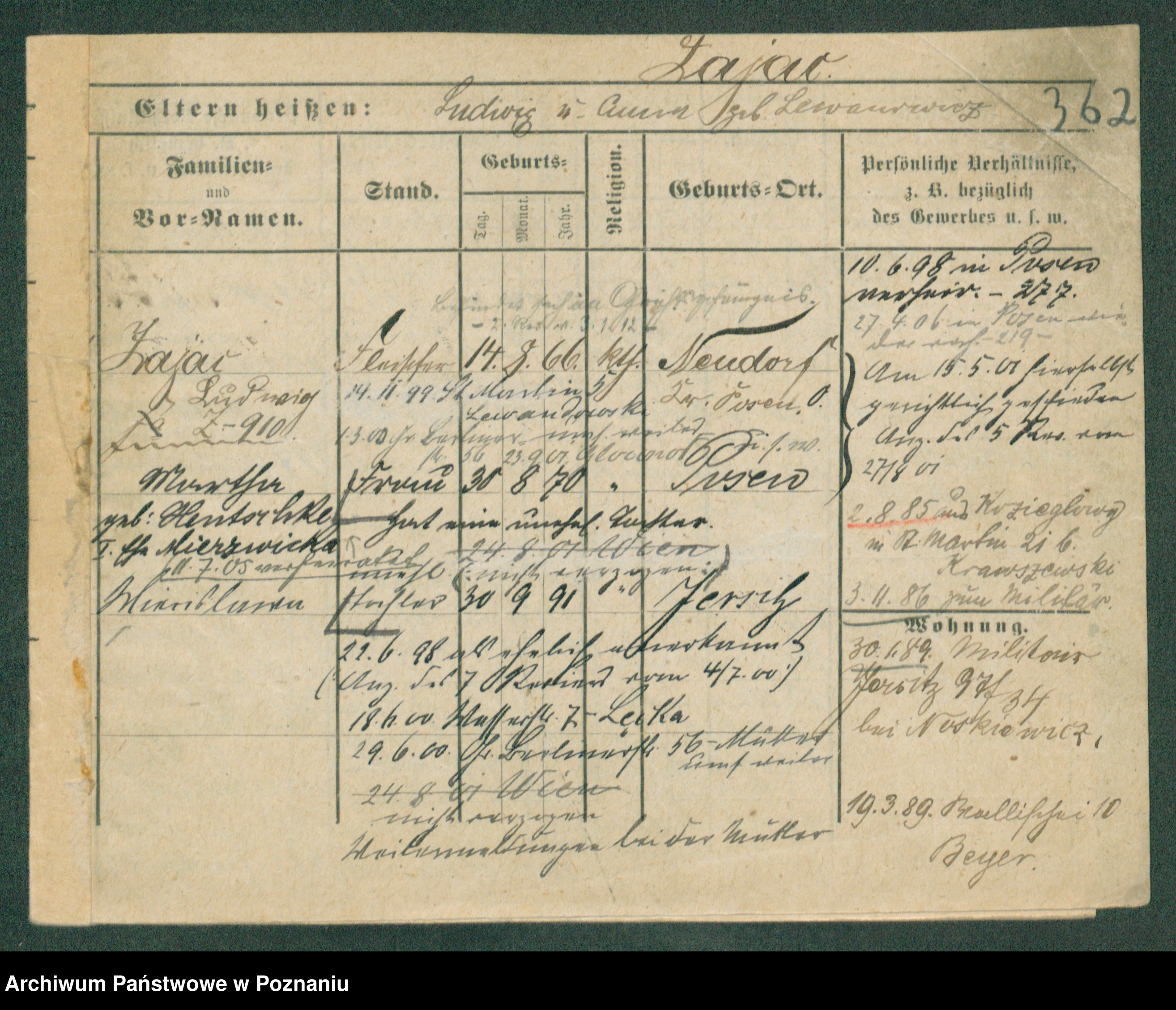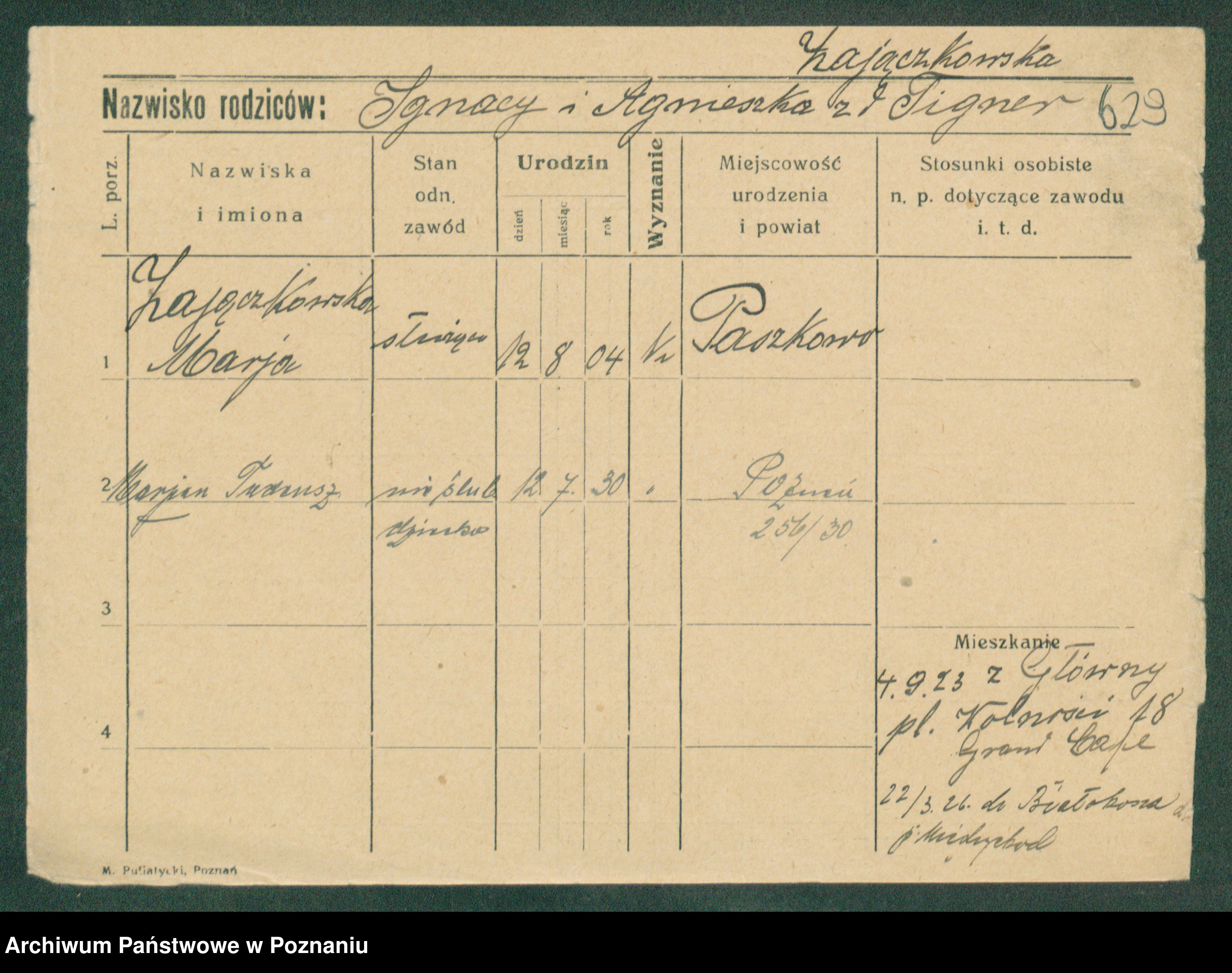 Podgląd karty osobowej dostępny jest po kliknięciu na nazwisko lub ikonkę karty. Można dokonywać powiększenia (ikony na górze) lub przechodzić między kolejnymi skanami (strzałki po bokach).