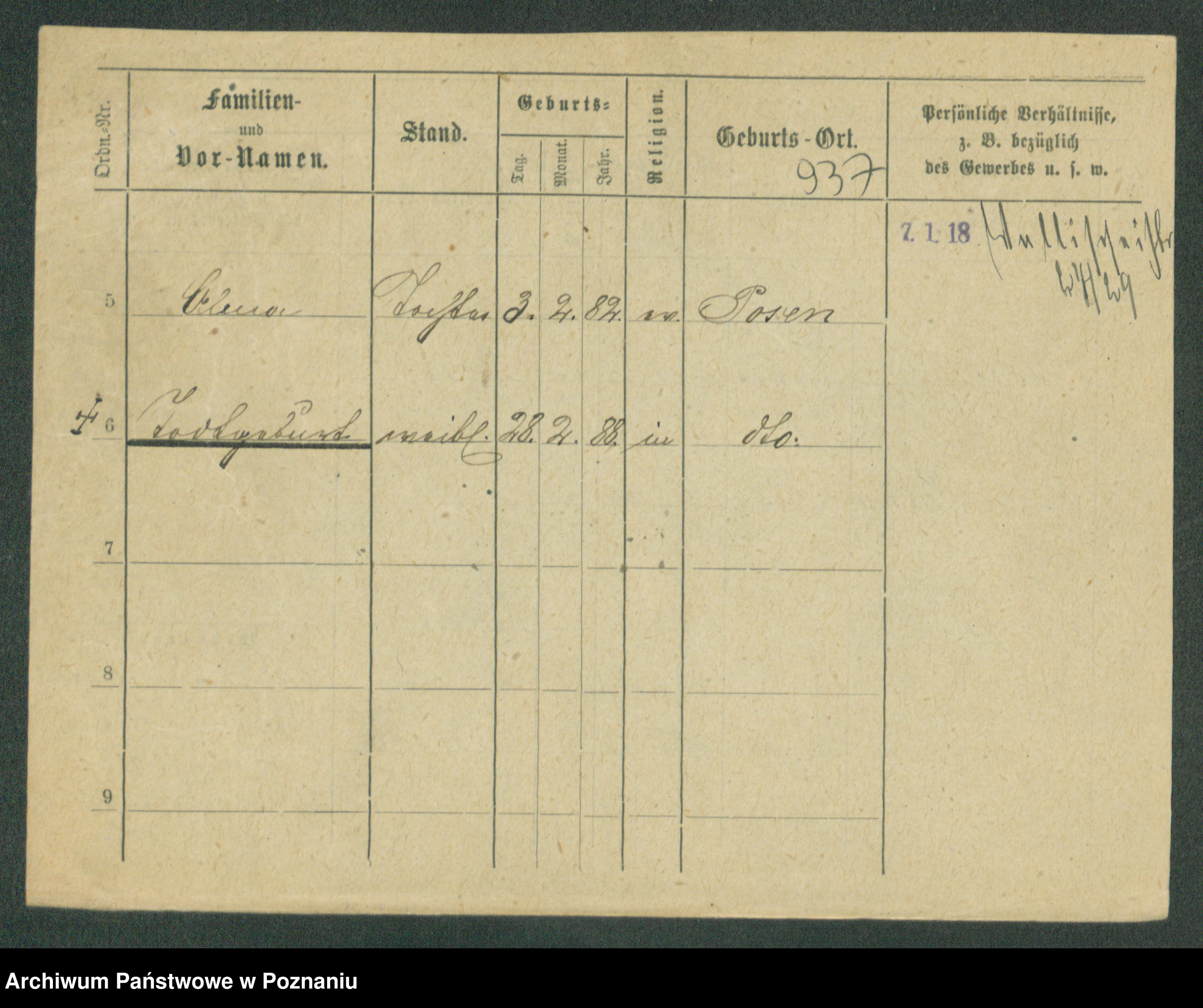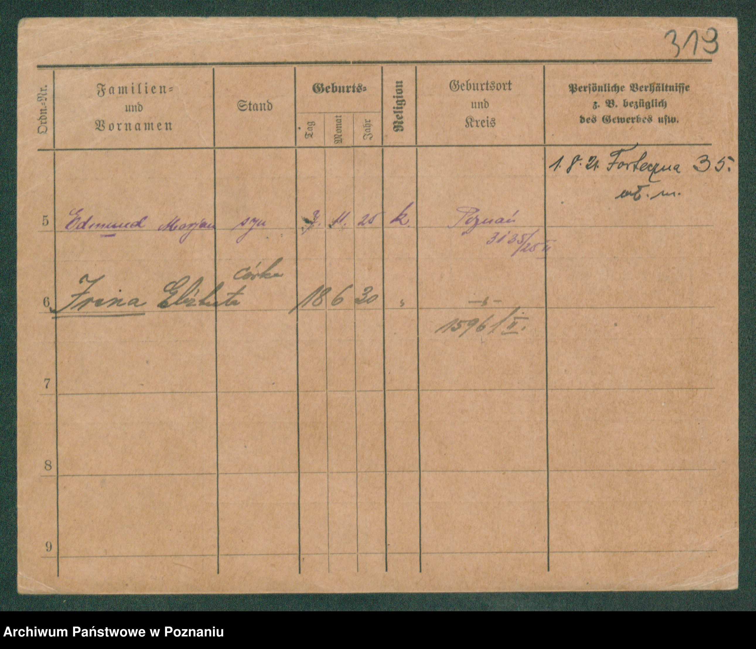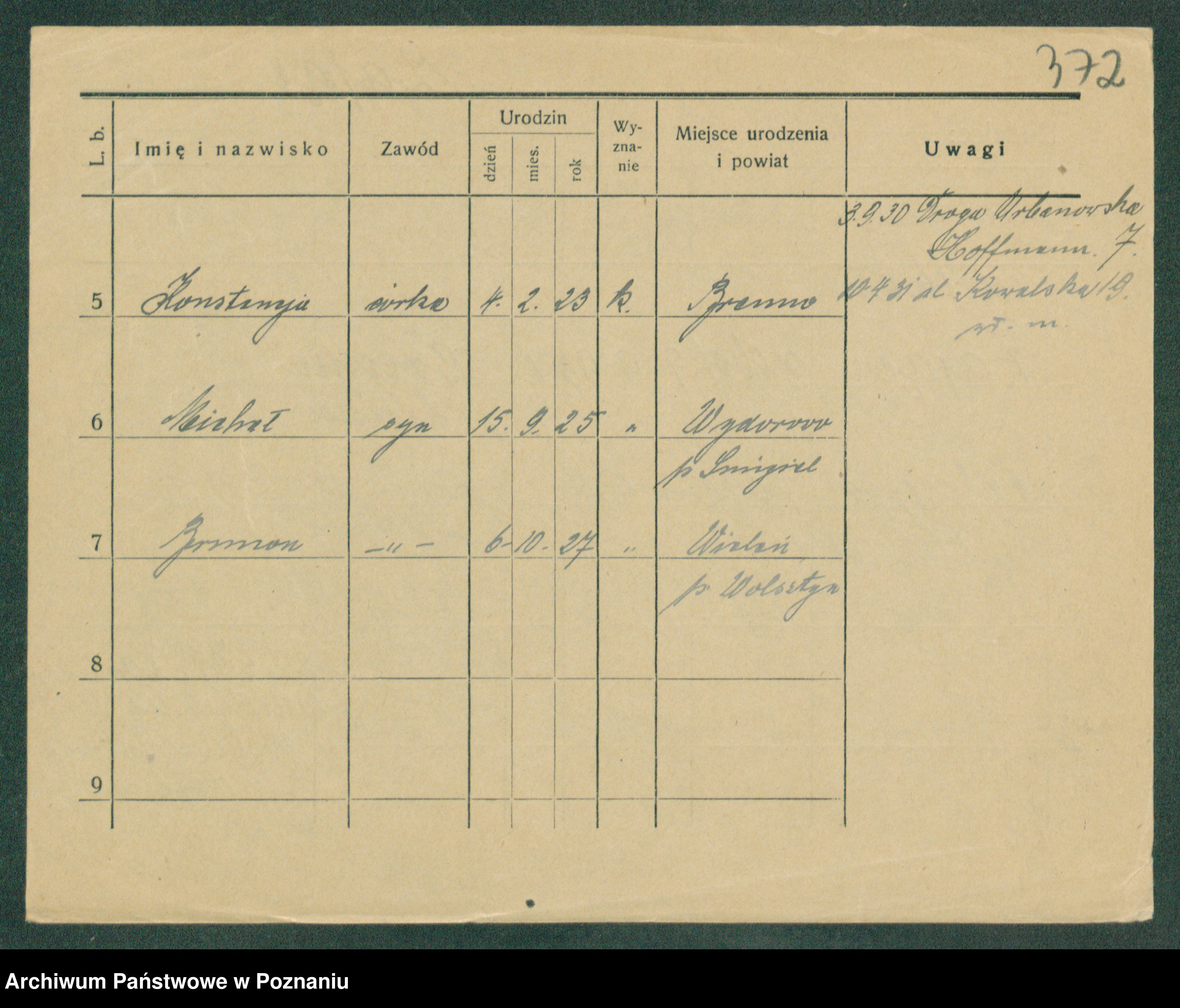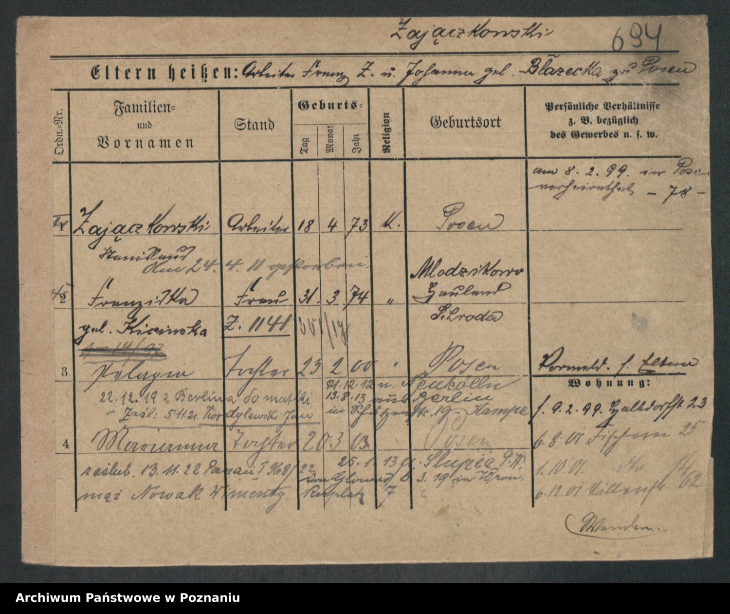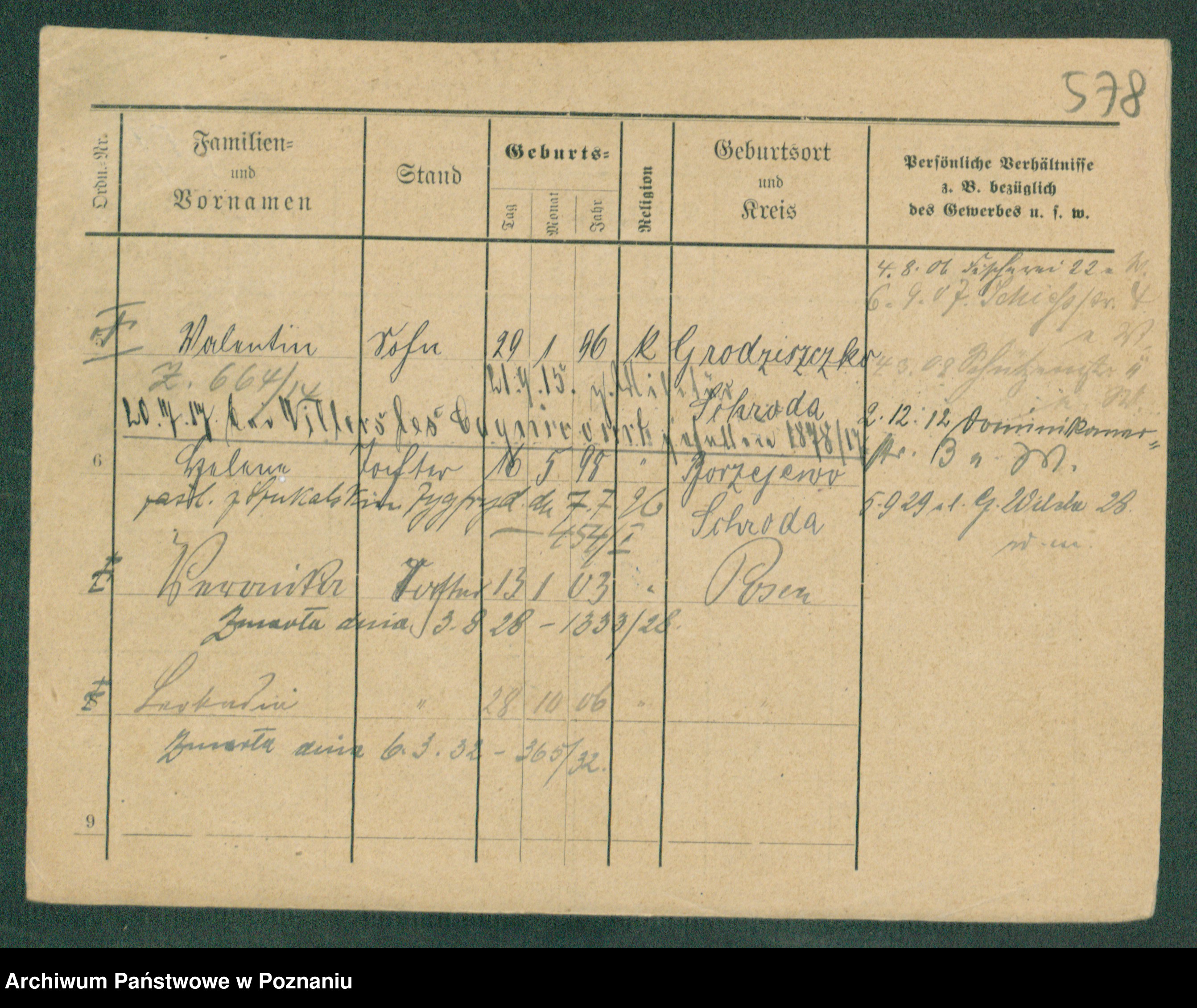 Podgląd karty osobowej dostępny jest po kliknięciu na nazwisko lub ikonkę karty. Można dokonywać powiększenia (ikony na górze) lub przechodzić między kolejnymi skanami (strzałki po bokach).