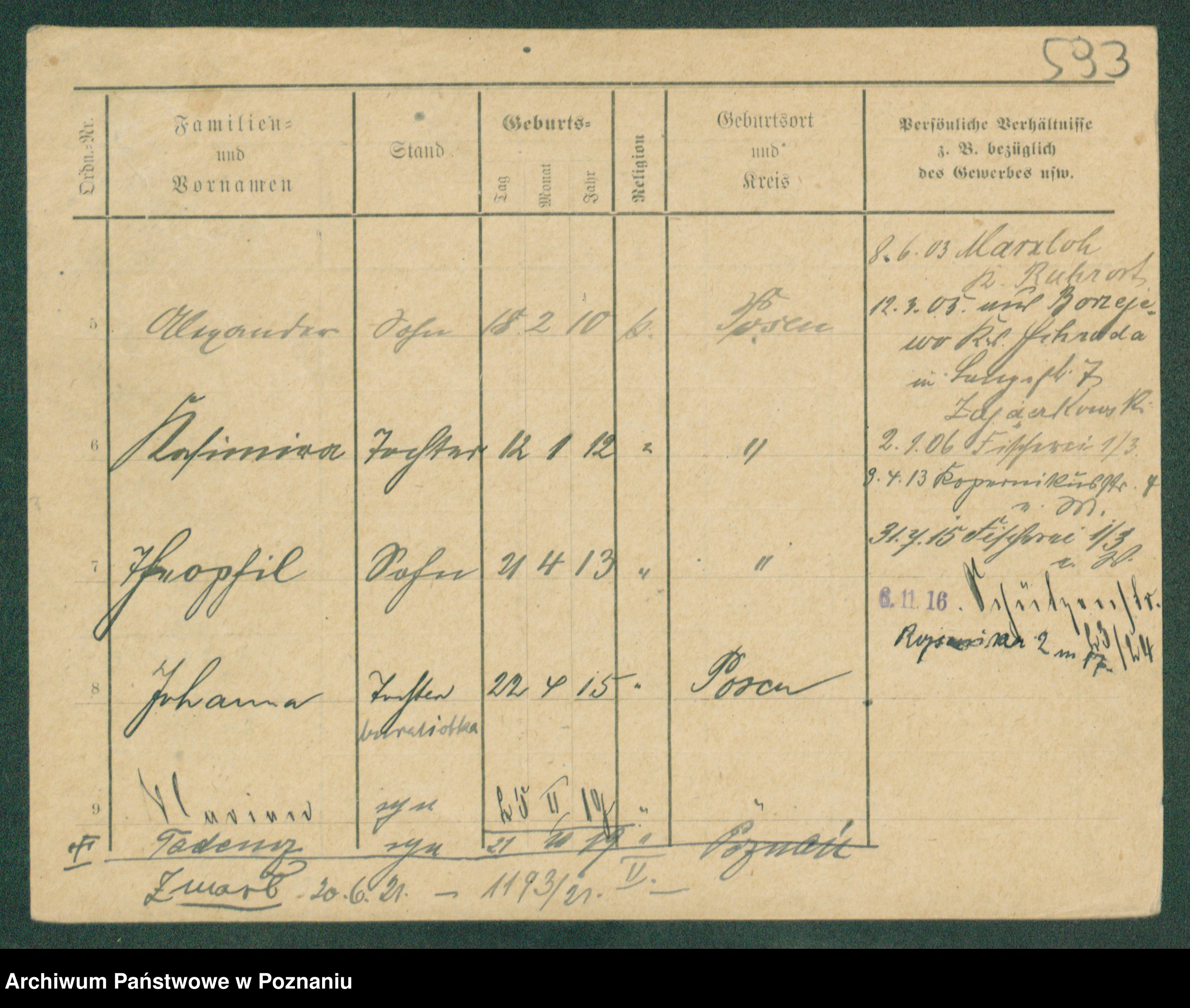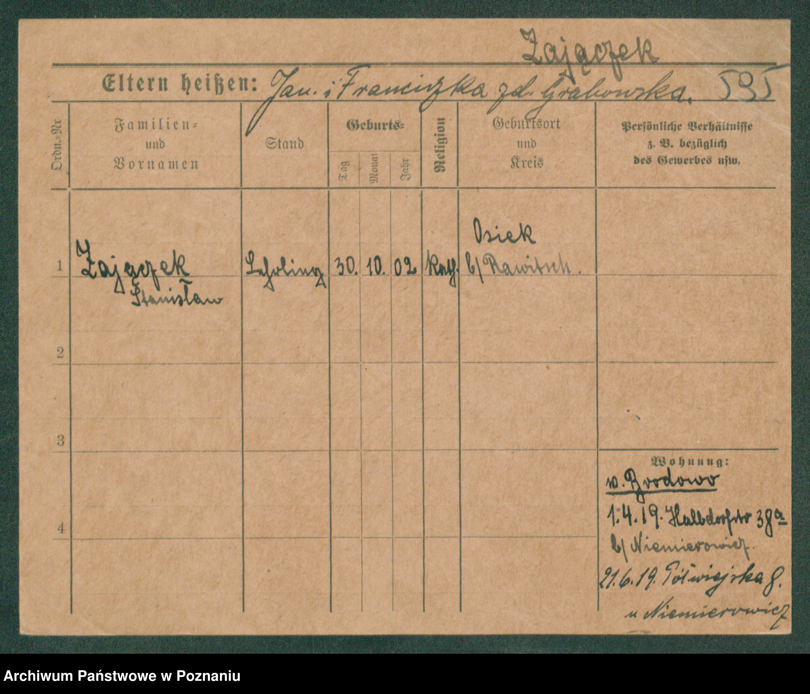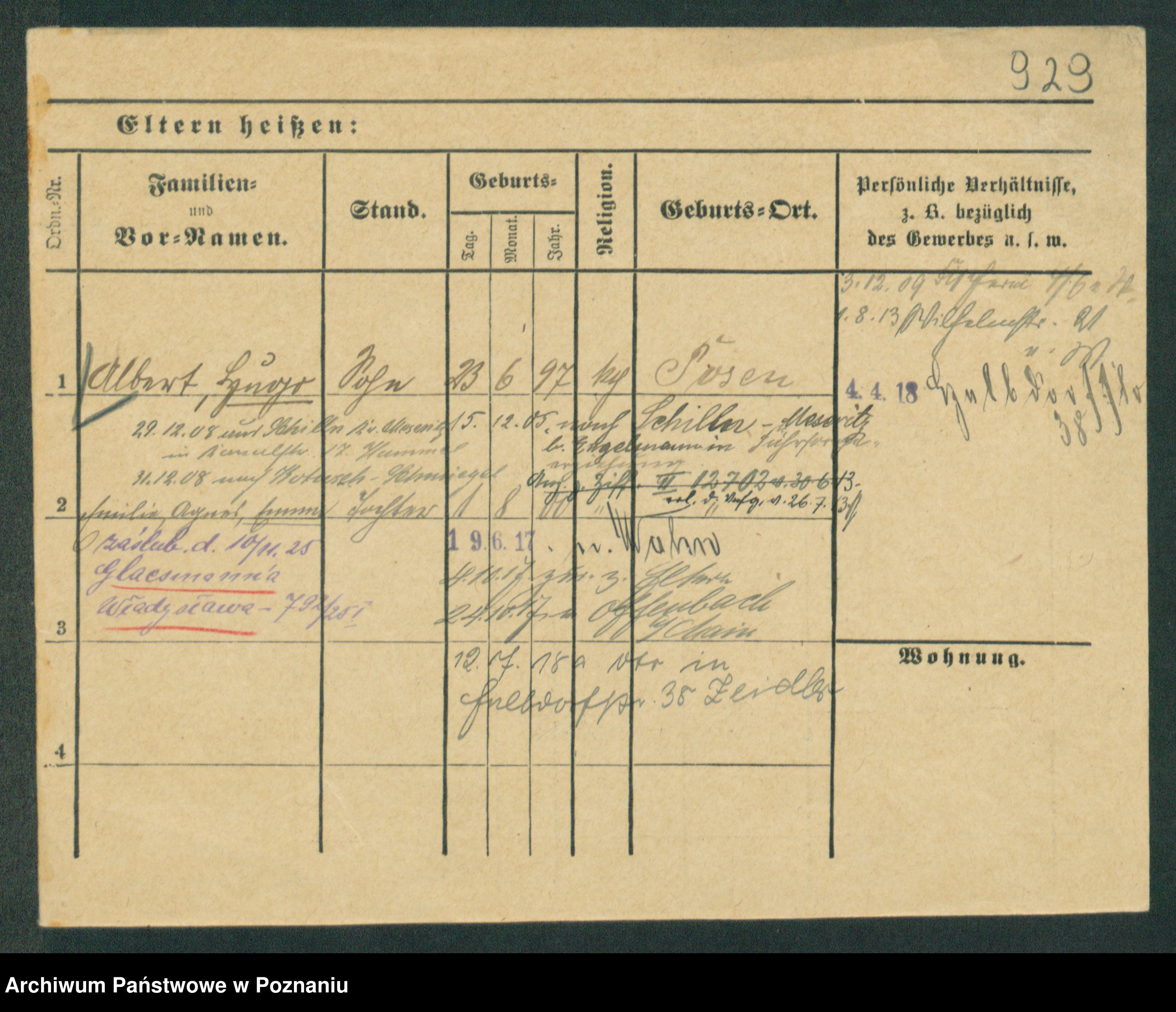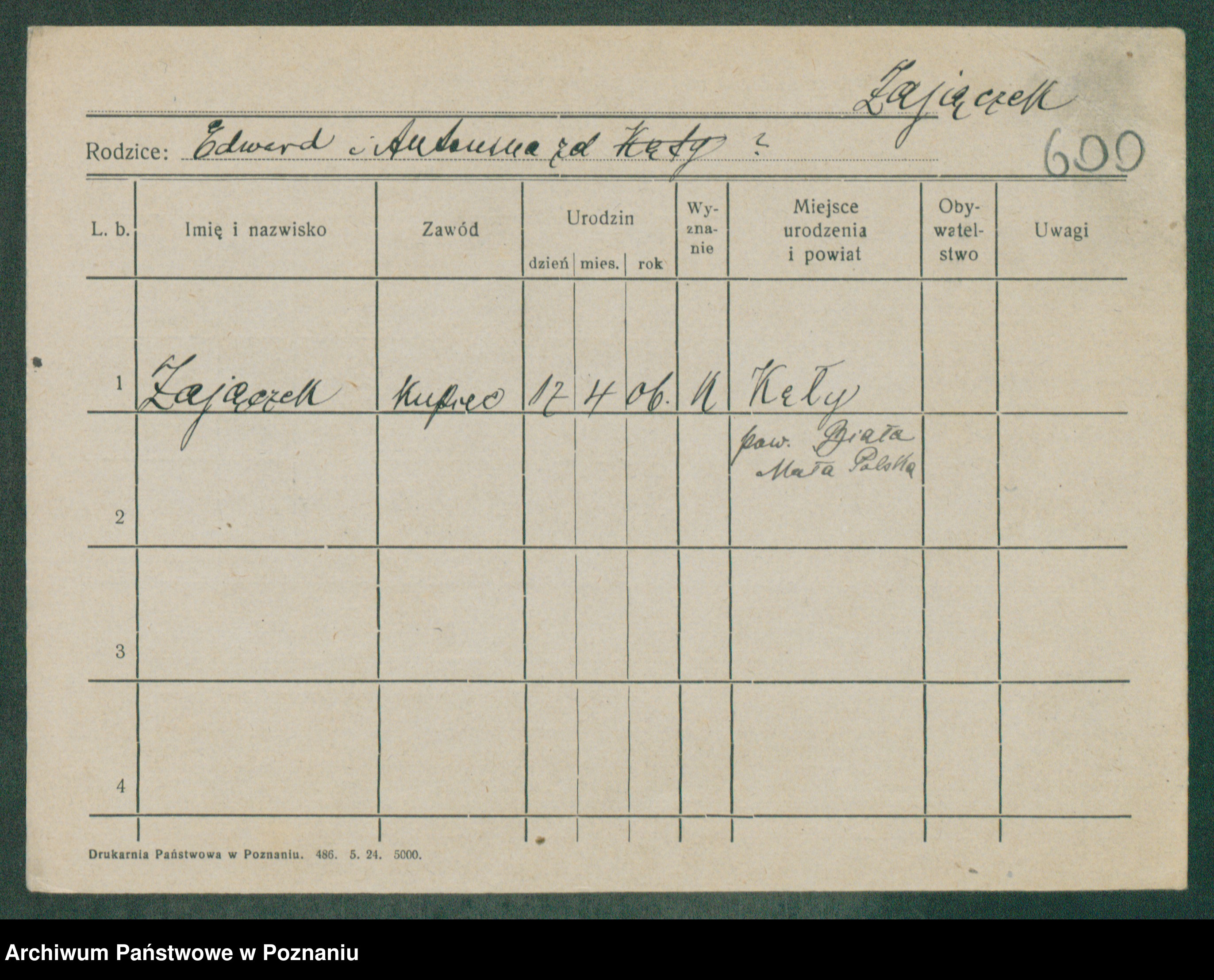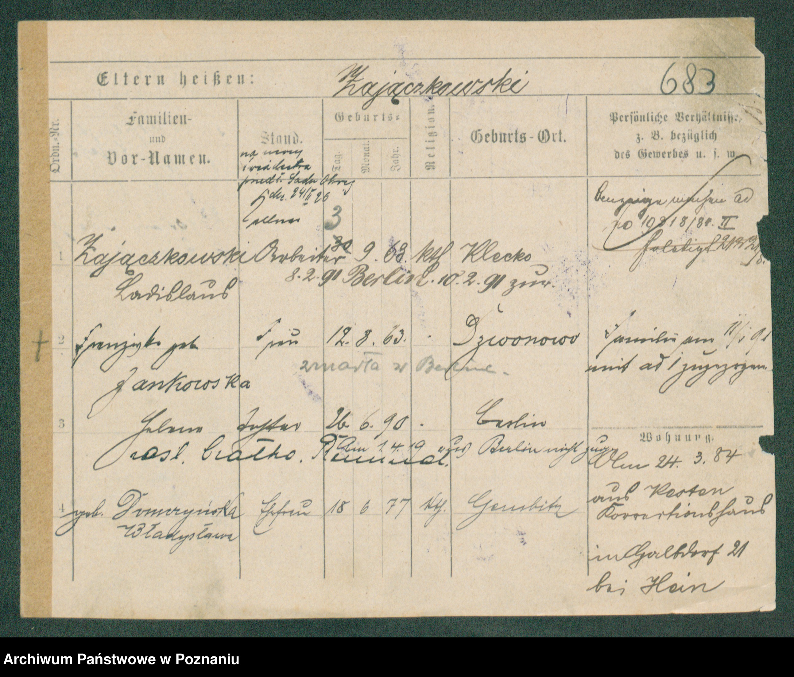 Podgląd karty osobowej dostępny jest po kliknięciu na nazwisko lub ikonkę karty. Można dokonywać powiększenia (ikony na górze) lub przechodzić między kolejnymi skanami (strzałki po bokach).