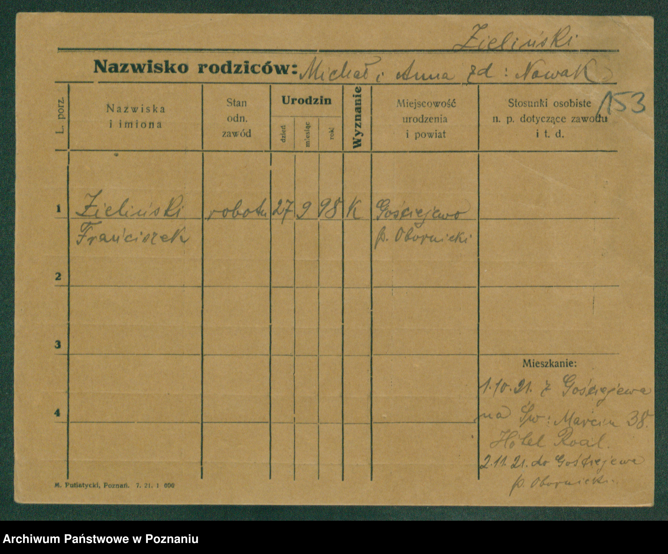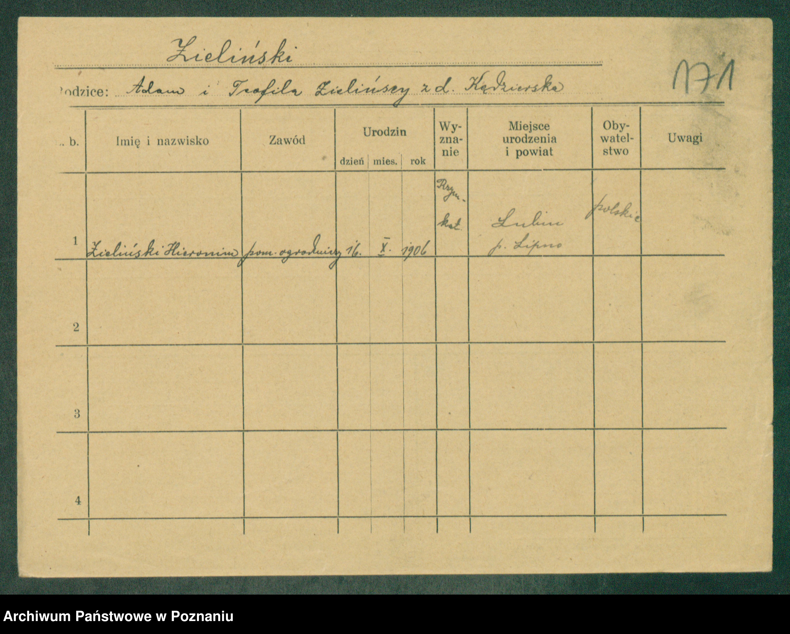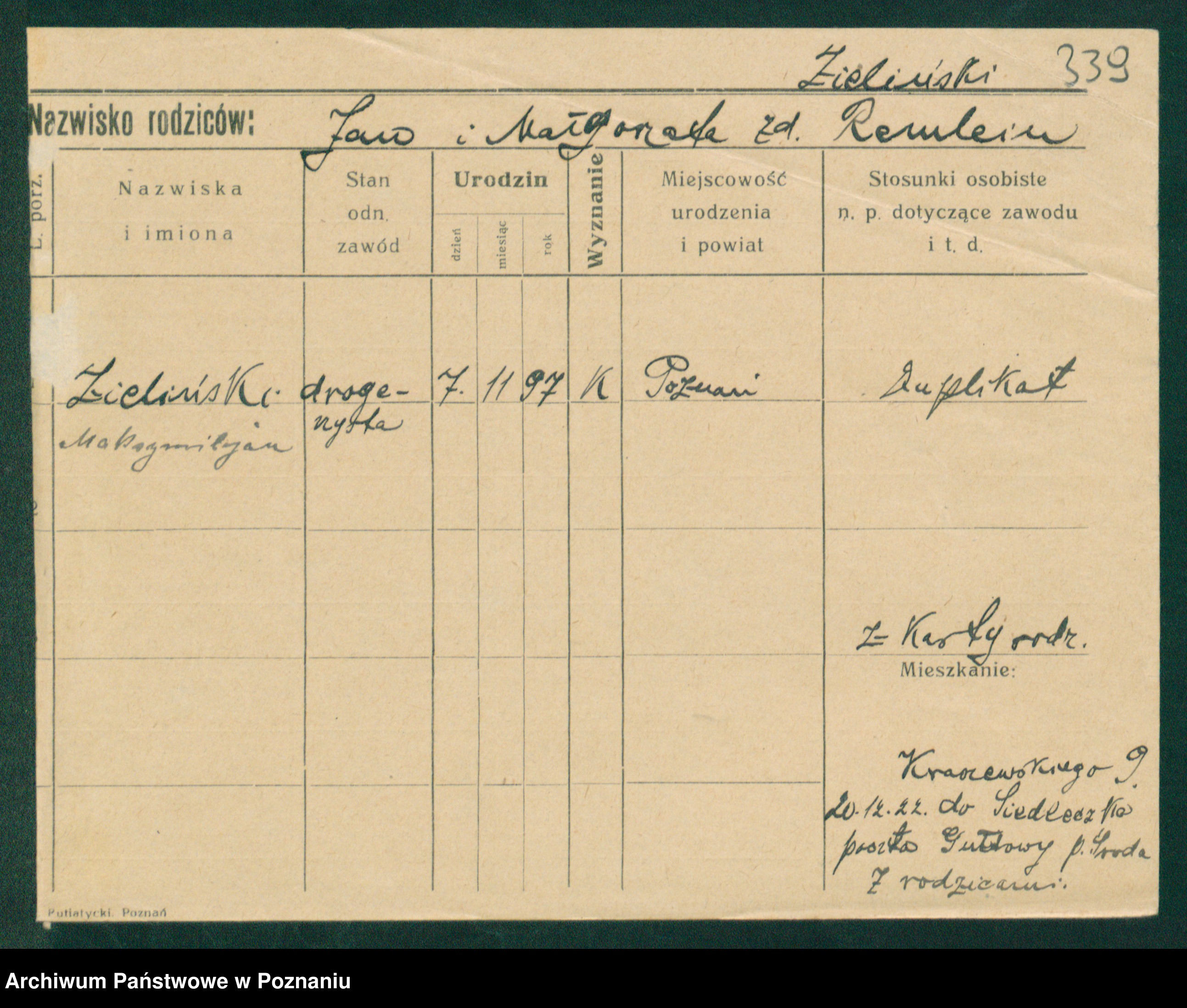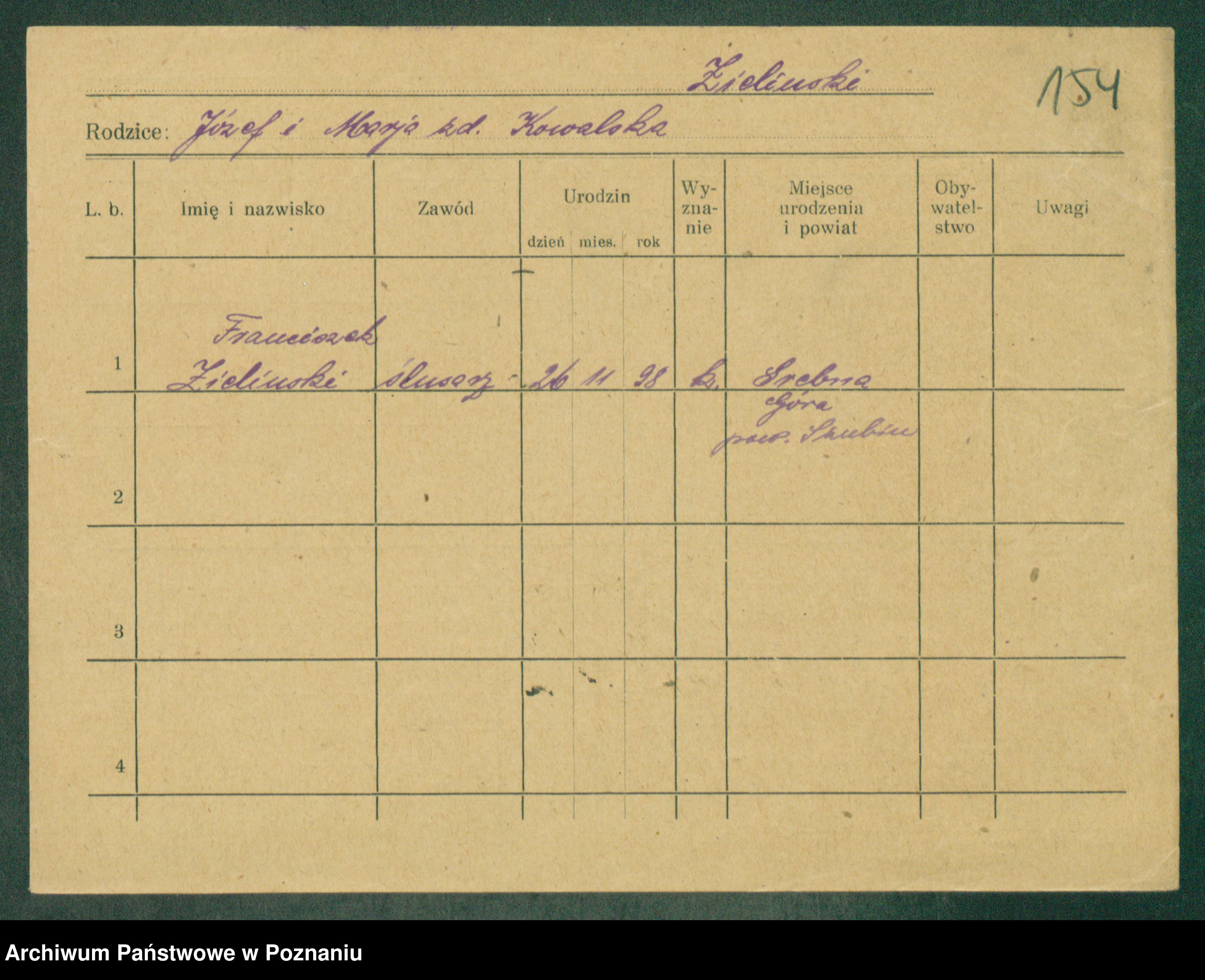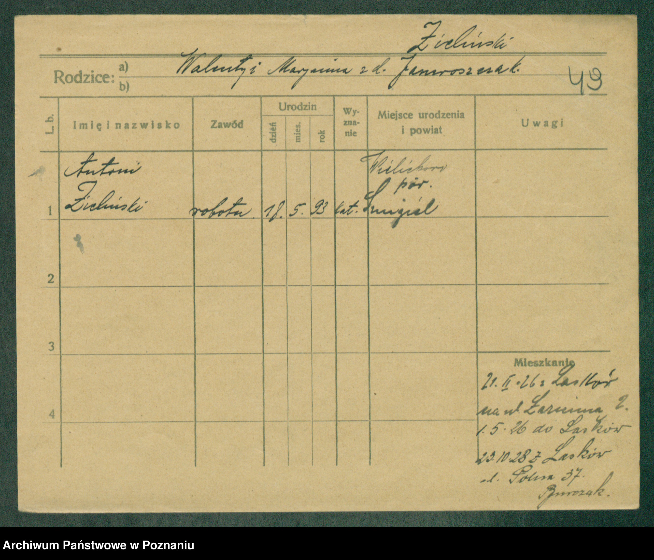 Podgląd karty osobowej dostępny jest po kliknięciu na nazwisko lub ikonkę karty. Można dokonywać powiększenia (ikony na górze) lub przechodzić między kolejnymi skanami (strzałki po bokach).