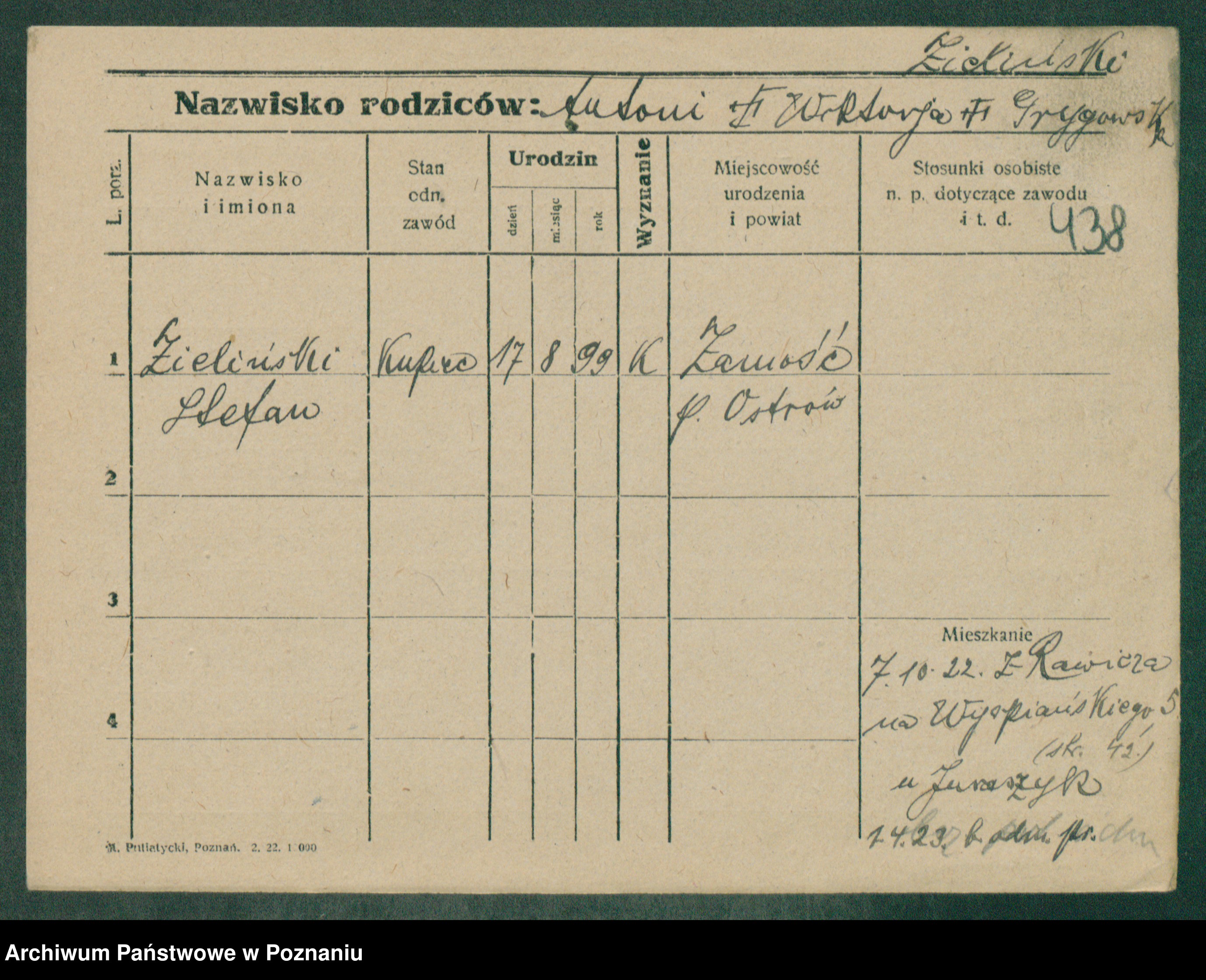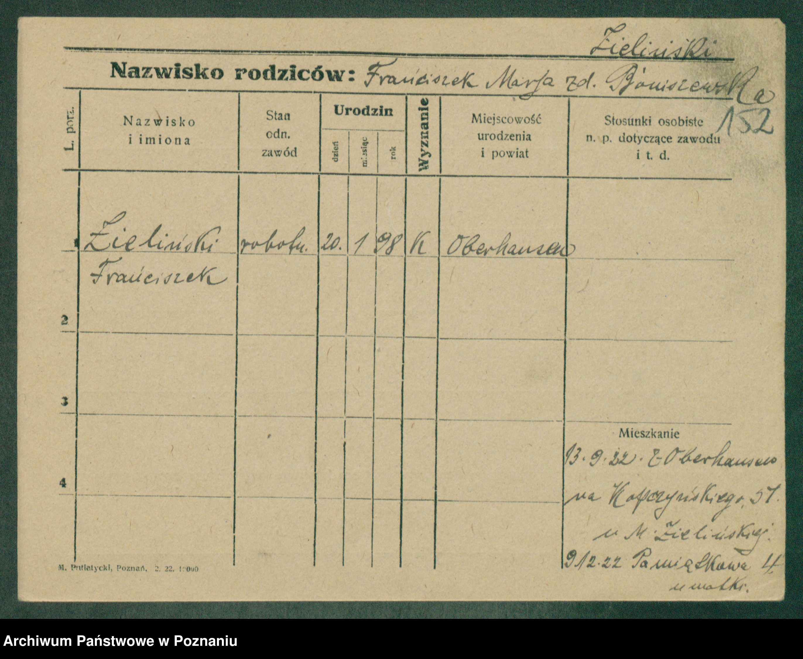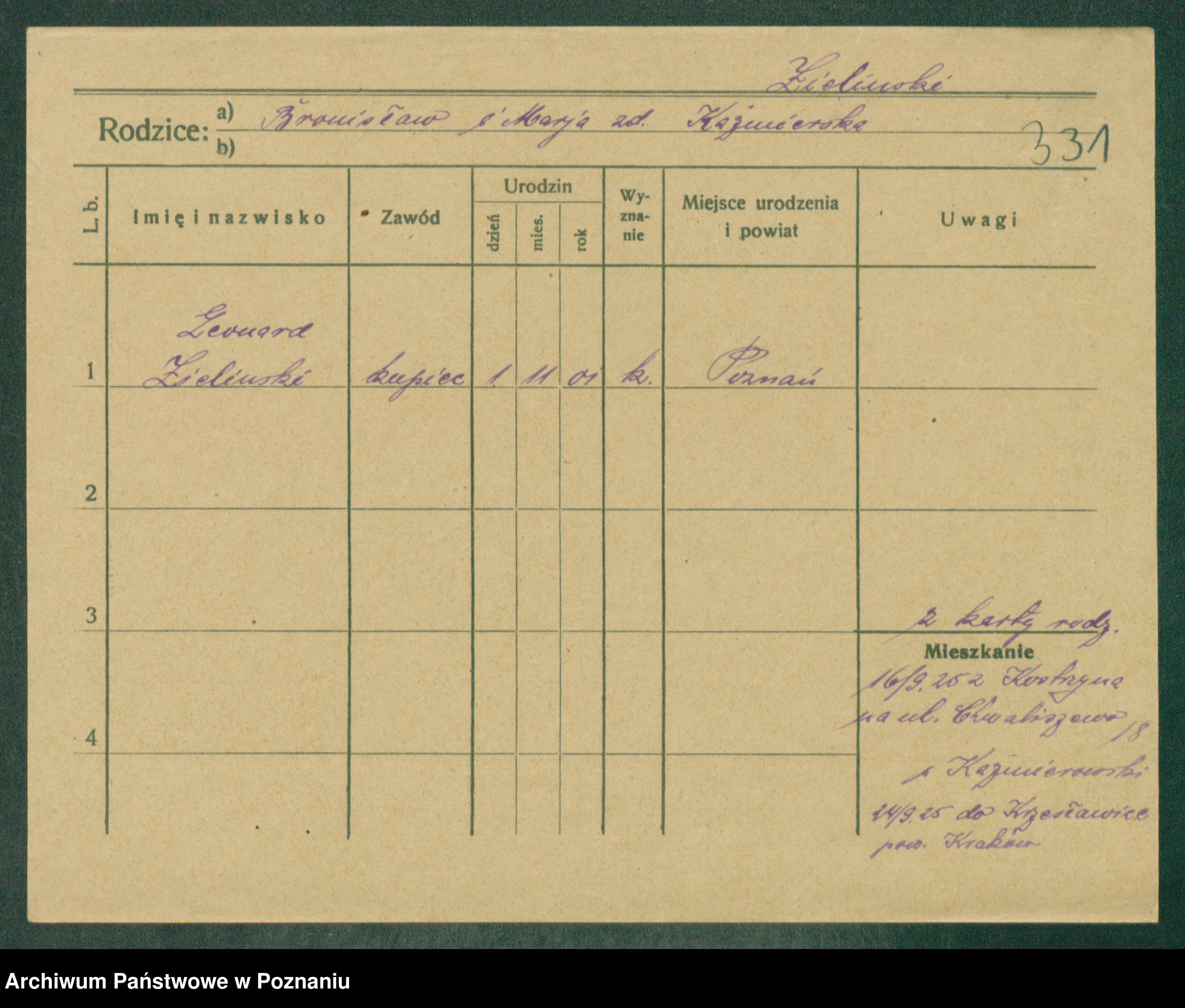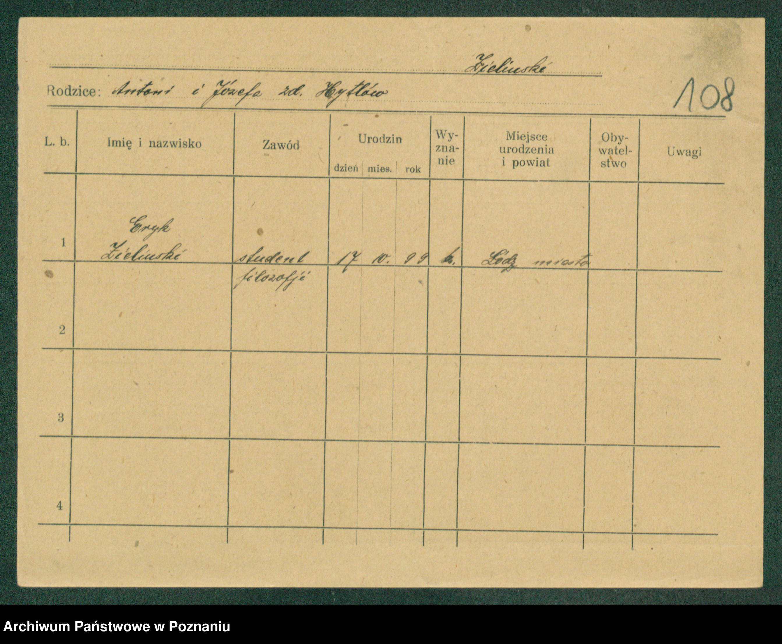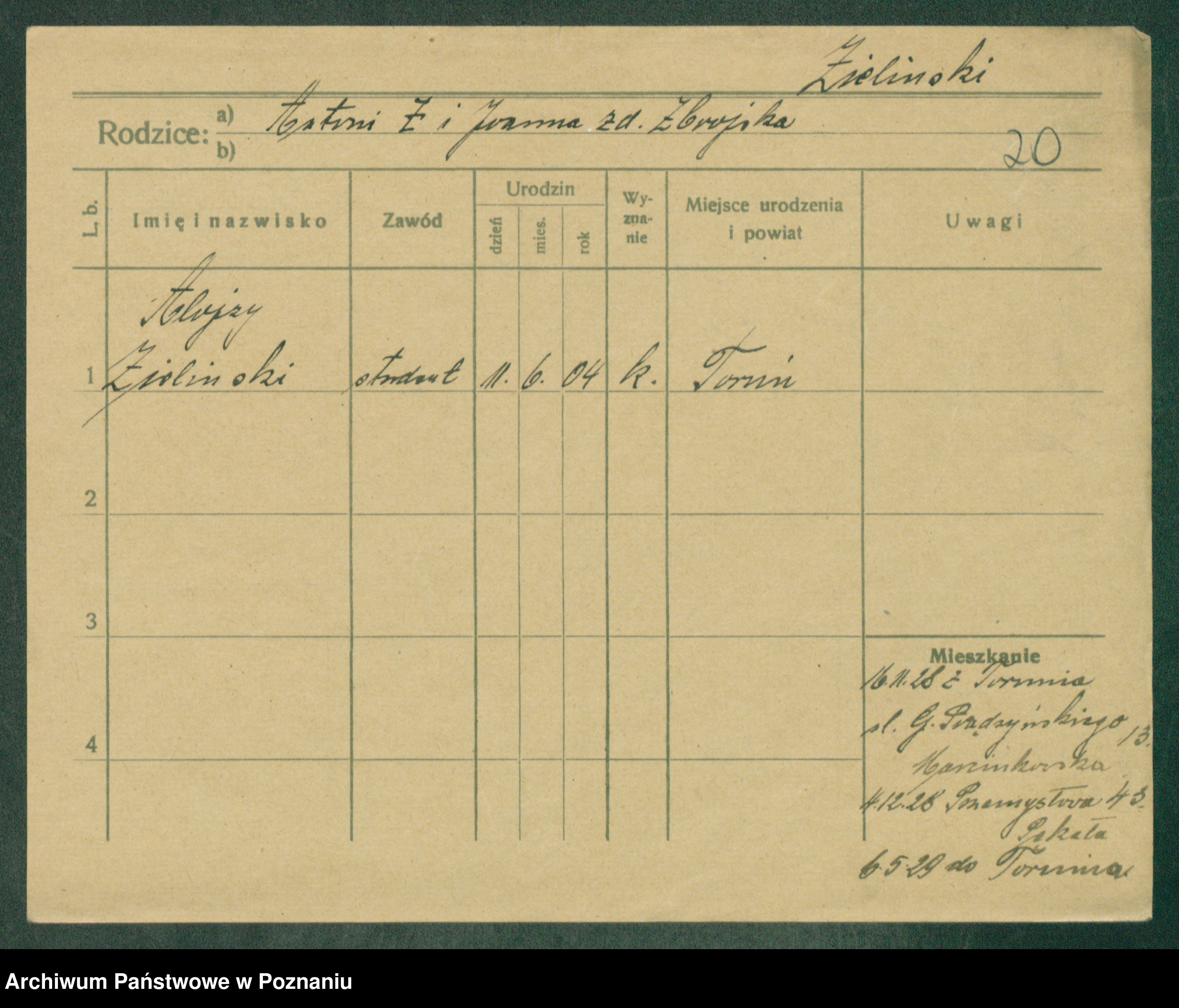Podgląd karty osobowej dostępny jest po kliknięciu na nazwisko lub ikonkę karty. Można dokonywać powiększenia (ikony na górze) lub przechodzić między kolejnymi skanami (strzałki po bokach).