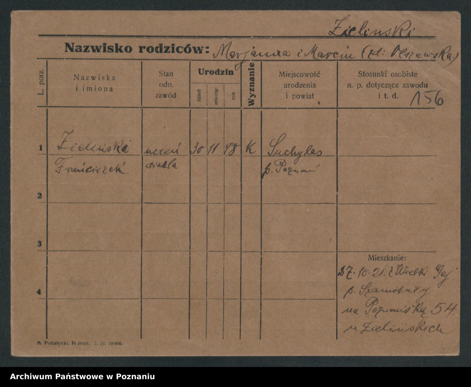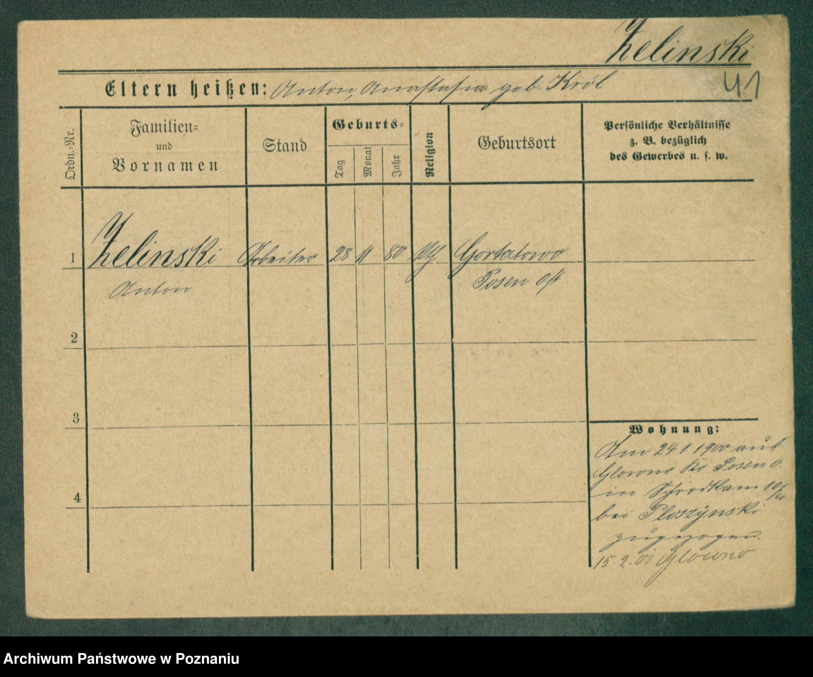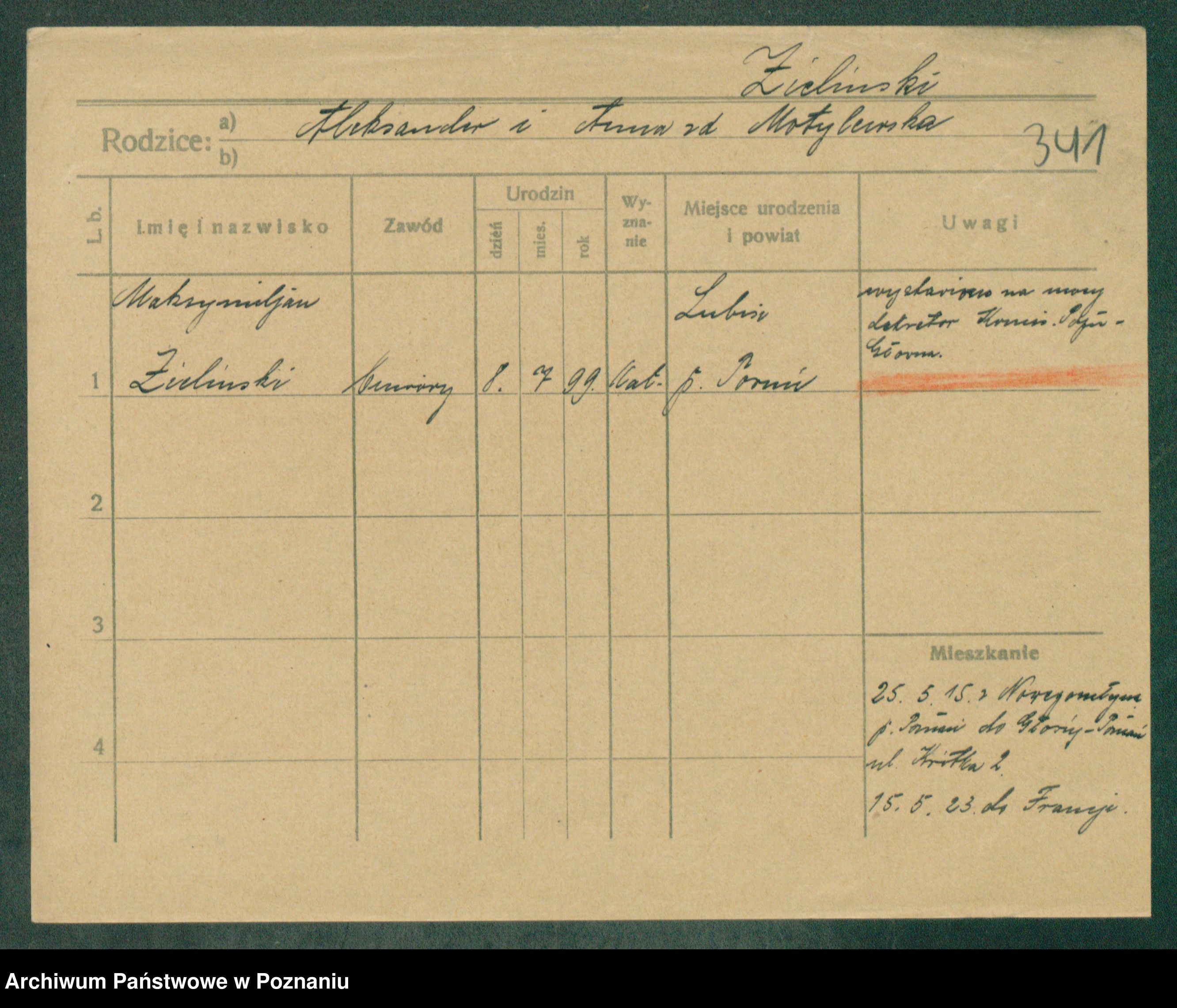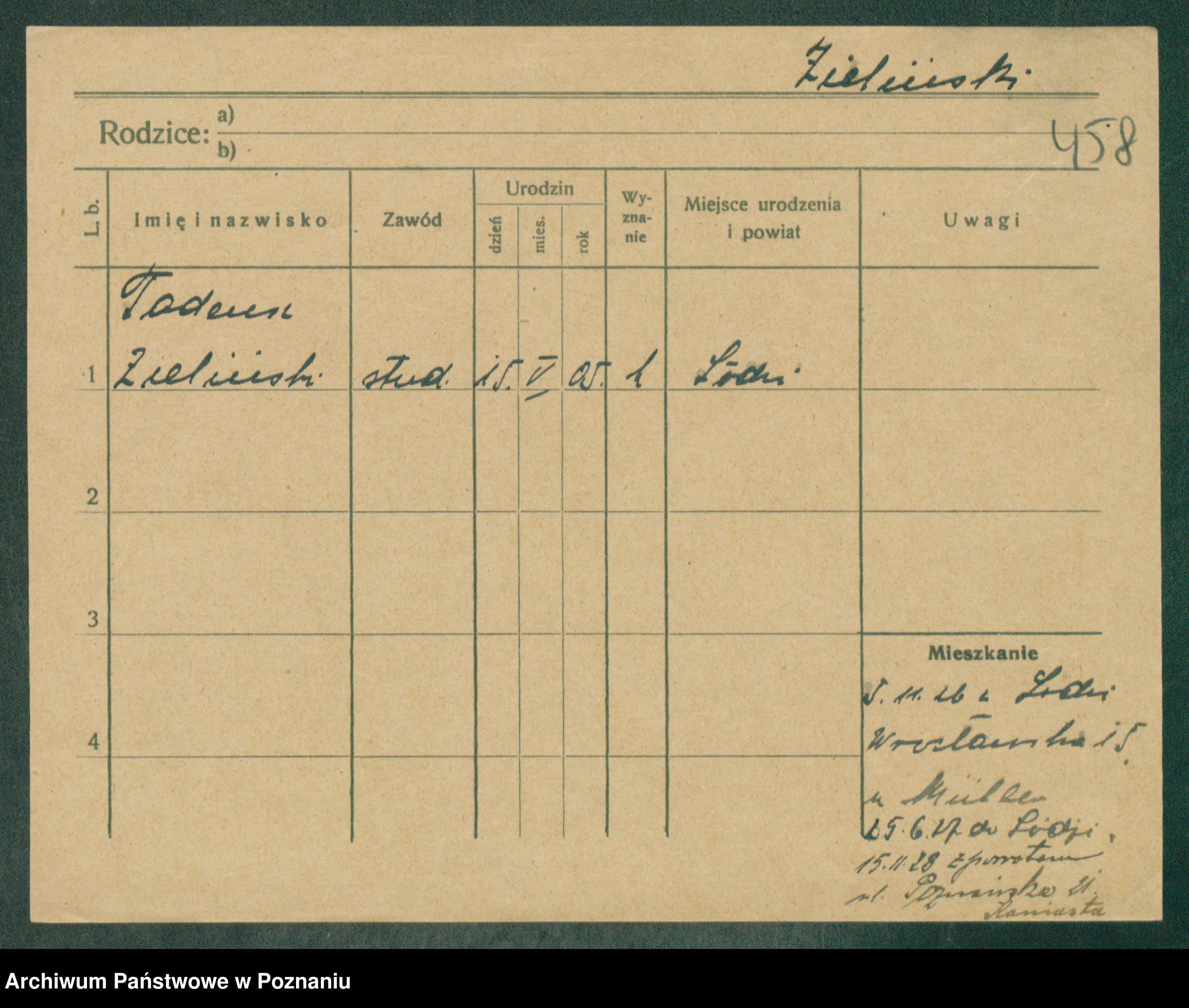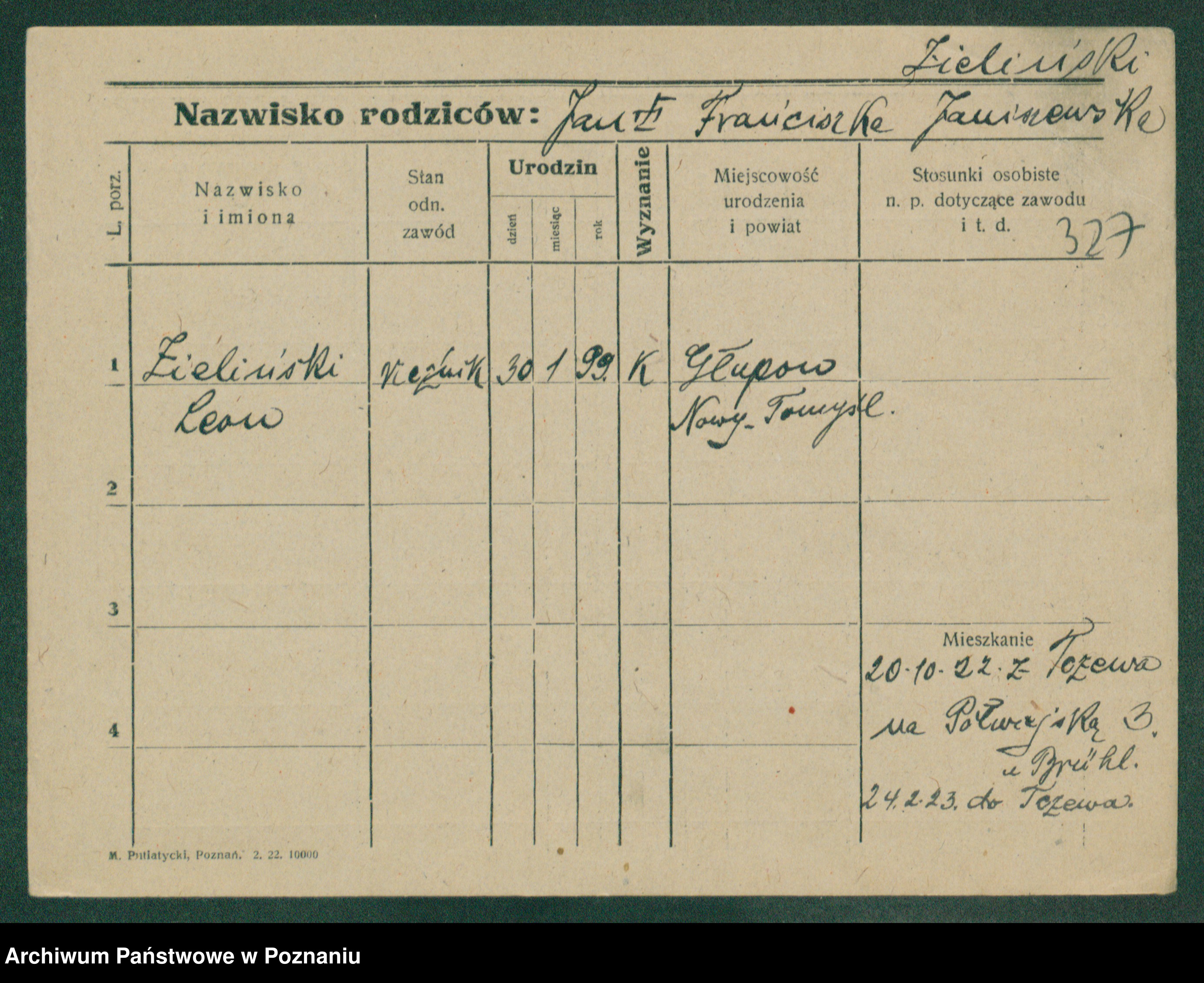 Podgląd karty osobowej dostępny jest po kliknięciu na nazwisko lub ikonkę karty. Można dokonywać powiększenia (ikony na górze) lub przechodzić między kolejnymi skanami (strzałki po bokach).