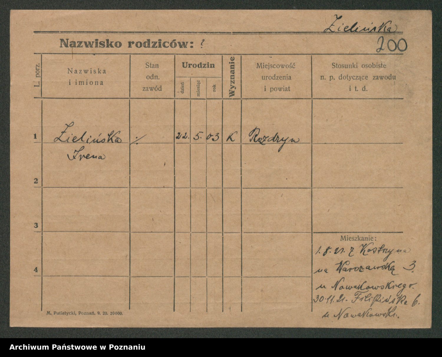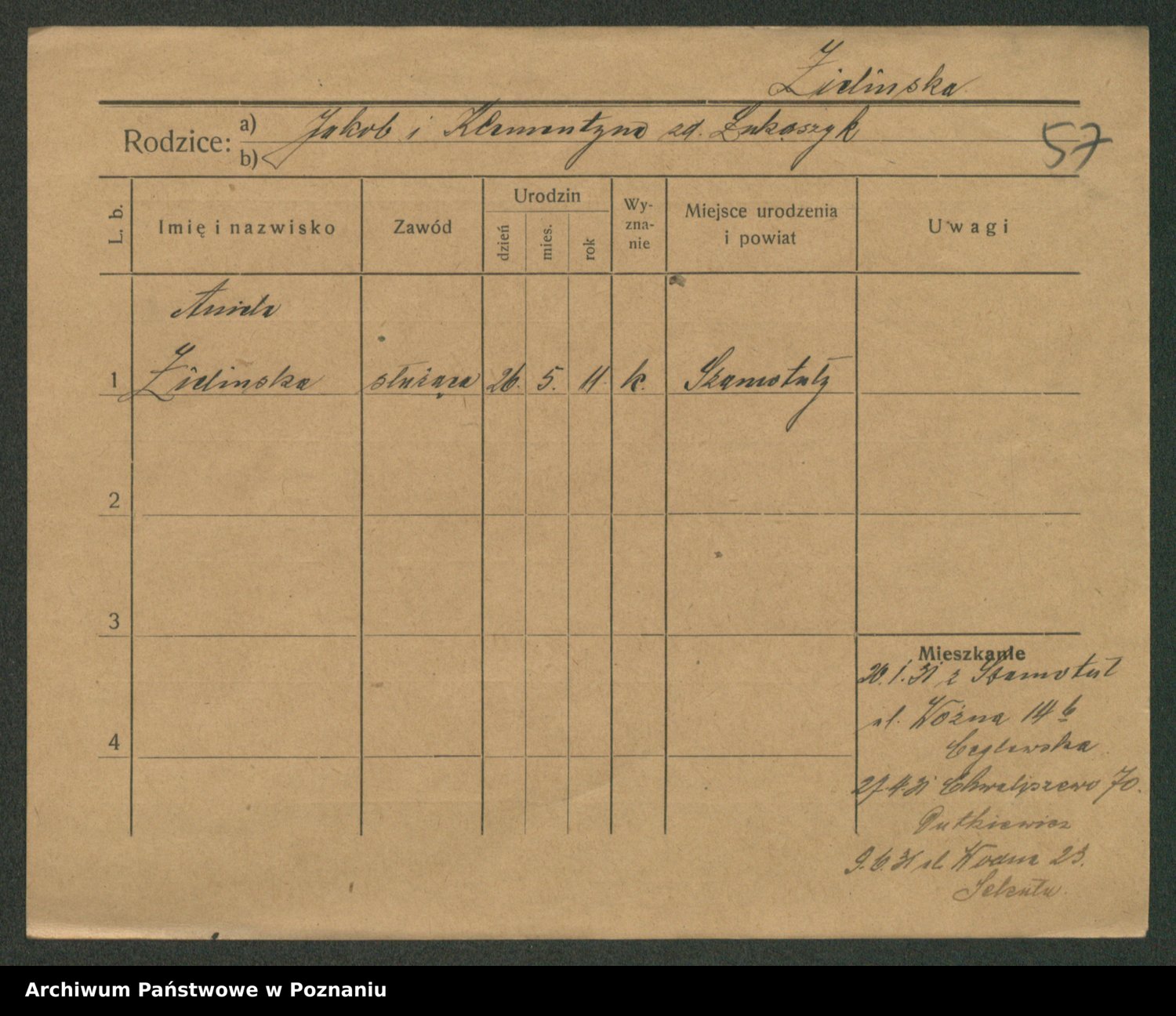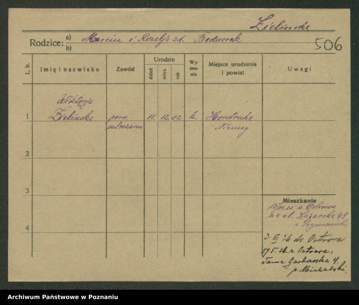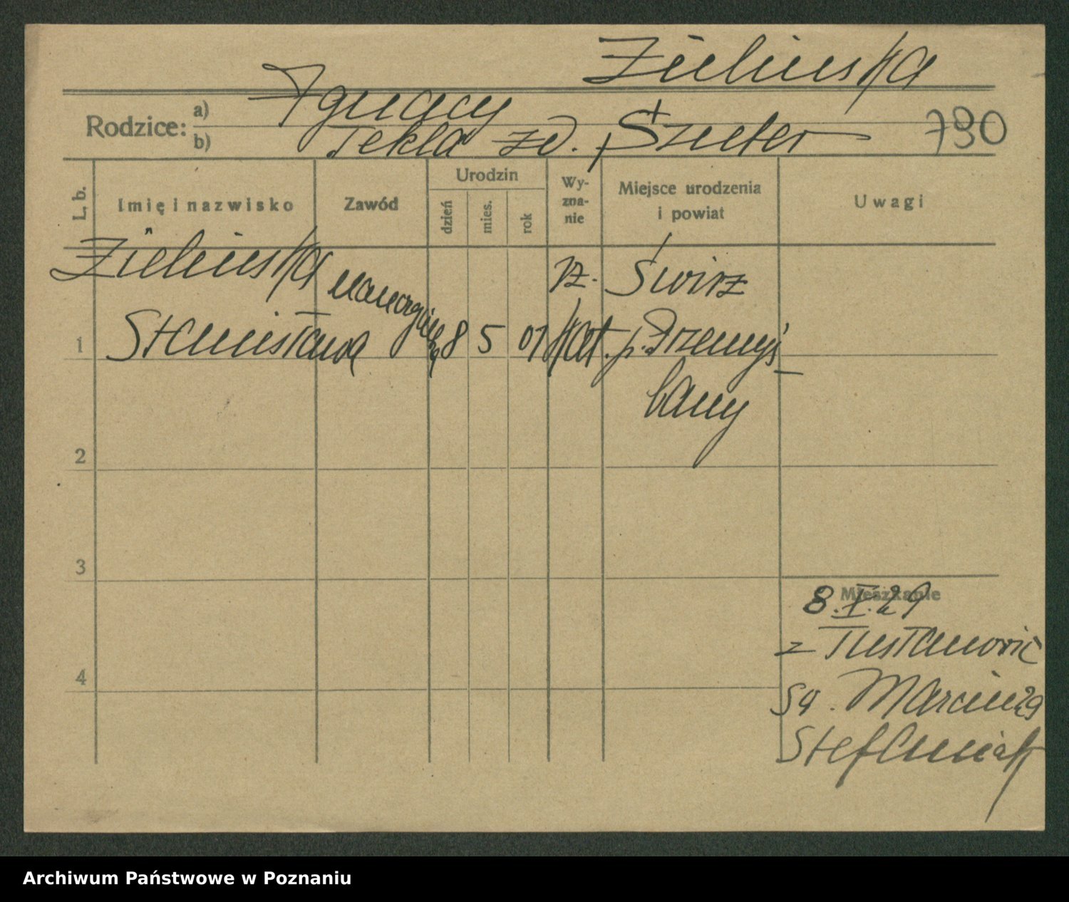 Podgląd karty osobowej dostępny jest po kliknięciu na nazwisko lub ikonkę karty. Można dokonywać powiększenia (ikony na górze) lub przechodzić między kolejnymi skanami (strzałki po bokach).