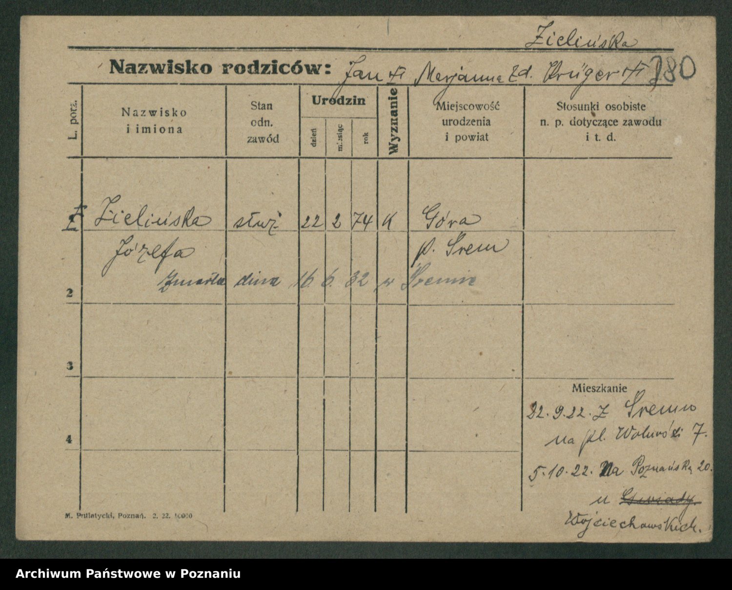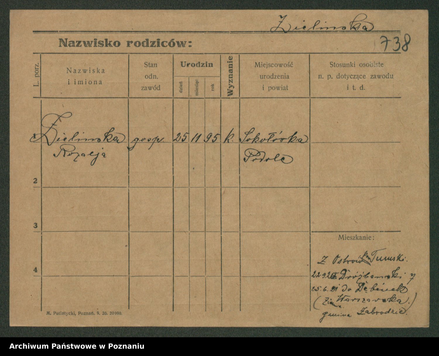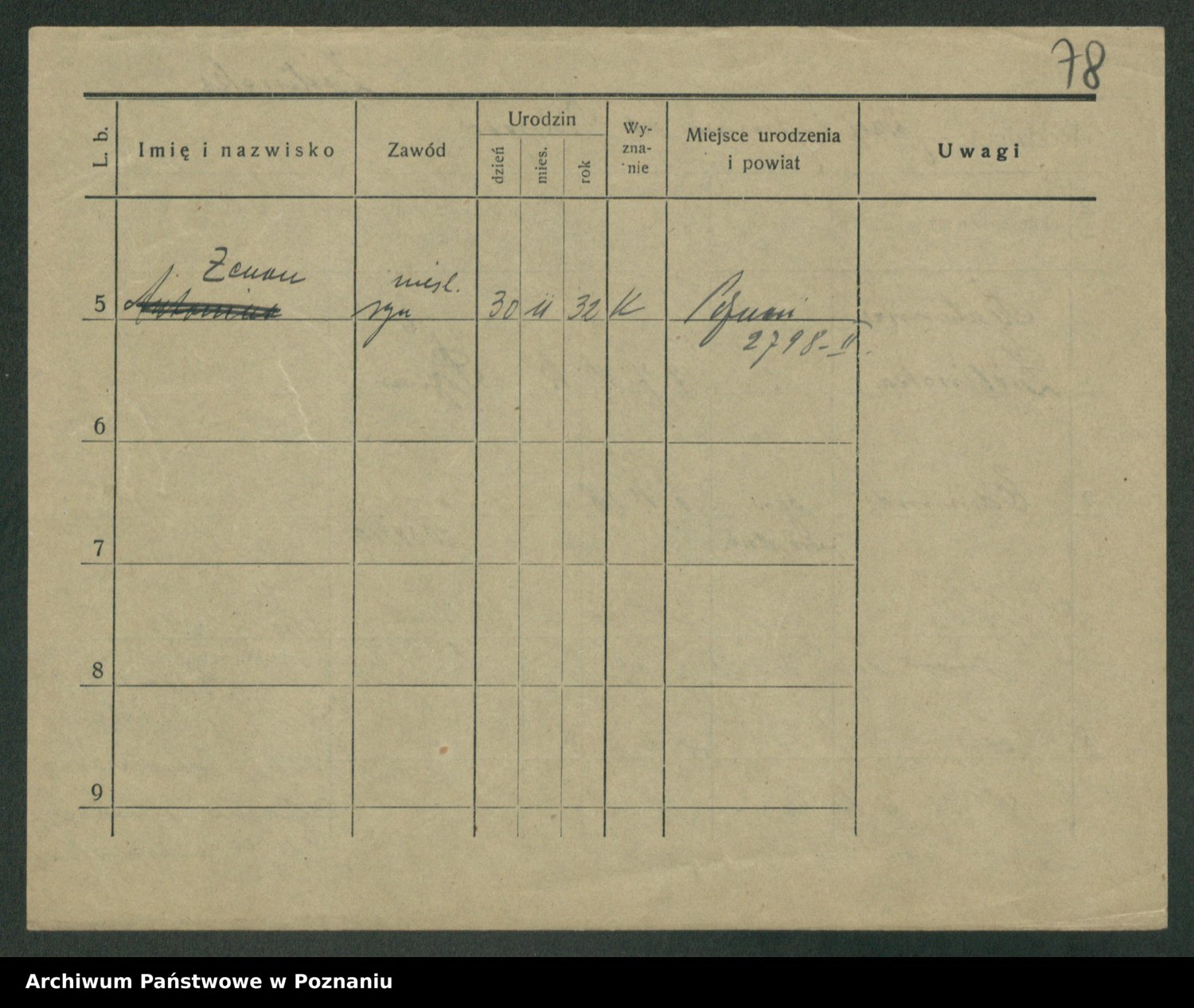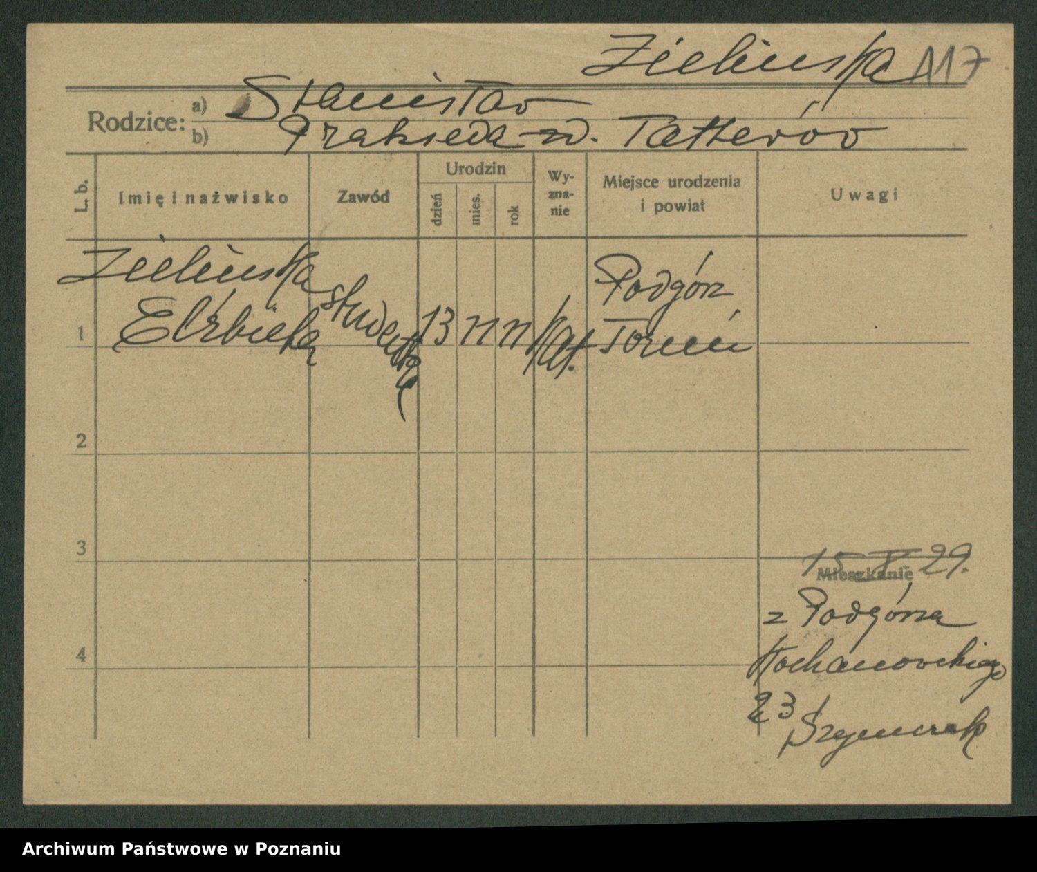Podgląd karty osobowej dostępny jest po kliknięciu na nazwisko lub ikonkę karty. Można dokonywać powiększenia (ikony na górze) lub przechodzić między kolejnymi skanami (strzałki po bokach).