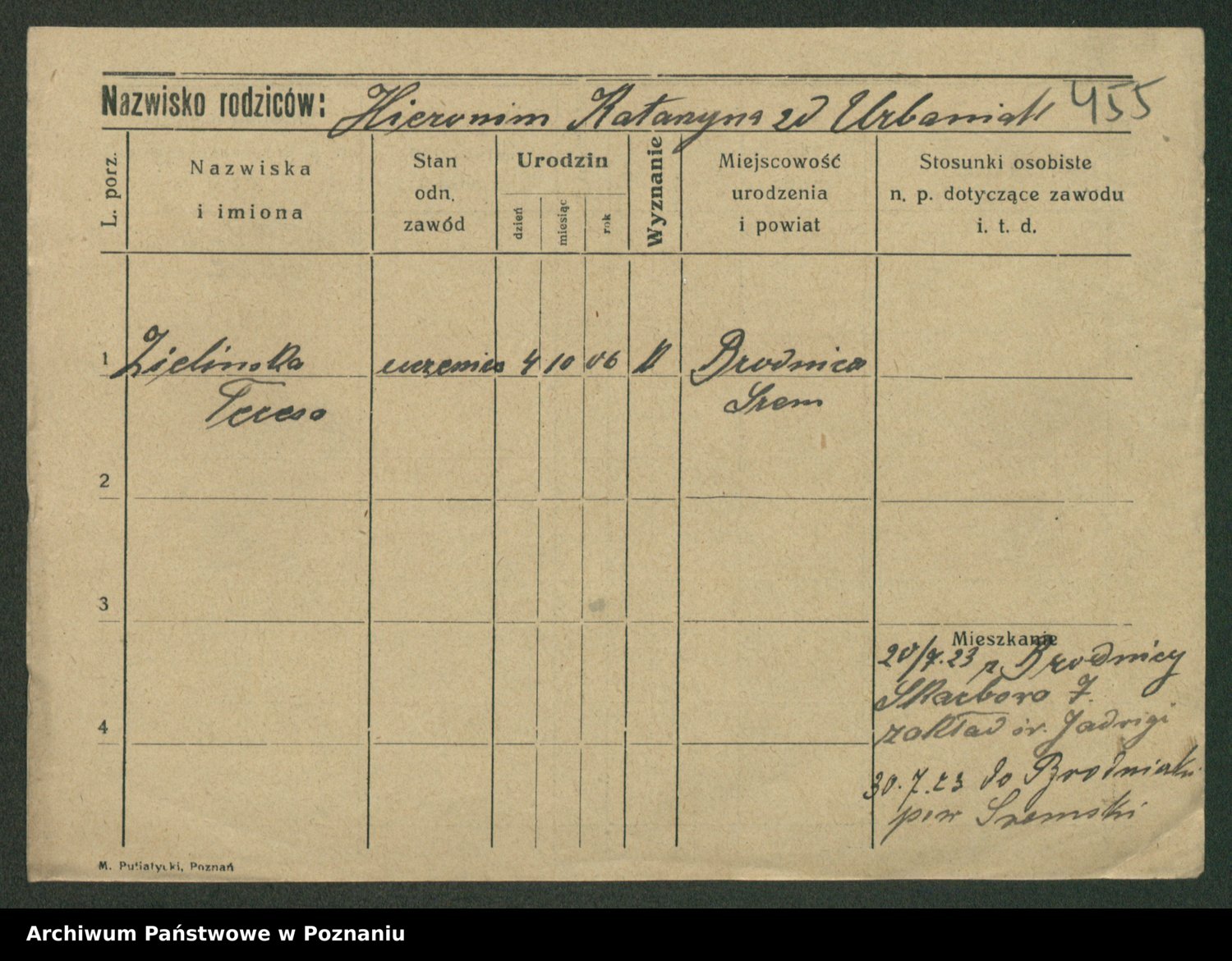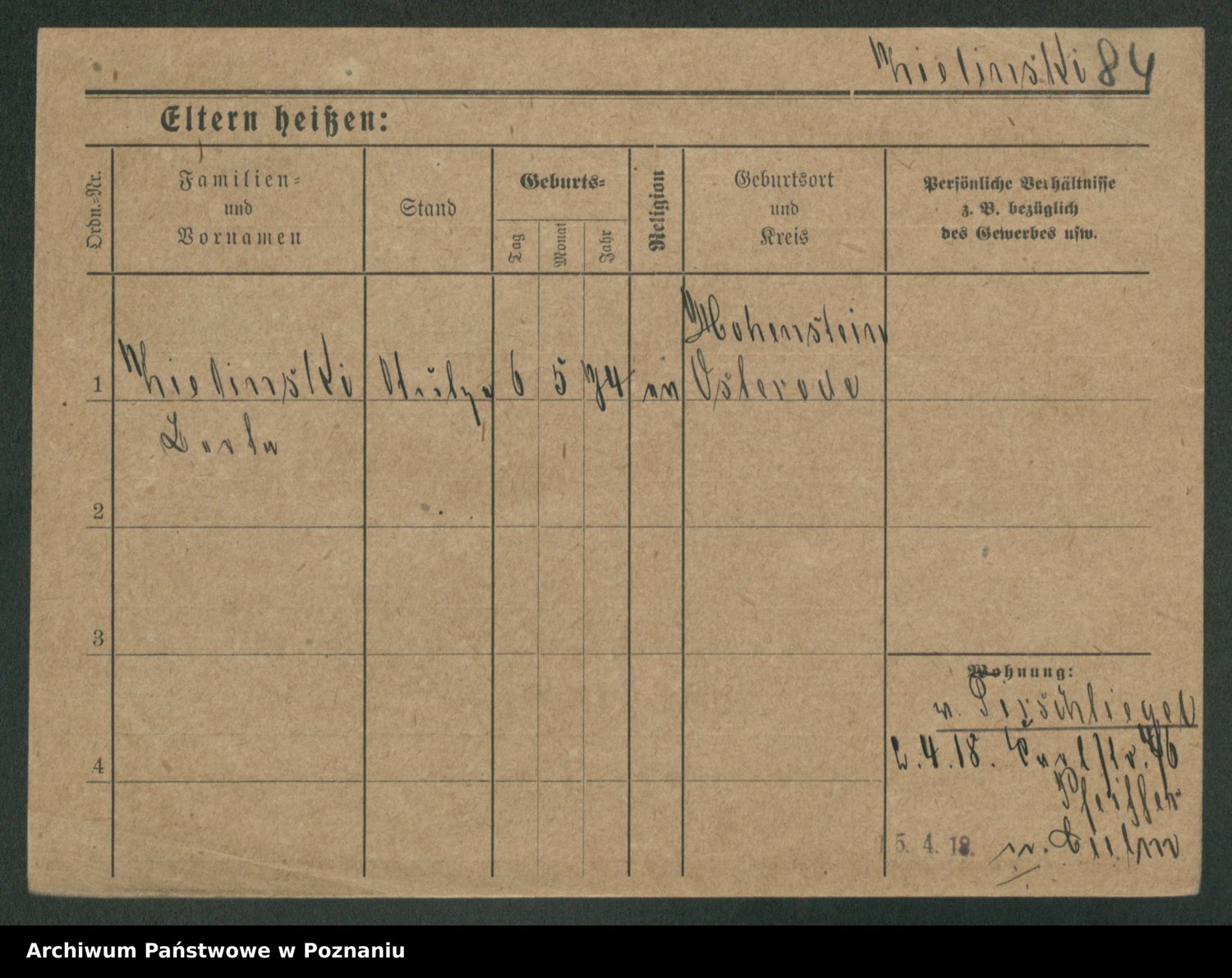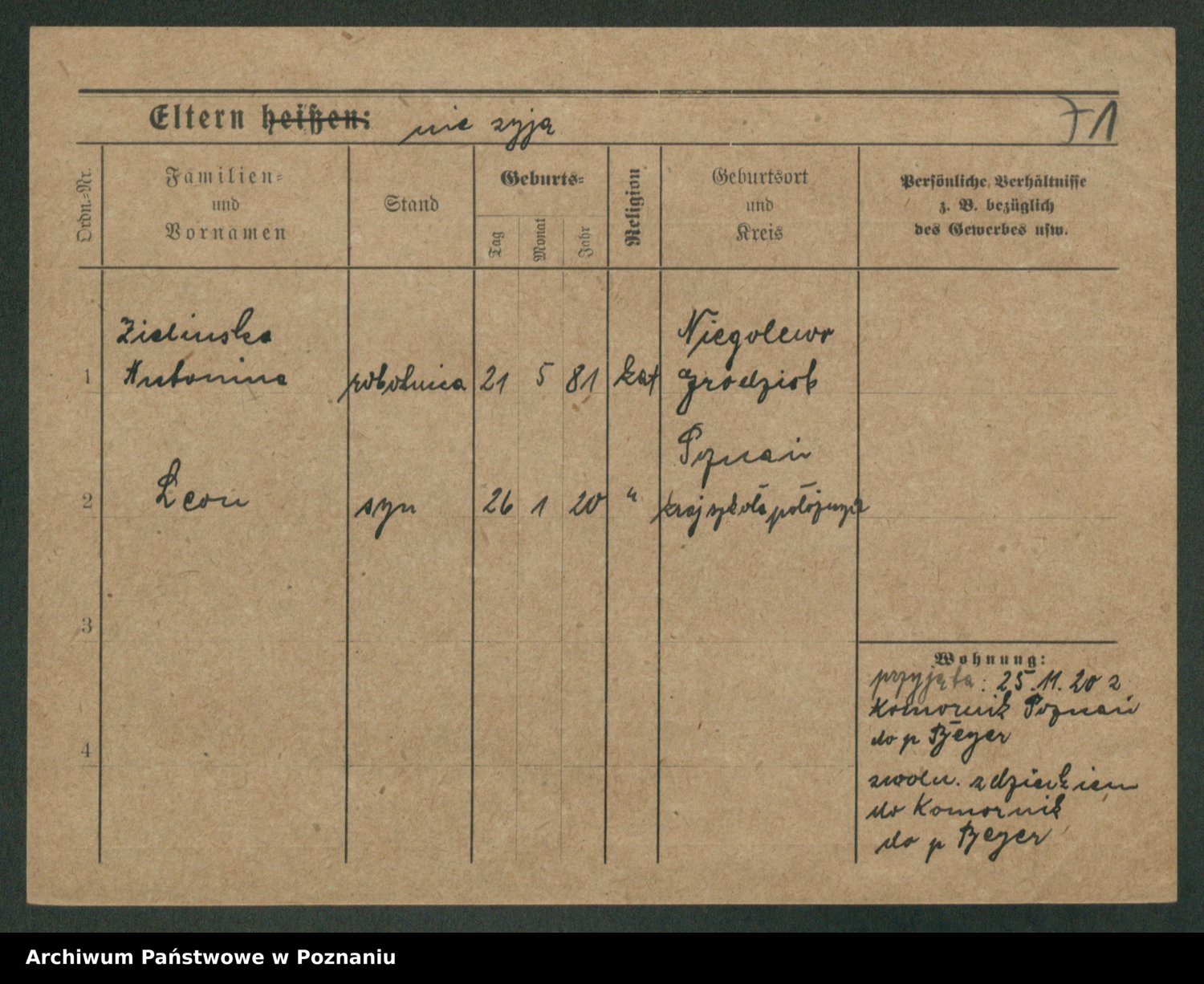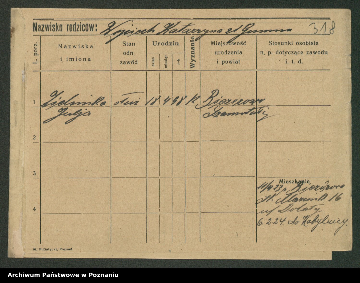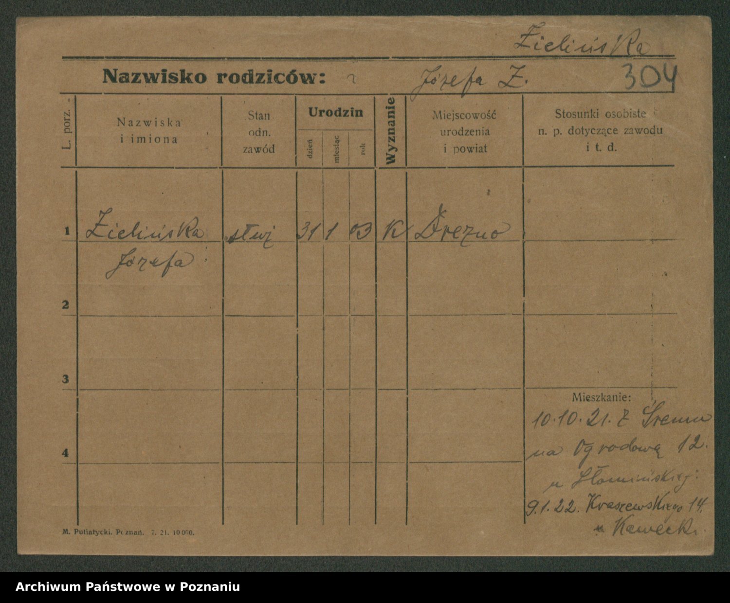 Podgląd karty osobowej dostępny jest po kliknięciu na nazwisko lub ikonkę karty. Można dokonywać powiększenia (ikony na górze) lub przechodzić między kolejnymi skanami (strzałki po bokach).