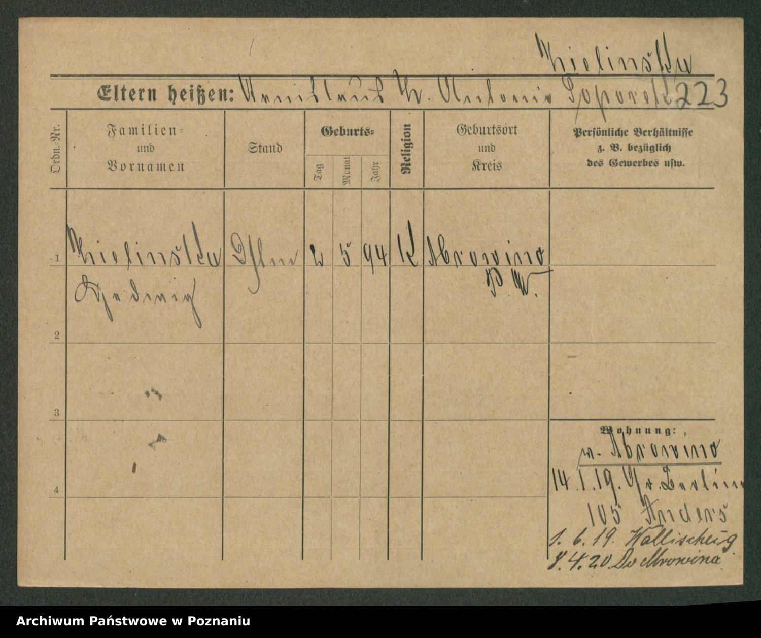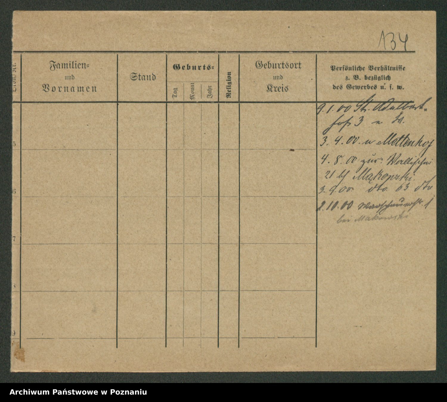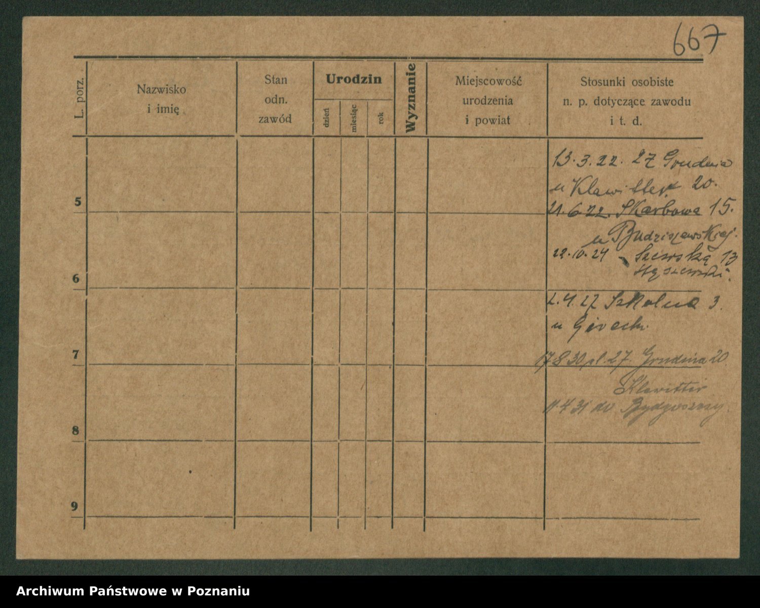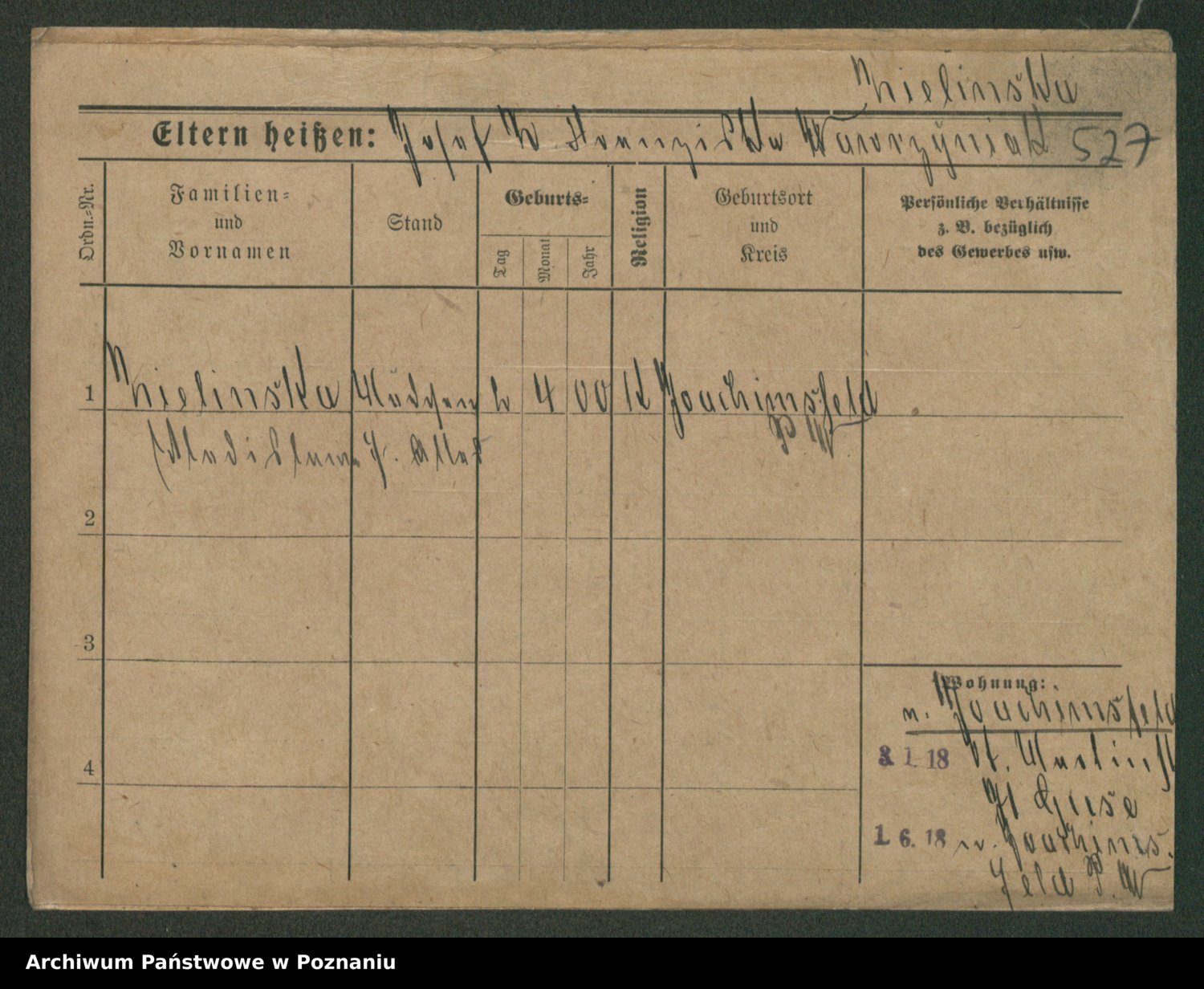 Podgląd karty osobowej dostępny jest po kliknięciu na nazwisko lub ikonkę karty. Można dokonywać powiększenia (ikony na górze) lub przechodzić między kolejnymi skanami (strzałki po bokach).