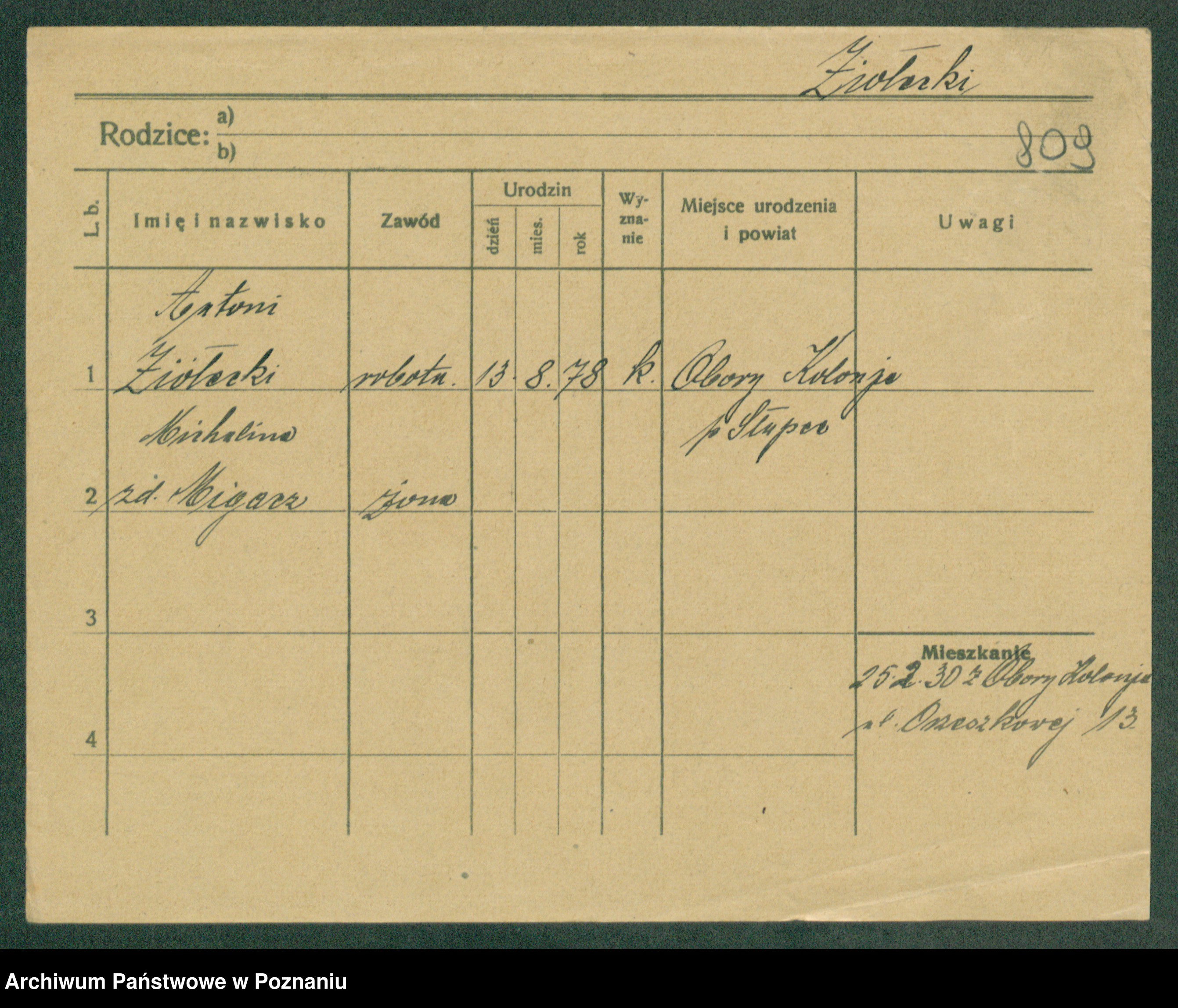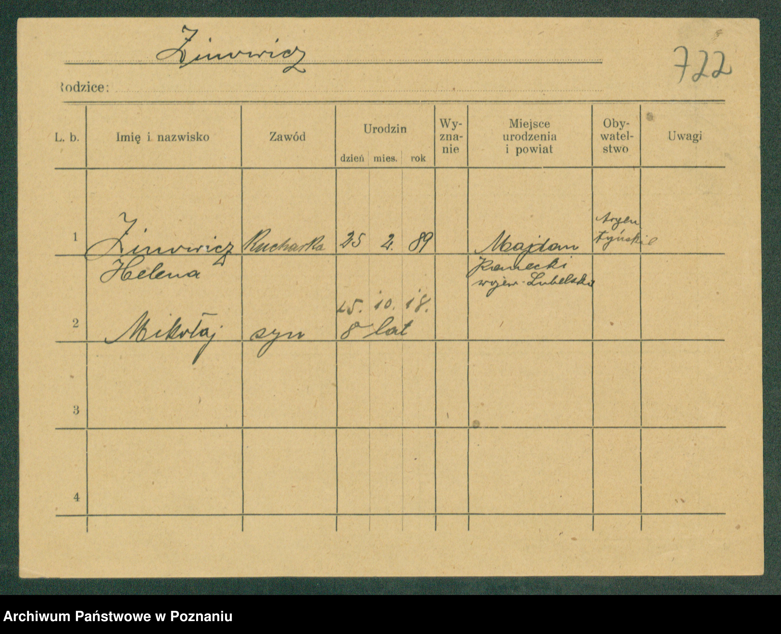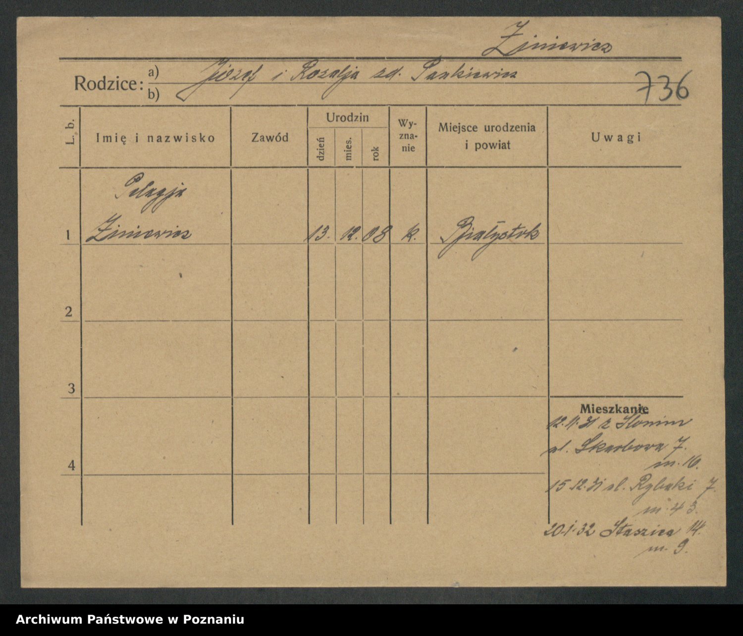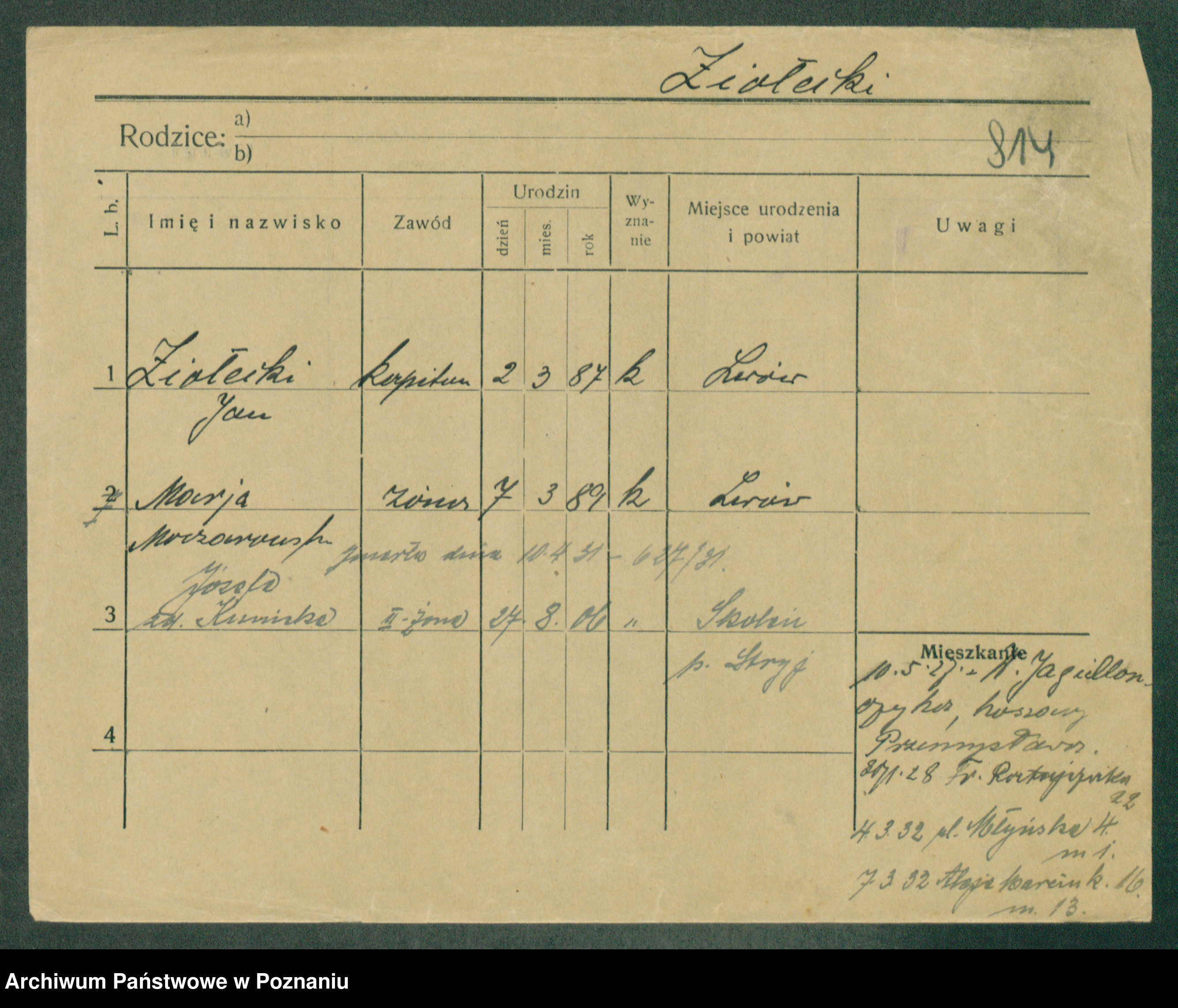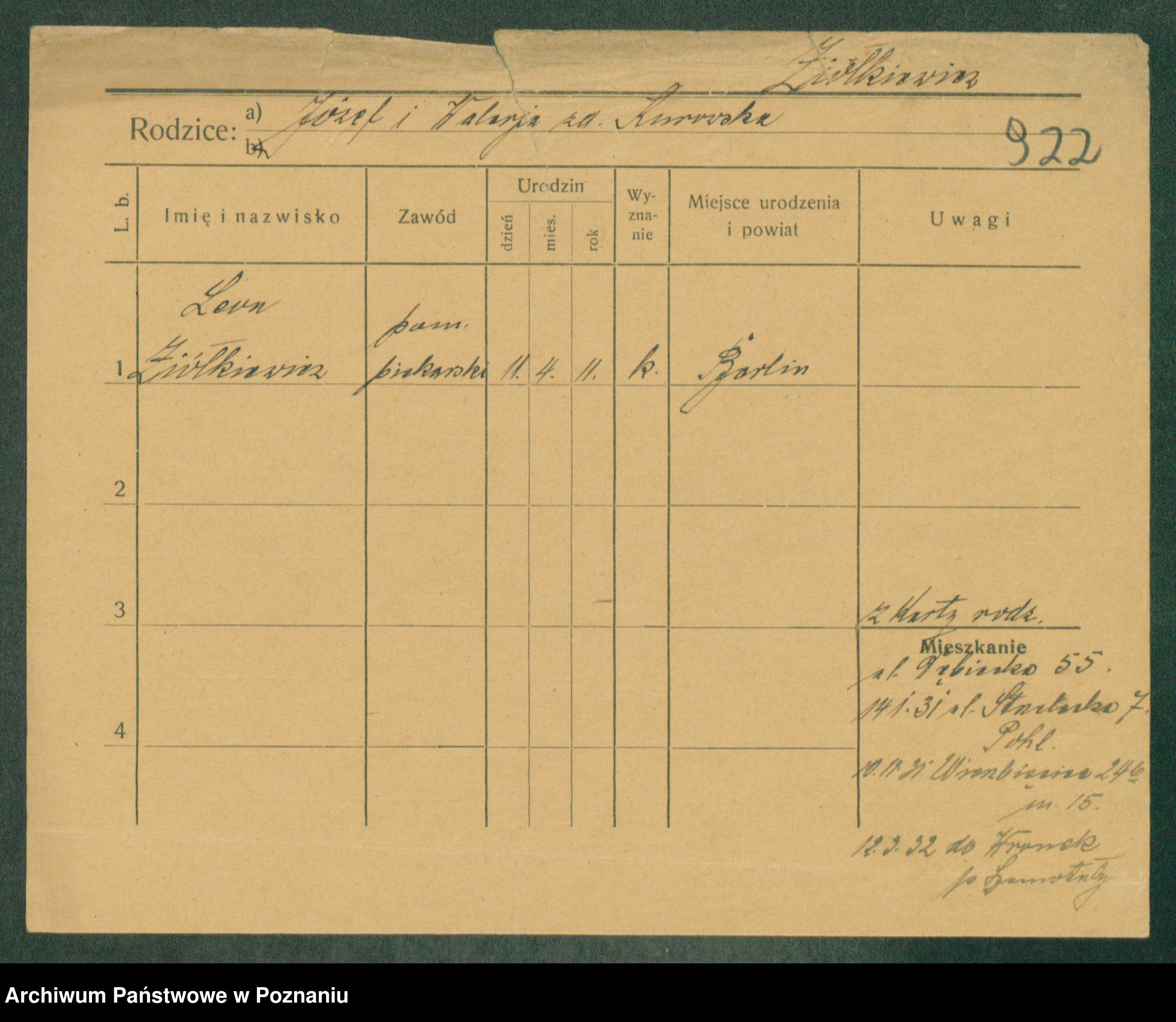 Podgląd karty osobowej dostępny jest po kliknięciu na nazwisko lub ikonkę karty. Można dokonywać powiększenia (ikony na górze) lub przechodzić między kolejnymi skanami (strzałki po bokach).