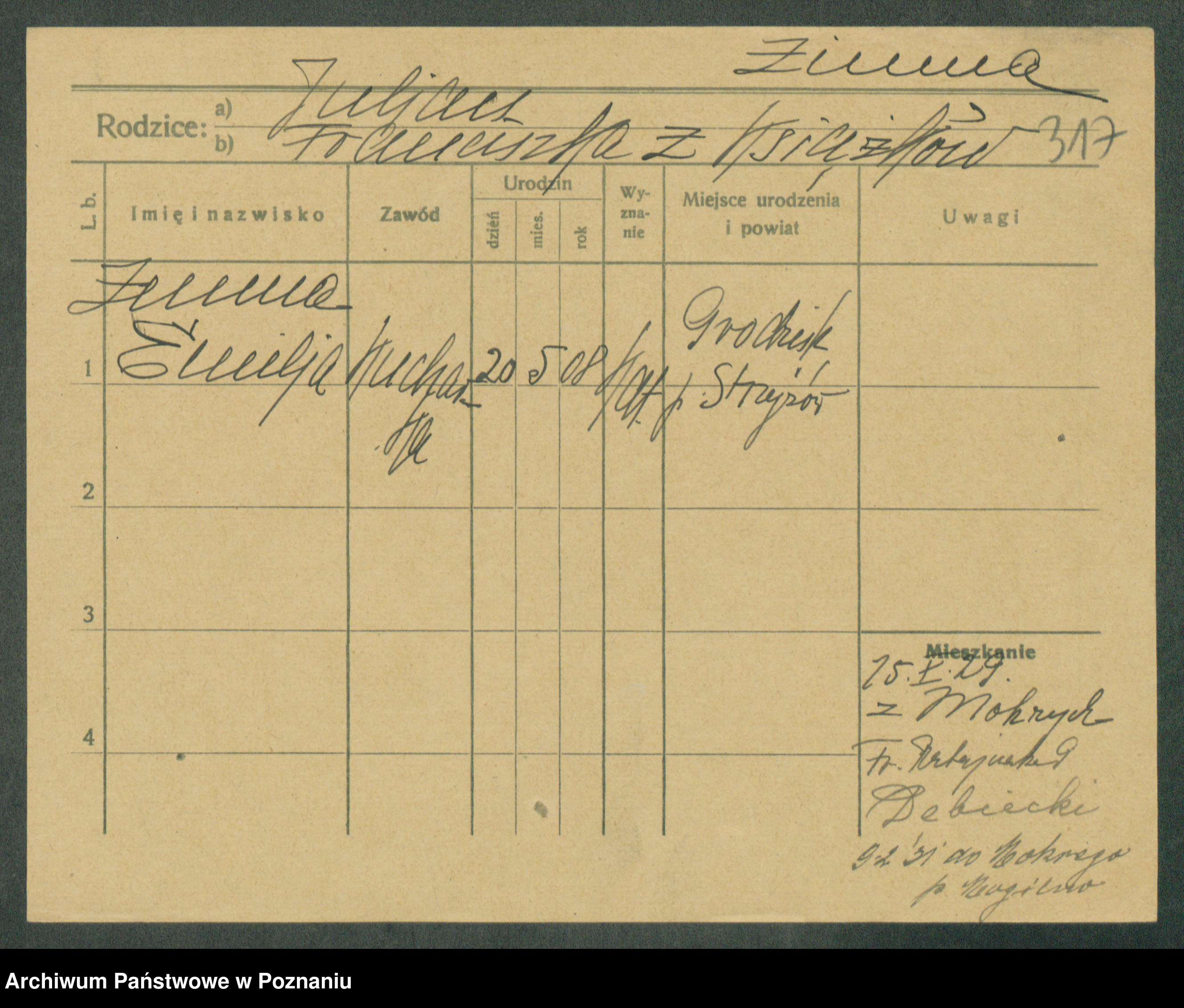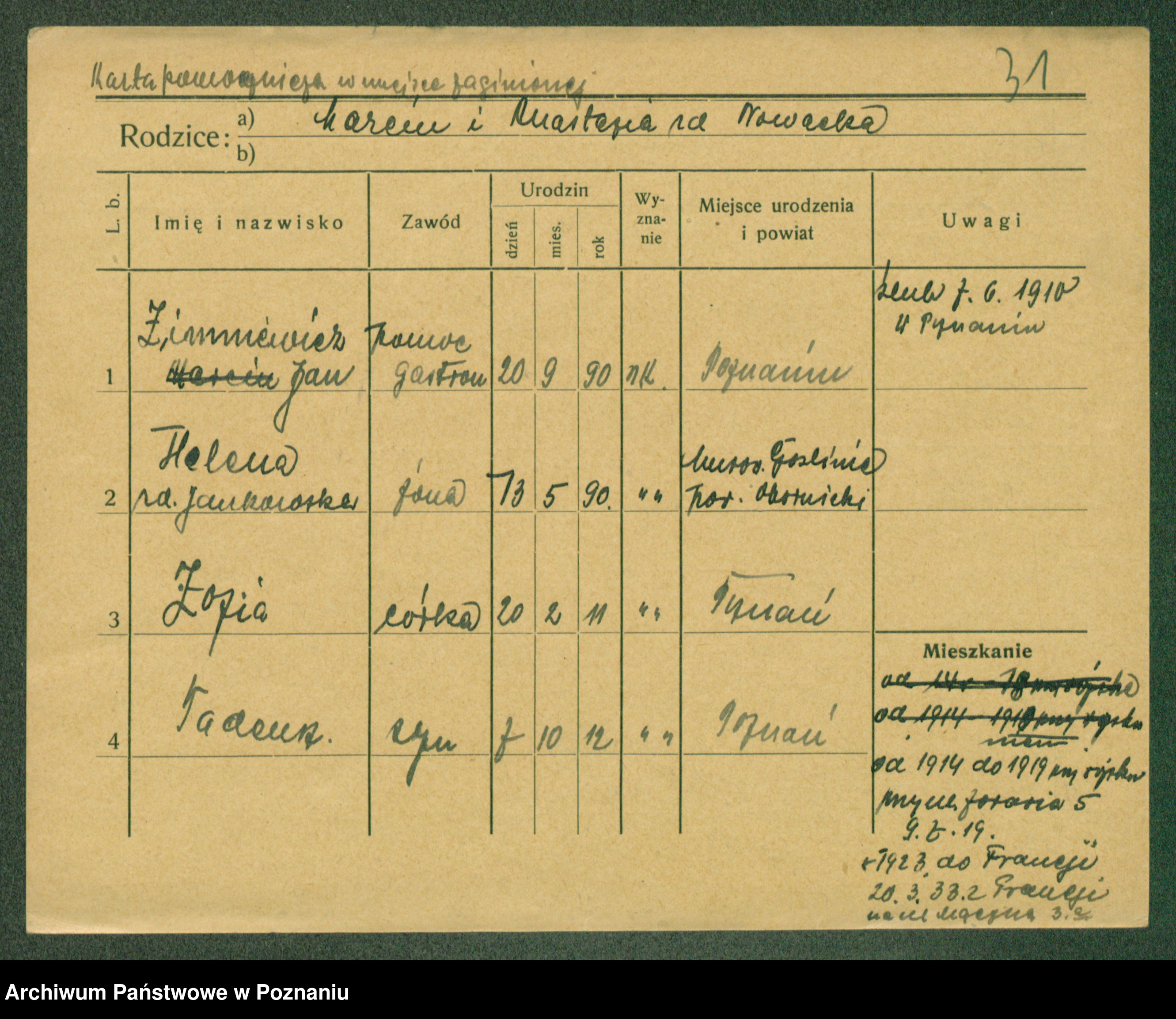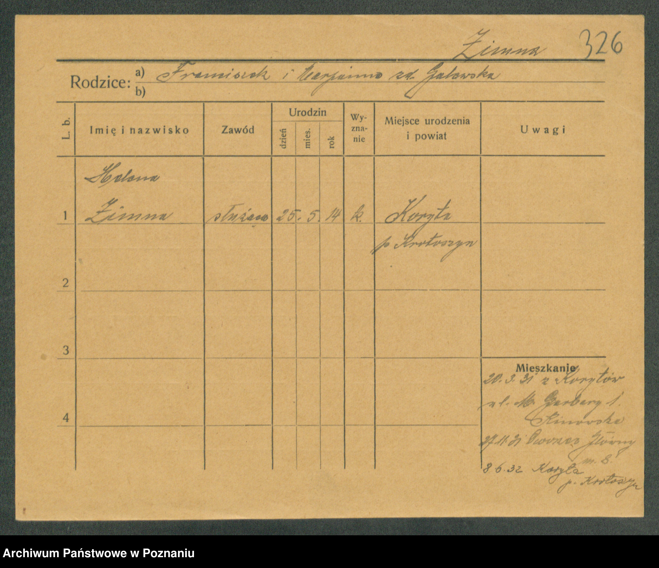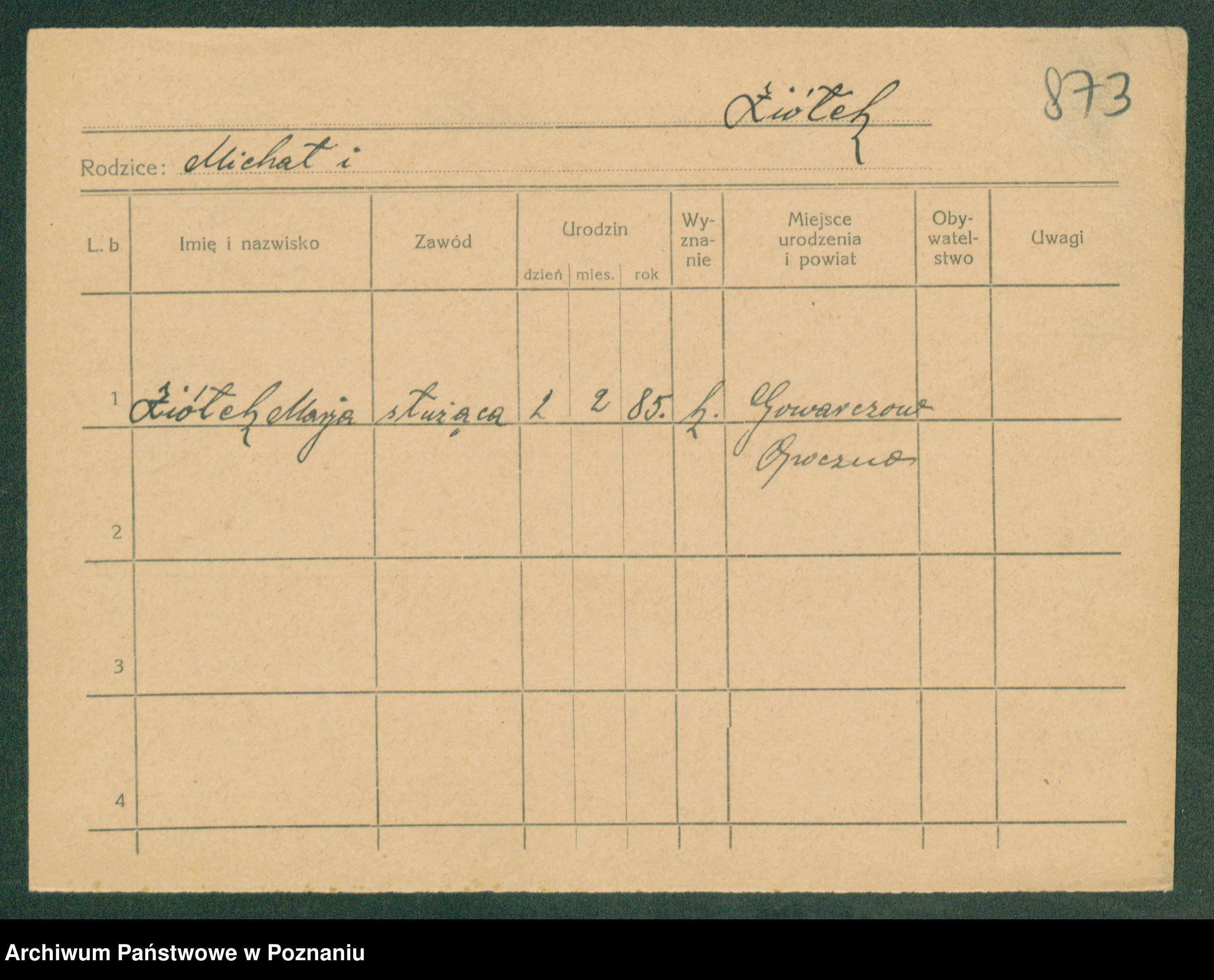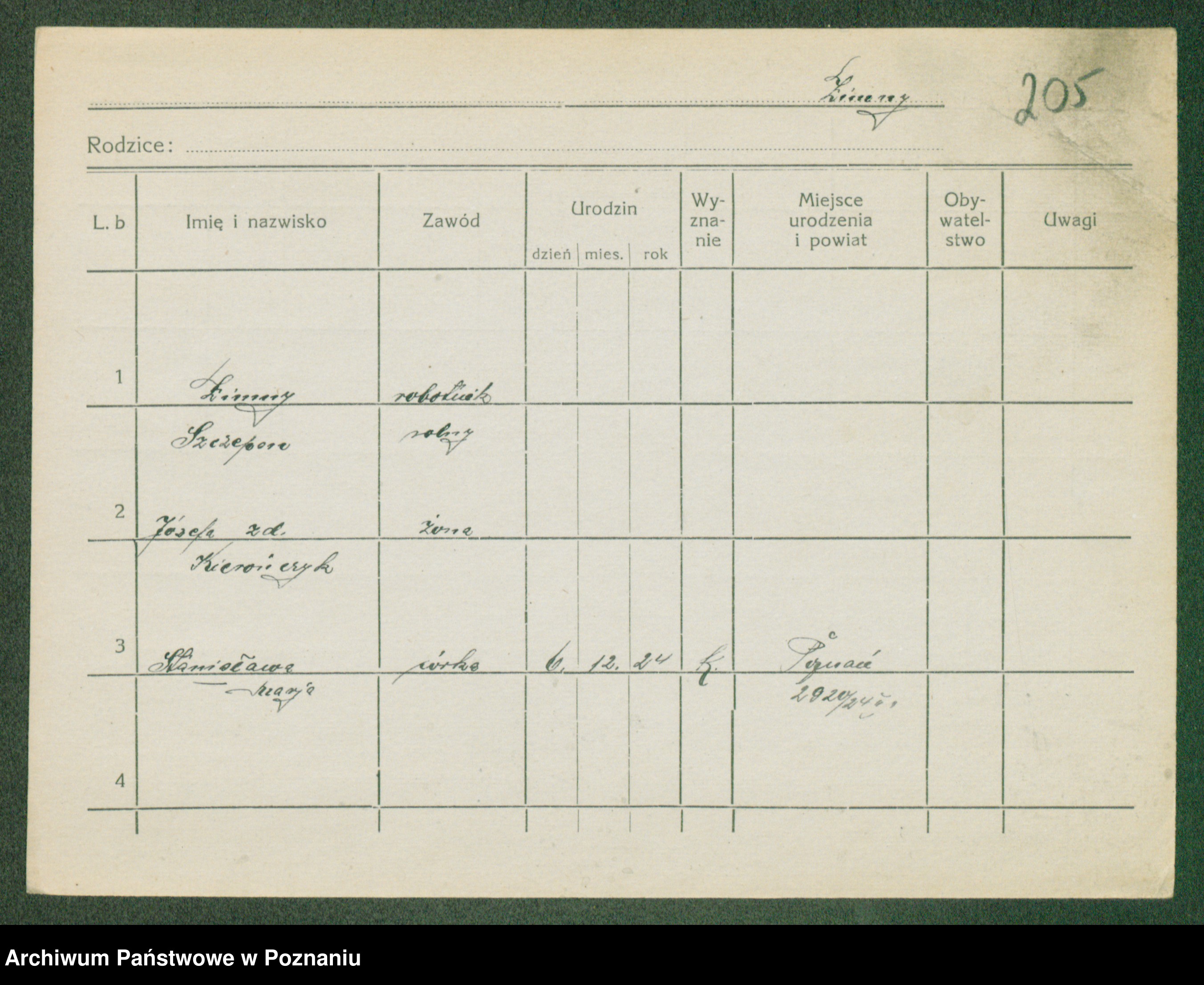 Podgląd karty osobowej dostępny jest po kliknięciu na nazwisko lub ikonkę karty. Można dokonywać powiększenia (ikony na górze) lub przechodzić między kolejnymi skanami (strzałki po bokach).