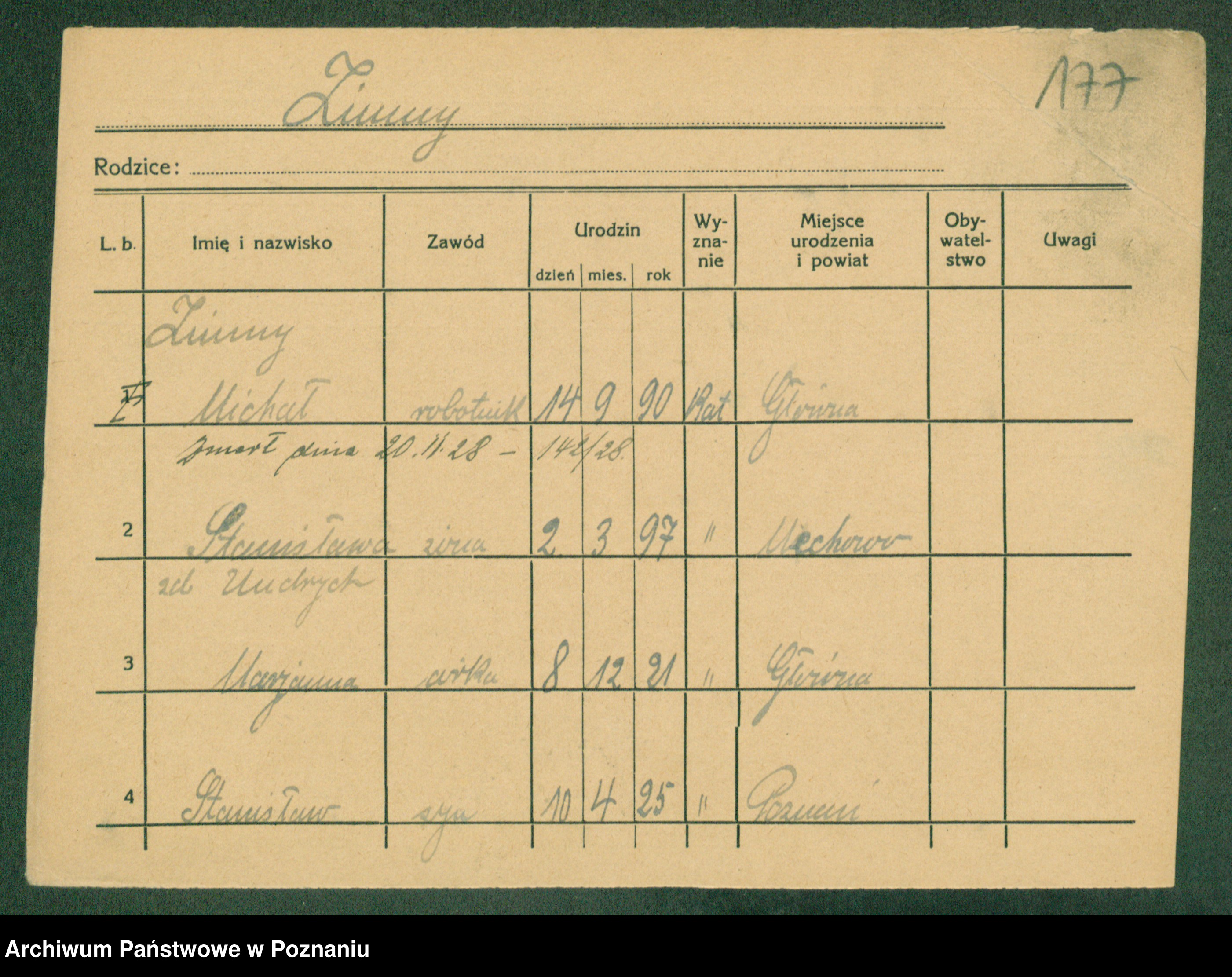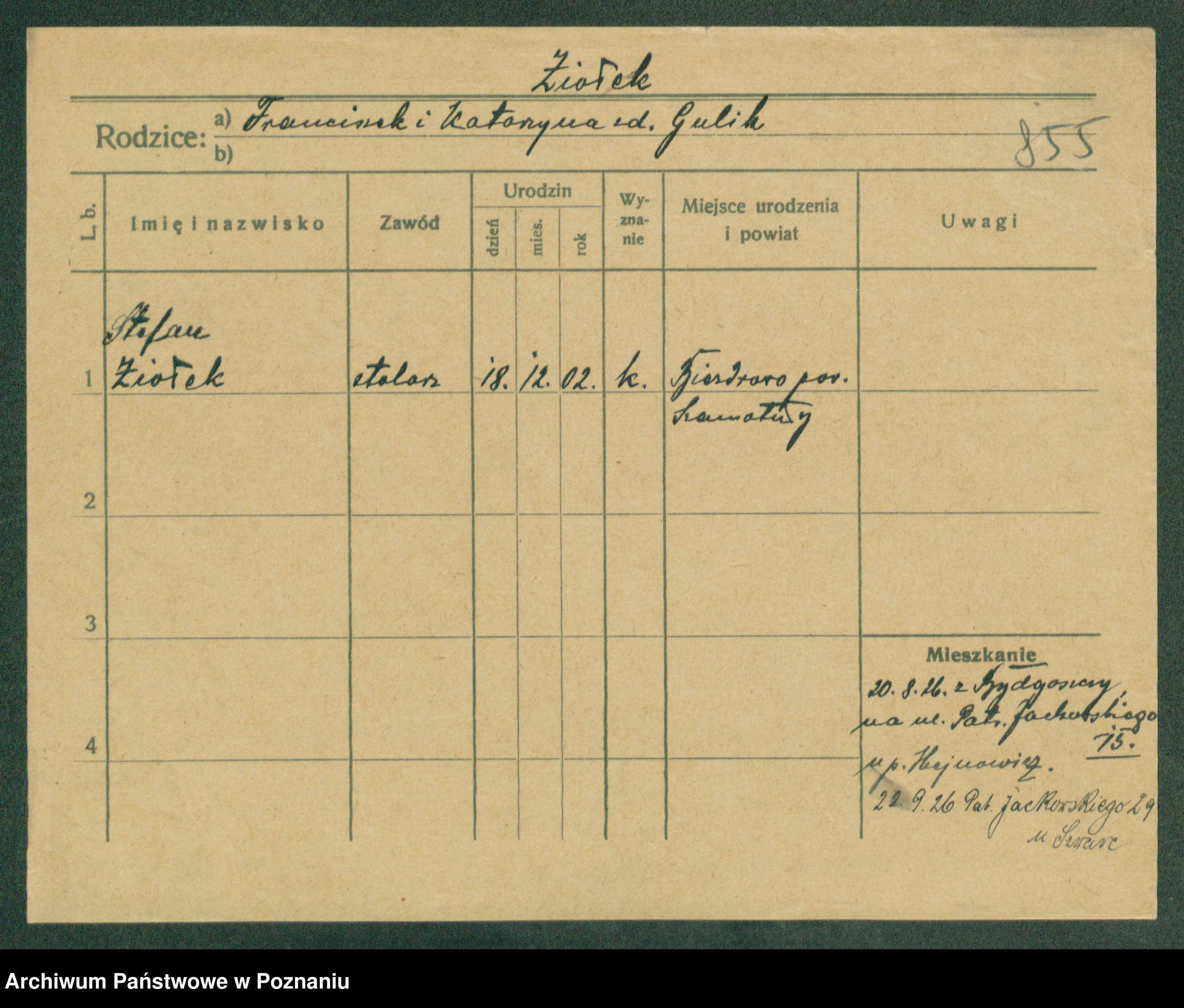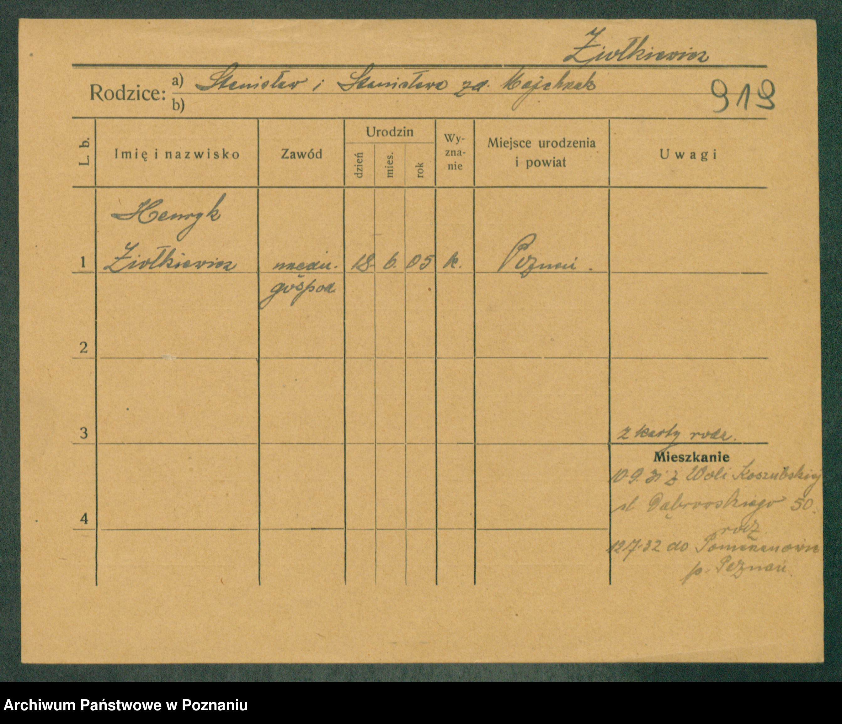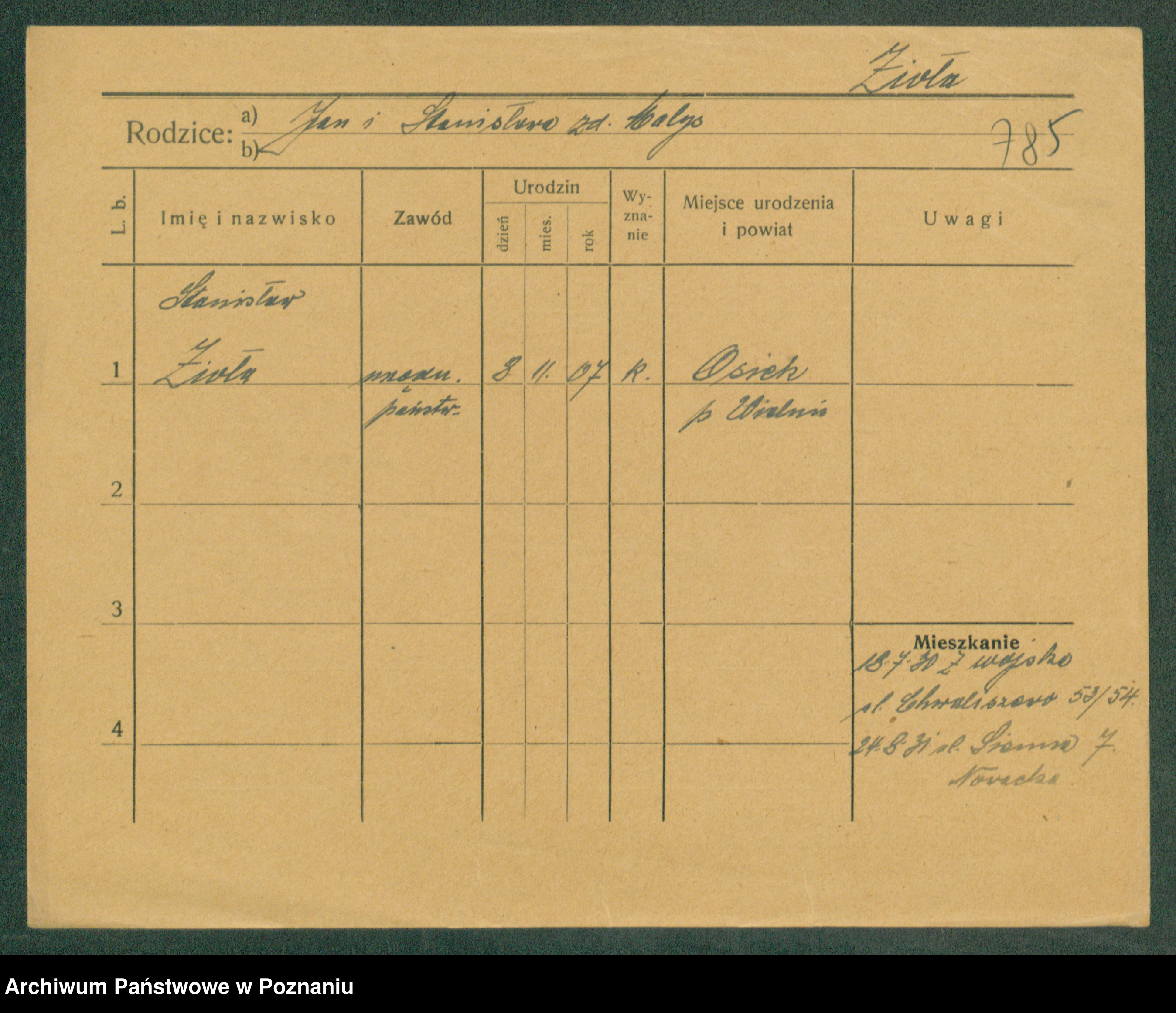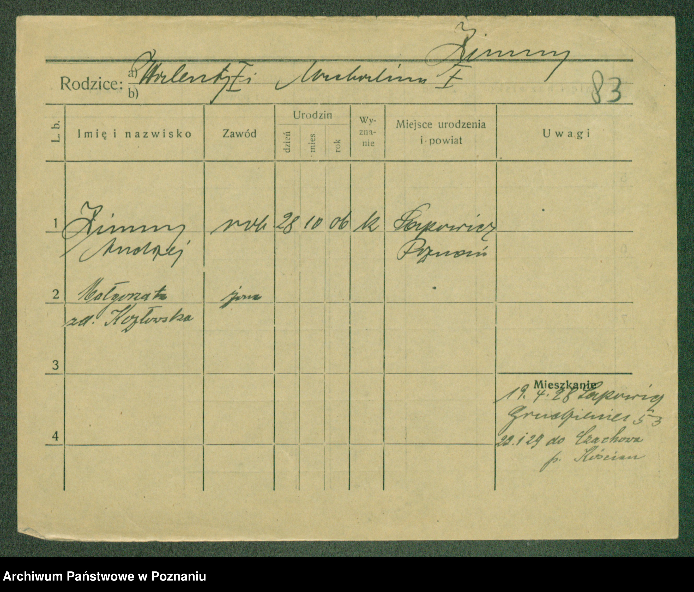 Podgląd karty osobowej dostępny jest po kliknięciu na nazwisko lub ikonkę karty. Można dokonywać powiększenia (ikony na górze) lub przechodzić między kolejnymi skanami (strzałki po bokach).