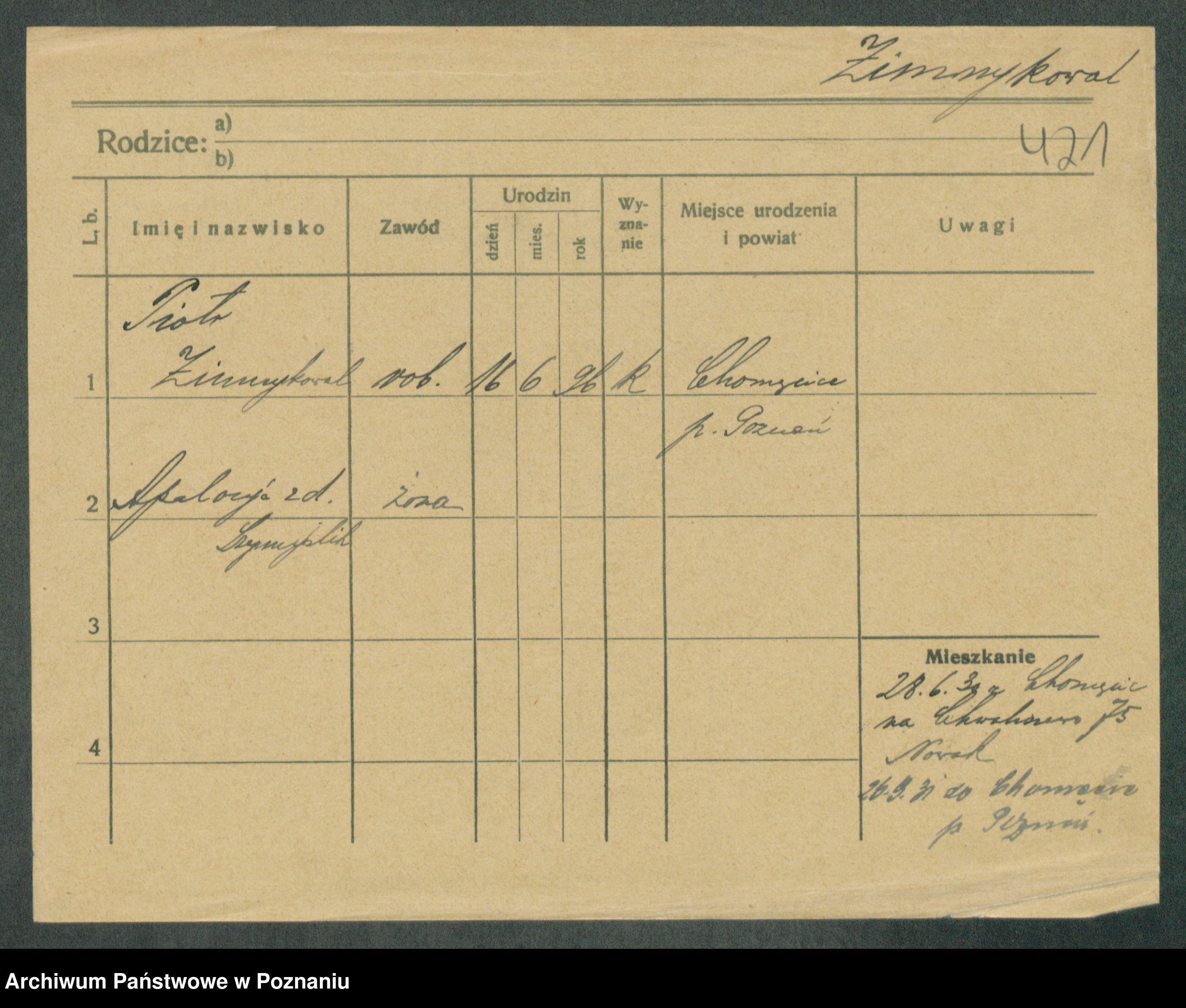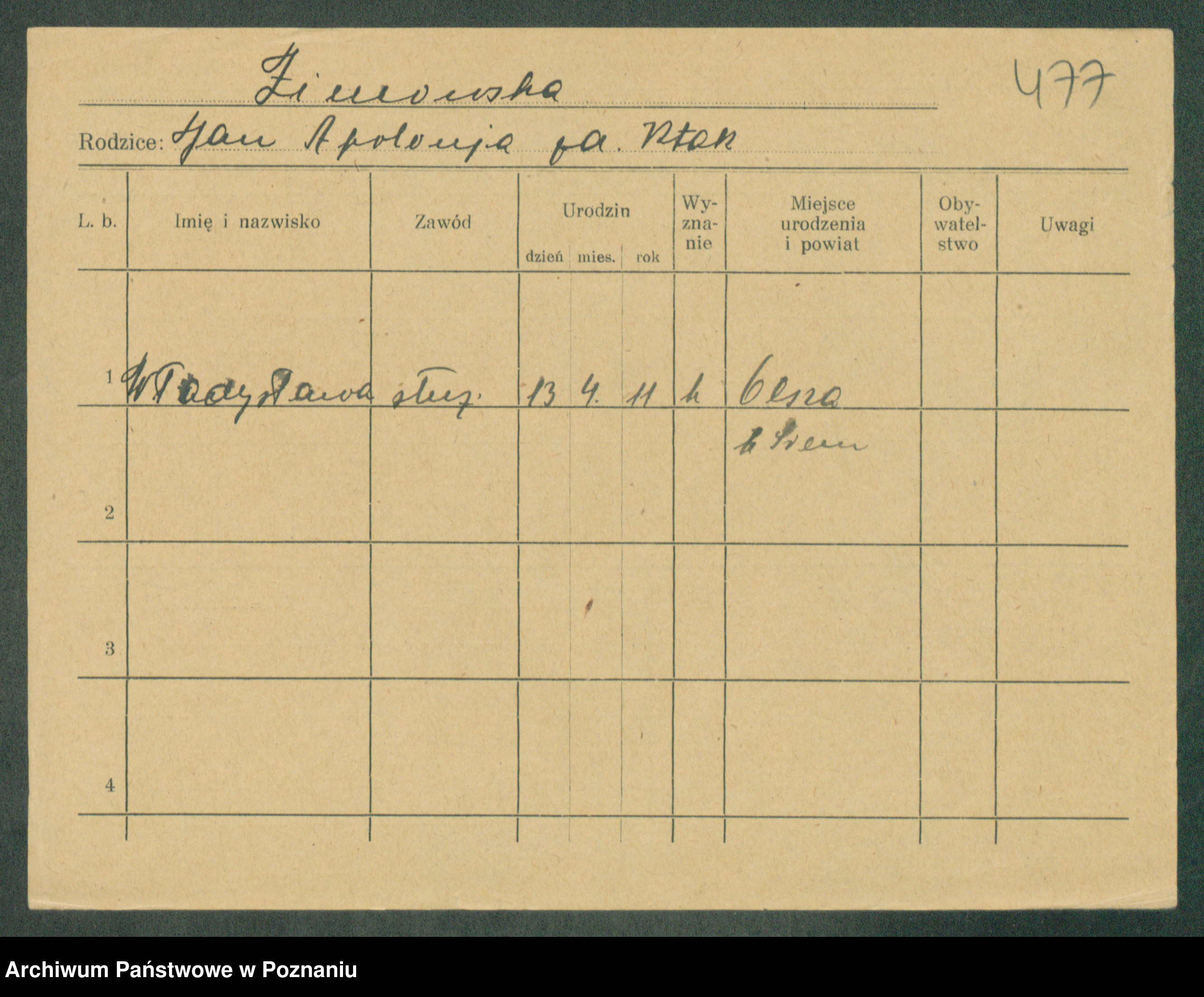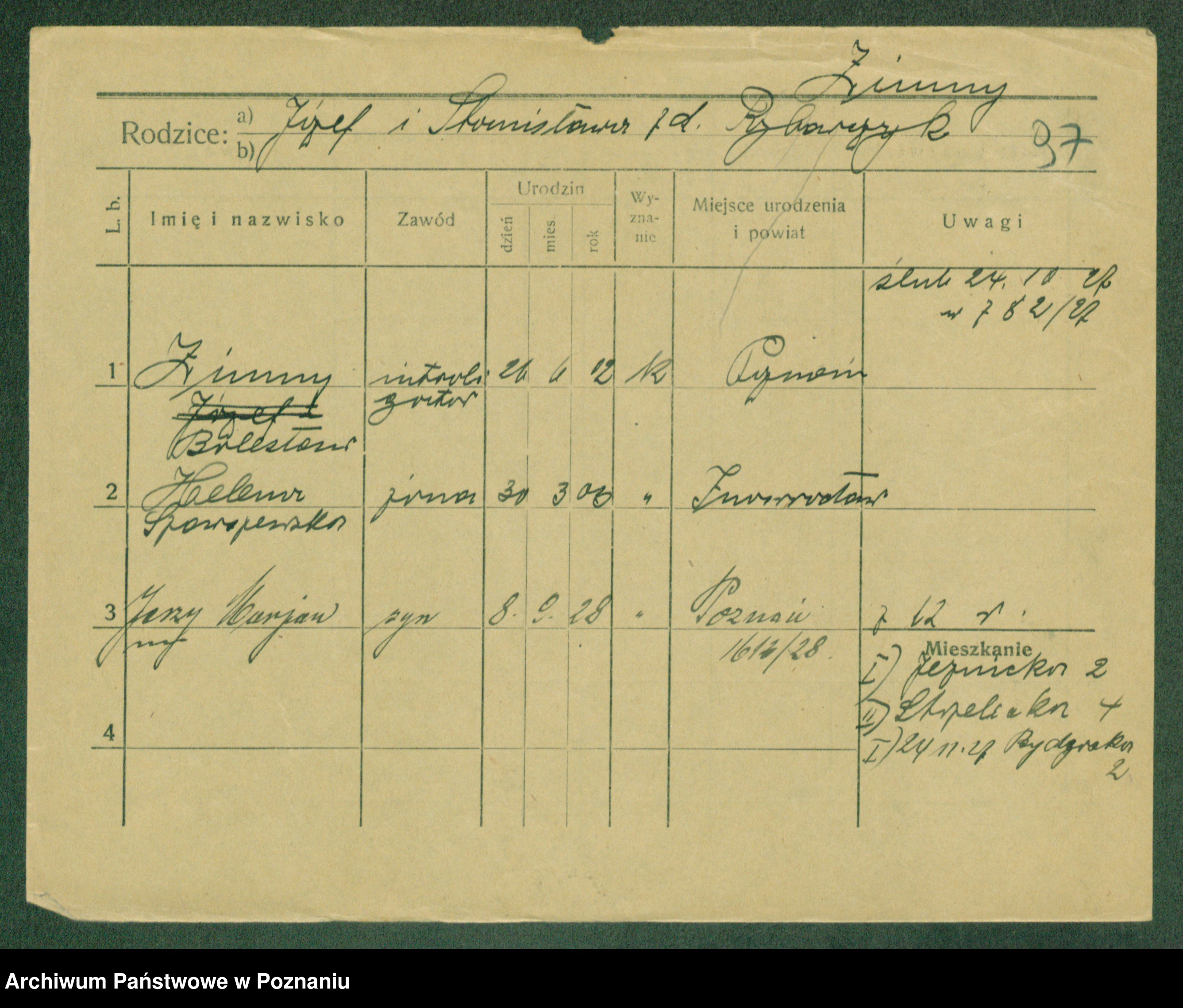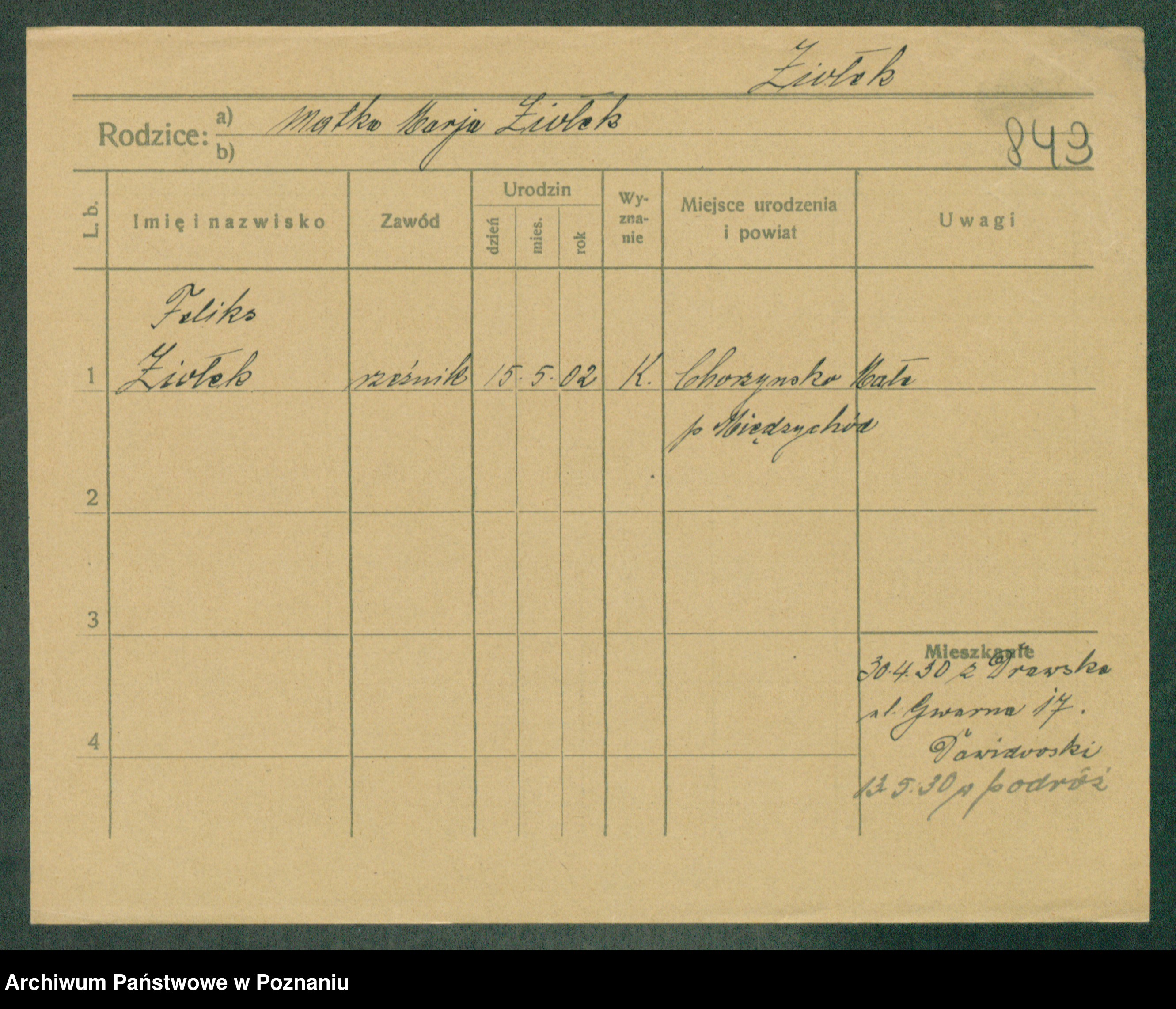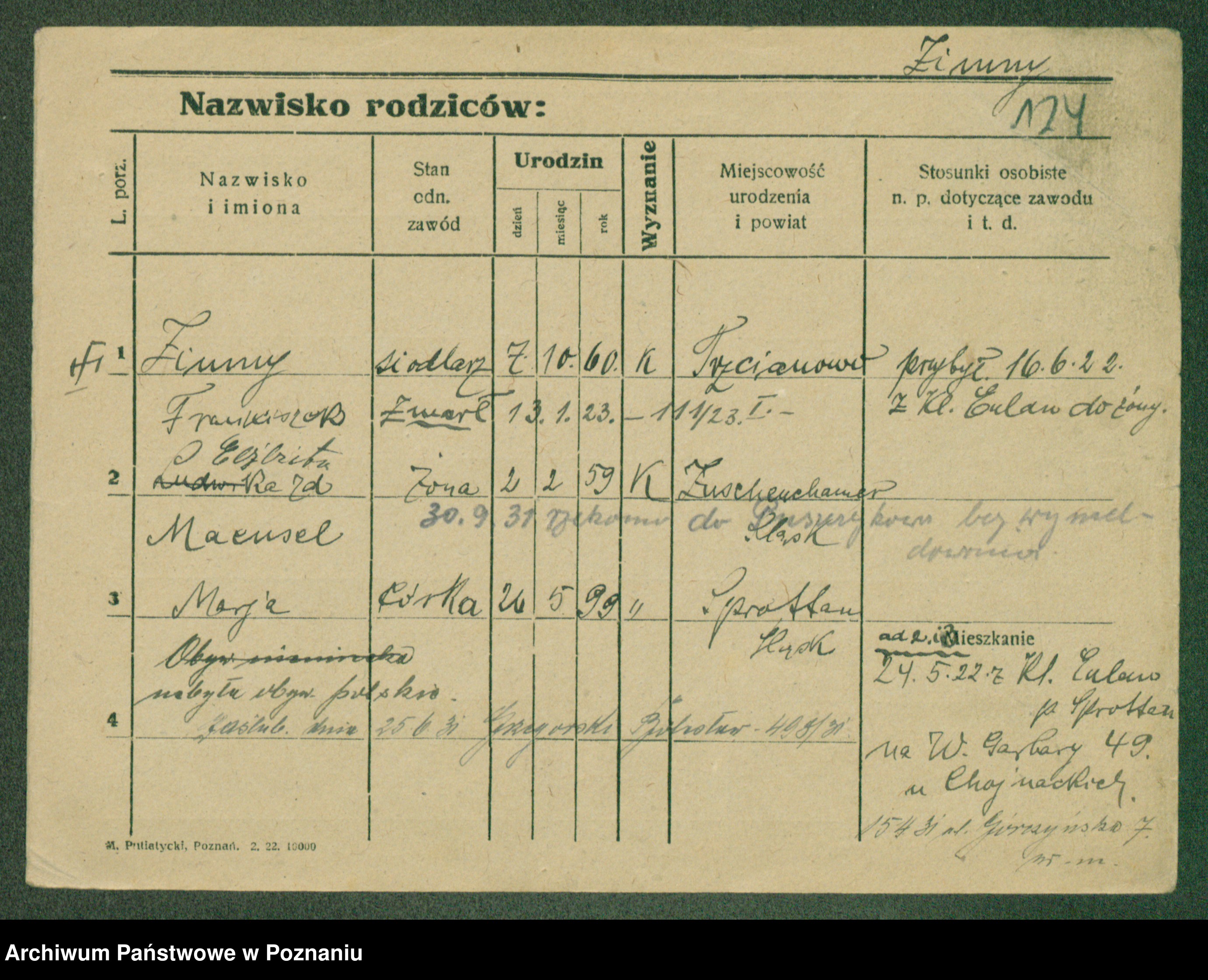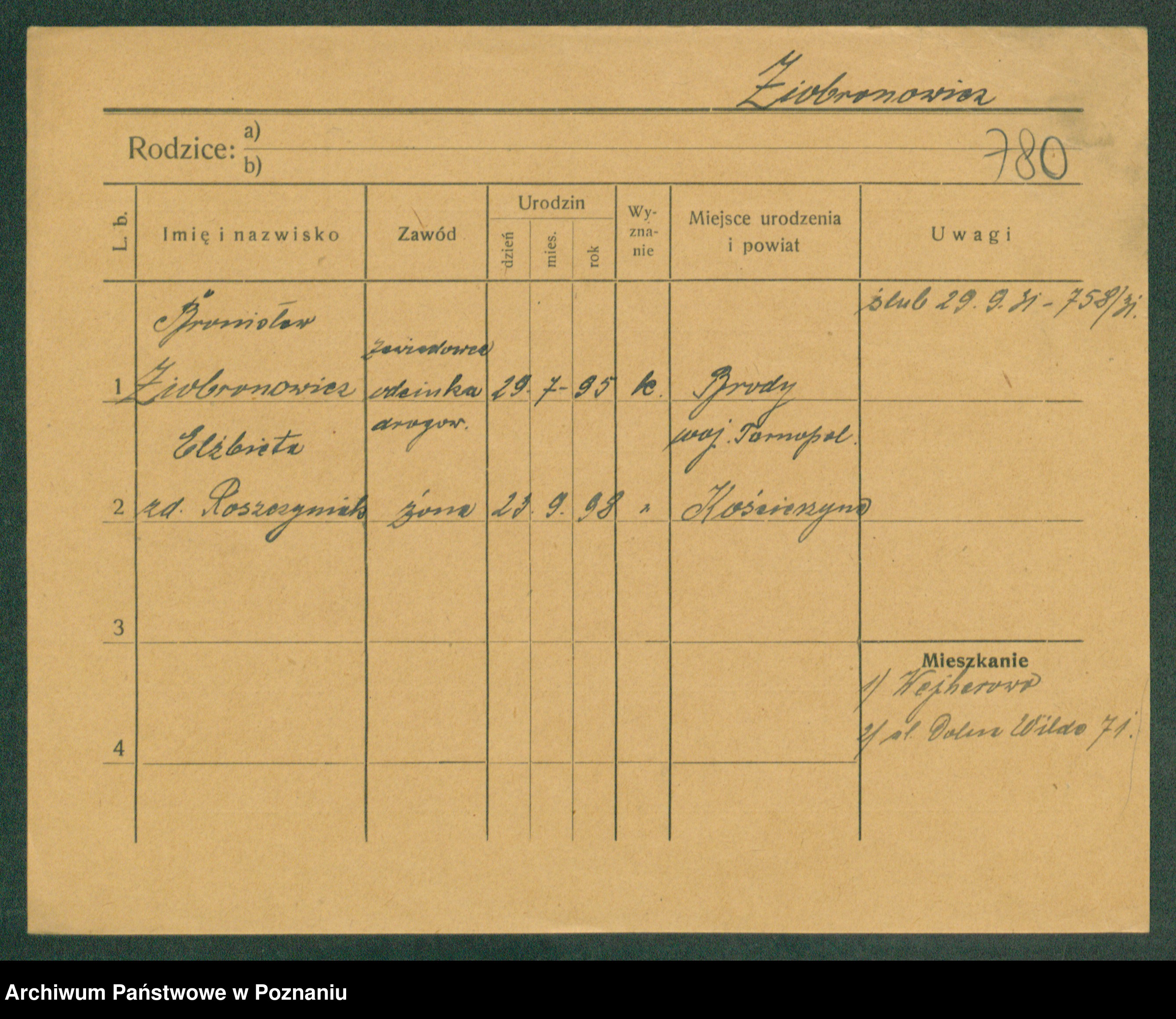 Podgląd karty osobowej dostępny jest po kliknięciu na nazwisko lub ikonkę karty. Można dokonywać powiększenia (ikony na górze) lub przechodzić między kolejnymi skanami (strzałki po bokach).