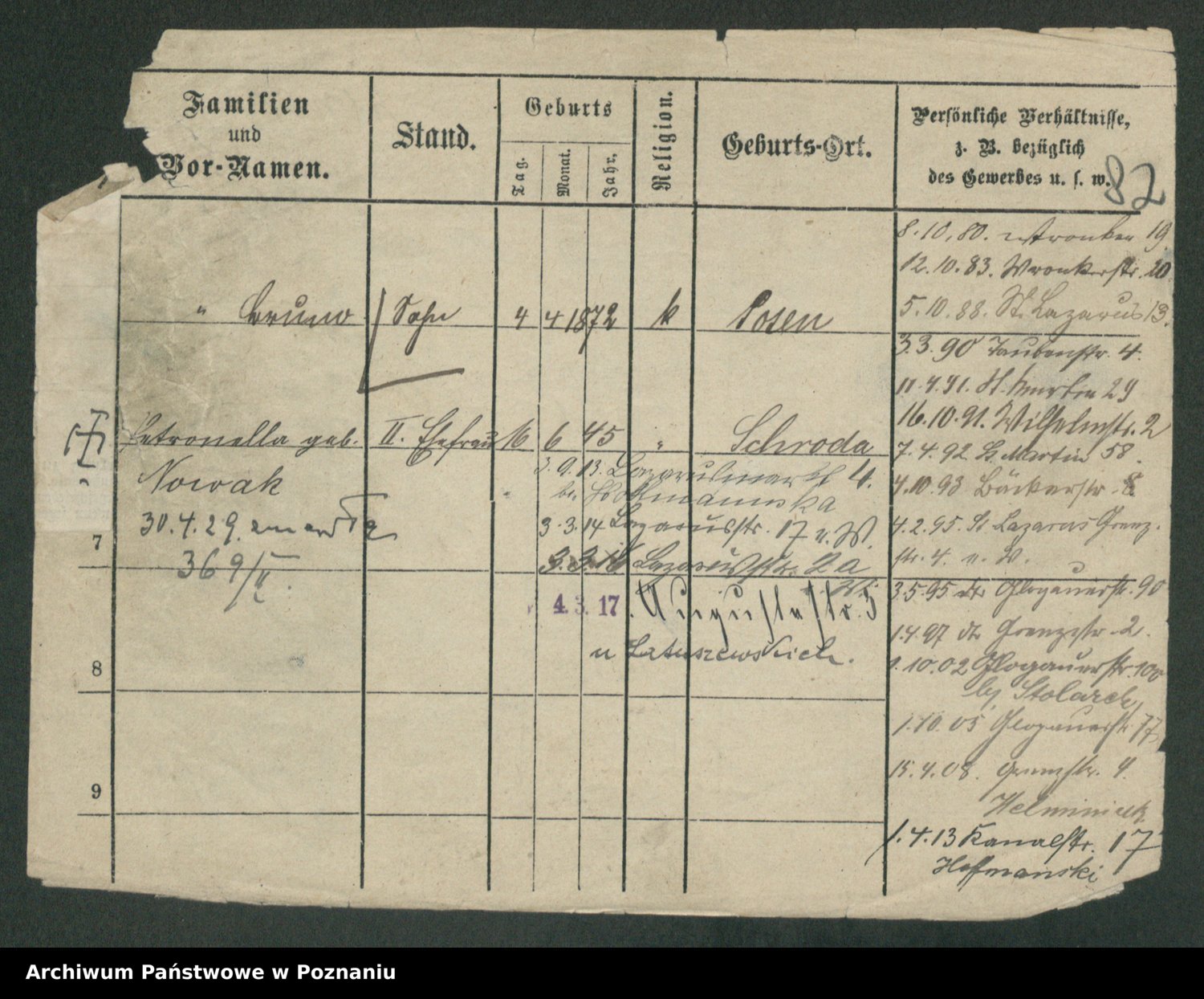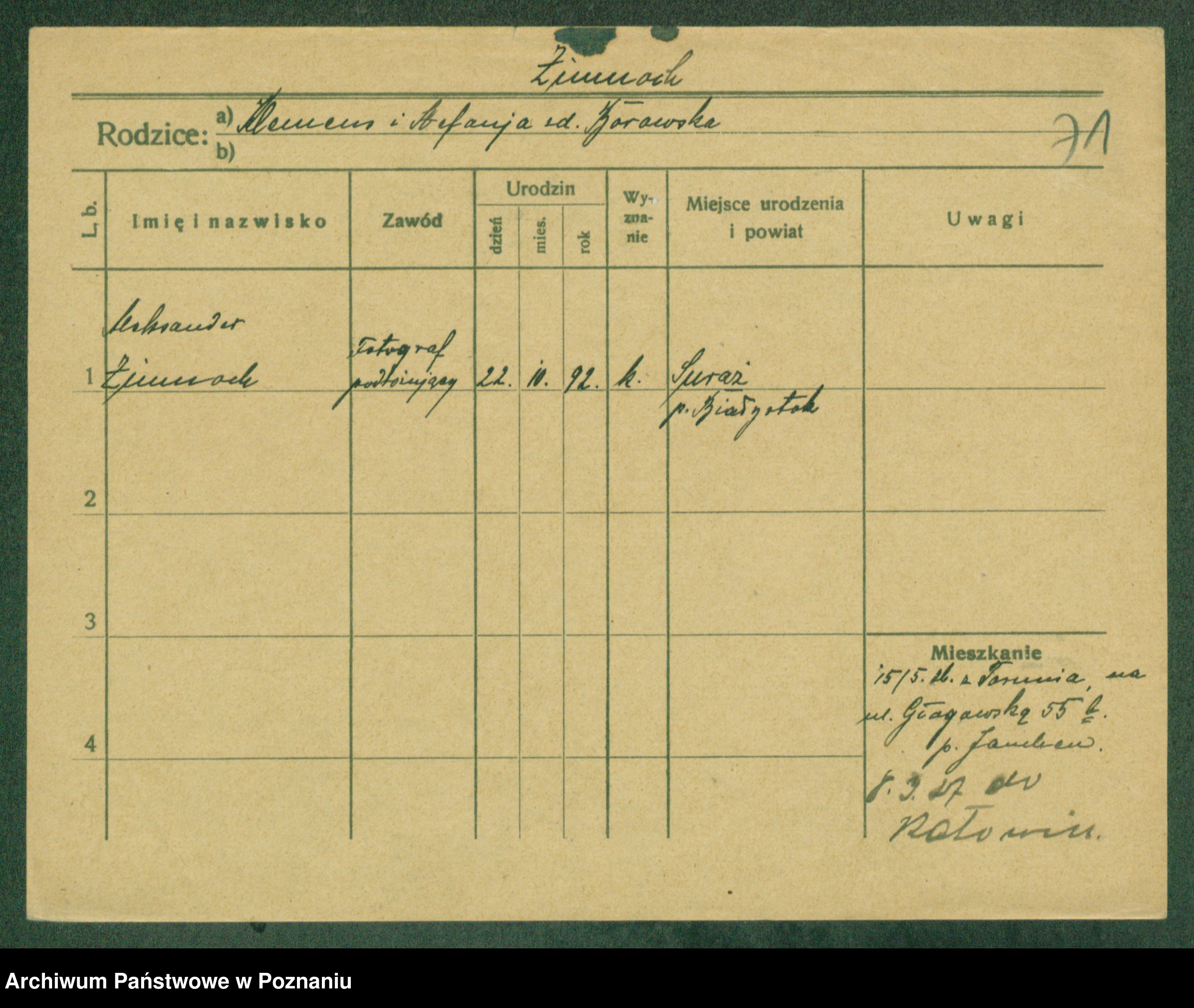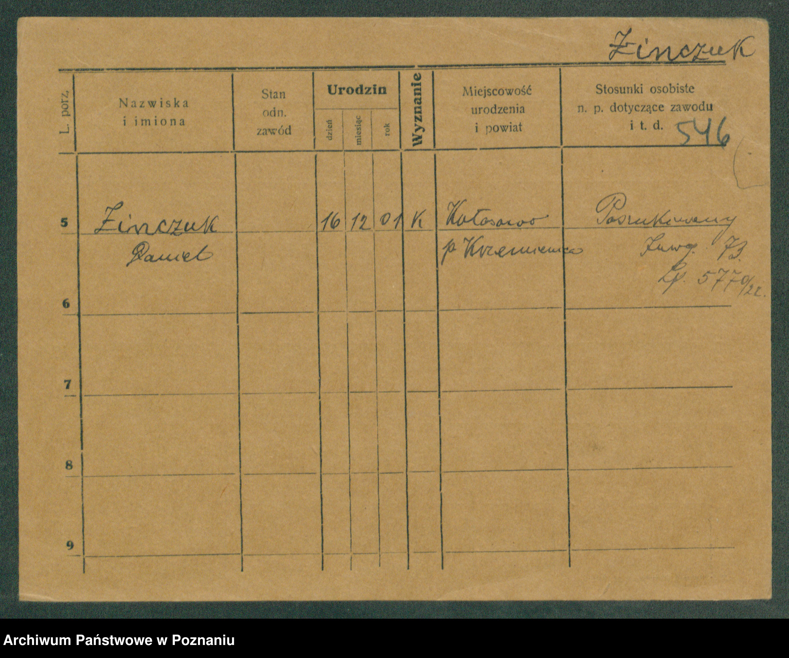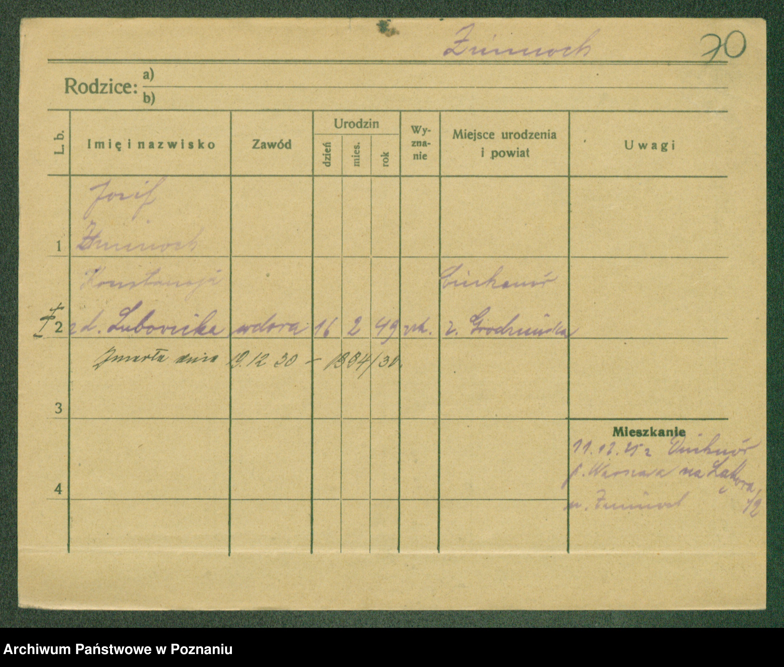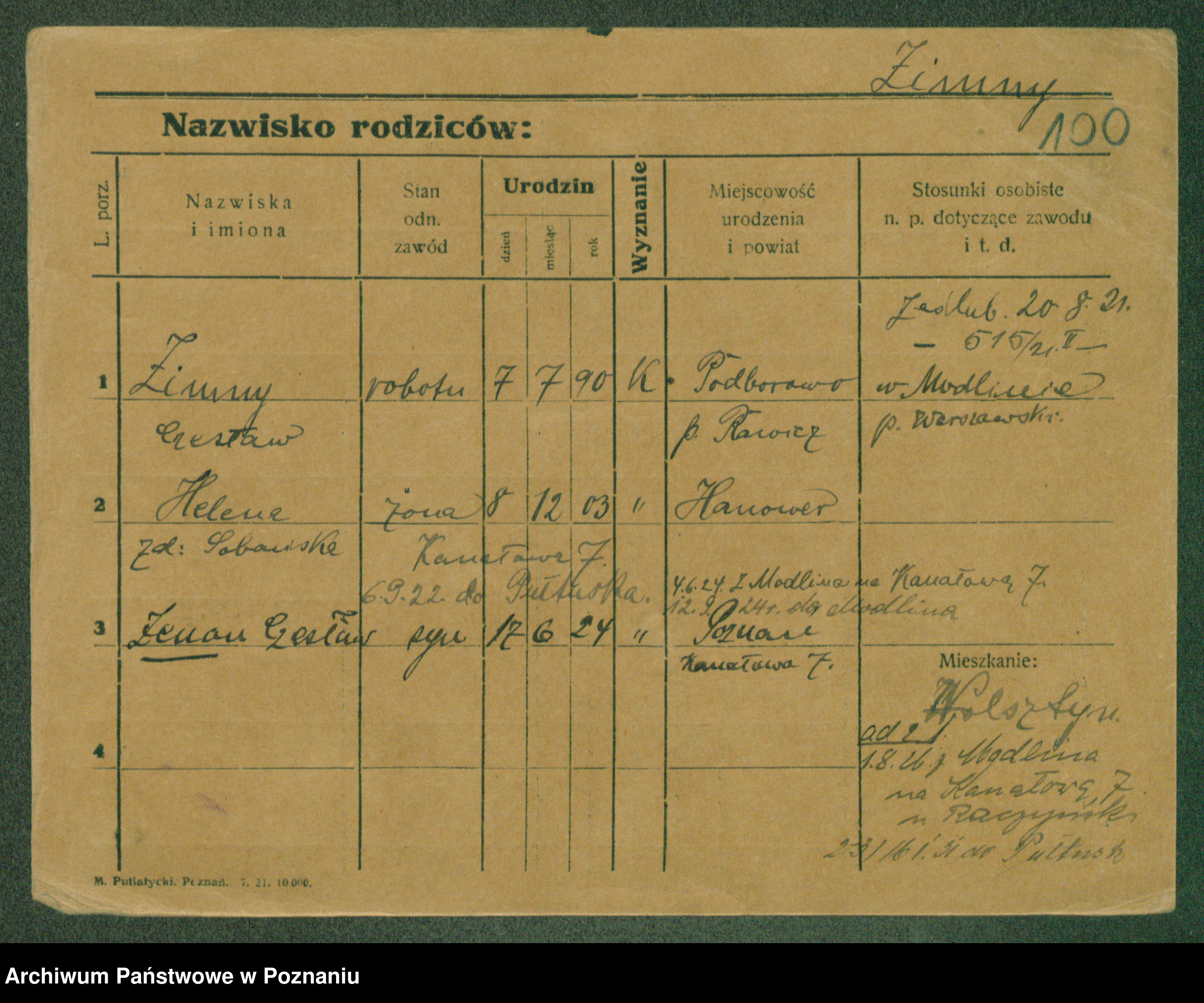 Podgląd karty osobowej dostępny jest po kliknięciu na nazwisko lub ikonkę karty. Można dokonywać powiększenia (ikony na górze) lub przechodzić między kolejnymi skanami (strzałki po bokach).