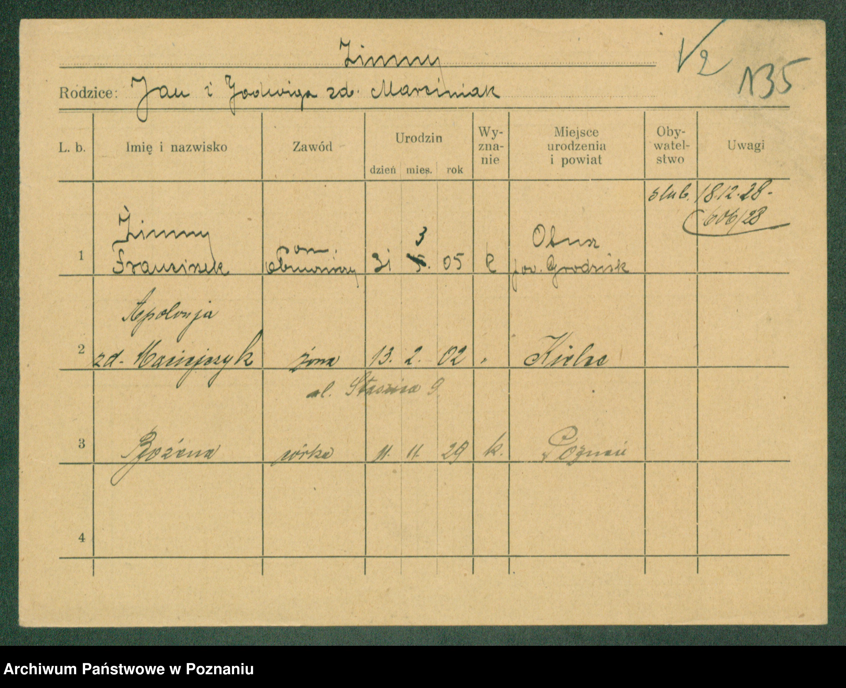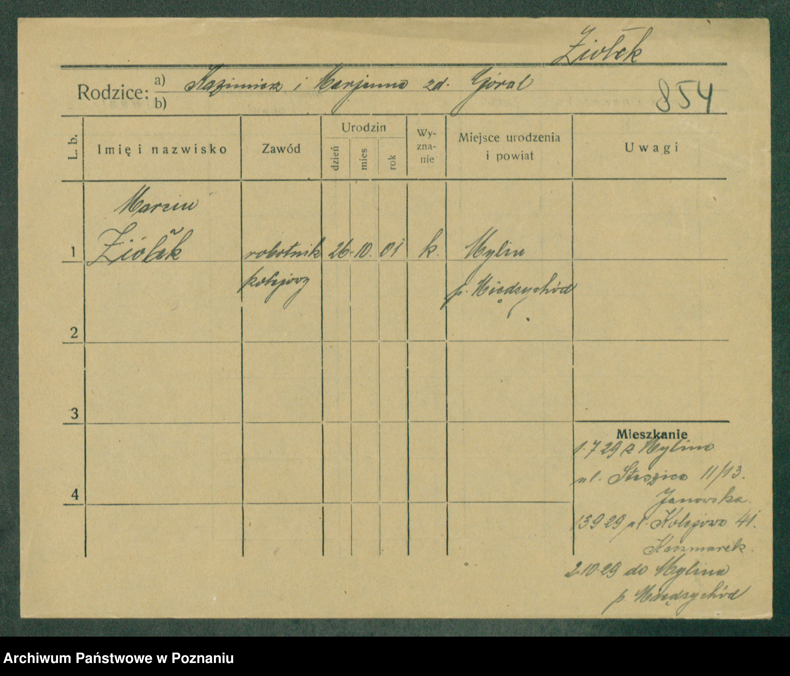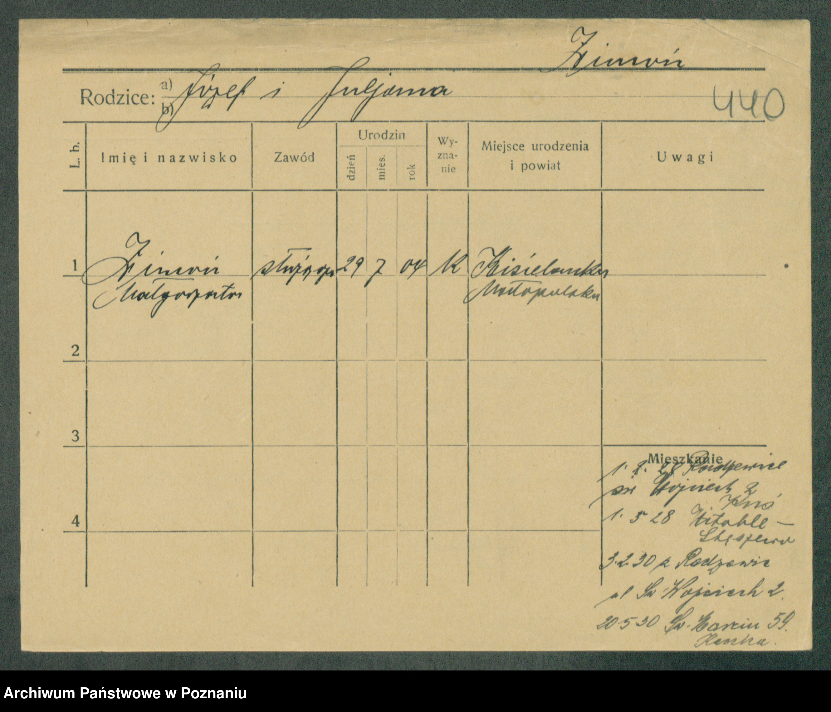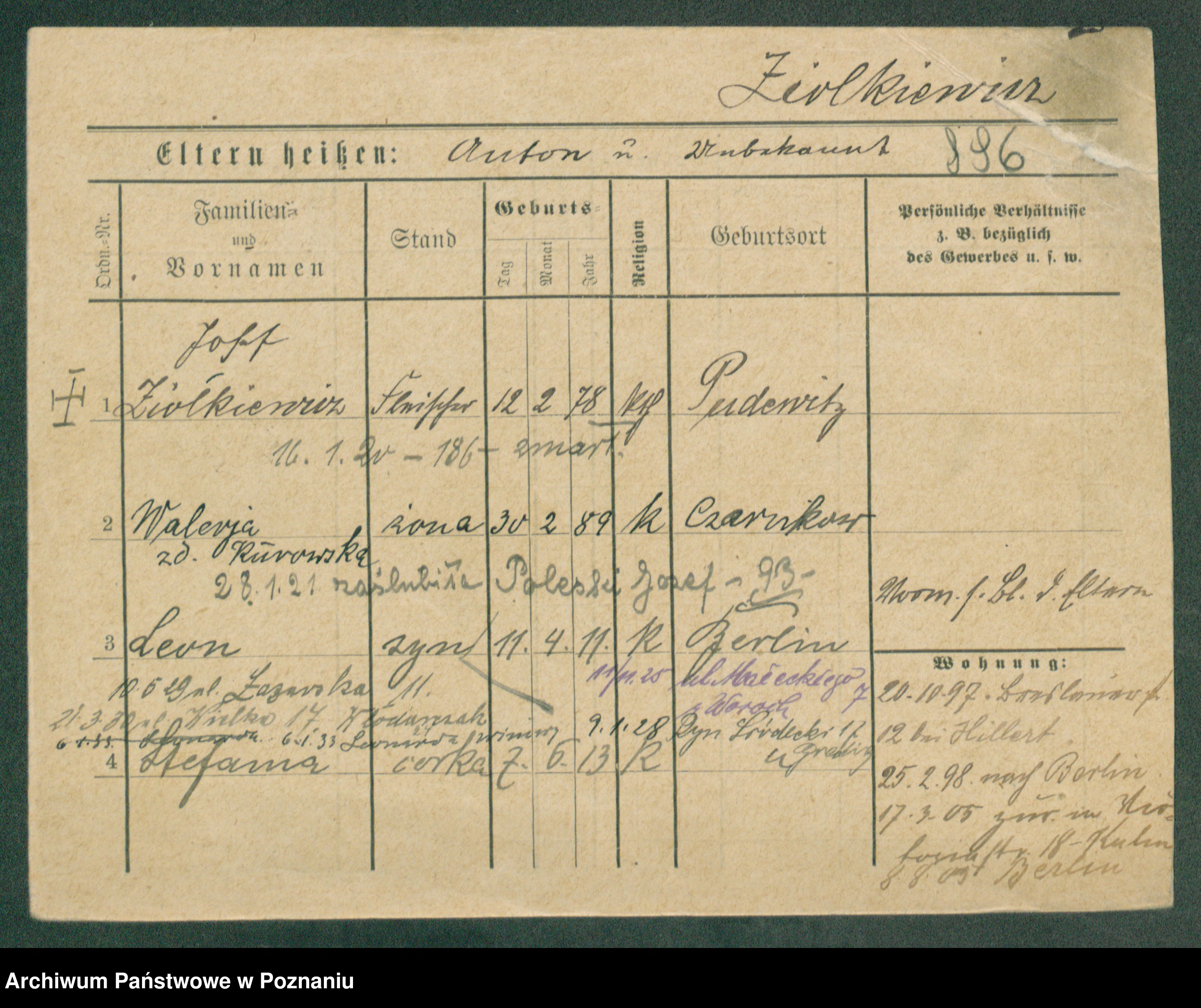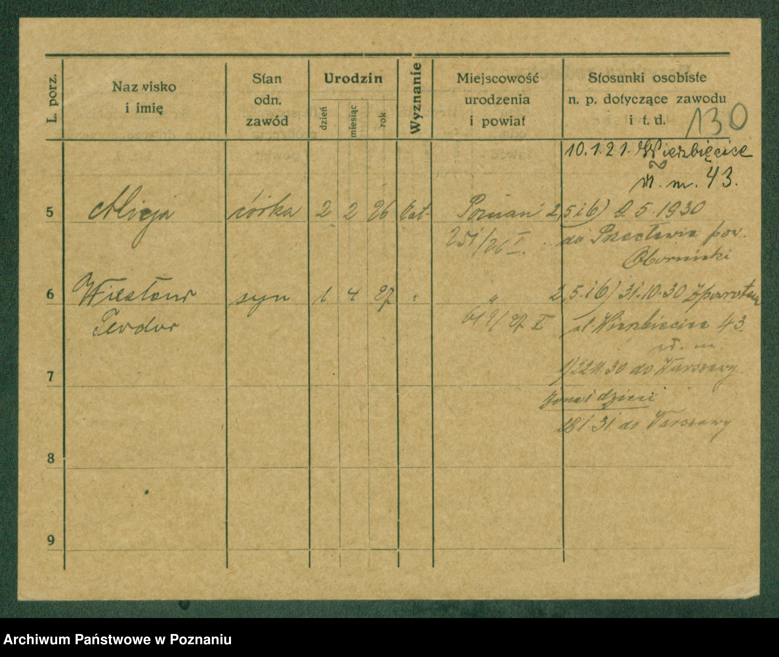 Podgląd karty osobowej dostępny jest po kliknięciu na nazwisko lub ikonkę karty. Można dokonywać powiększenia (ikony na górze) lub przechodzić między kolejnymi skanami (strzałki po bokach).