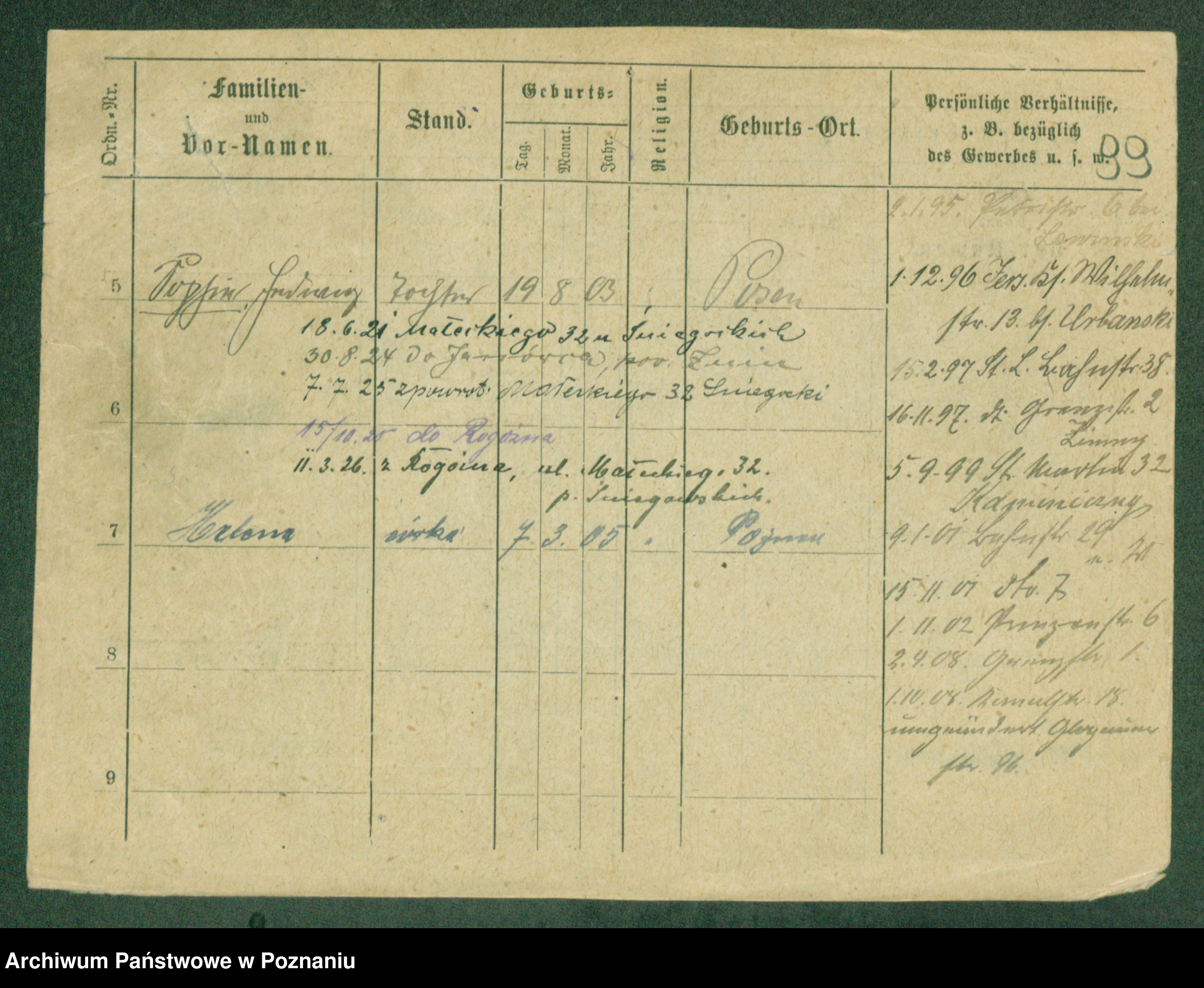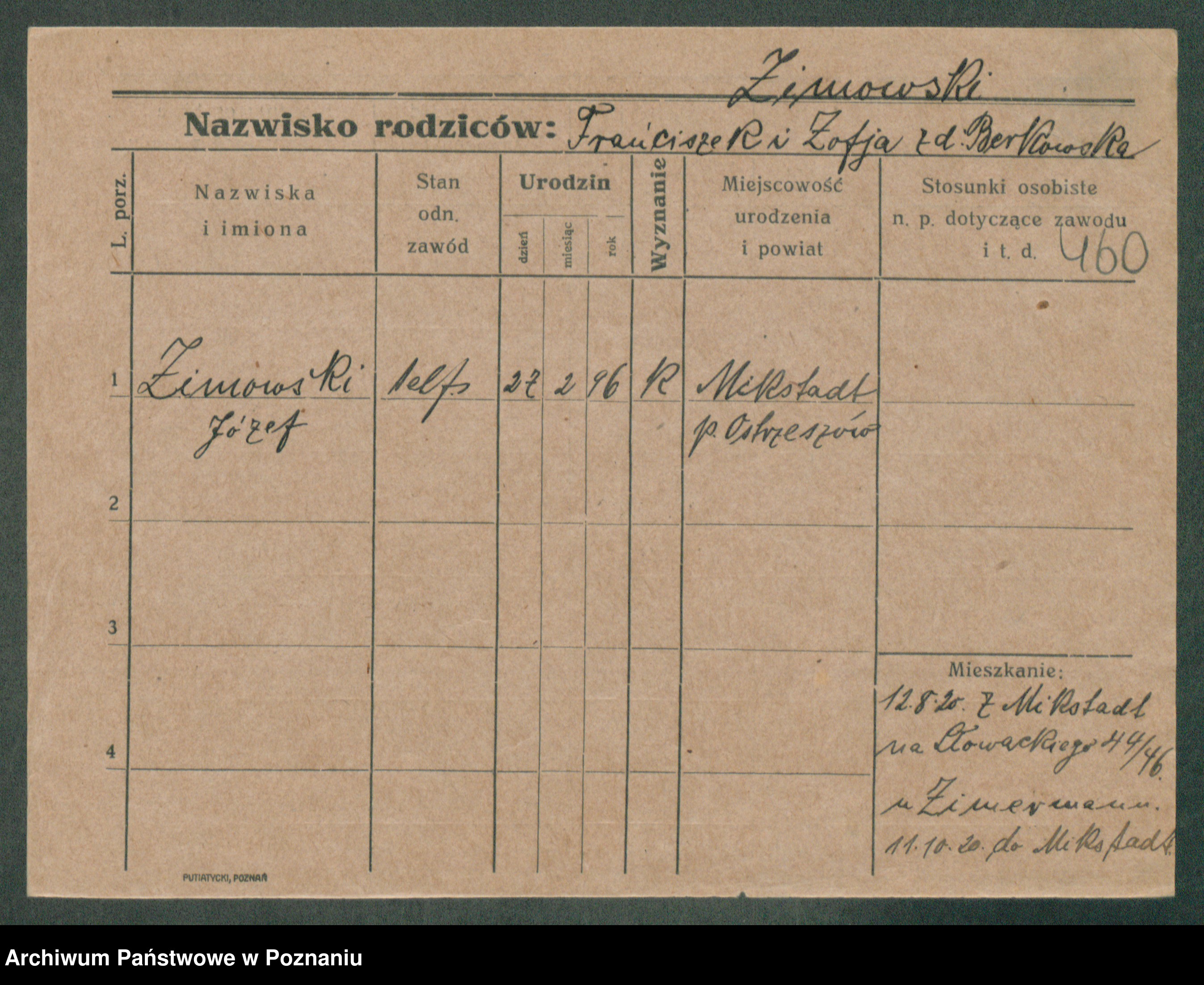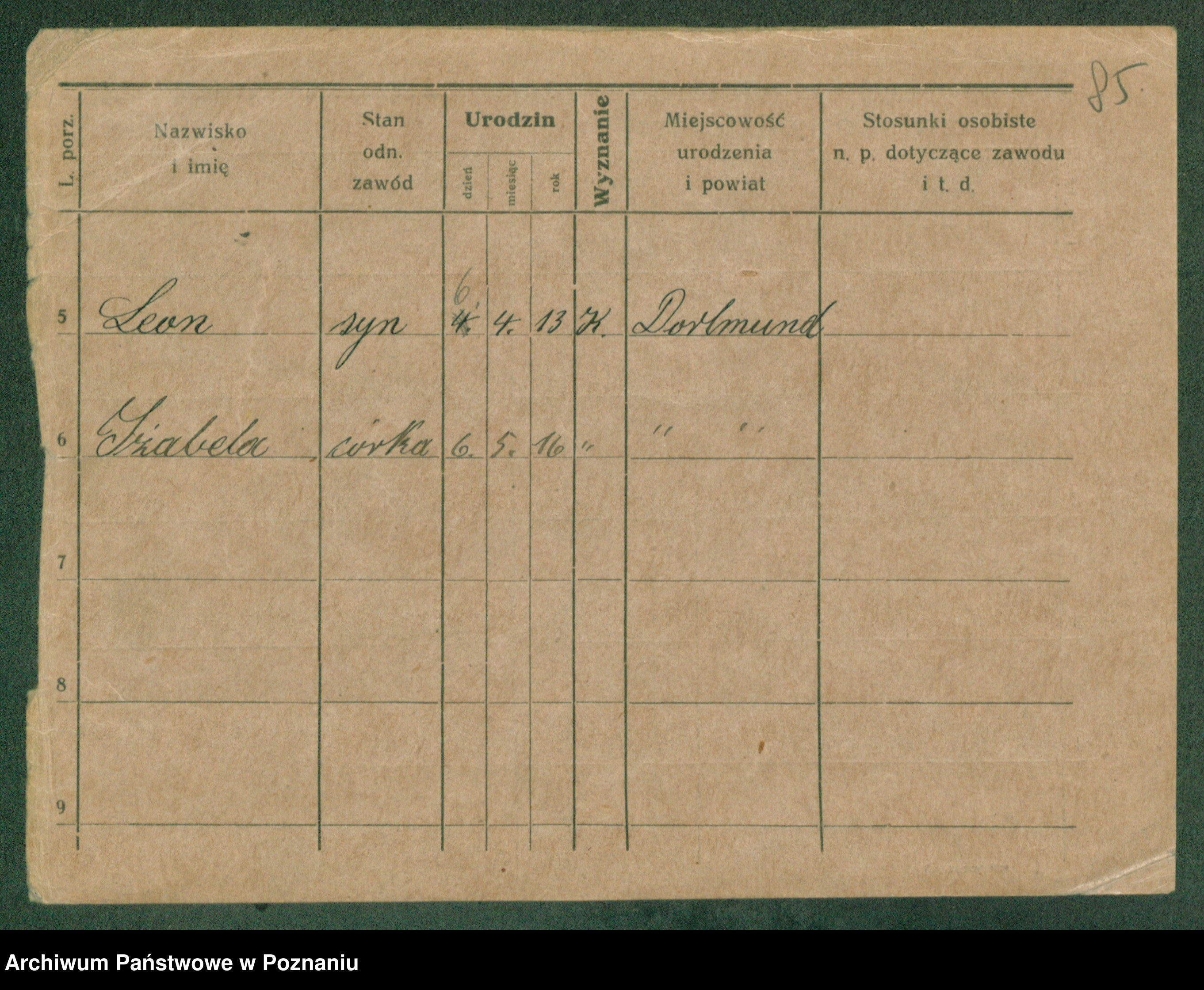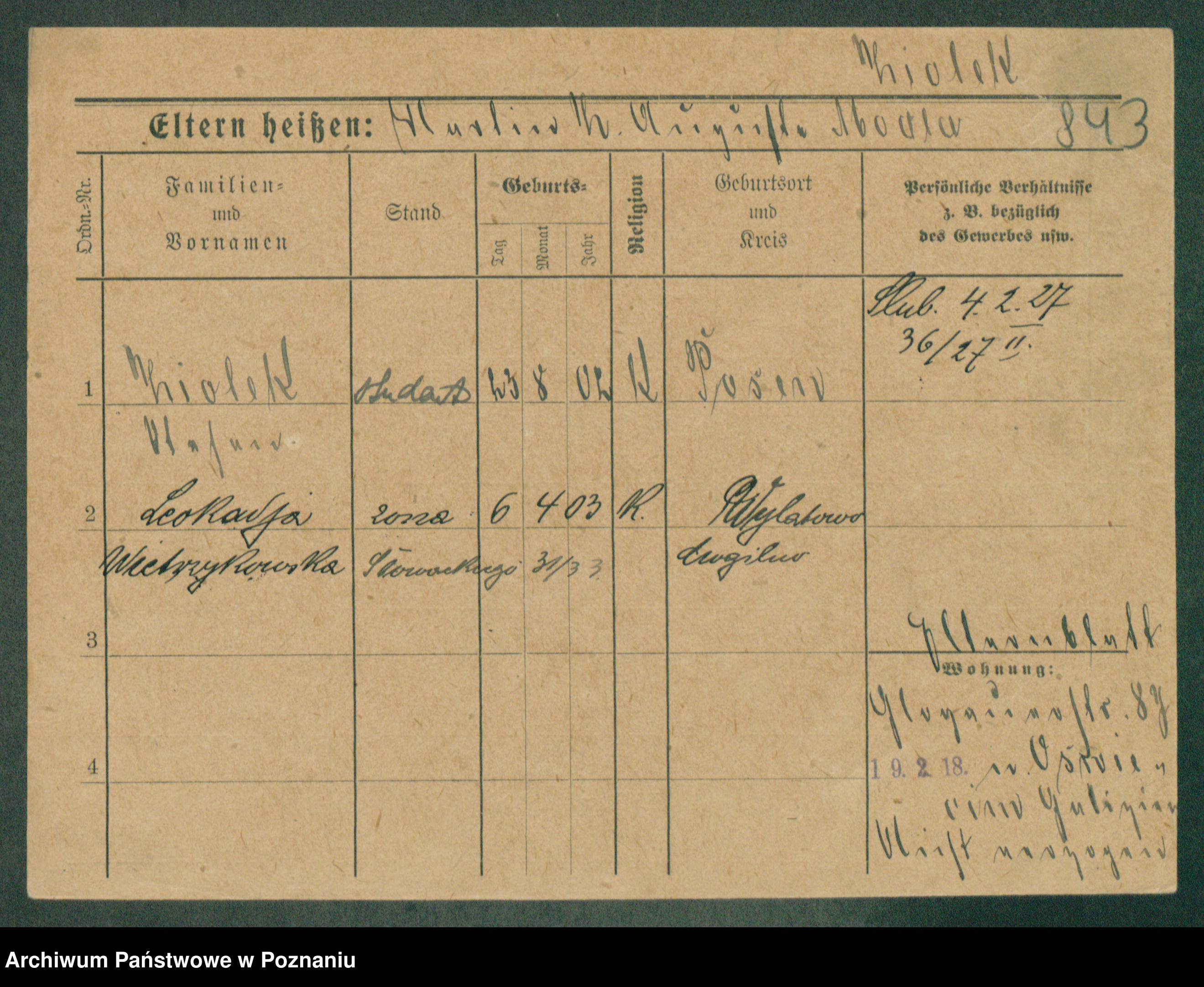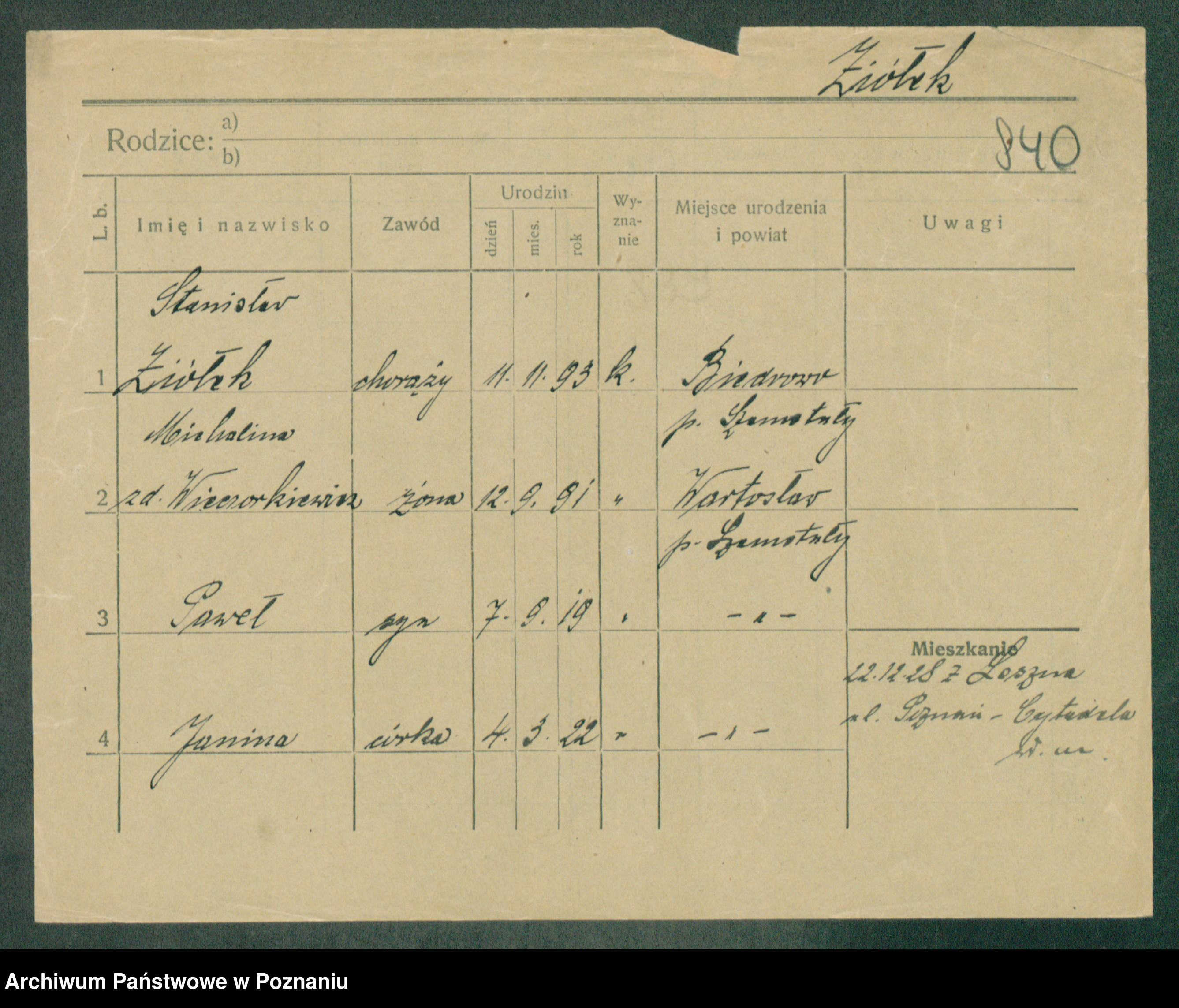 Podgląd karty osobowej dostępny jest po kliknięciu na nazwisko lub ikonkę karty. Można dokonywać powiększenia (ikony na górze) lub przechodzić między kolejnymi skanami (strzałki po bokach).