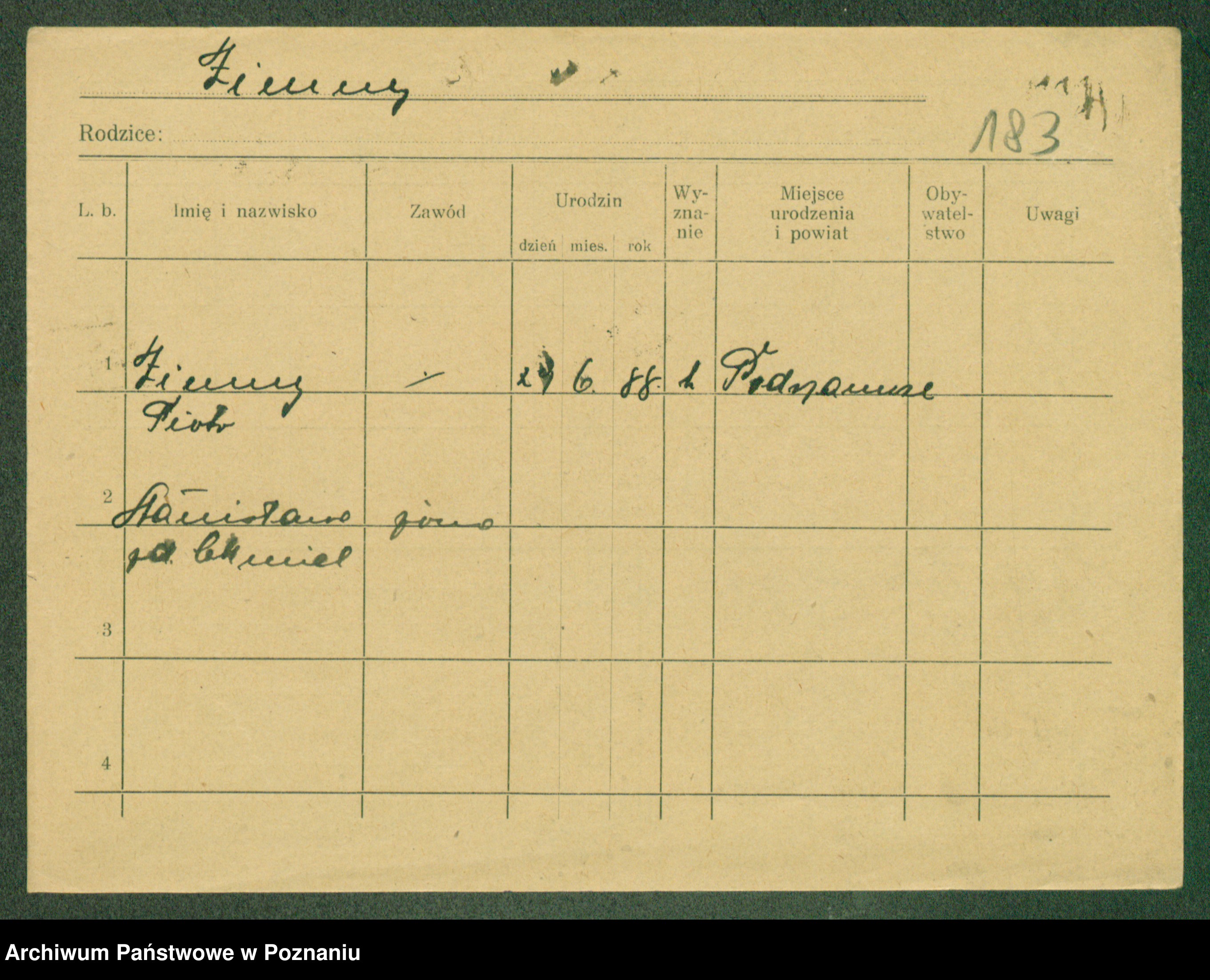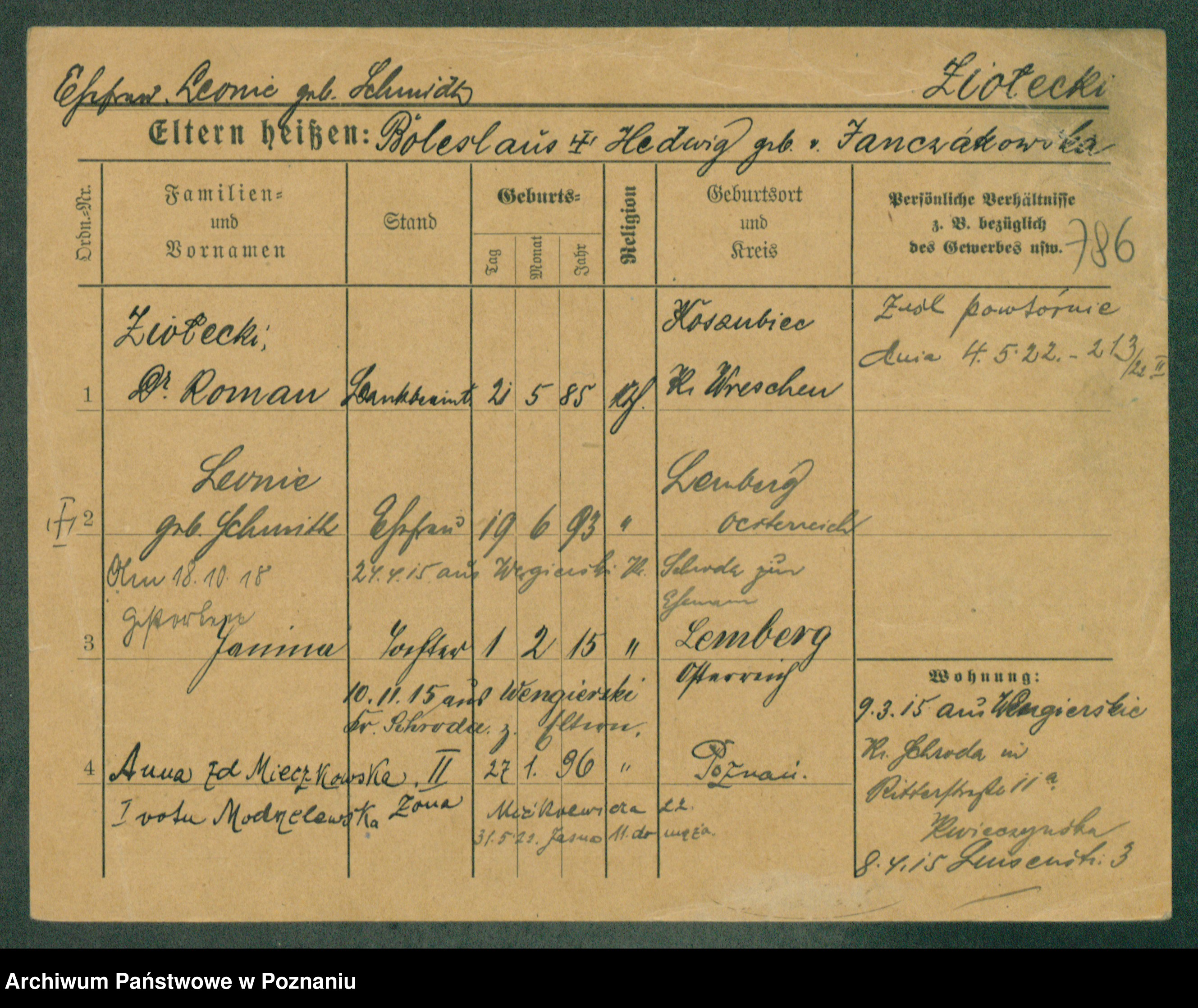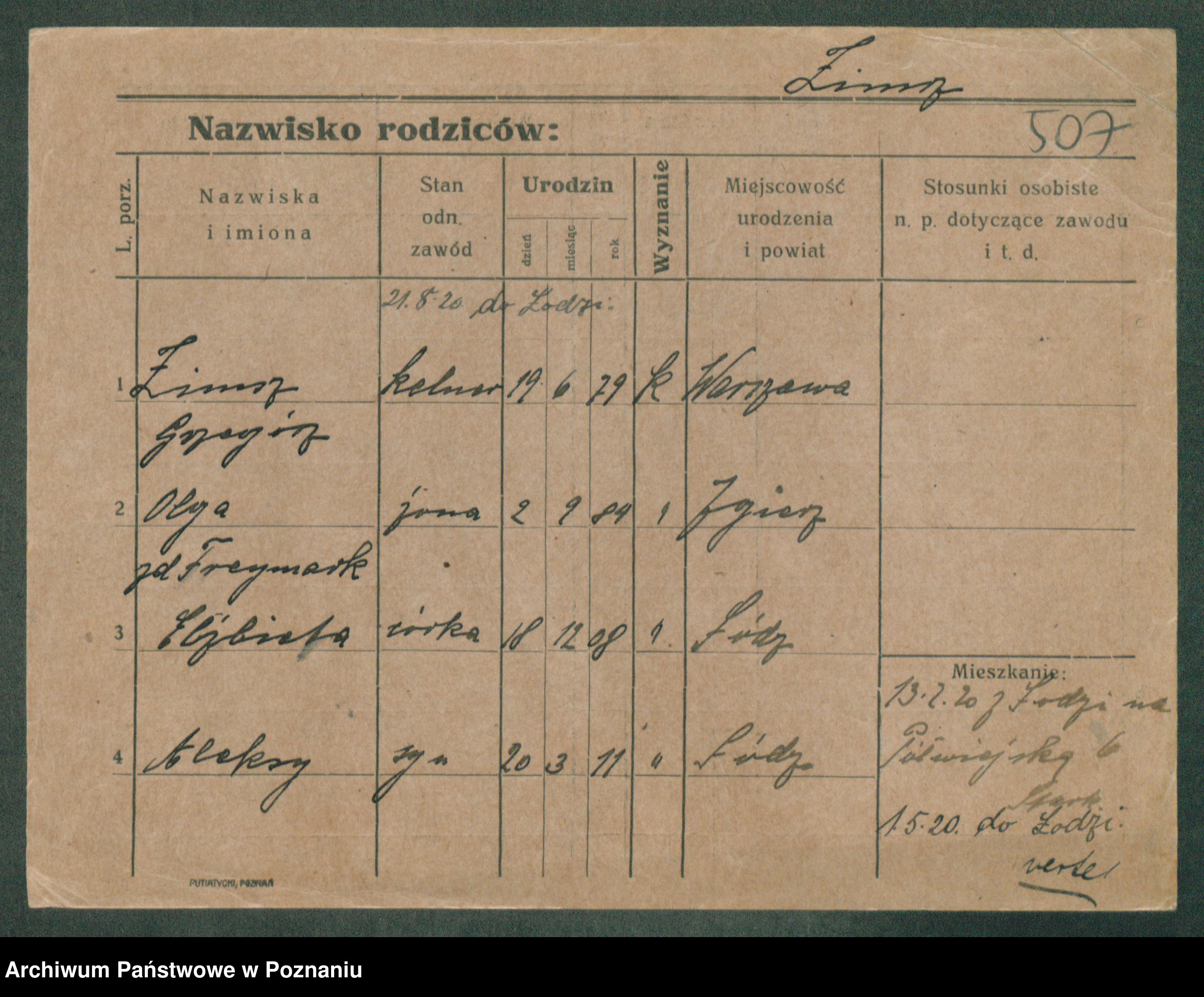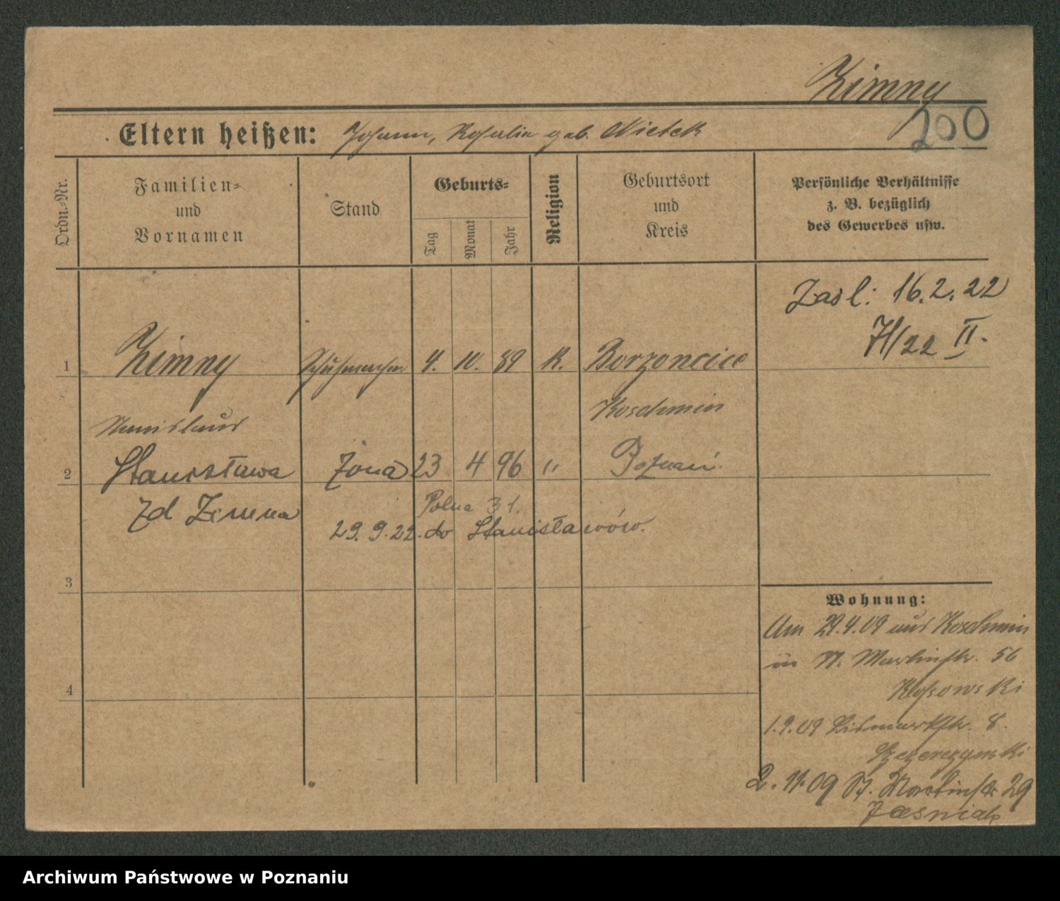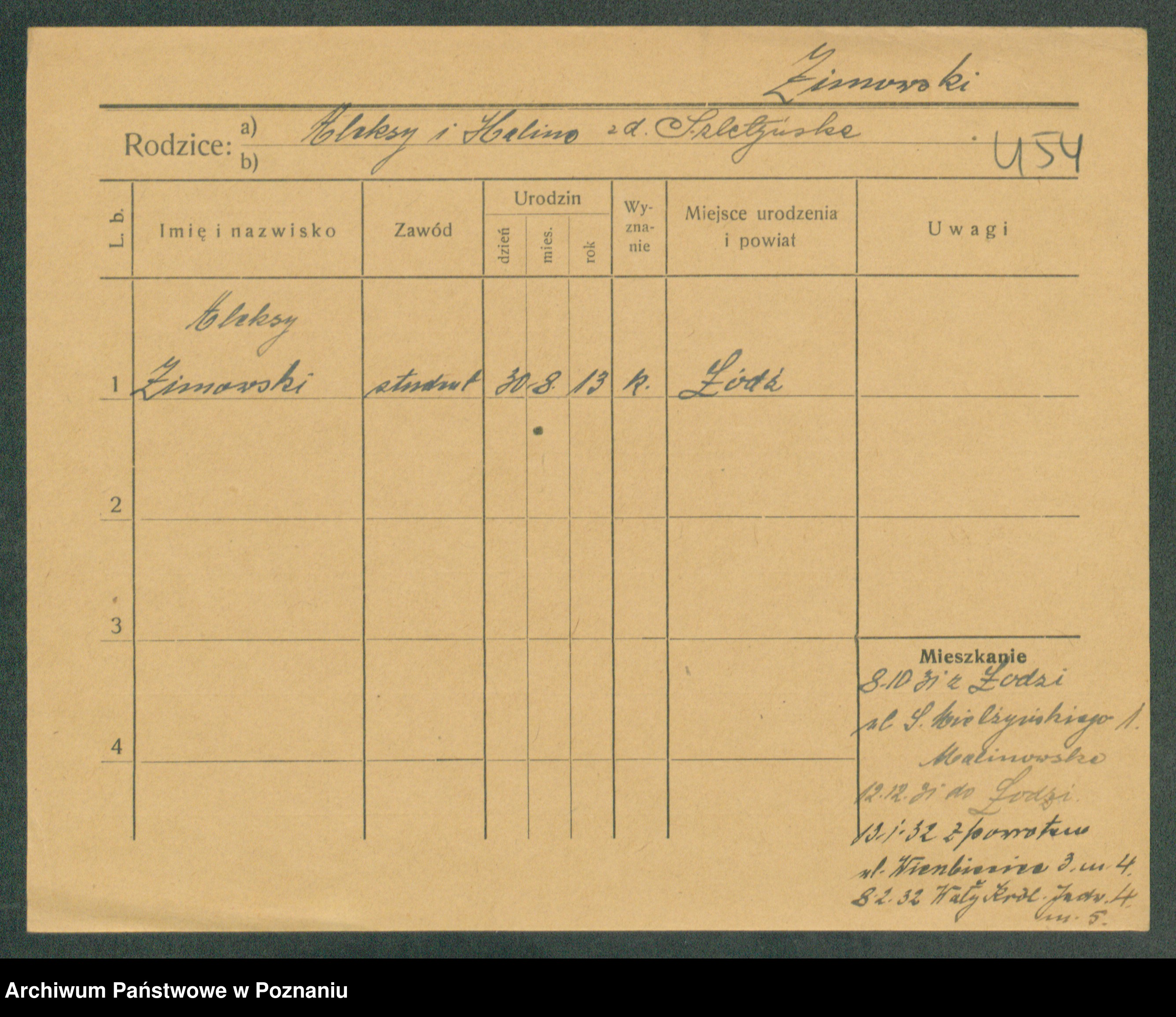 Podgląd karty osobowej dostępny jest po kliknięciu na nazwisko lub ikonkę karty. Można dokonywać powiększenia (ikony na górze) lub przechodzić między kolejnymi skanami (strzałki po bokach).