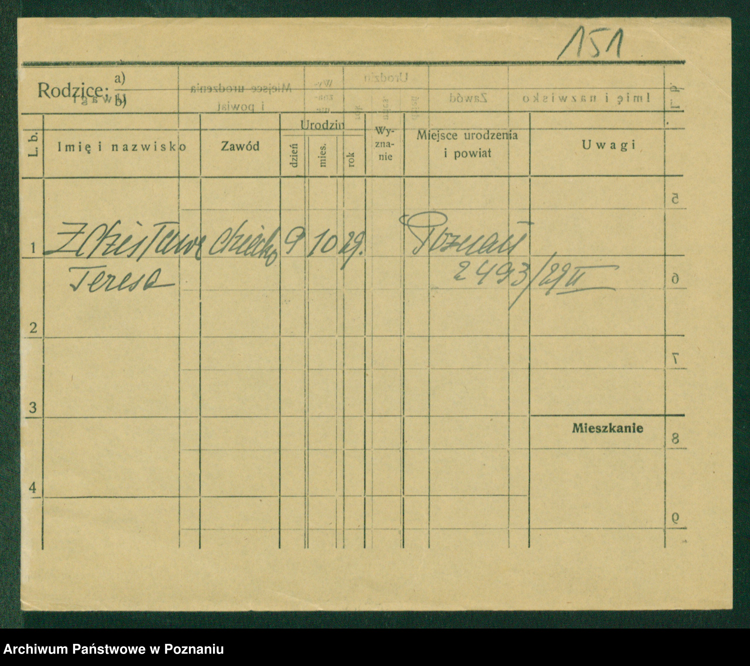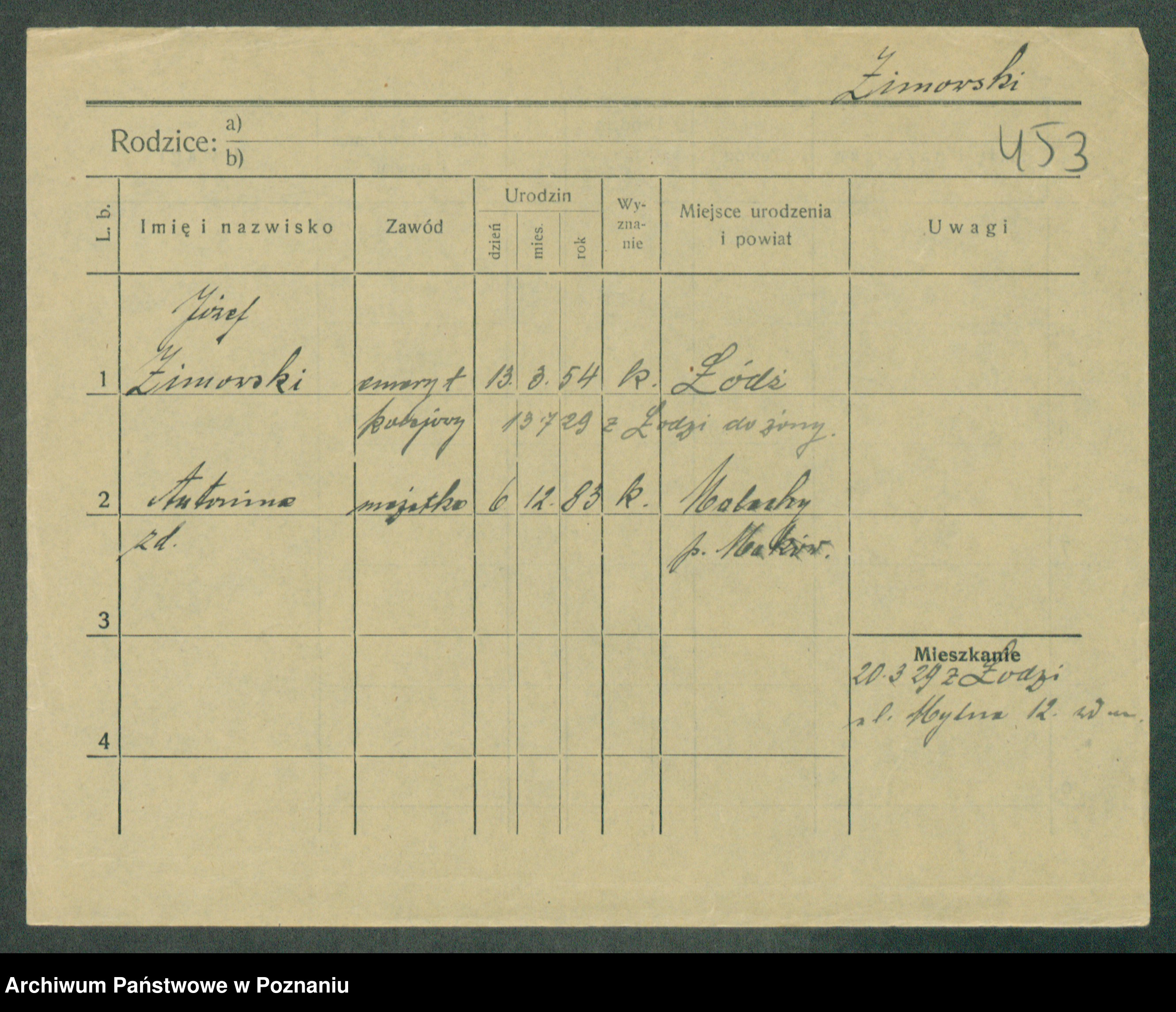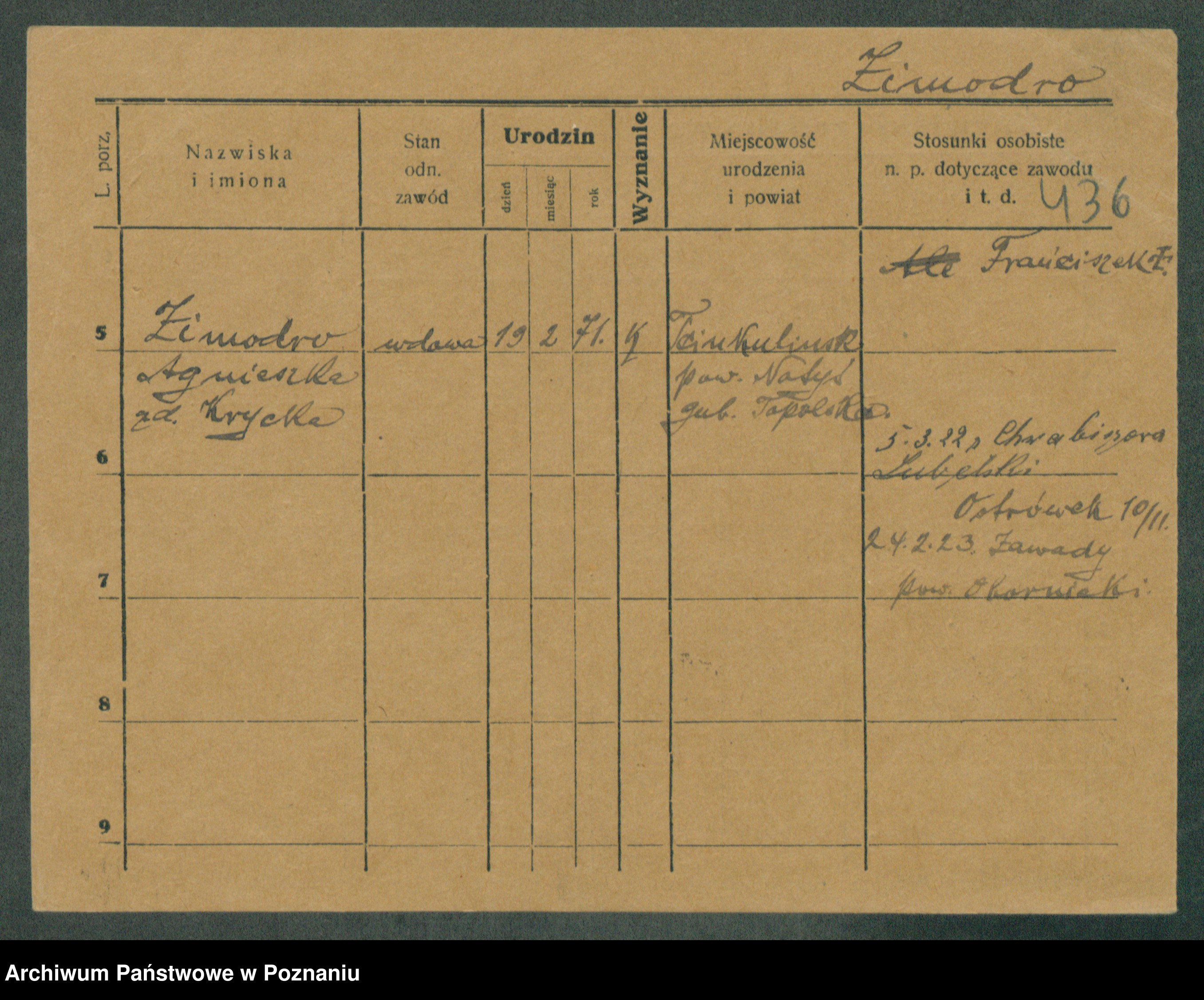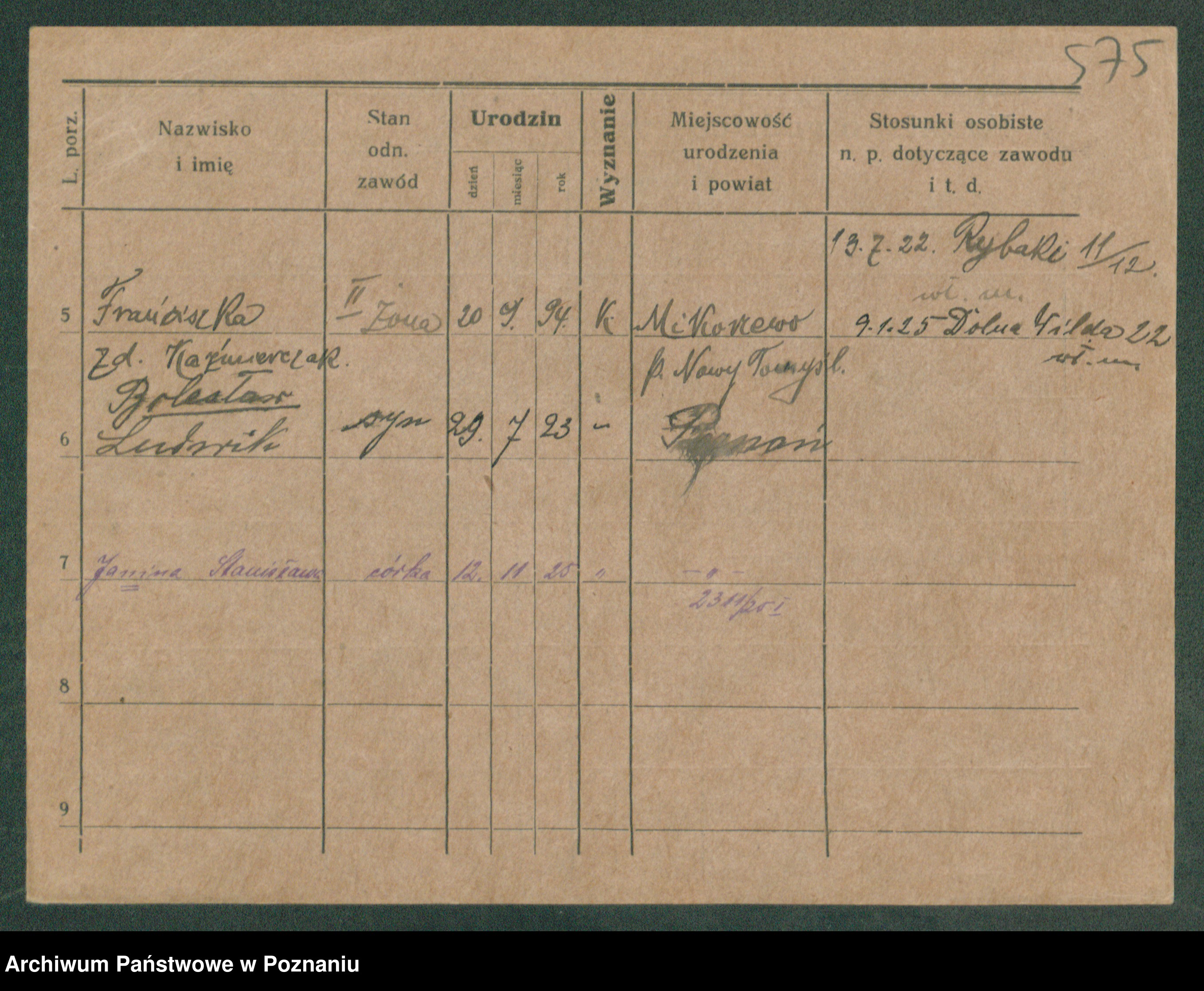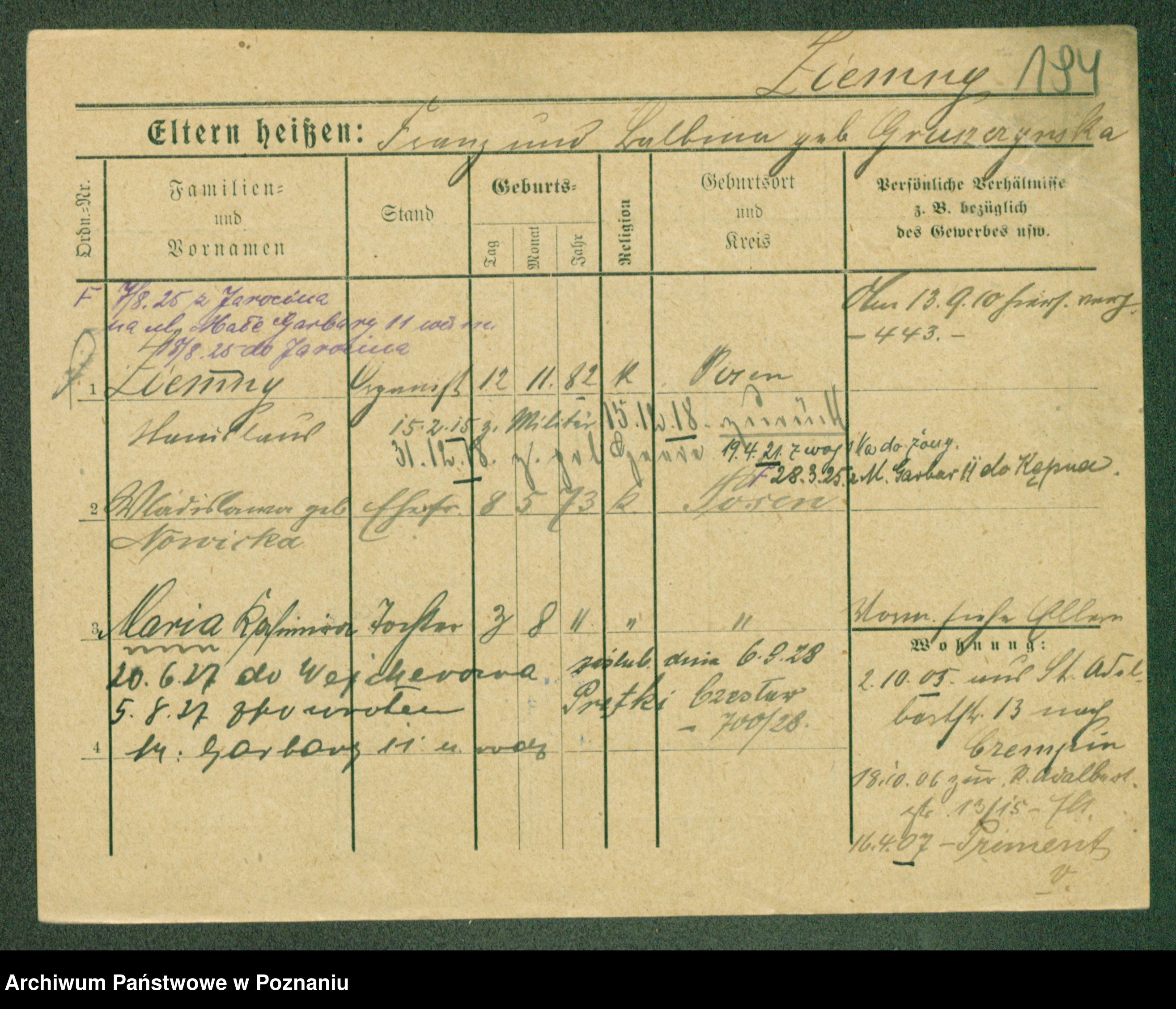 Podgląd karty osobowej dostępny jest po kliknięciu na nazwisko lub ikonkę karty. Można dokonywać powiększenia (ikony na górze) lub przechodzić między kolejnymi skanami (strzałki po bokach).