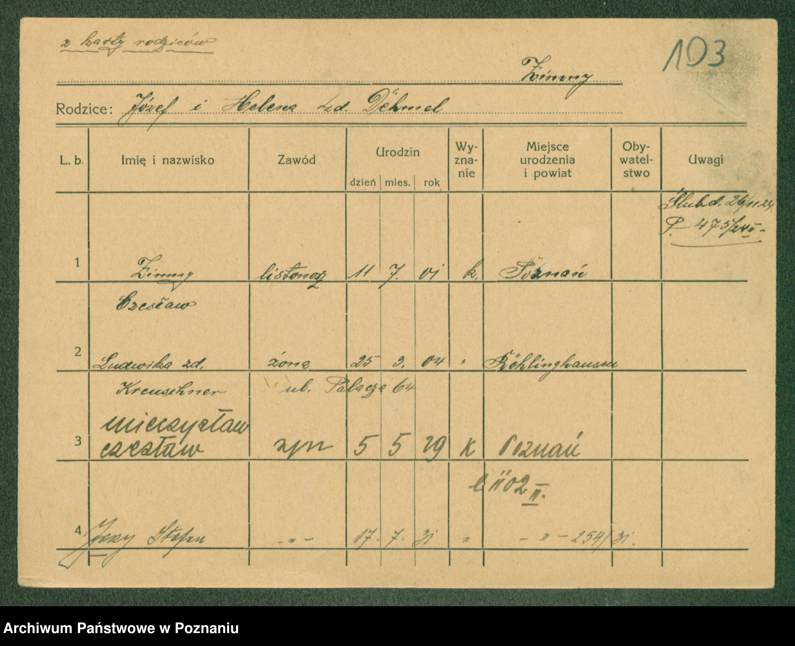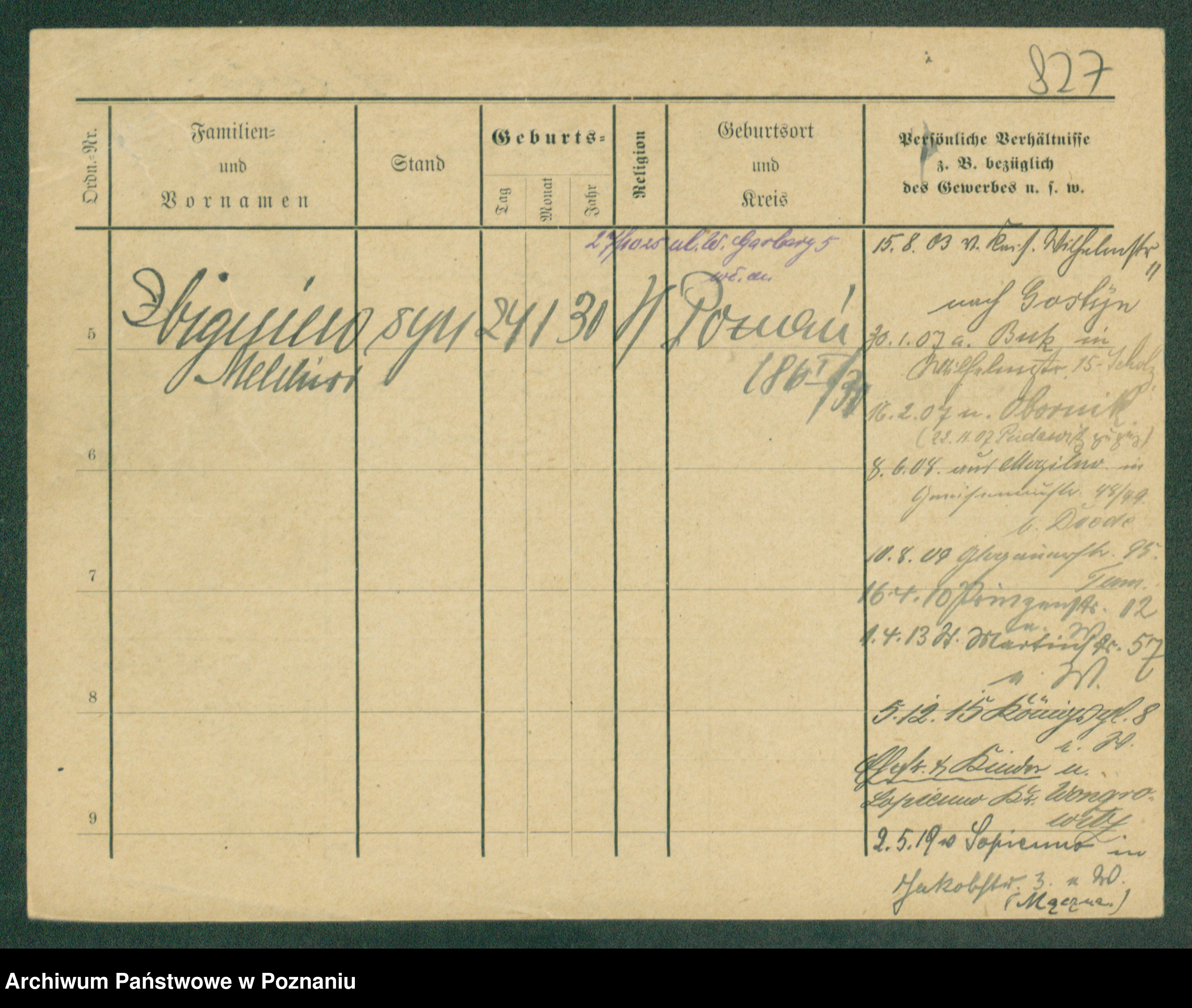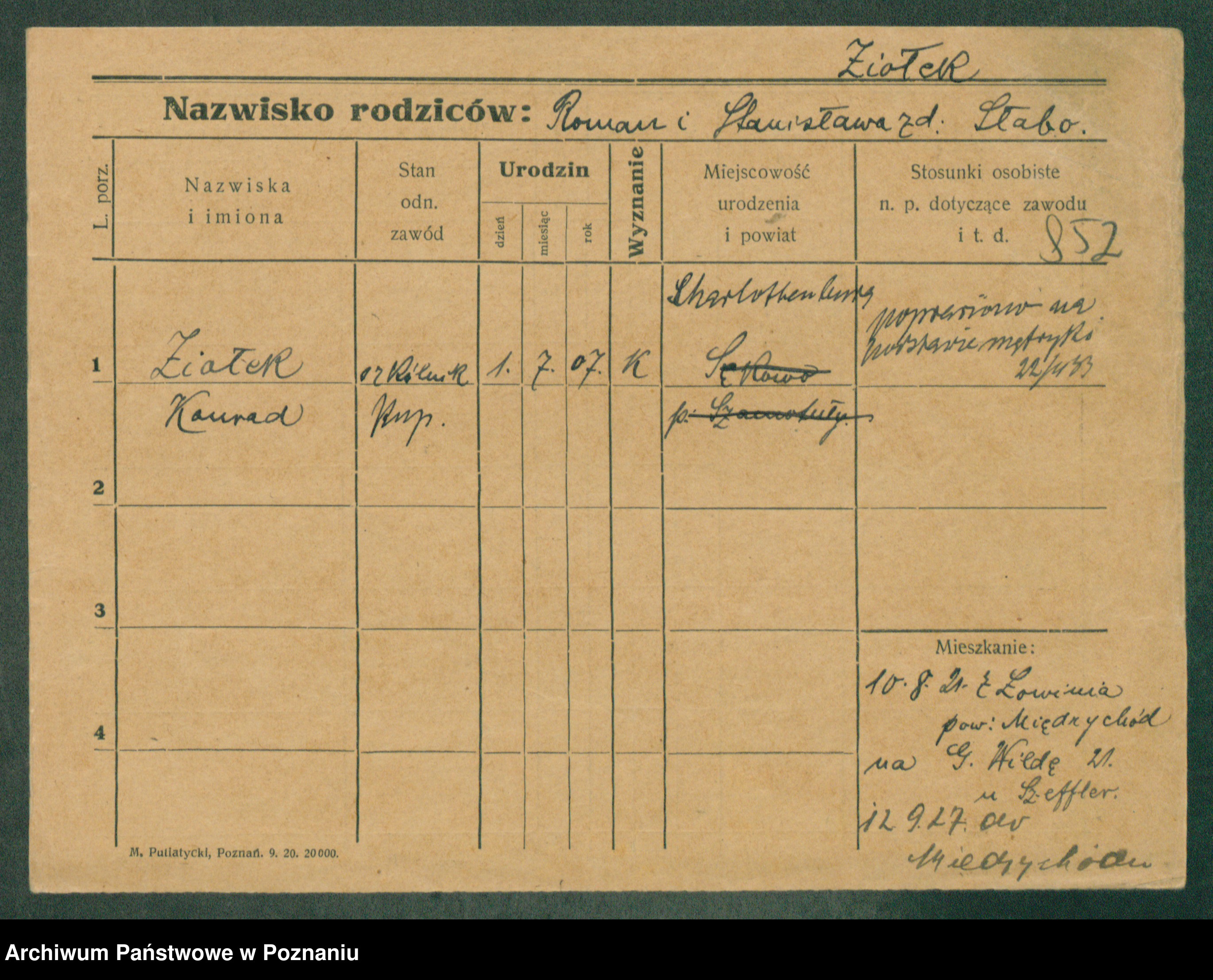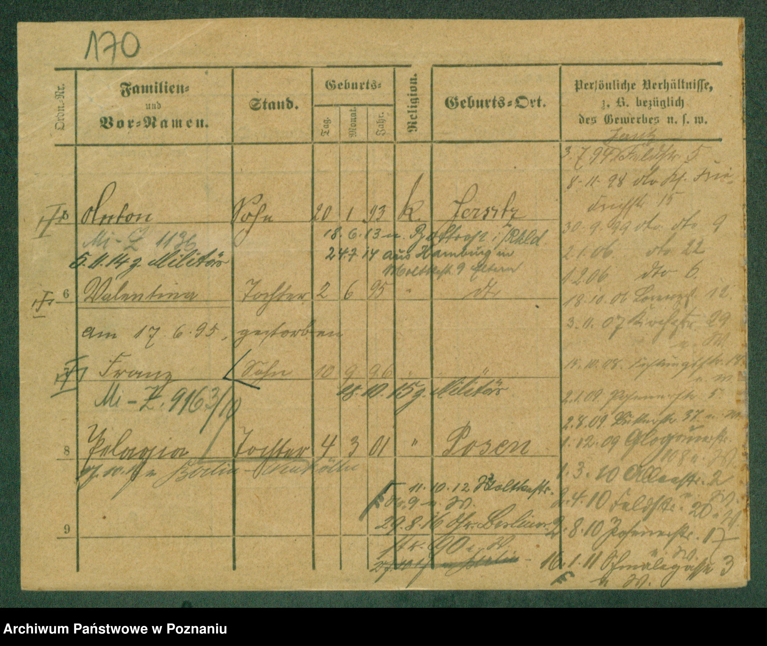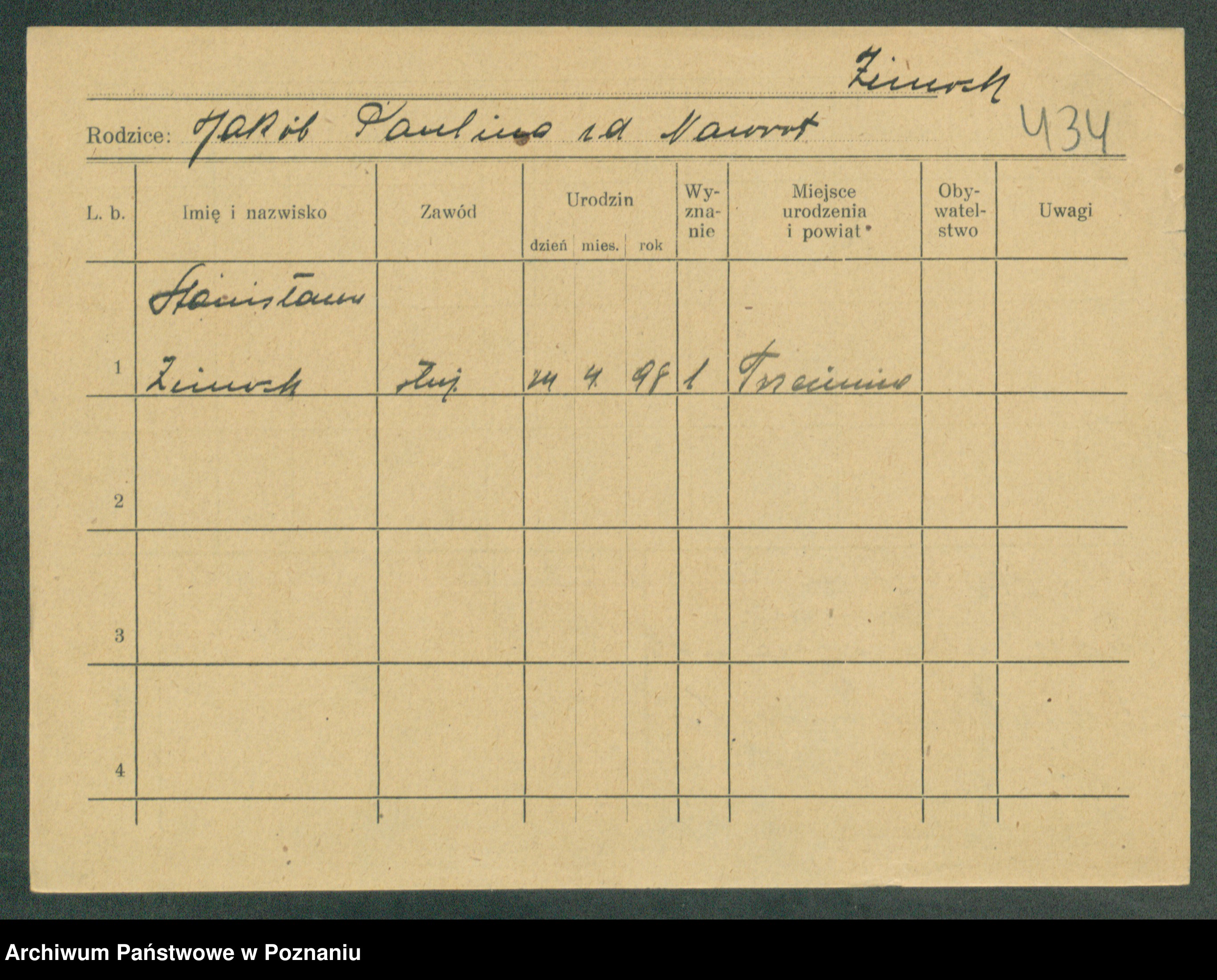Podgląd karty osobowej dostępny jest po kliknięciu na nazwisko lub ikonkę karty. Można dokonywać powiększenia (ikony na górze) lub przechodzić między kolejnymi skanami (strzałki po bokach).