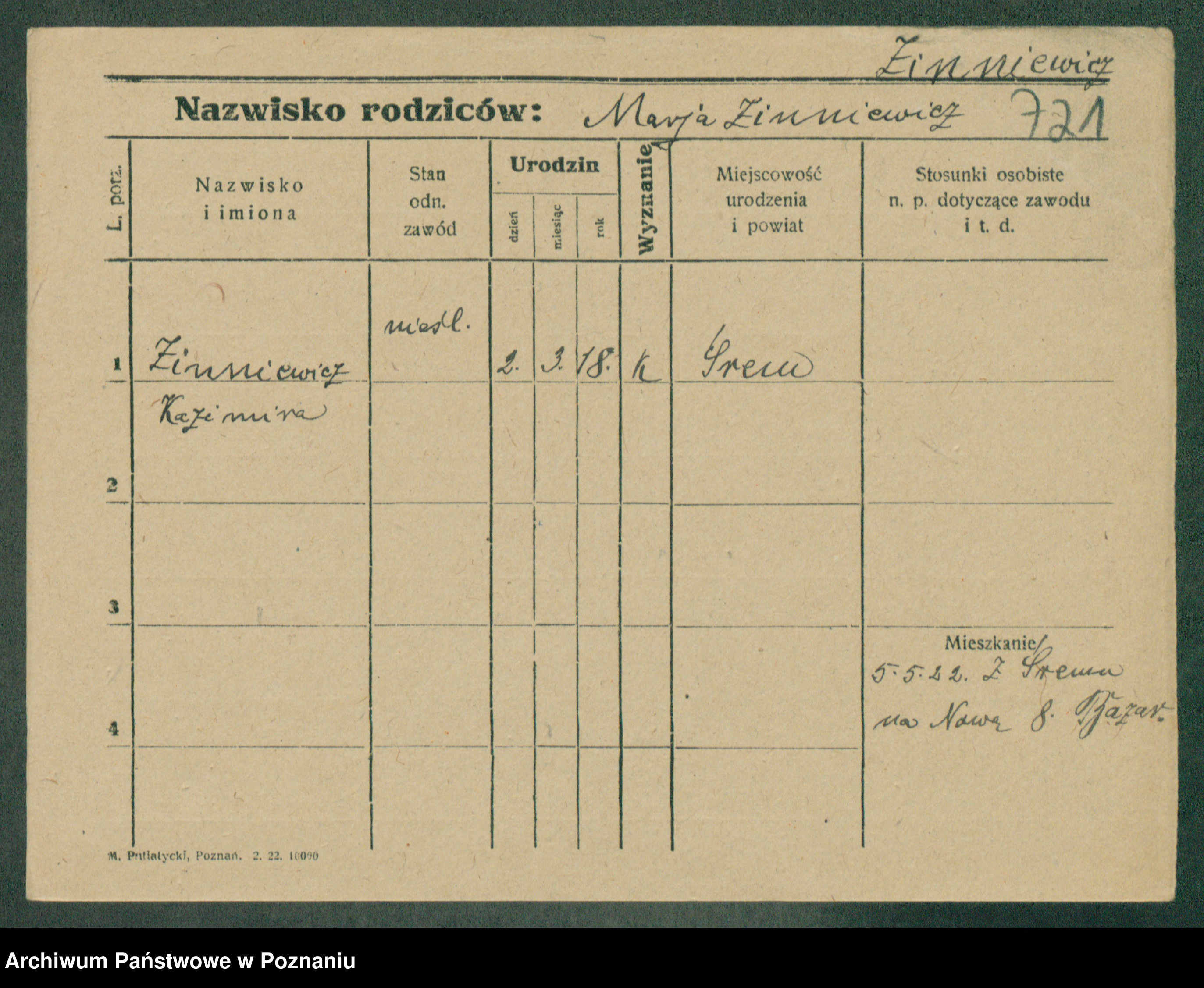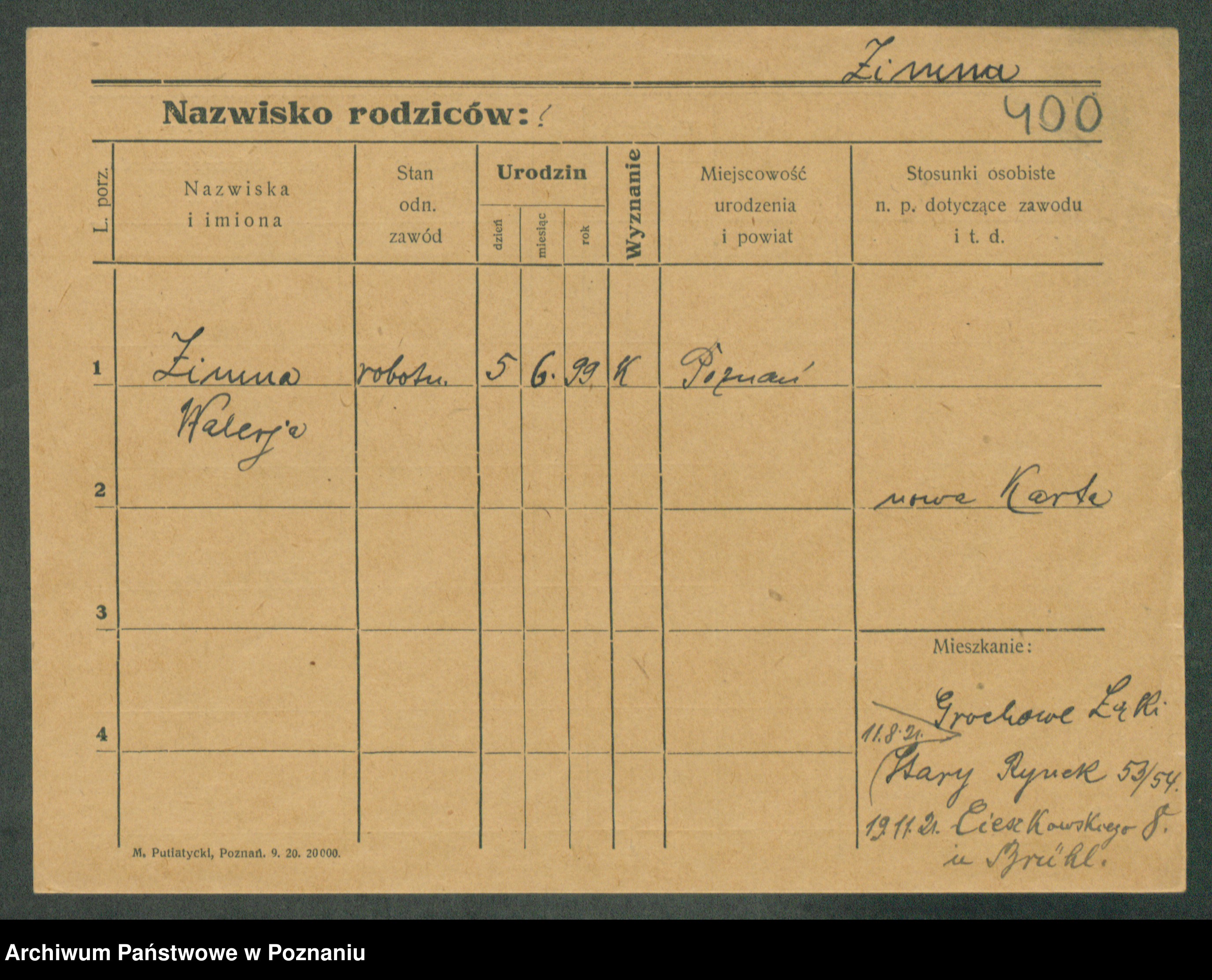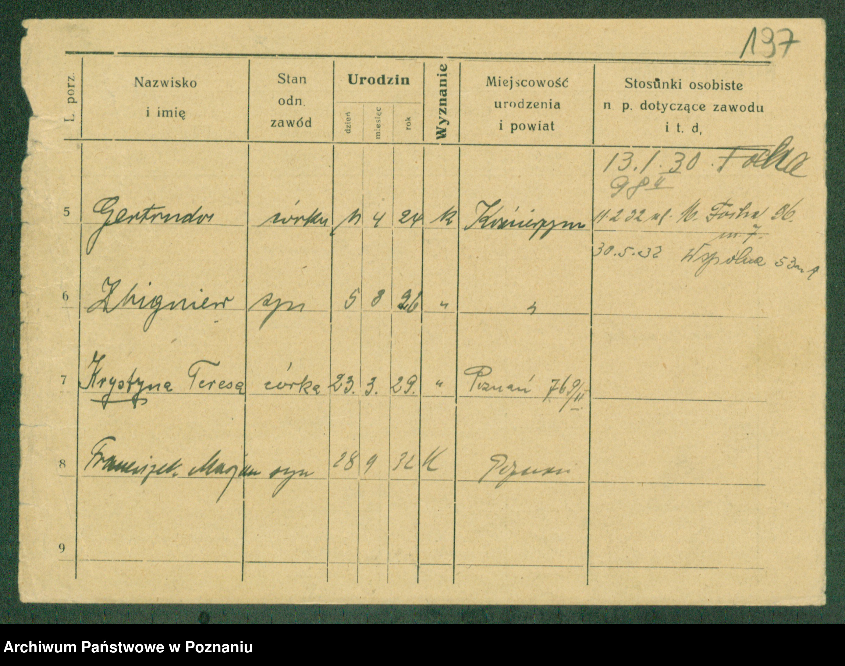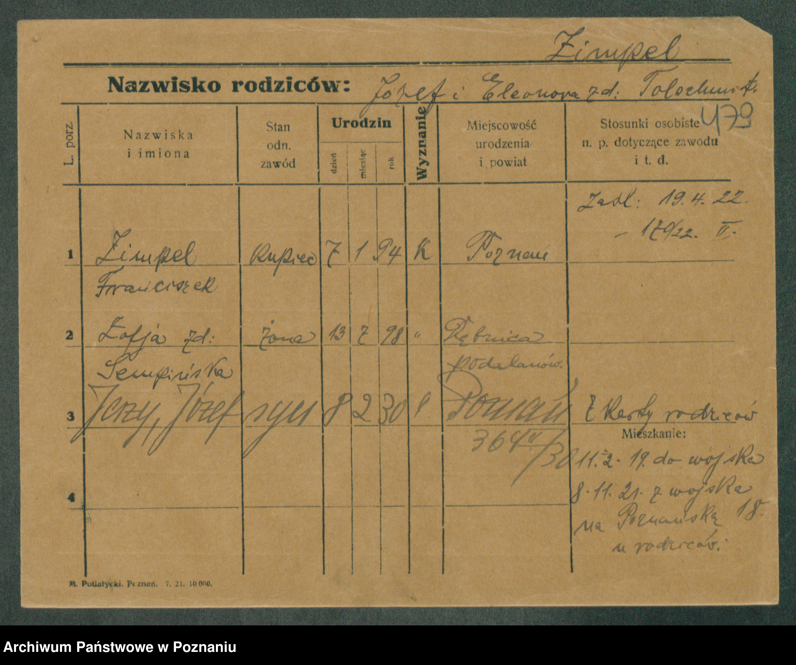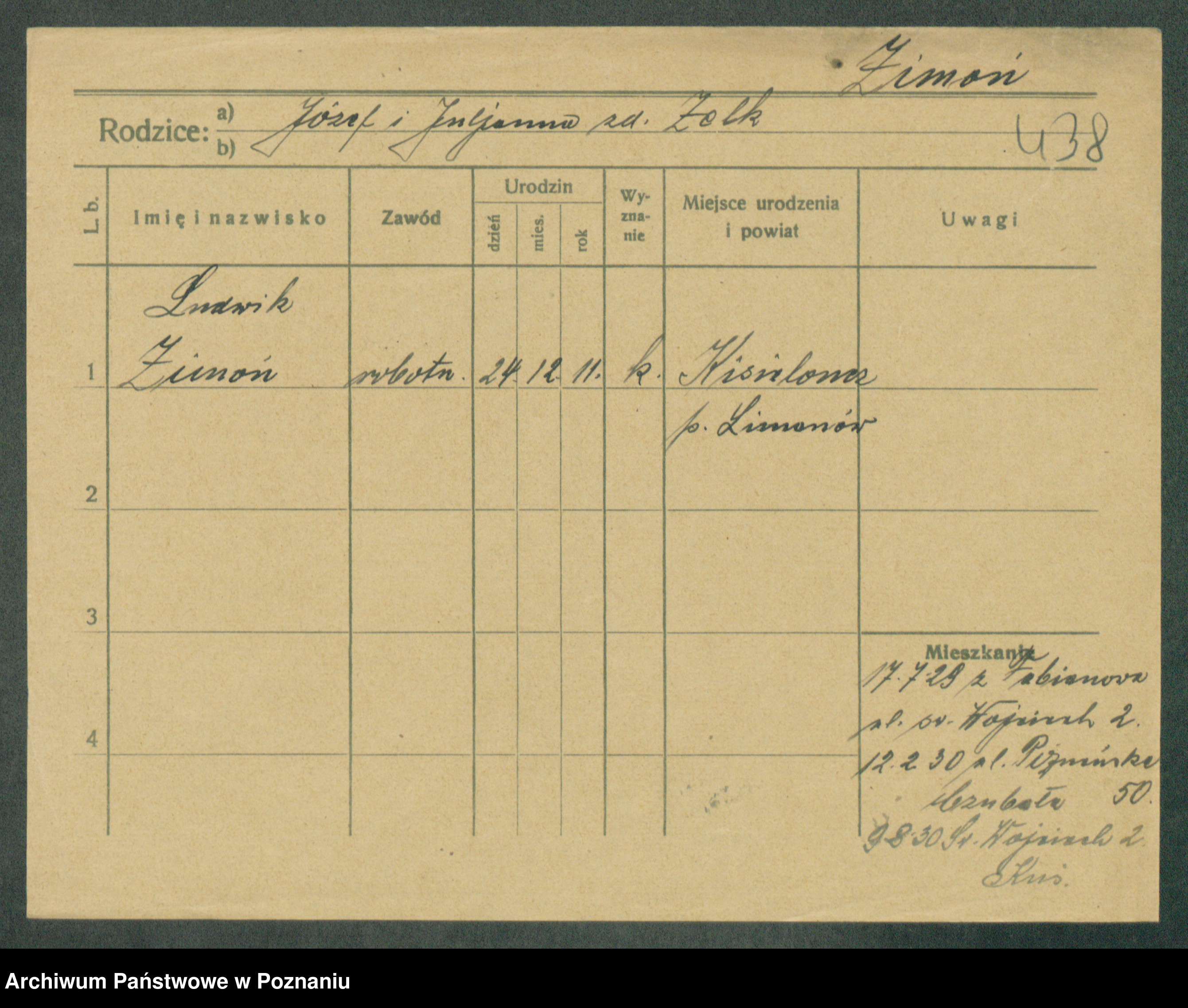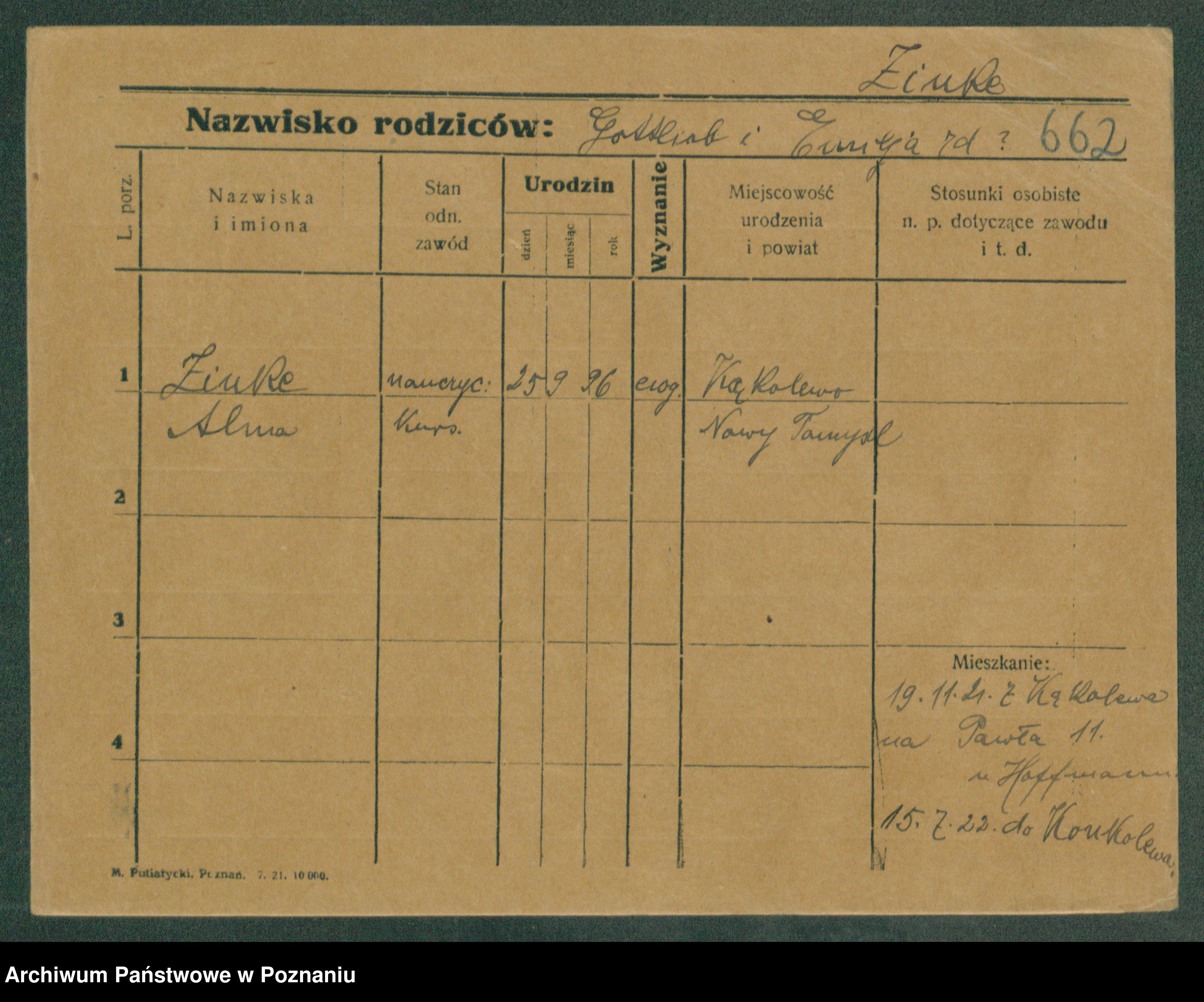 Podgląd karty osobowej dostępny jest po kliknięciu na nazwisko lub ikonkę karty. Można dokonywać powiększenia (ikony na górze) lub przechodzić między kolejnymi skanami (strzałki po bokach).