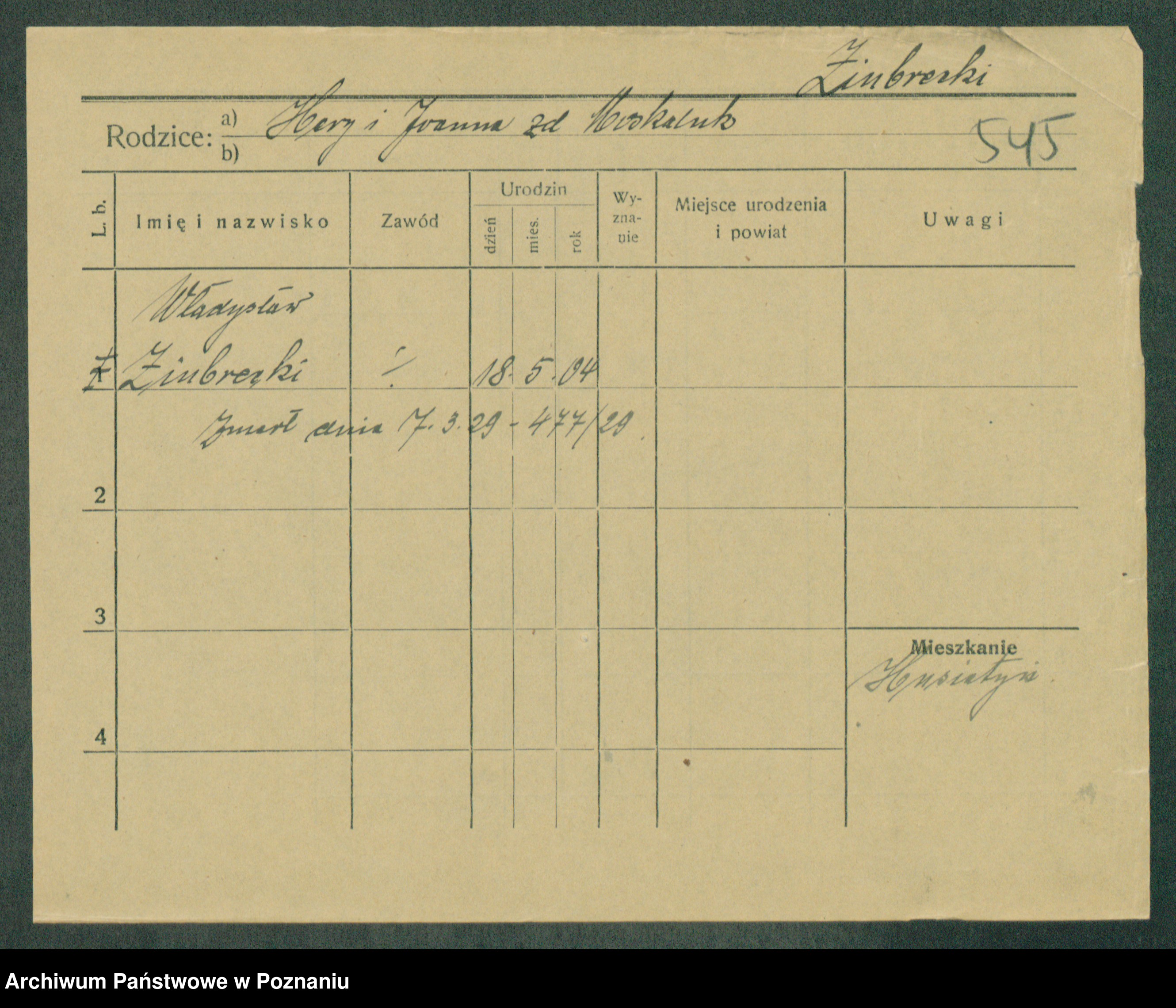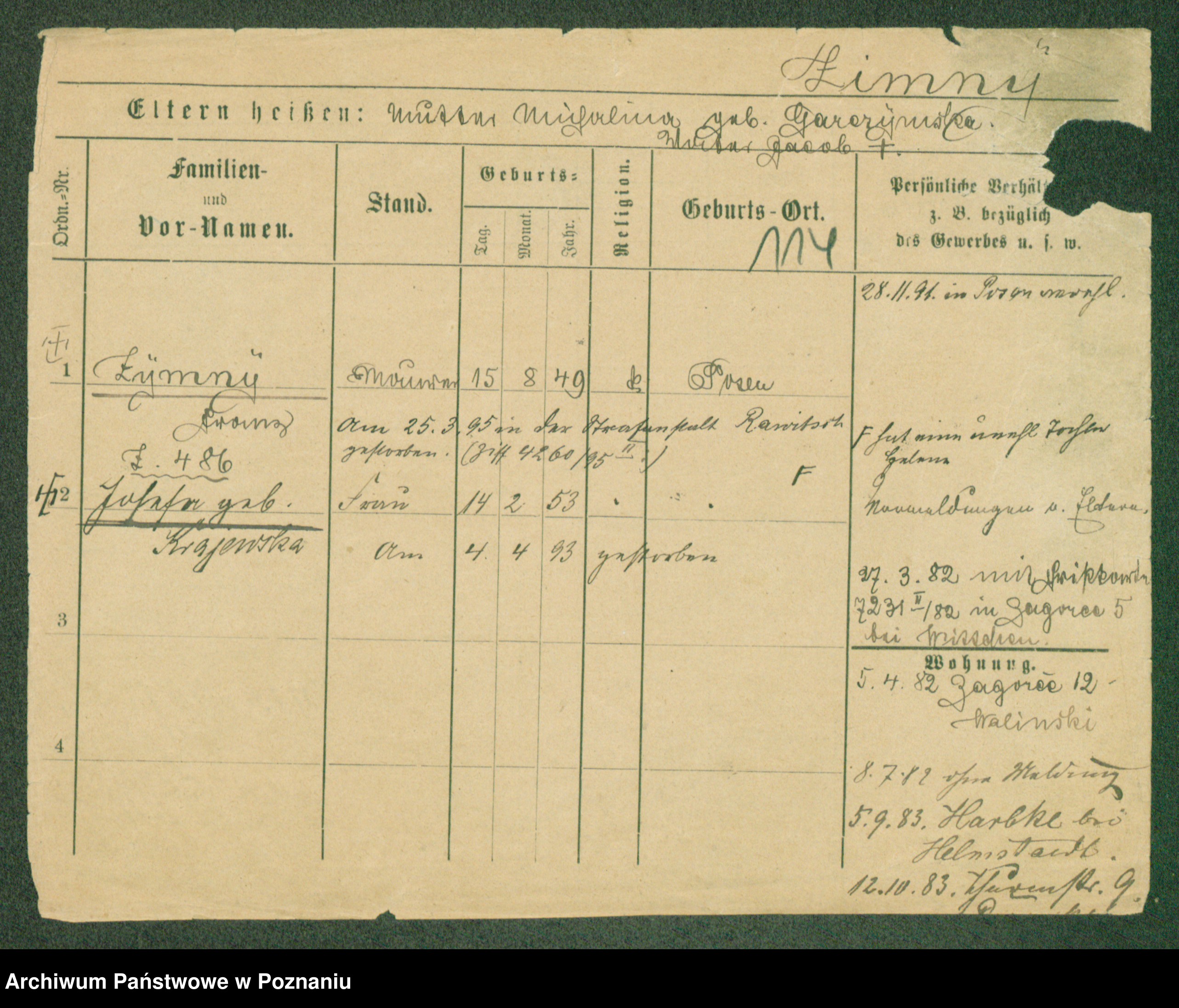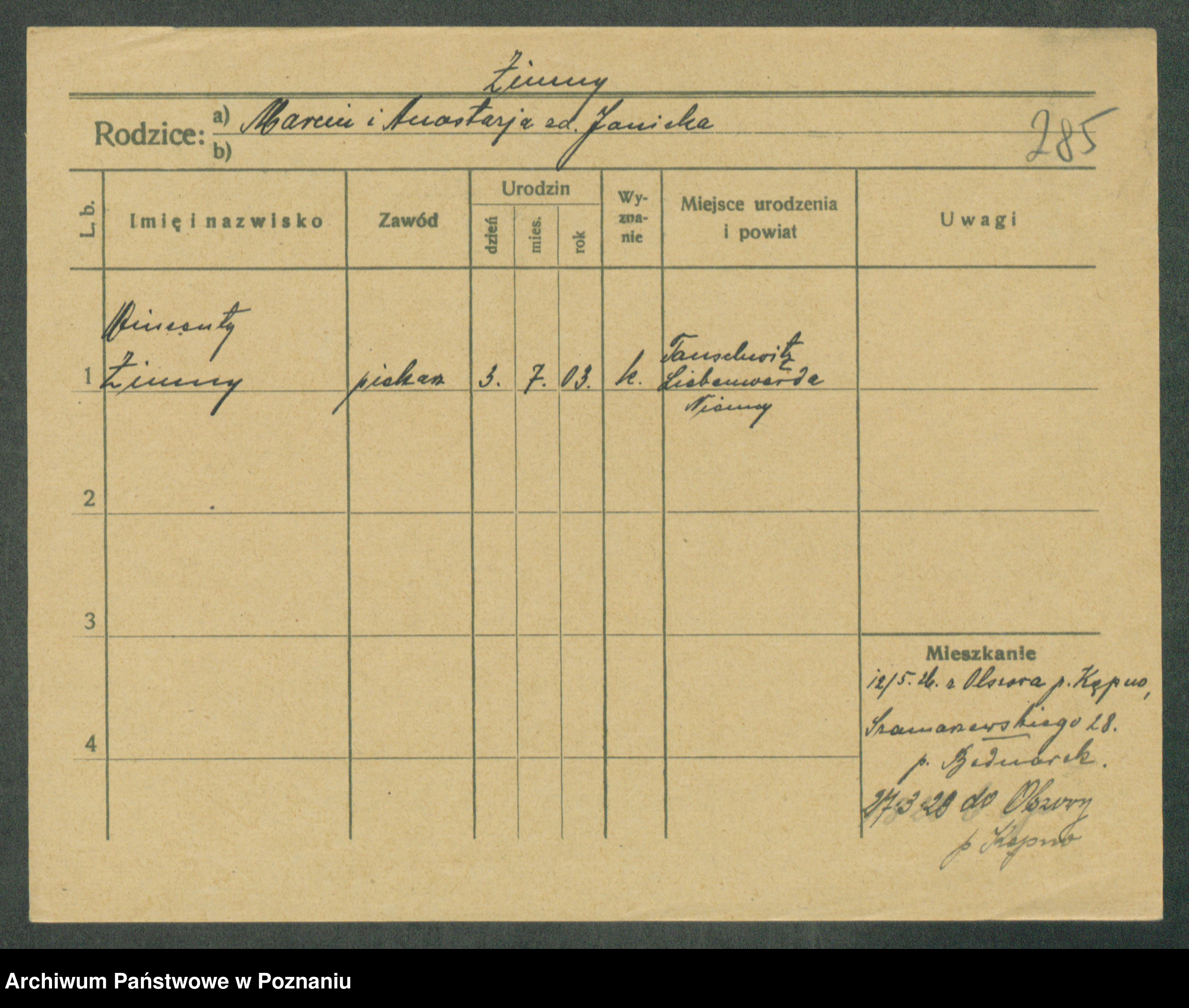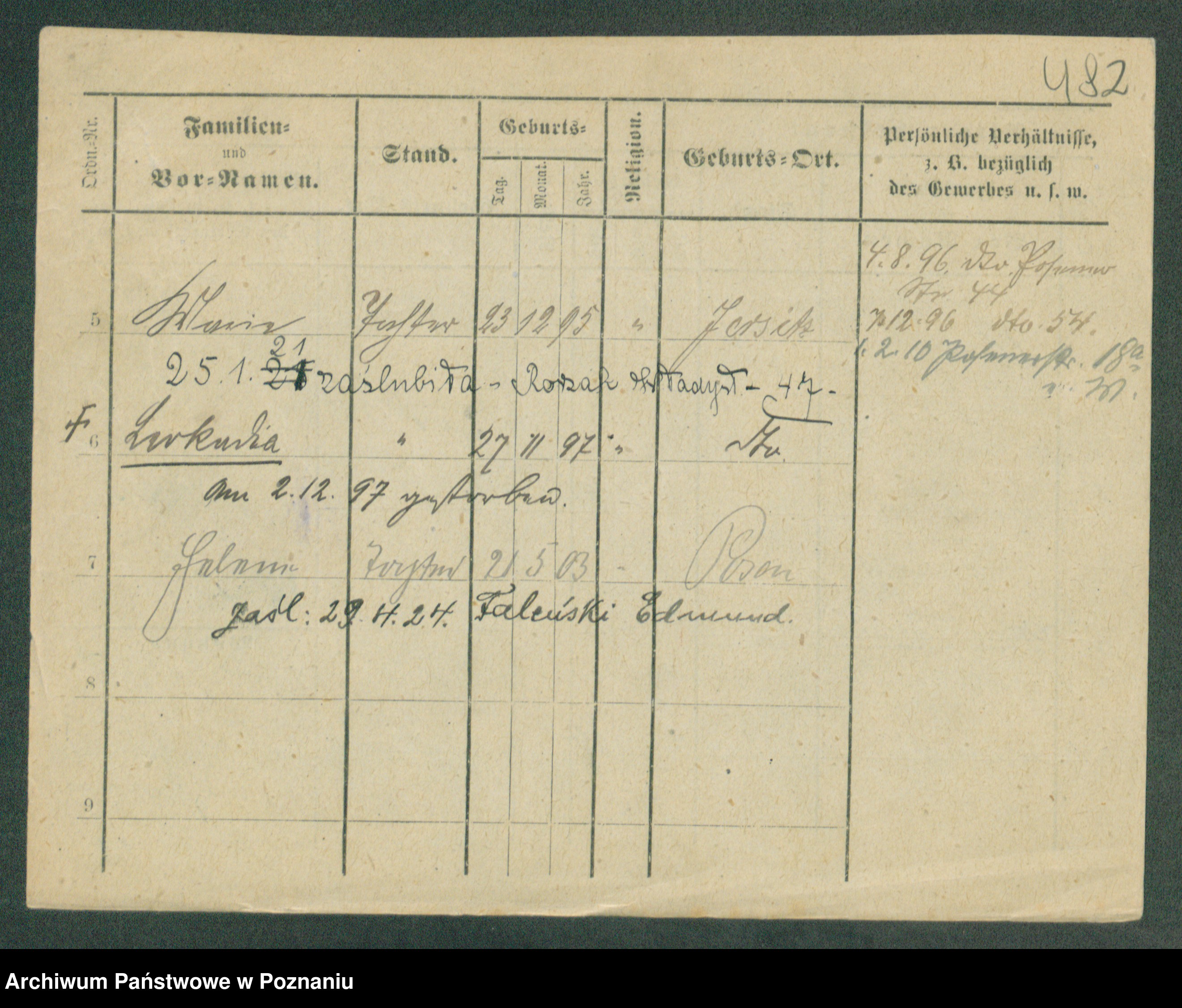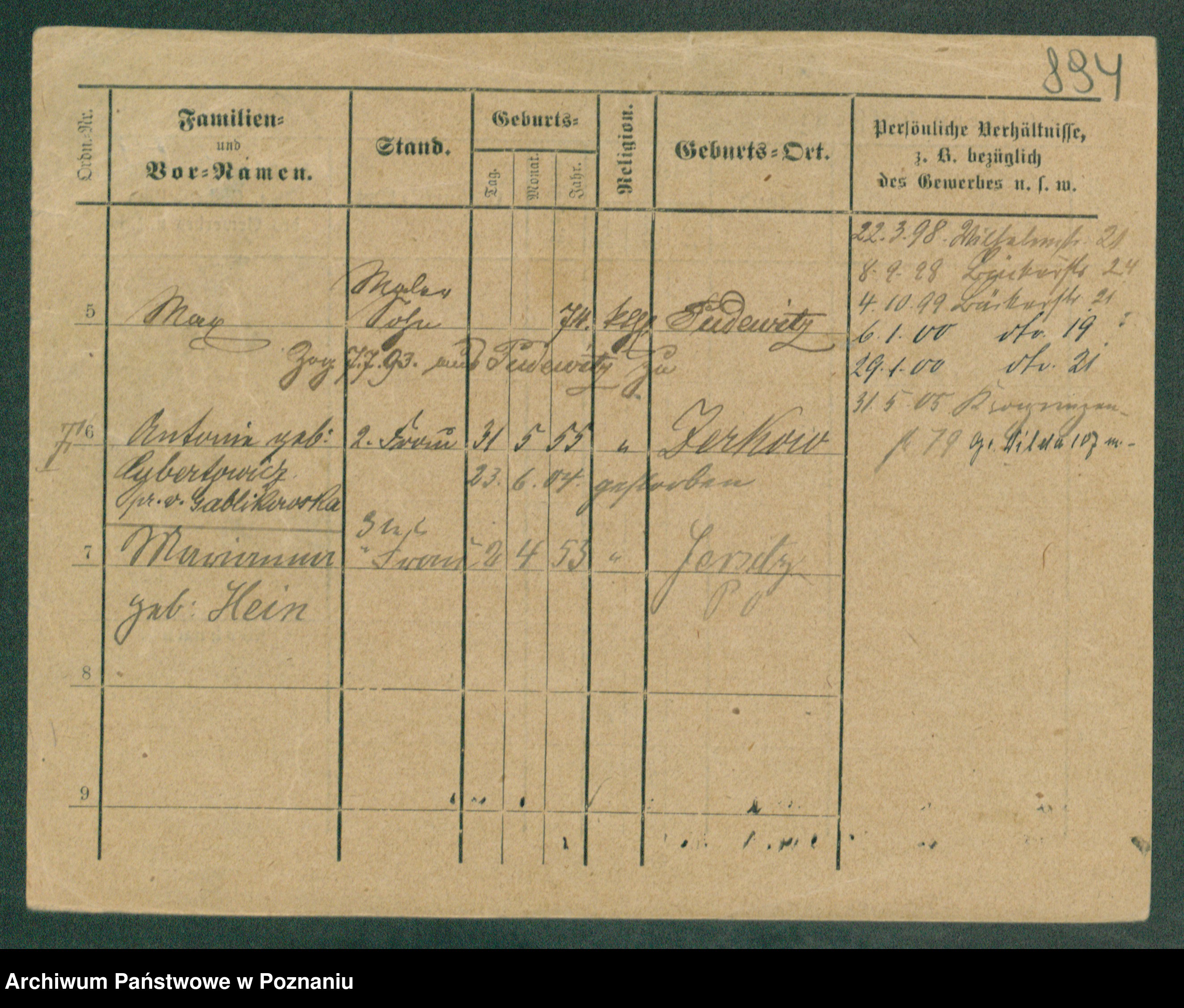 Podgląd karty osobowej dostępny jest po kliknięciu na nazwisko lub ikonkę karty. Można dokonywać powiększenia (ikony na górze) lub przechodzić między kolejnymi skanami (strzałki po bokach).