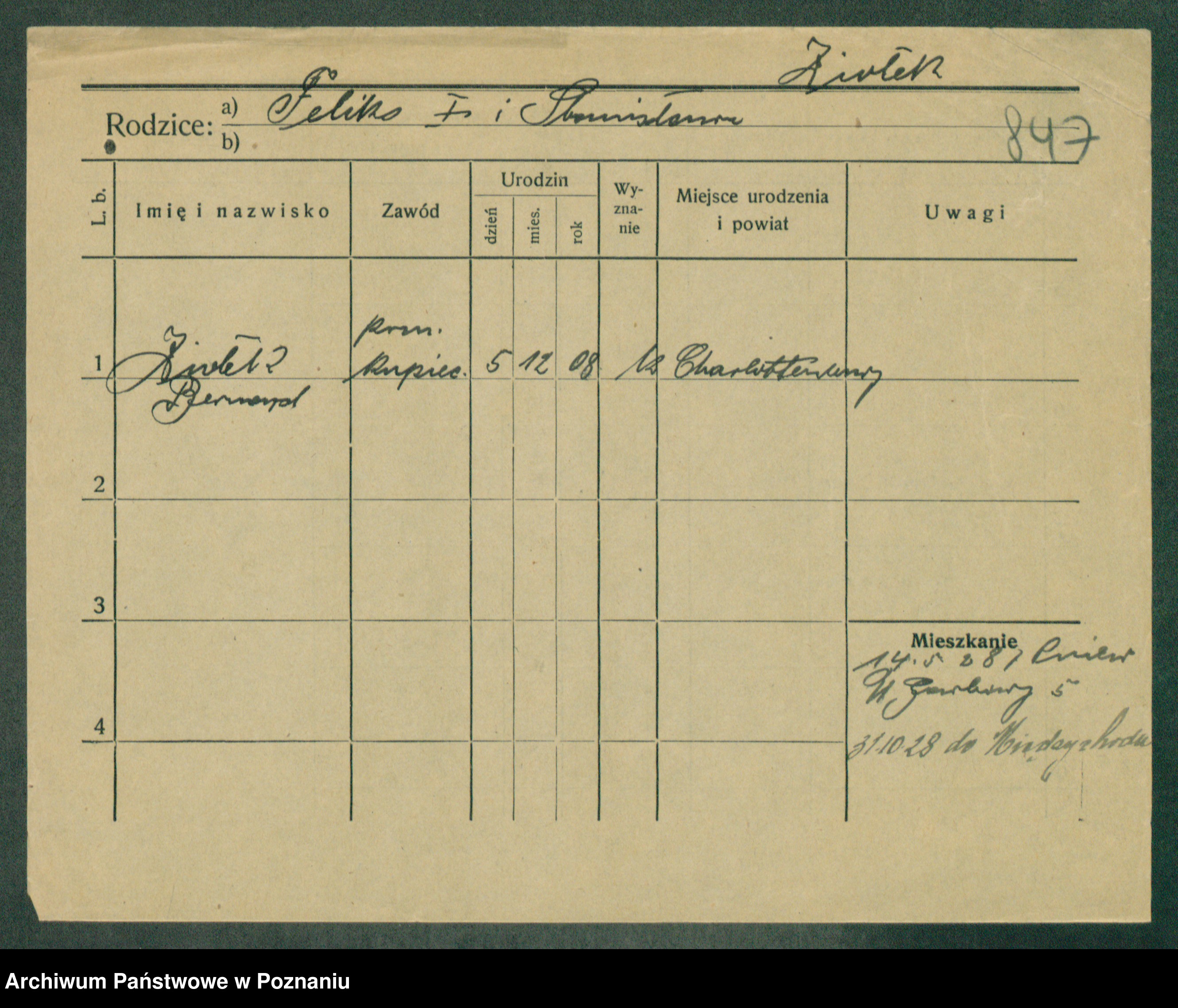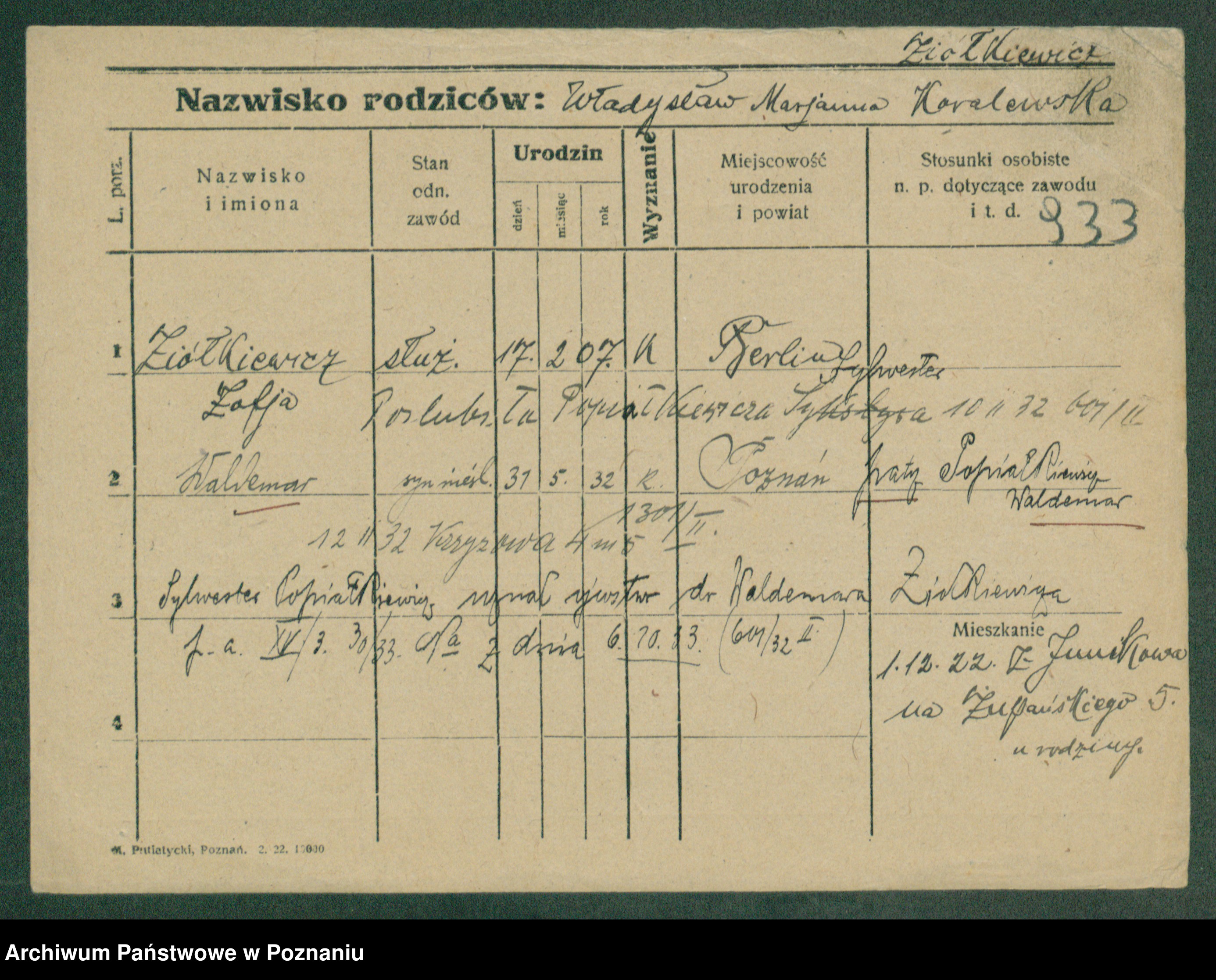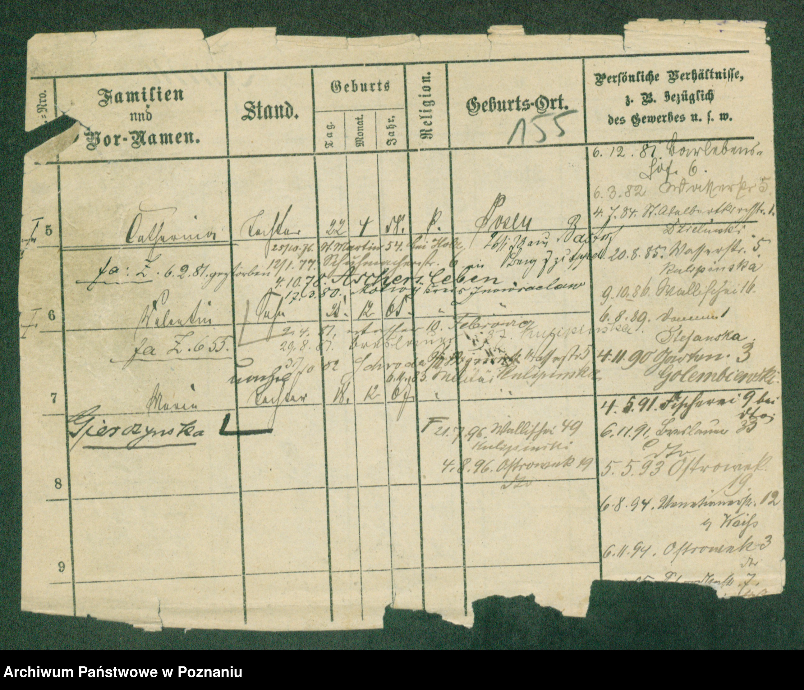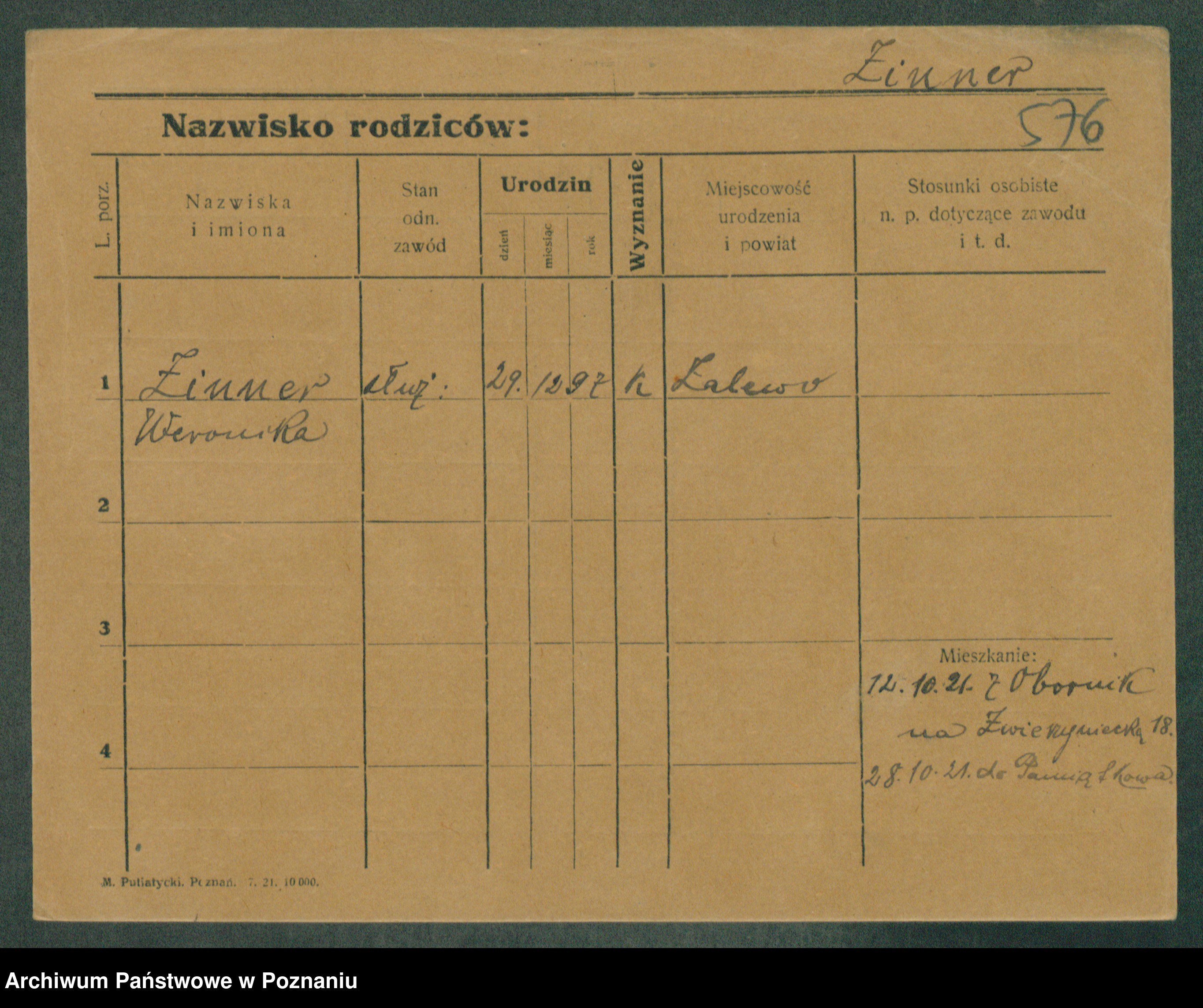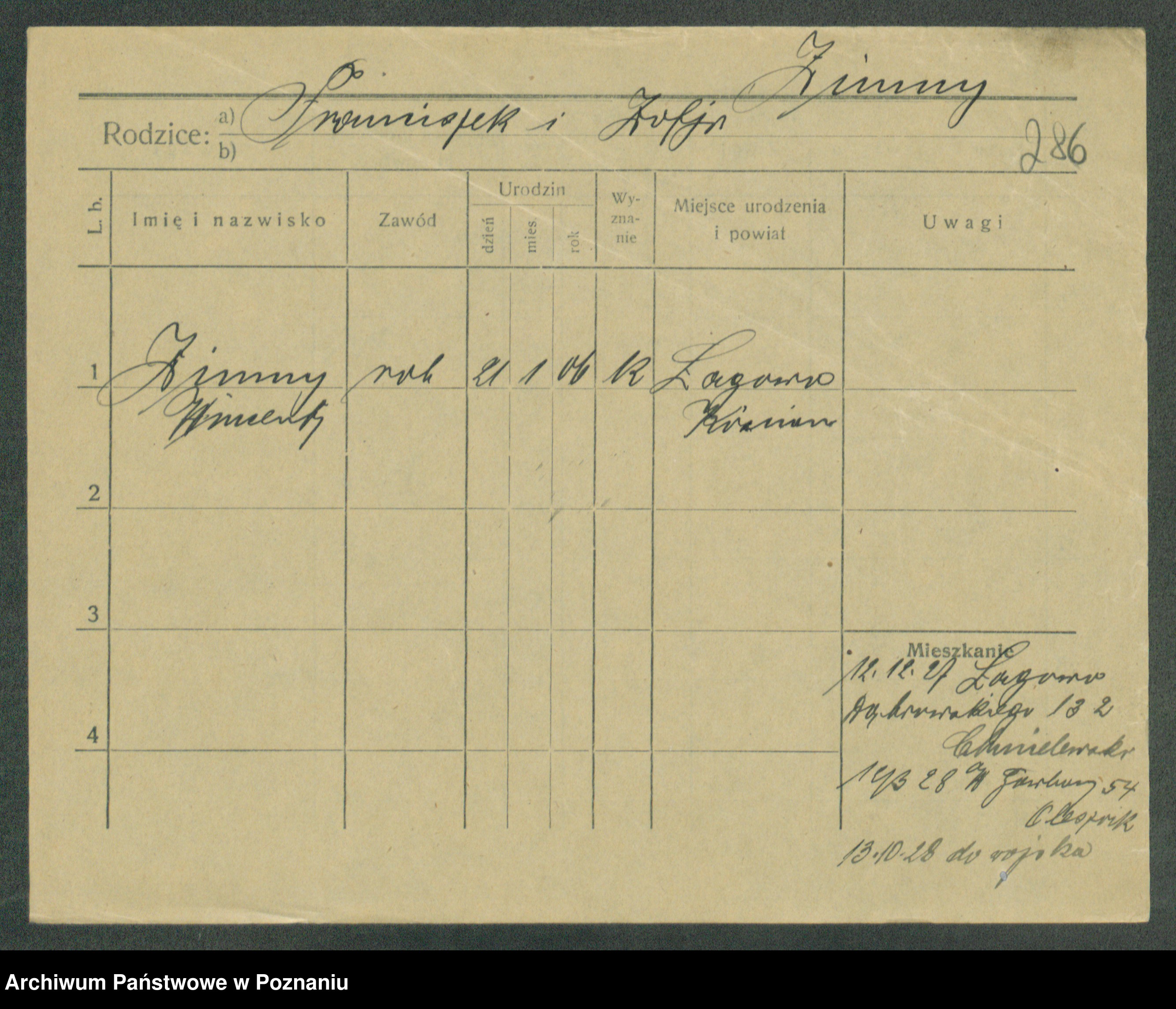 Podgląd karty osobowej dostępny jest po kliknięciu na nazwisko lub ikonkę karty. Można dokonywać powiększenia (ikony na górze) lub przechodzić między kolejnymi skanami (strzałki po bokach).