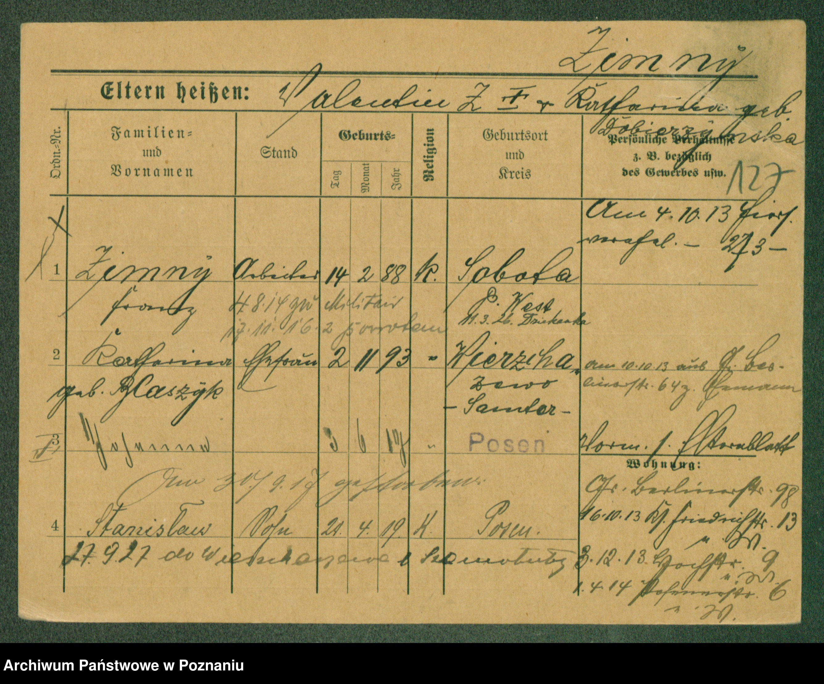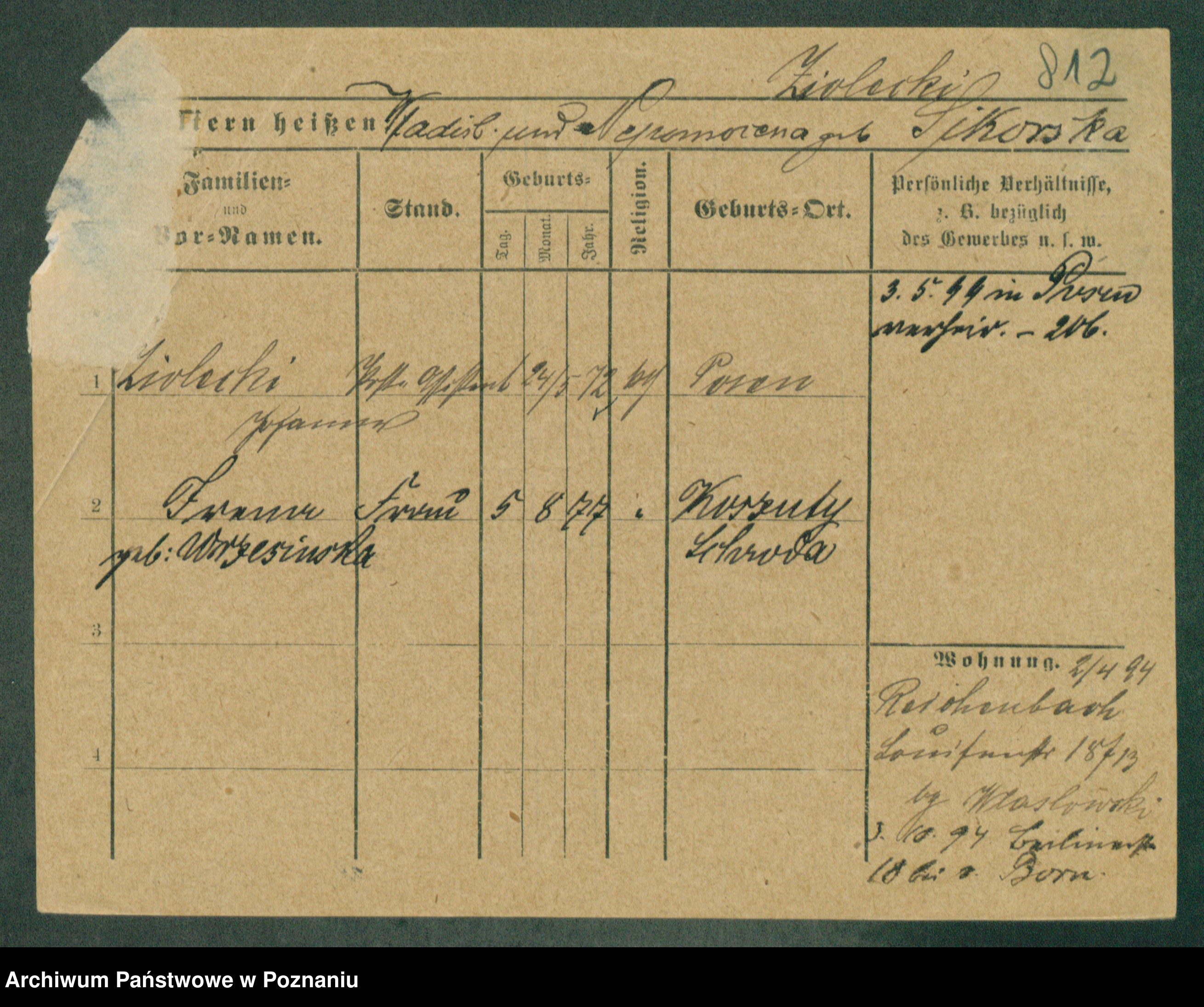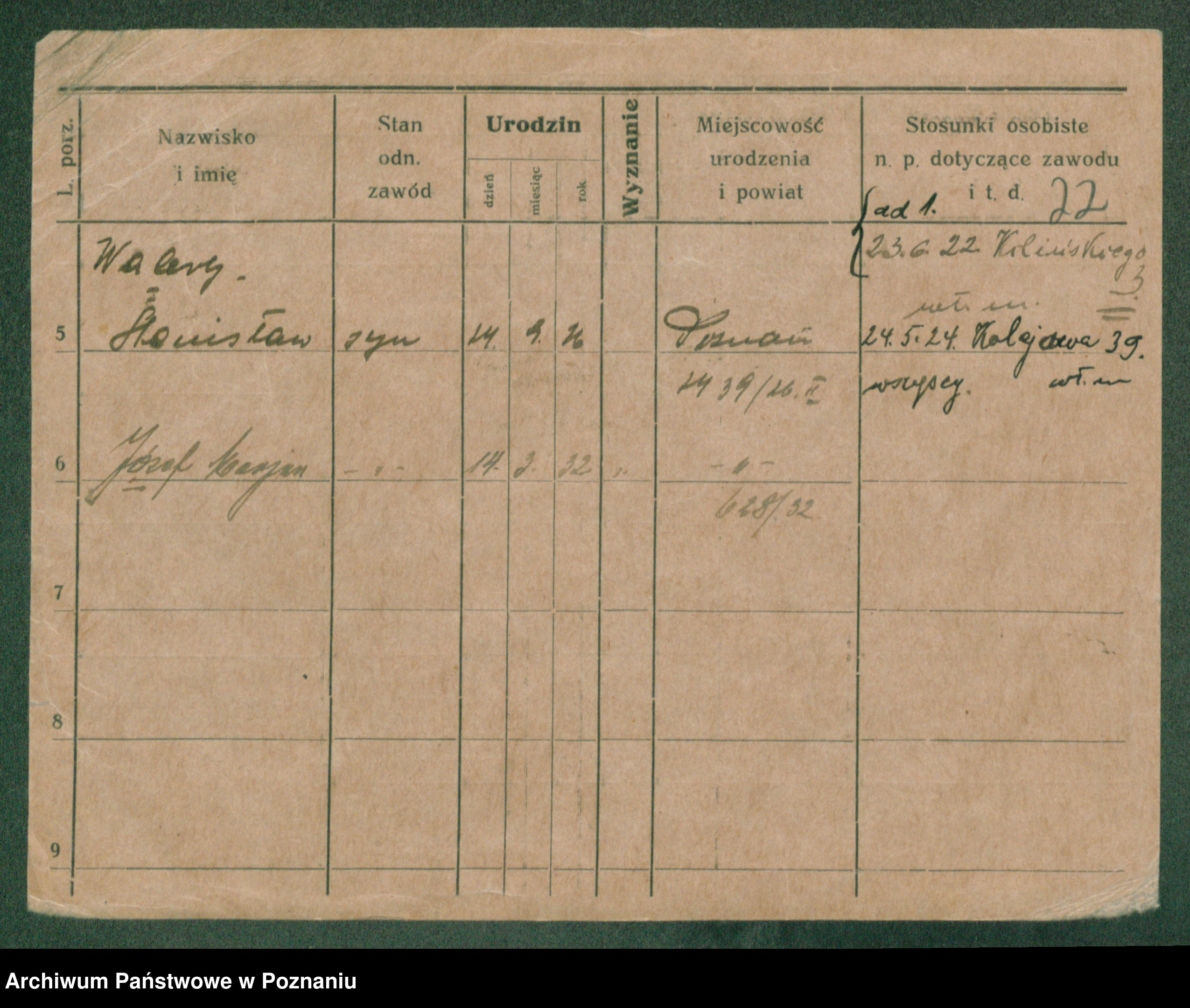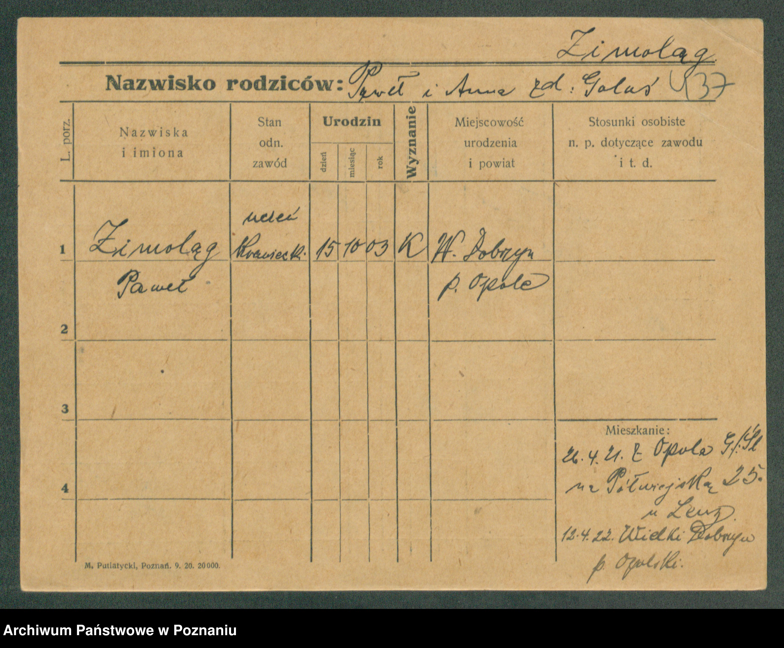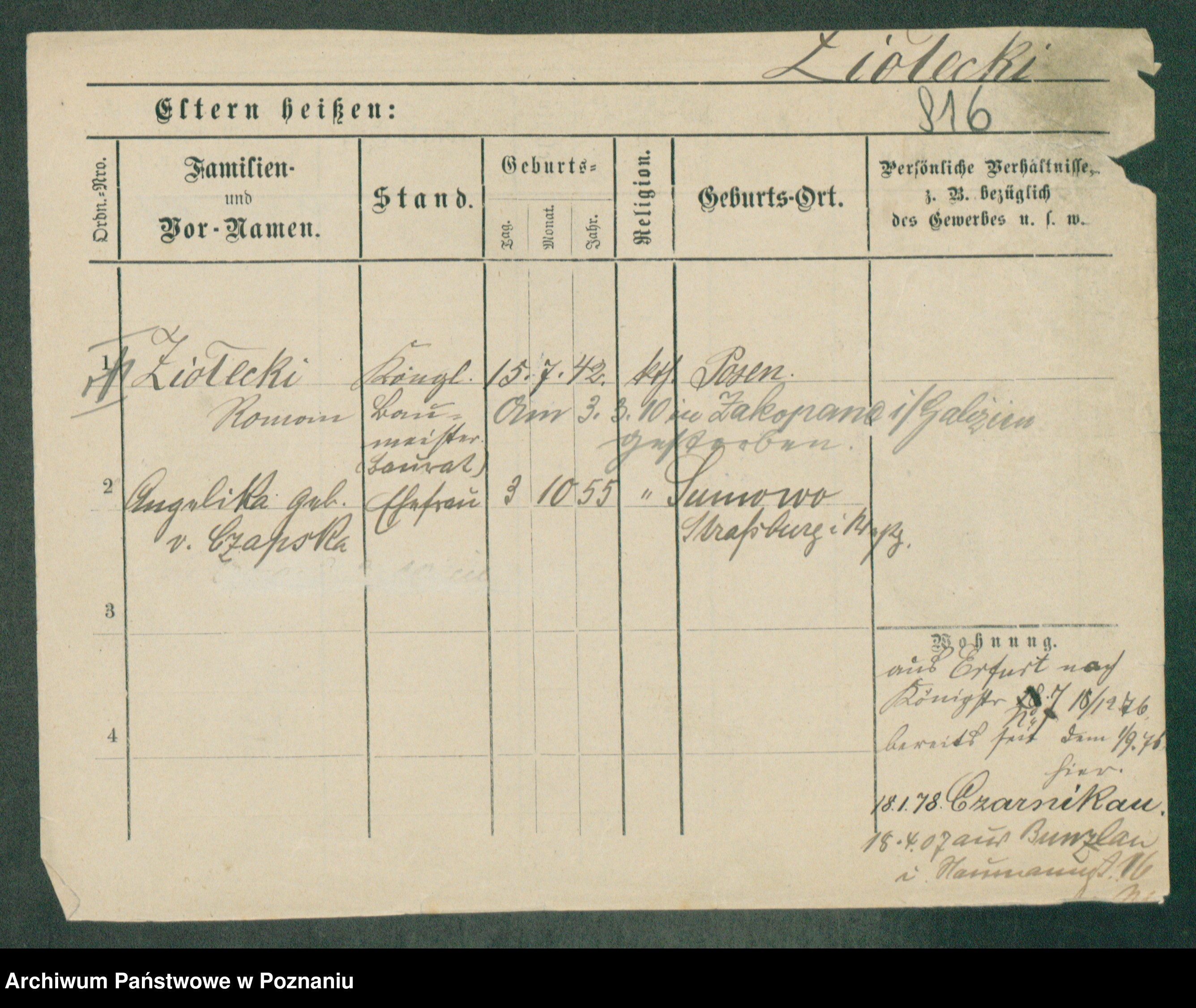 Podgląd karty osobowej dostępny jest po kliknięciu na nazwisko lub ikonkę karty. Można dokonywać powiększenia (ikony na górze) lub przechodzić między kolejnymi skanami (strzałki po bokach).