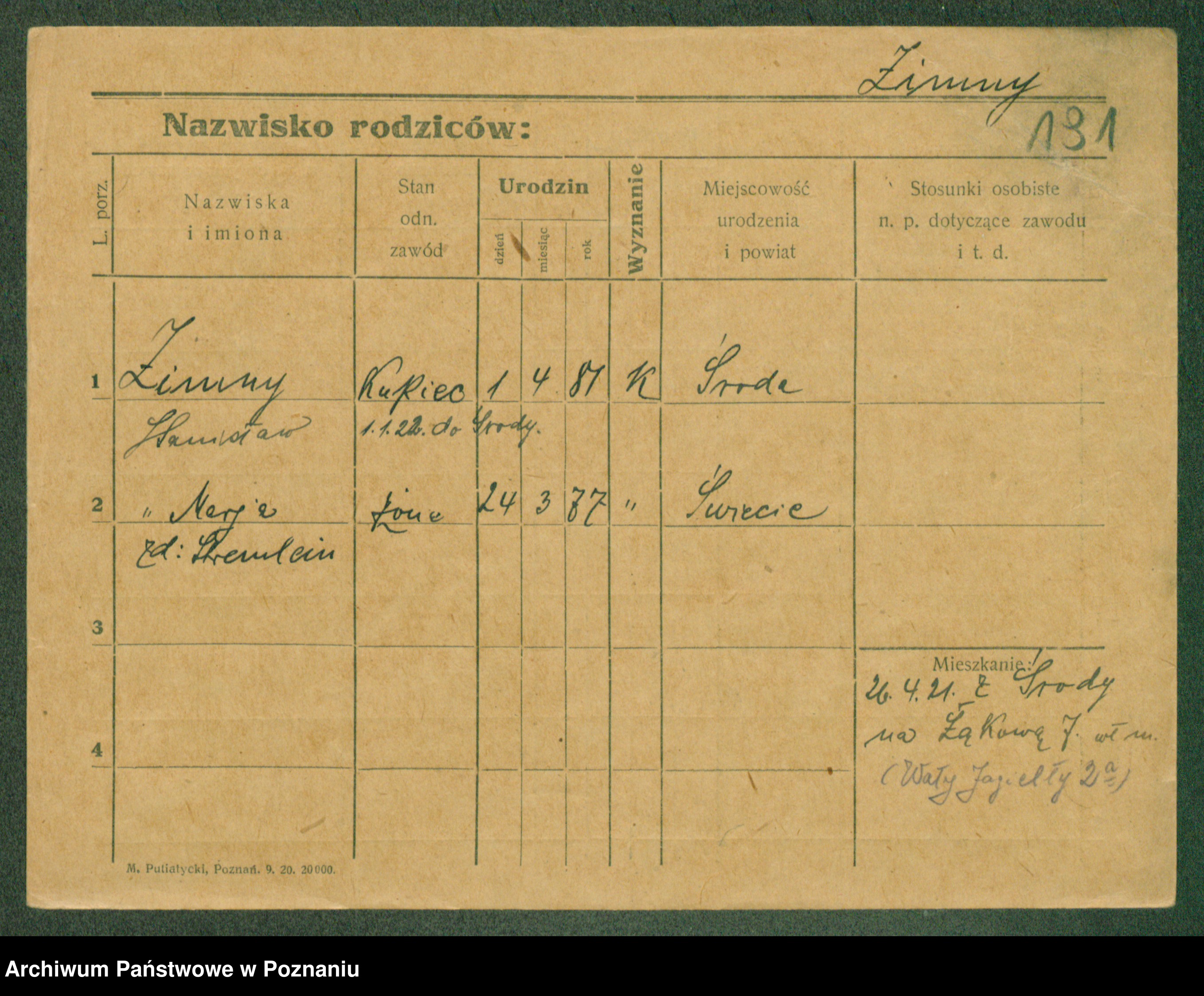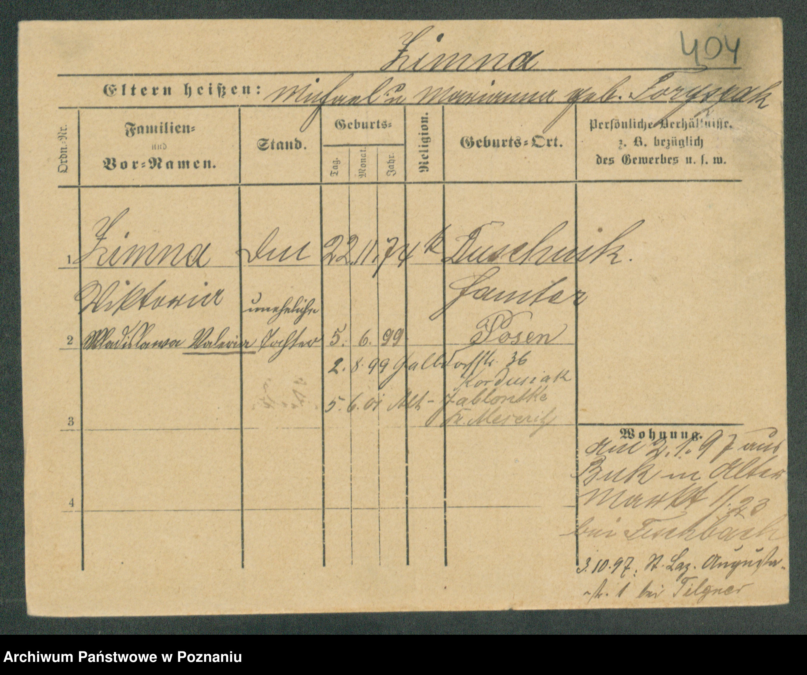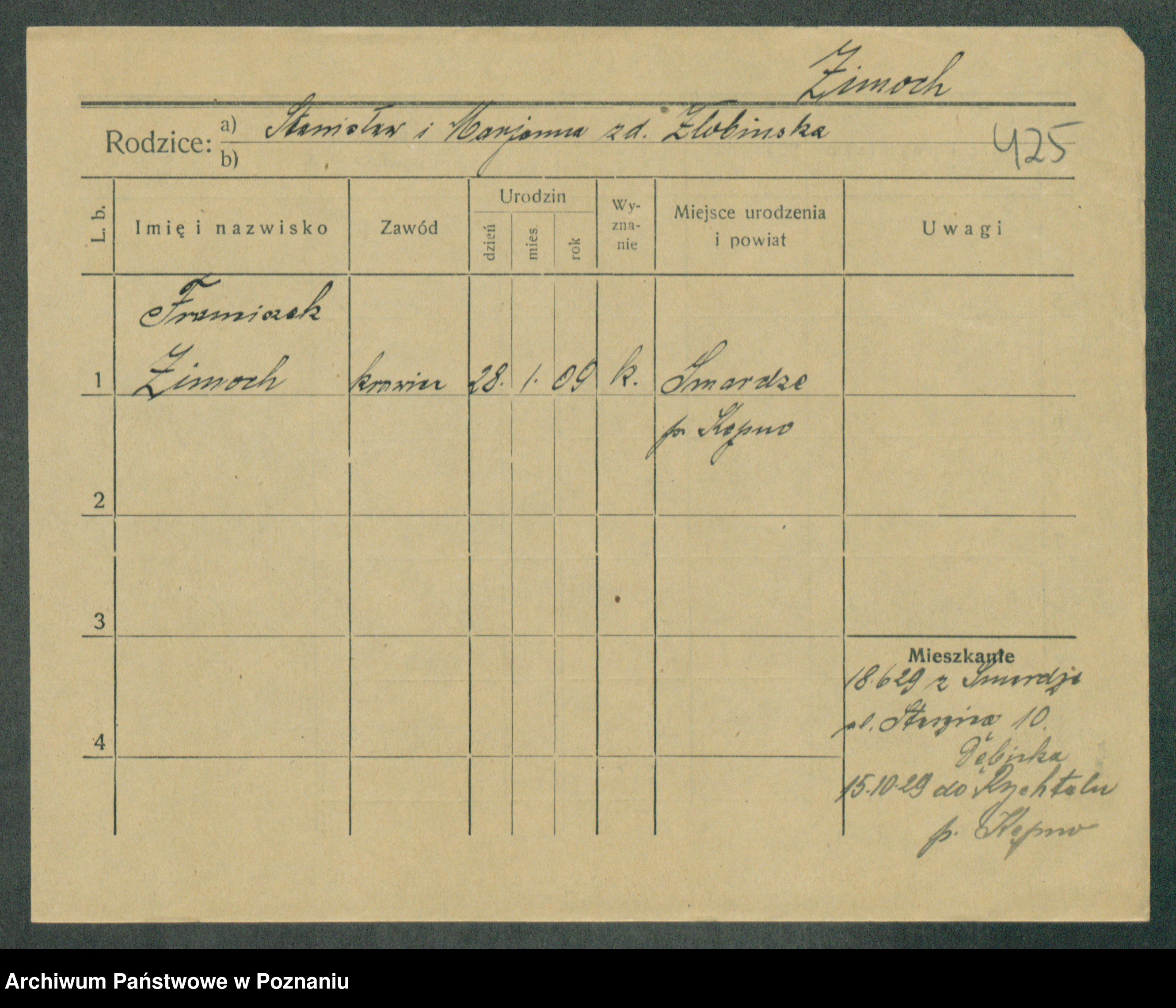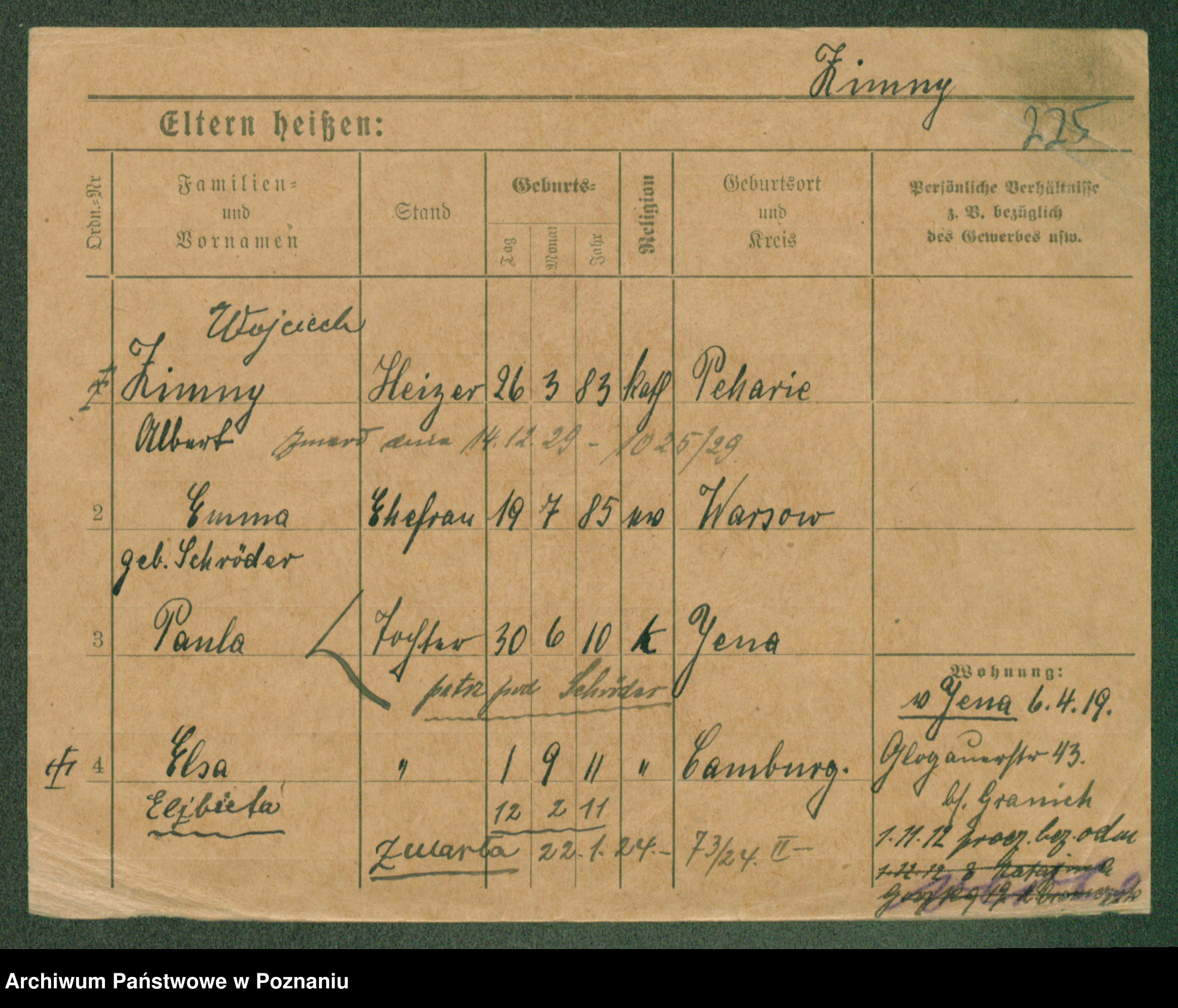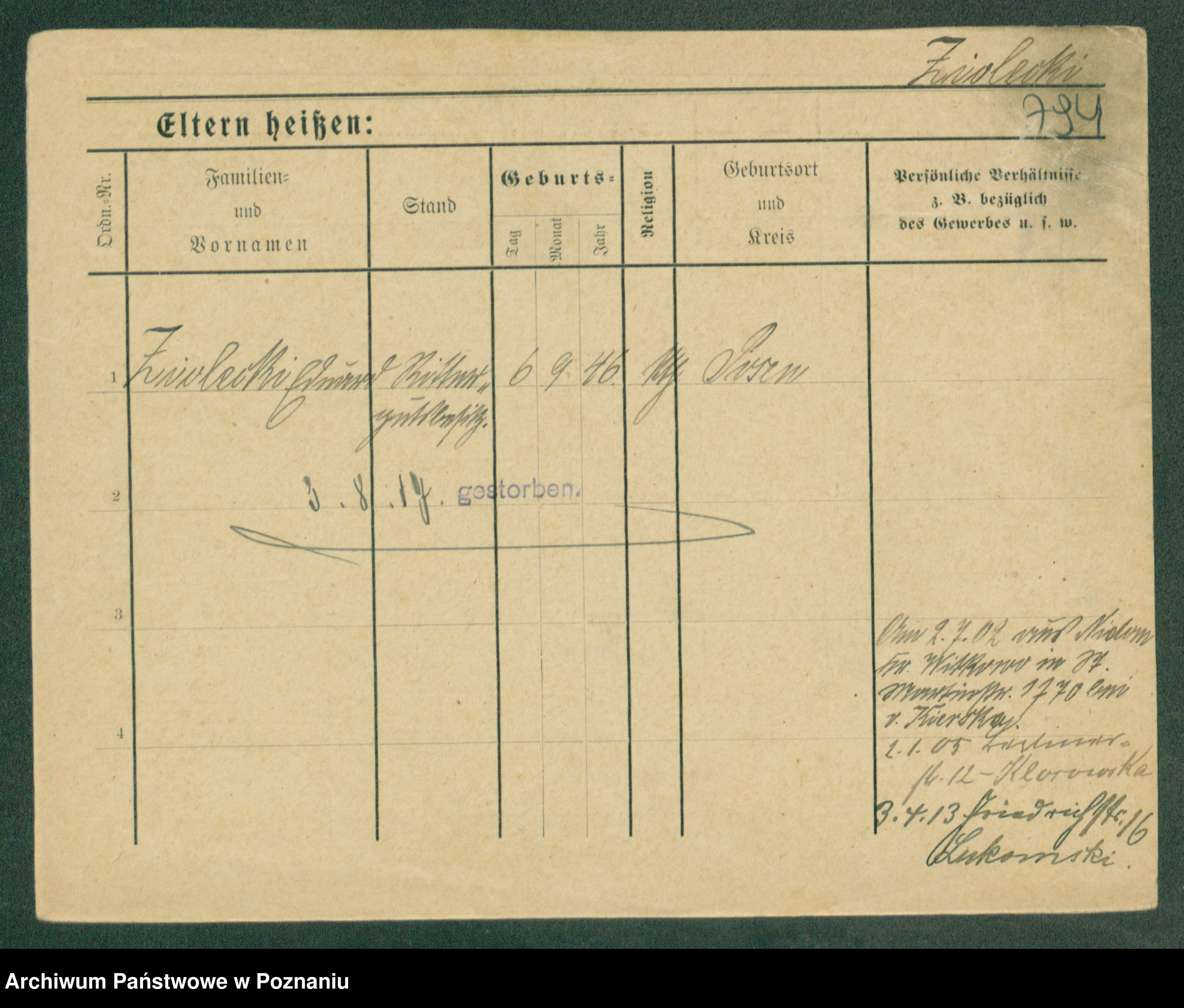 Podgląd karty osobowej dostępny jest po kliknięciu na nazwisko lub ikonkę karty. Można dokonywać powiększenia (ikony na górze) lub przechodzić między kolejnymi skanami (strzałki po bokach).