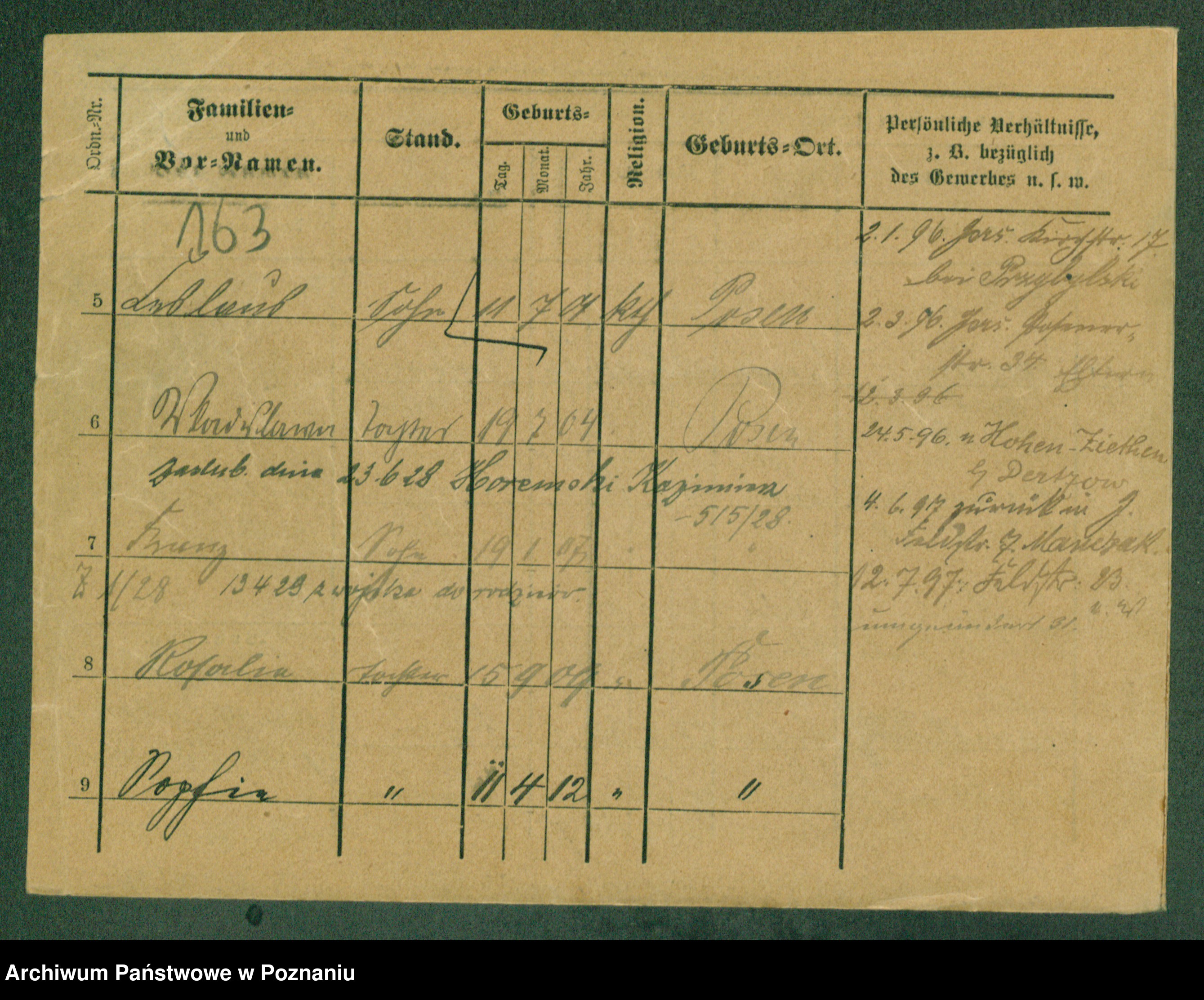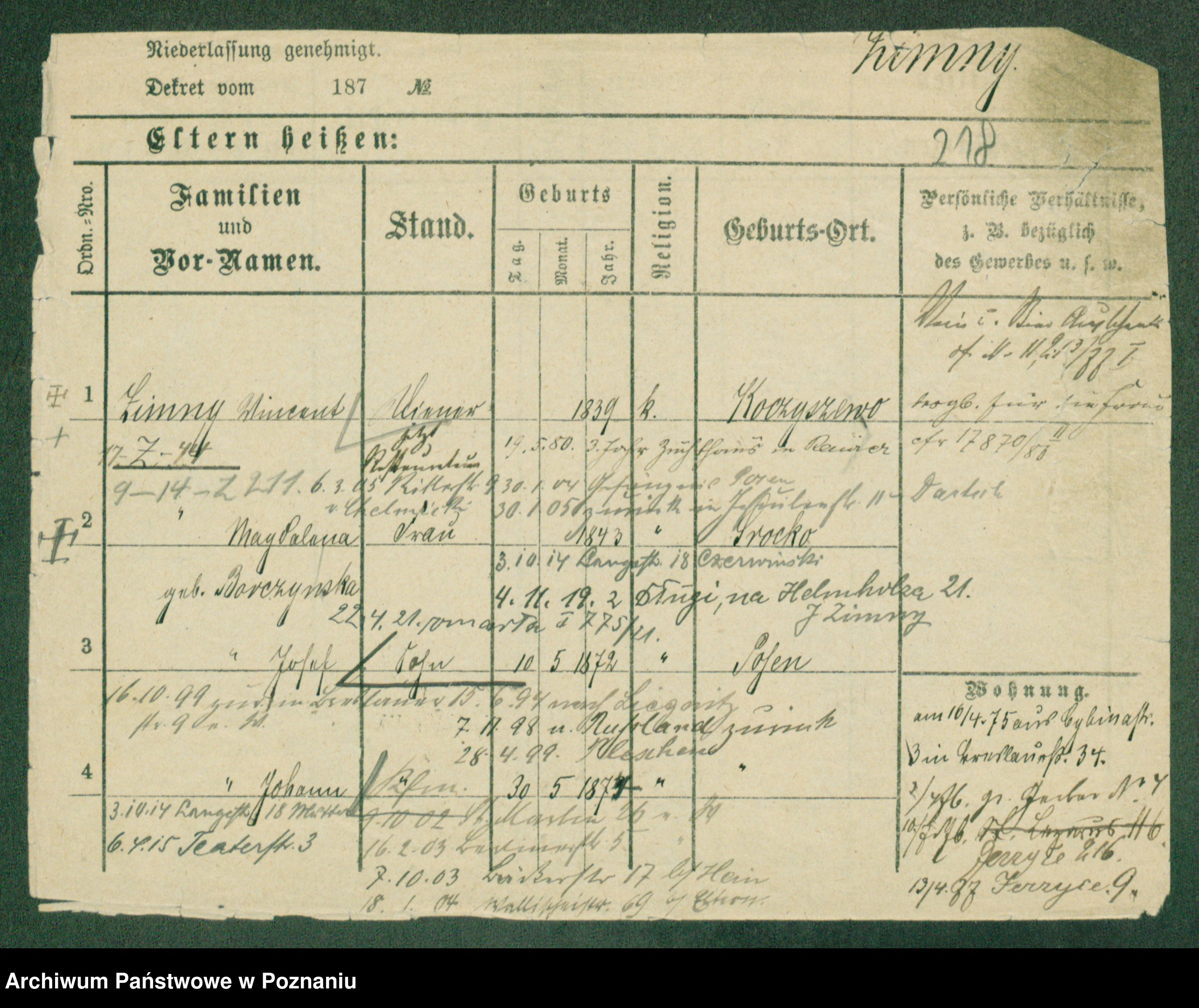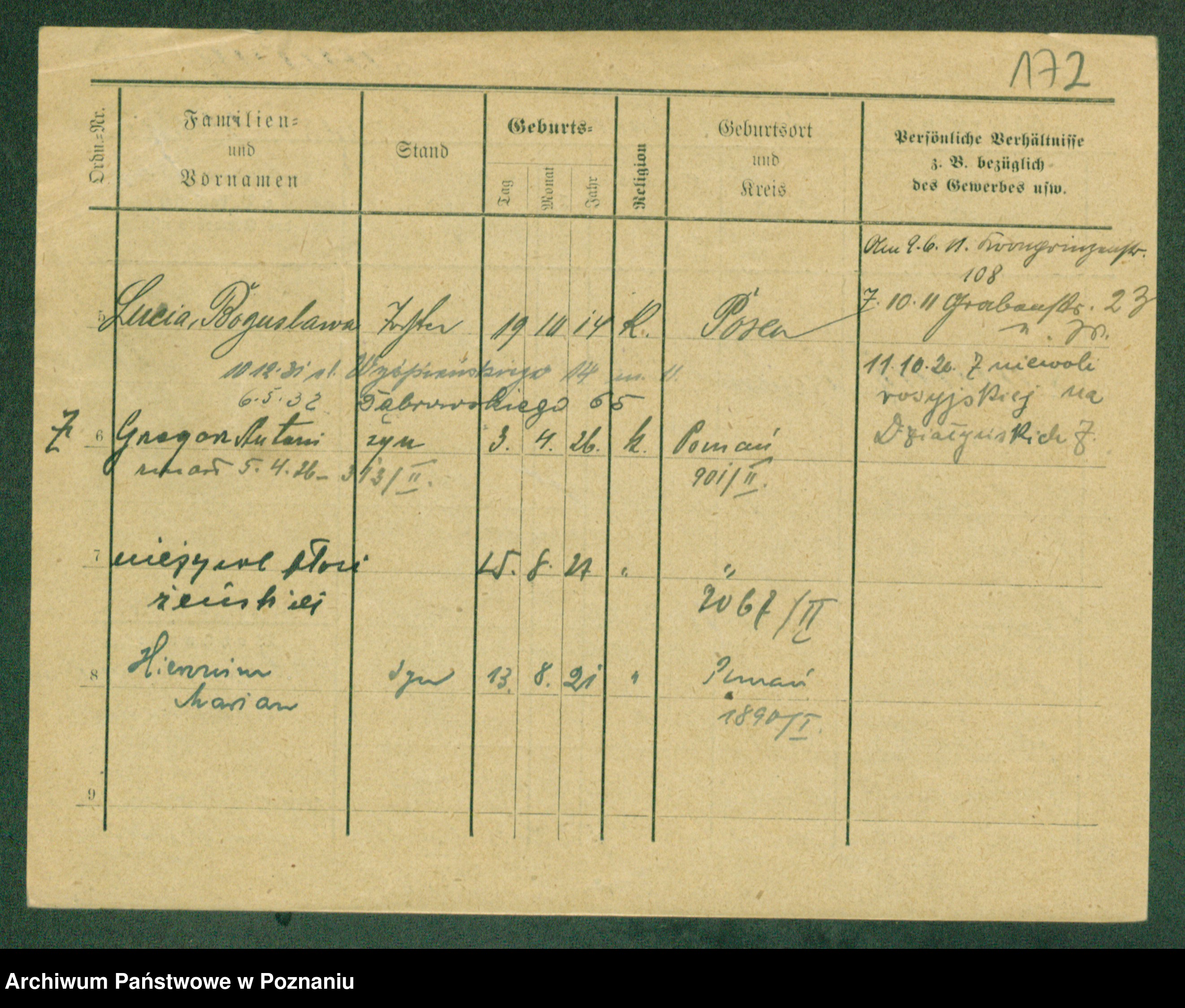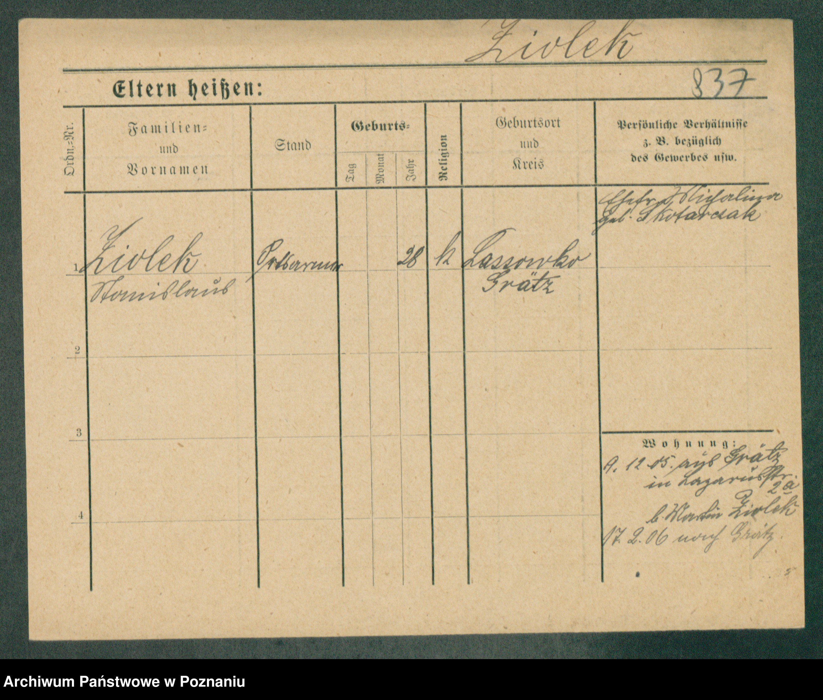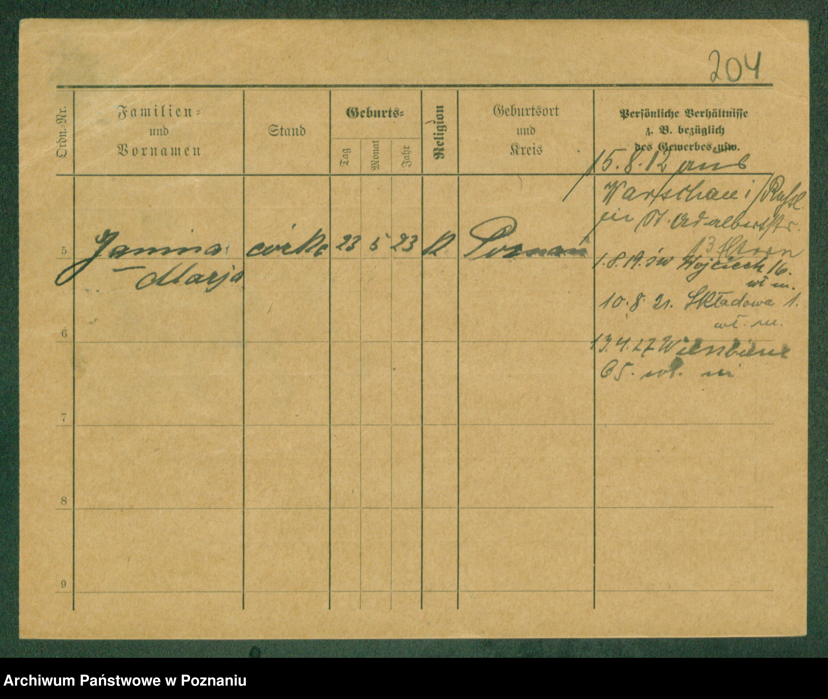 Podgląd karty osobowej dostępny jest po kliknięciu na nazwisko lub ikonkę karty. Można dokonywać powiększenia (ikony na górze) lub przechodzić między kolejnymi skanami (strzałki po bokach).