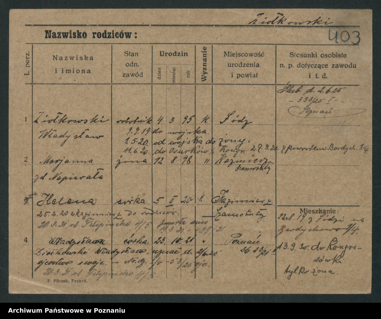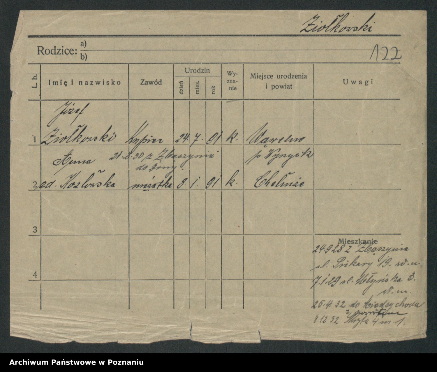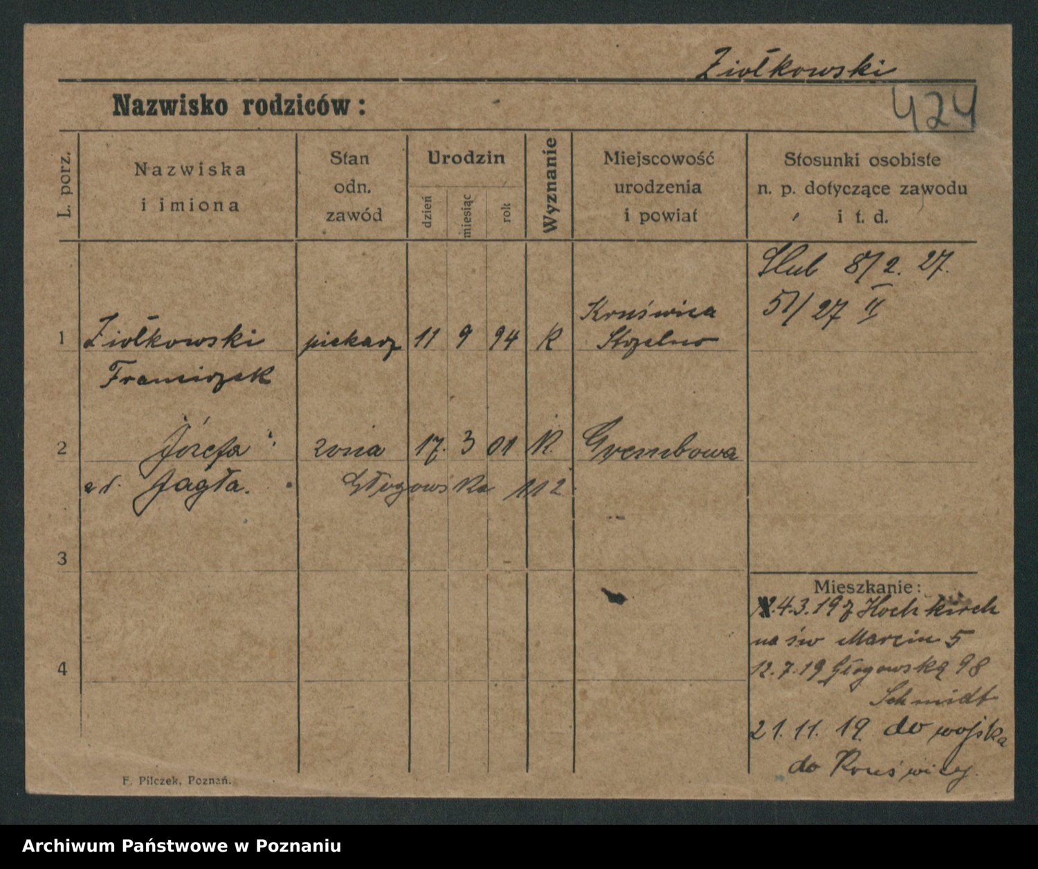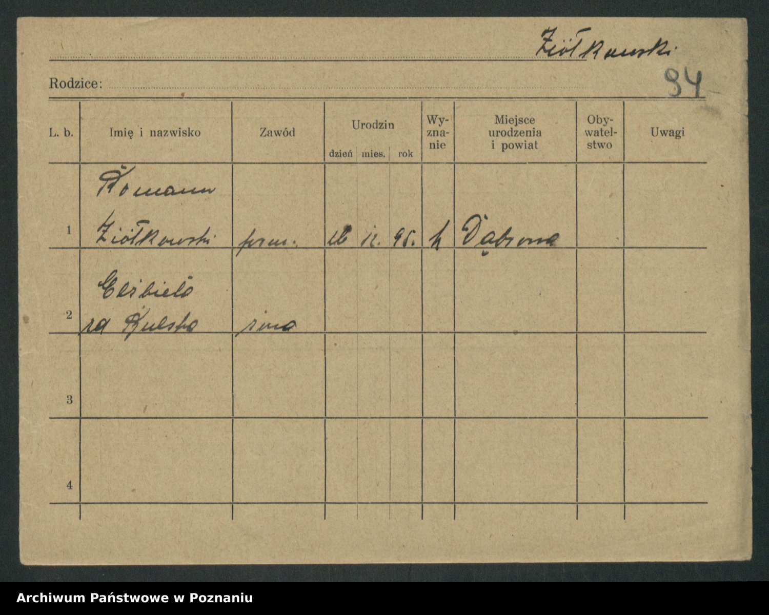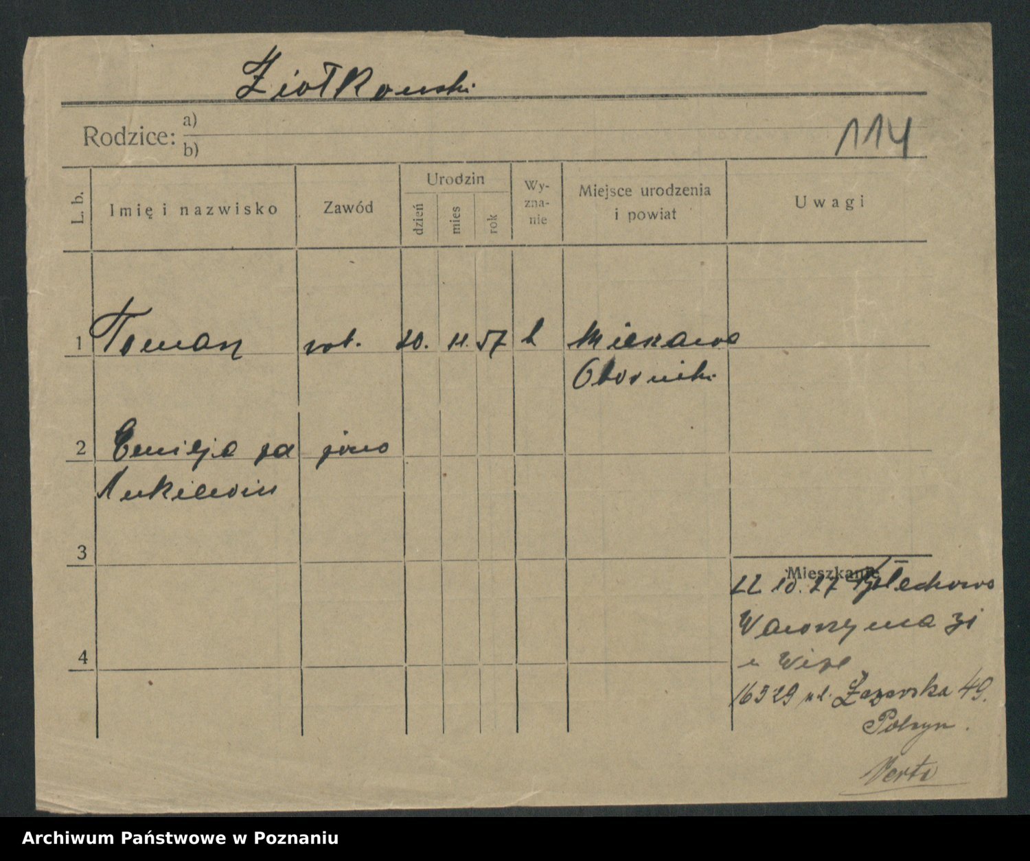 Podgląd karty osobowej dostępny jest po kliknięciu na nazwisko lub ikonkę karty. Można dokonywać powiększenia (ikony na górze) lub przechodzić między kolejnymi skanami (strzałki po bokach).