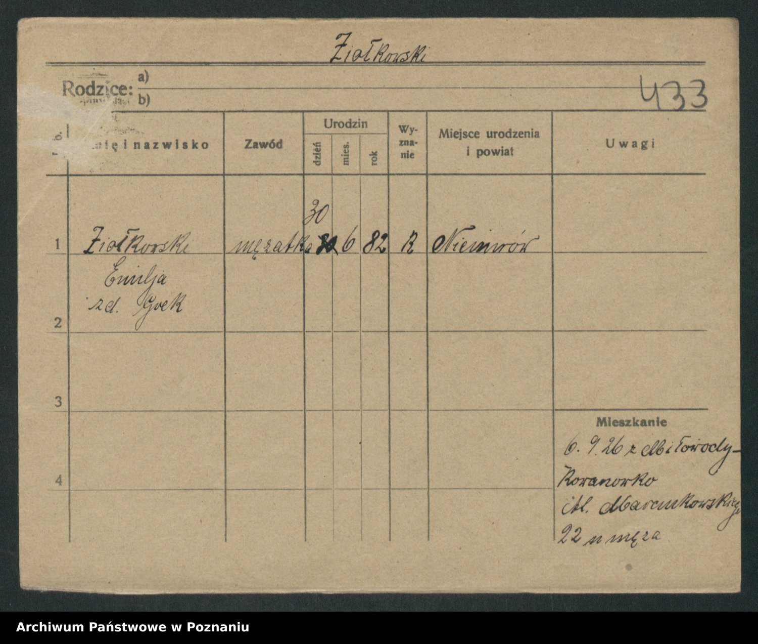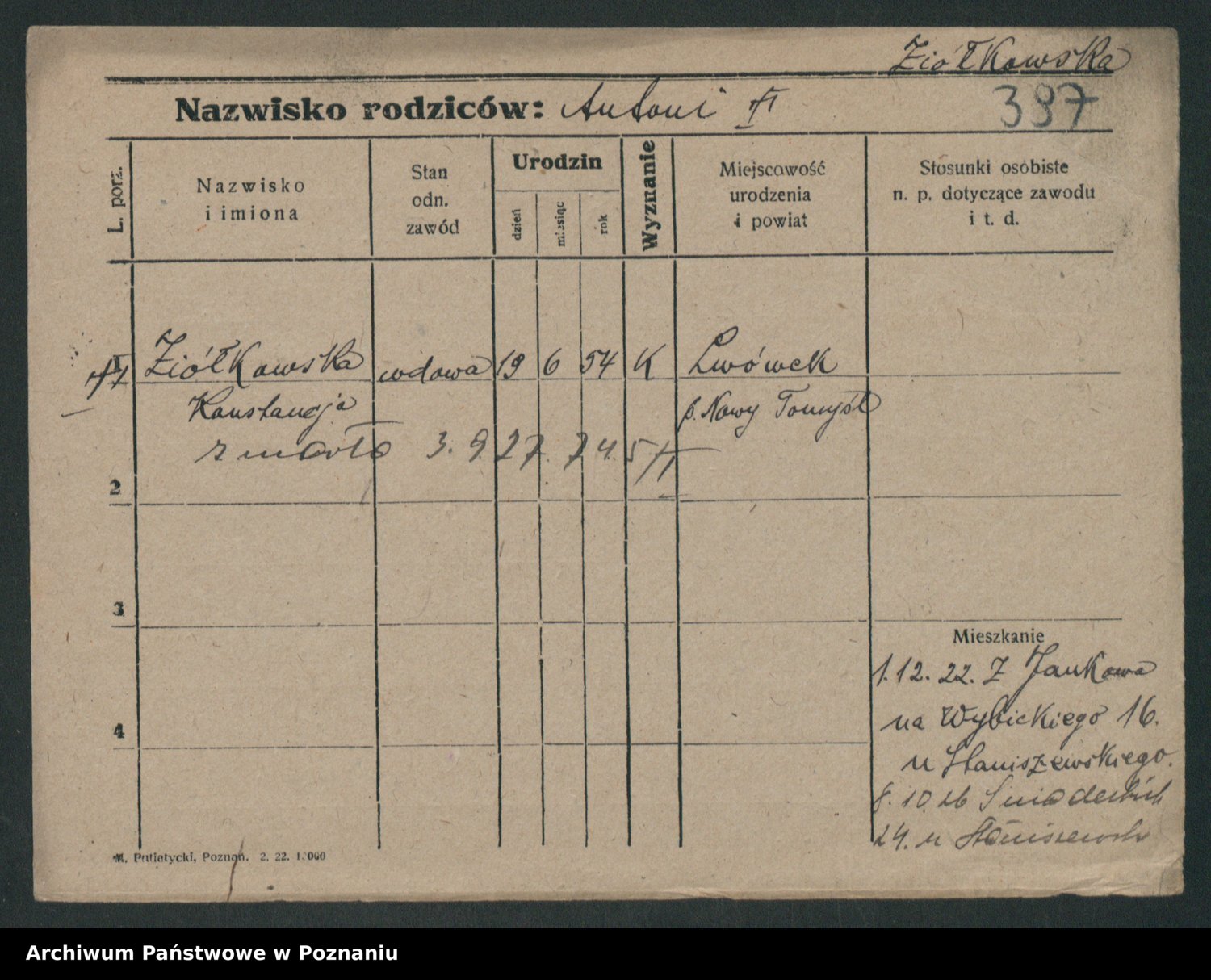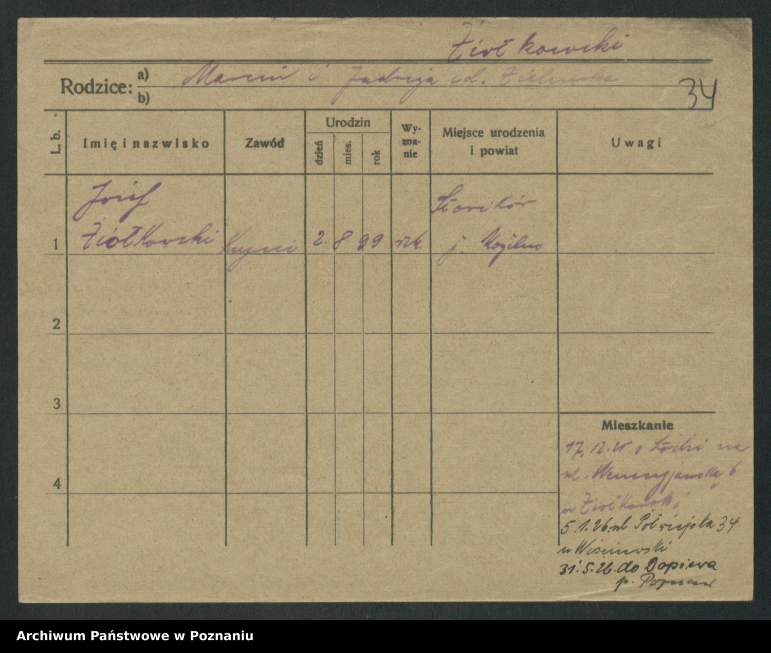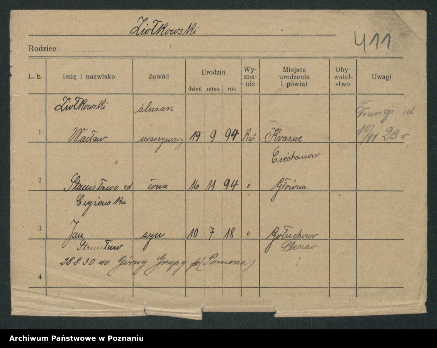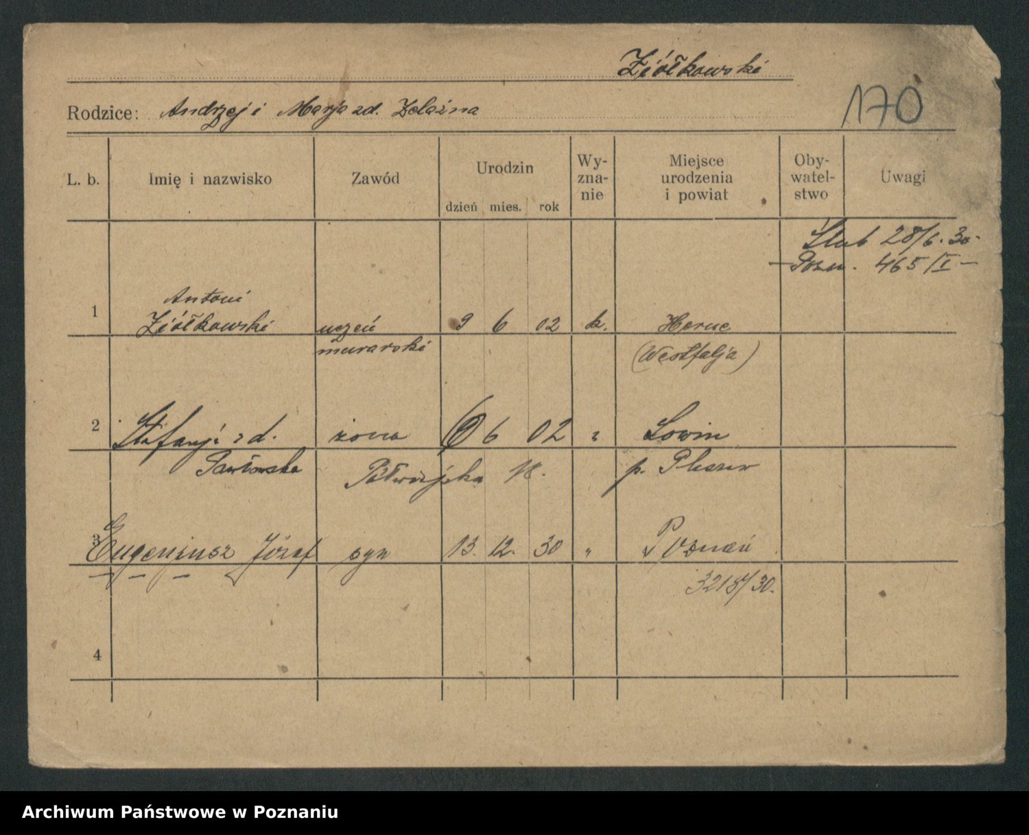 Podgląd karty osobowej dostępny jest po kliknięciu na nazwisko lub ikonkę karty. Można dokonywać powiększenia (ikony na górze) lub przechodzić między kolejnymi skanami (strzałki po bokach).