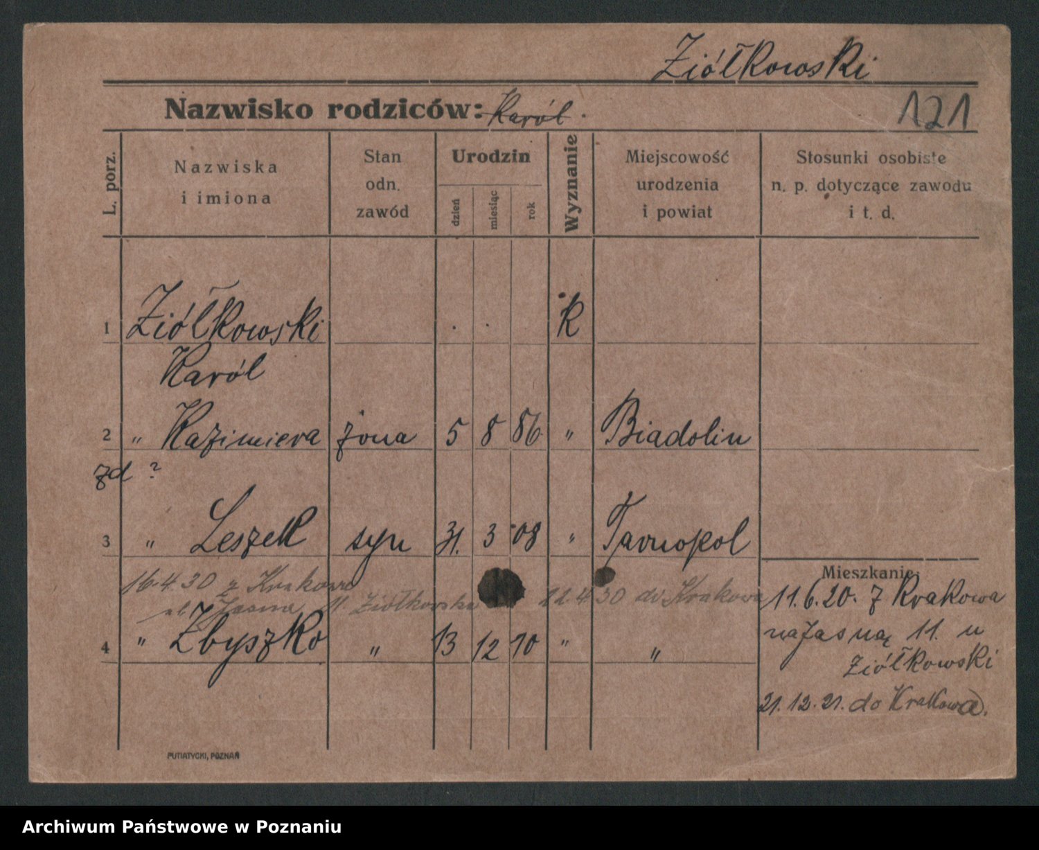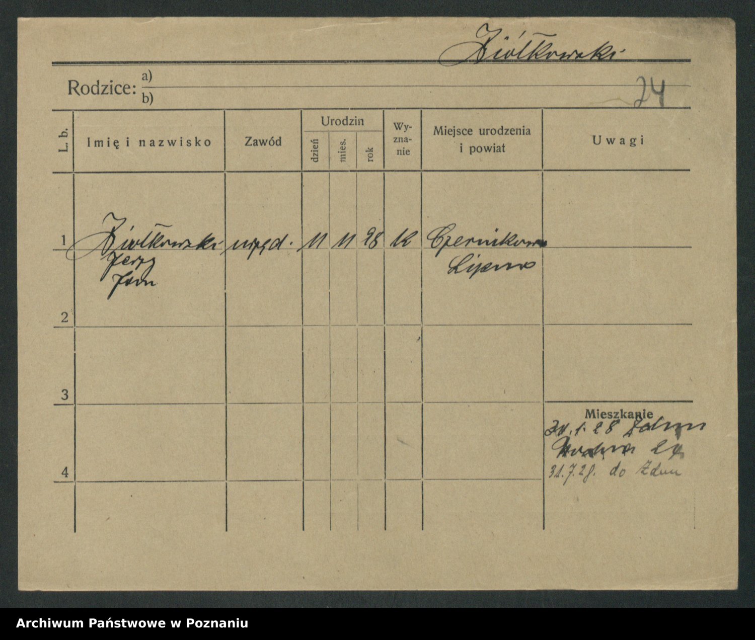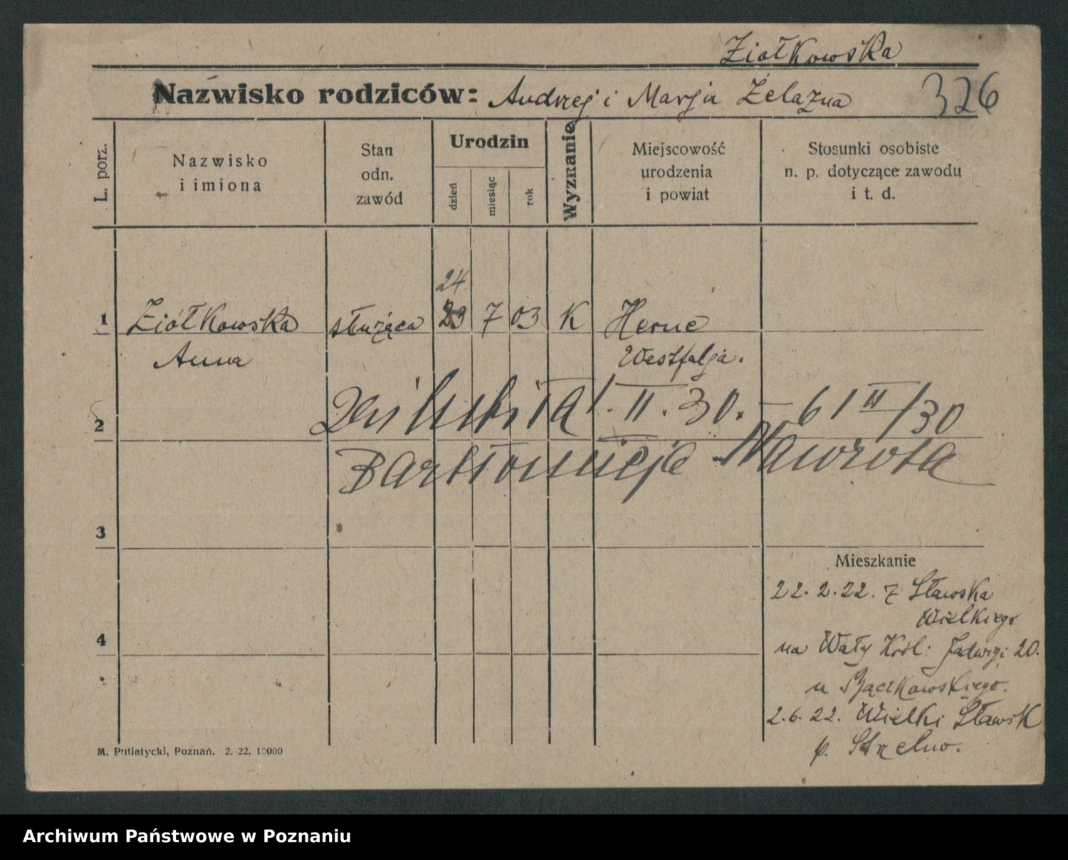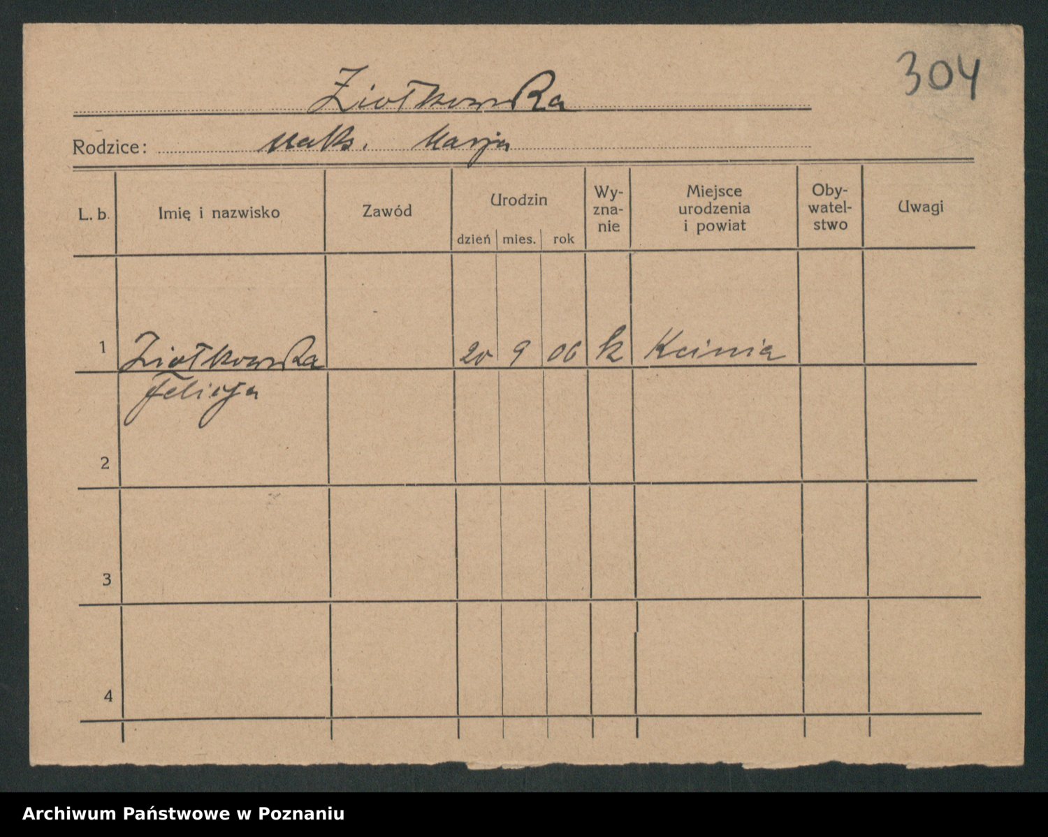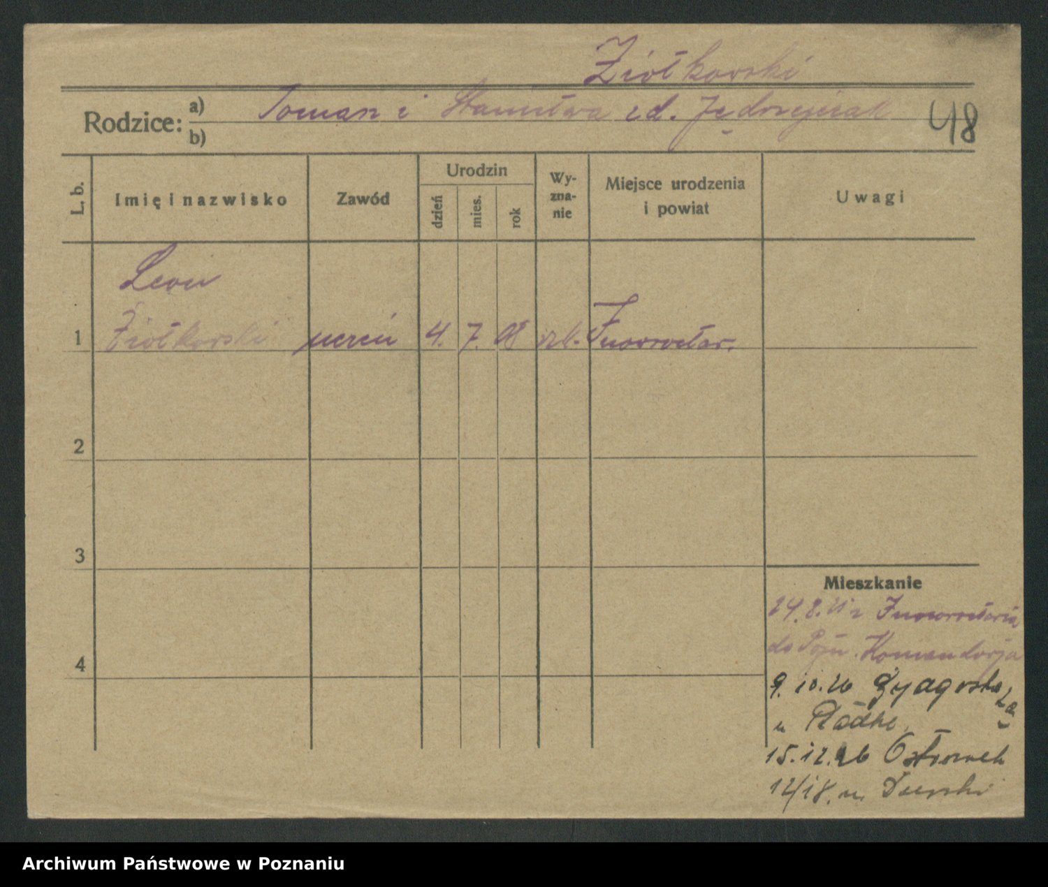 Podgląd karty osobowej dostępny jest po kliknięciu na nazwisko lub ikonkę karty. Można dokonywać powiększenia (ikony na górze) lub przechodzić między kolejnymi skanami (strzałki po bokach).