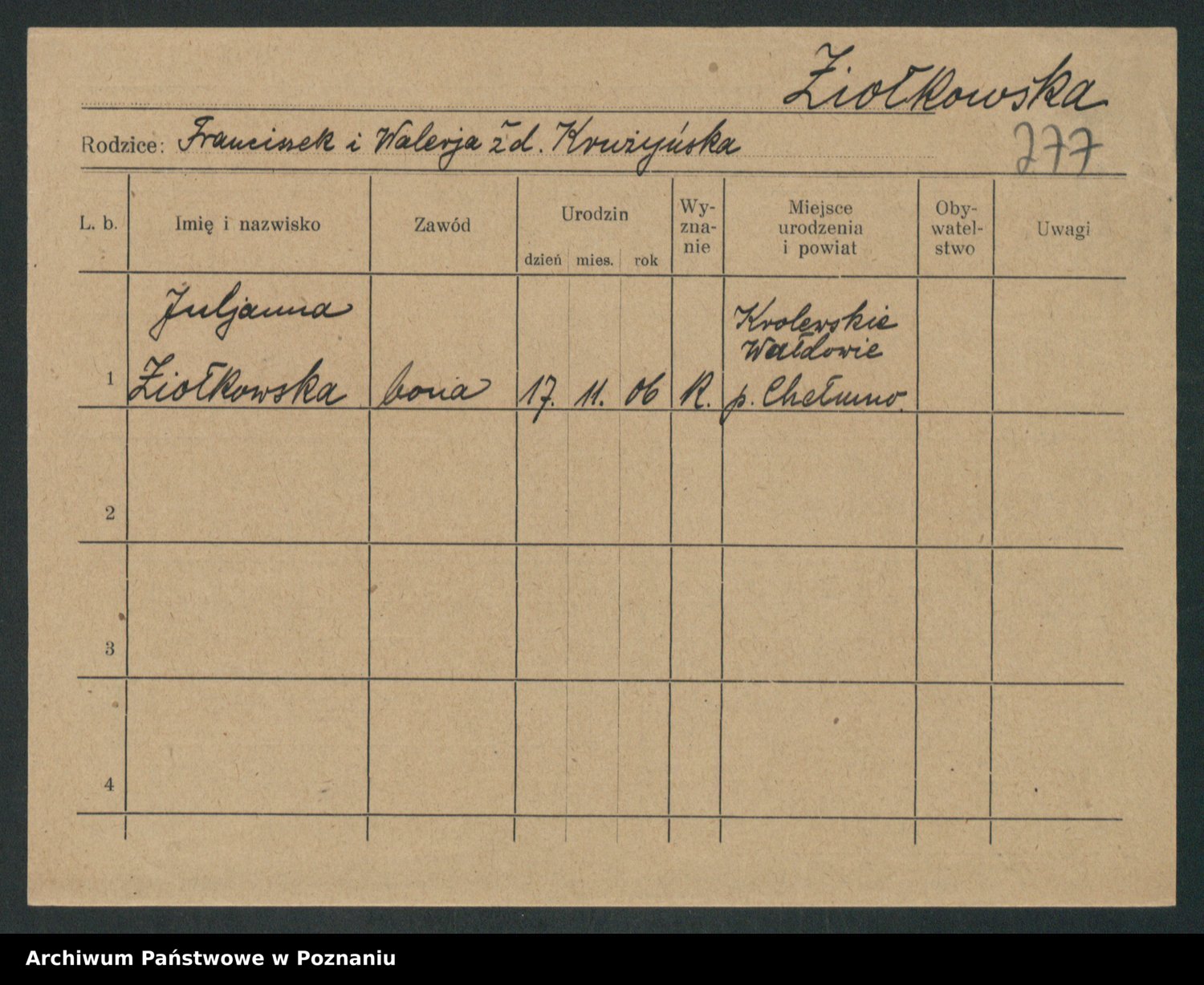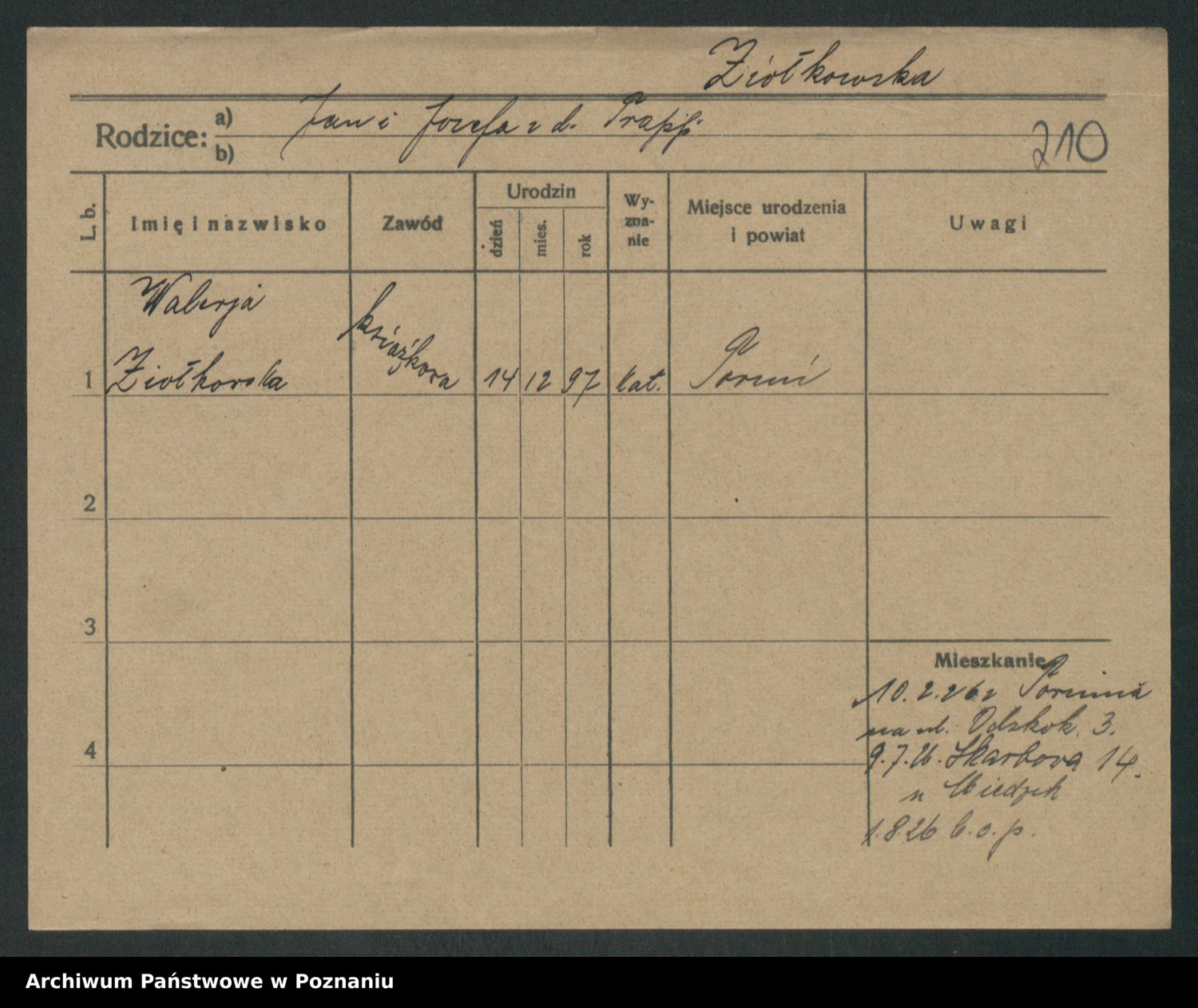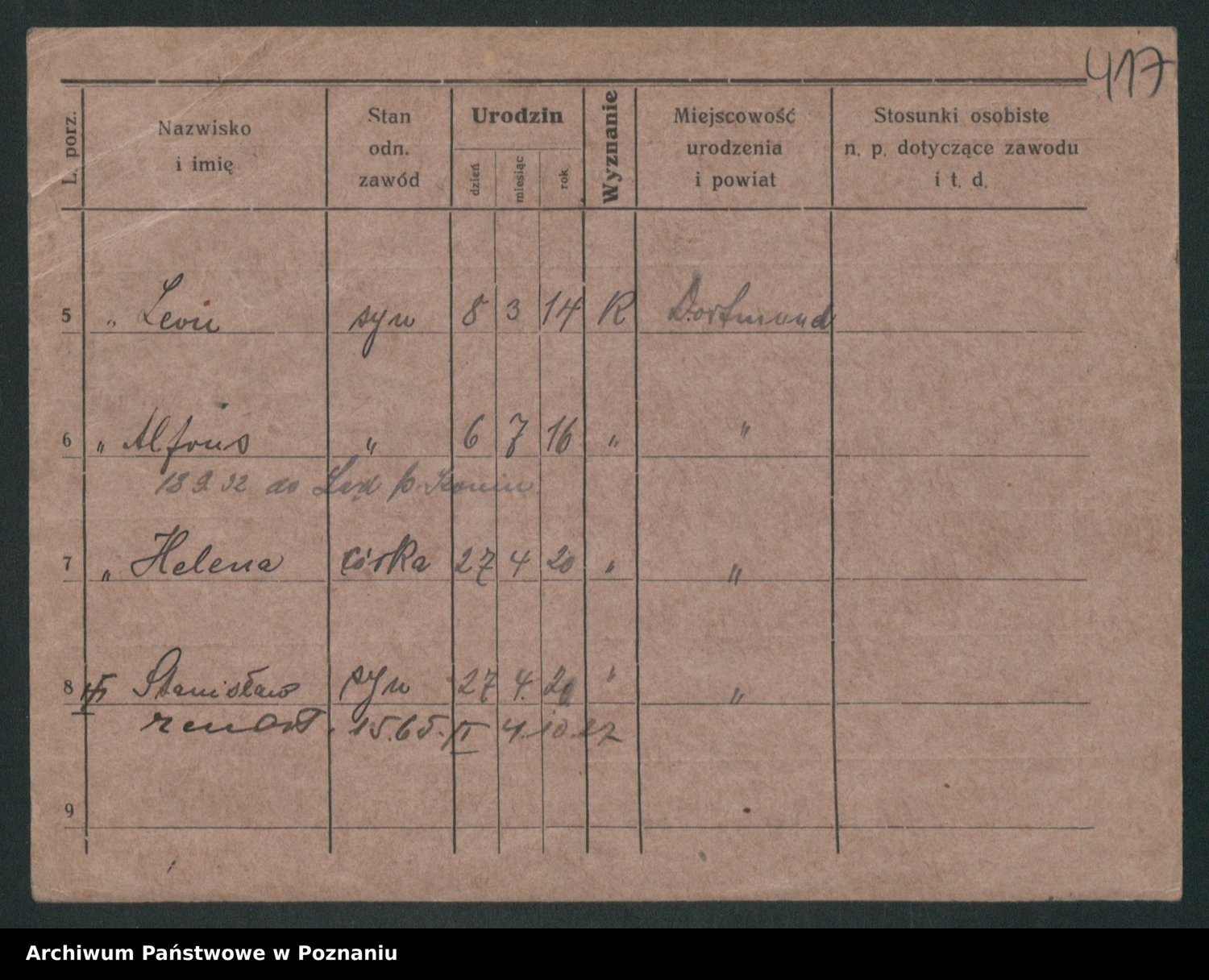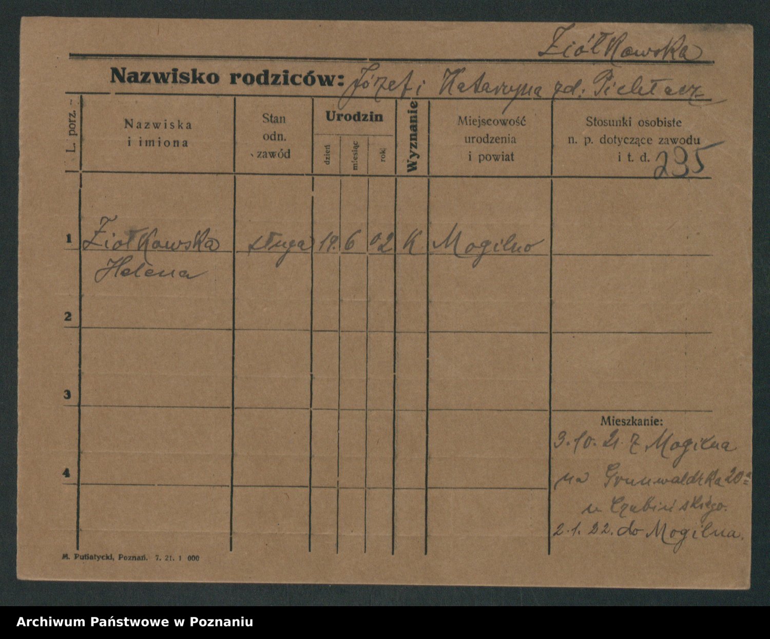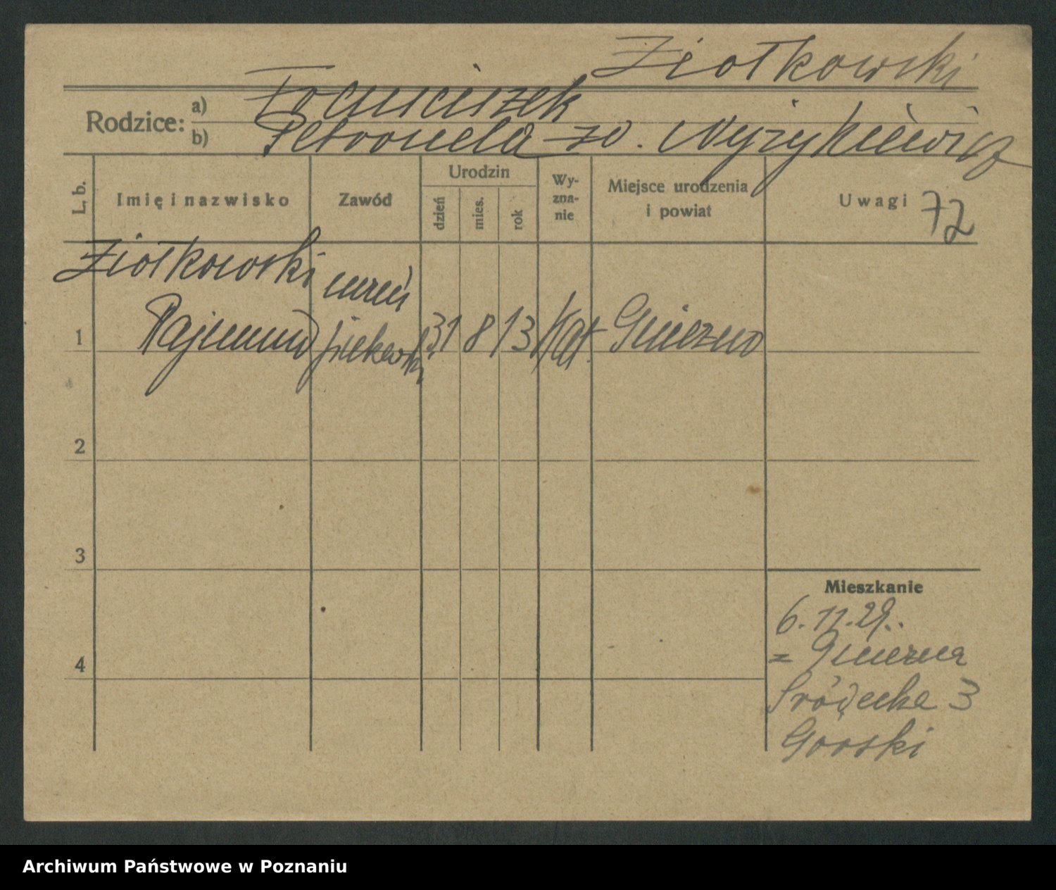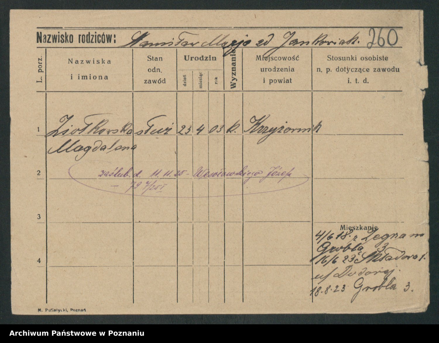 Podgląd karty osobowej dostępny jest po kliknięciu na nazwisko lub ikonkę karty. Można dokonywać powiększenia (ikony na górze) lub przechodzić między kolejnymi skanami (strzałki po bokach).