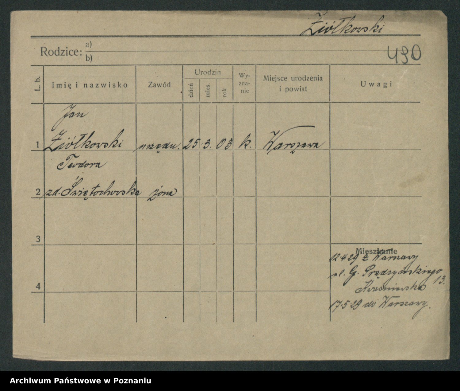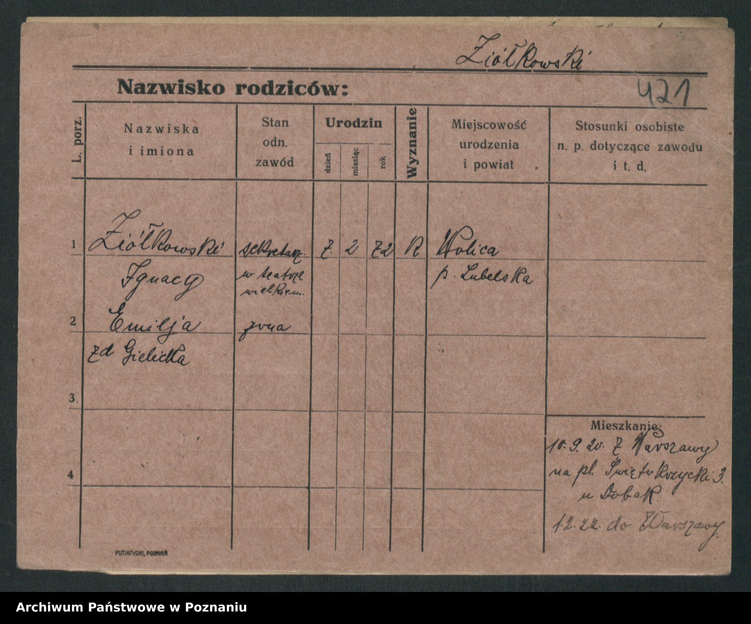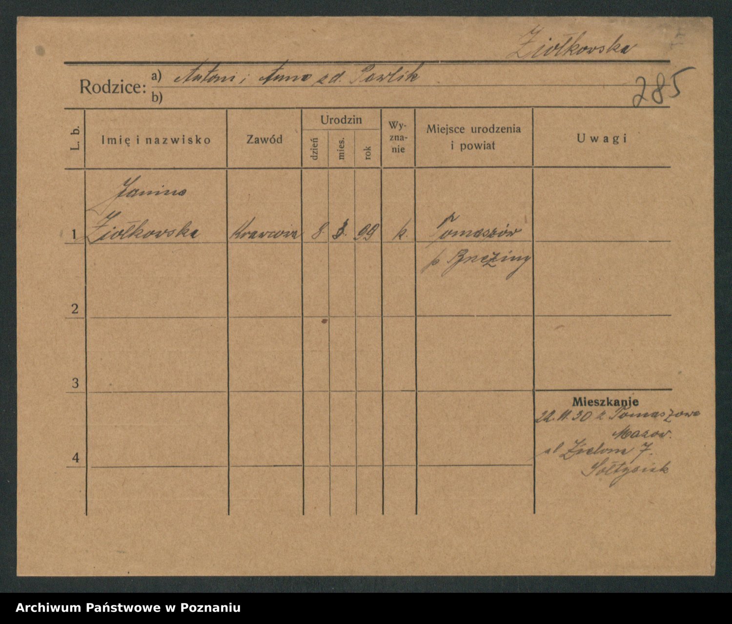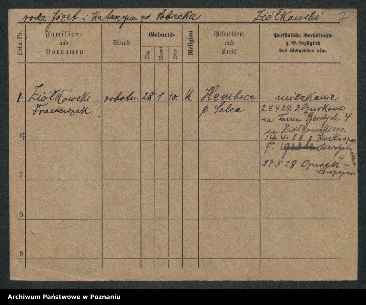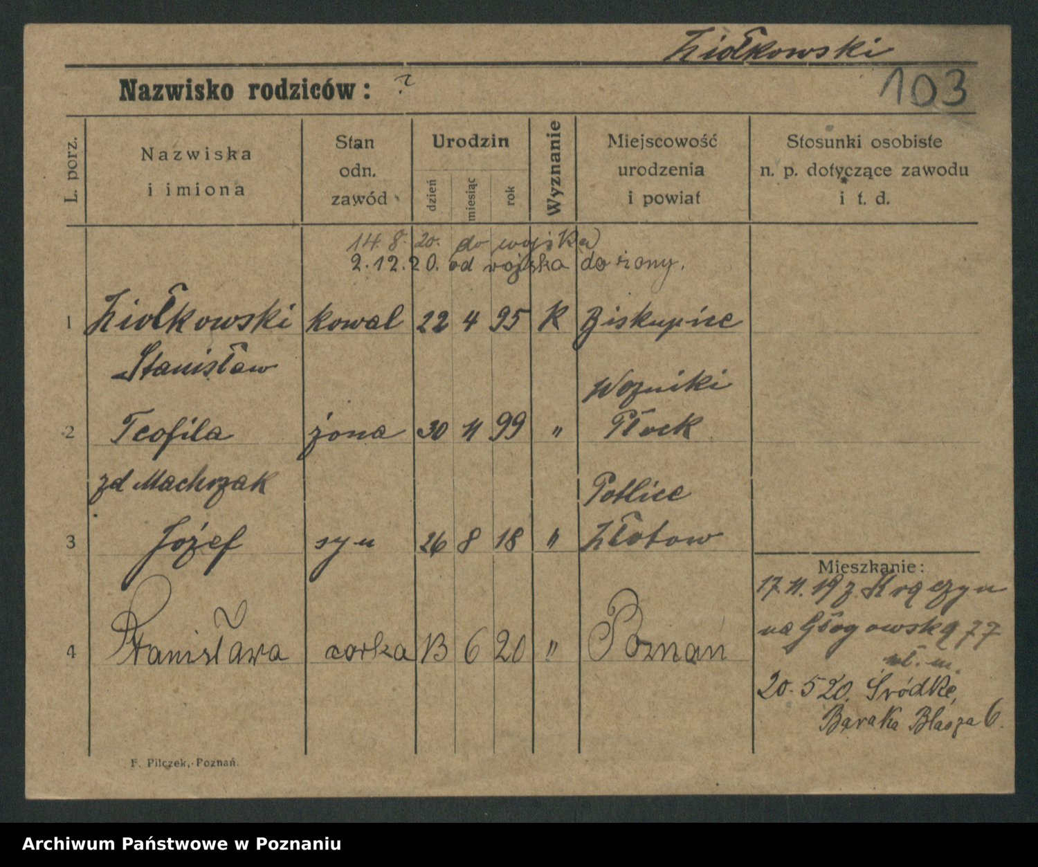 Podgląd karty osobowej dostępny jest po kliknięciu na nazwisko lub ikonkę karty. Można dokonywać powiększenia (ikony na górze) lub przechodzić między kolejnymi skanami (strzałki po bokach).