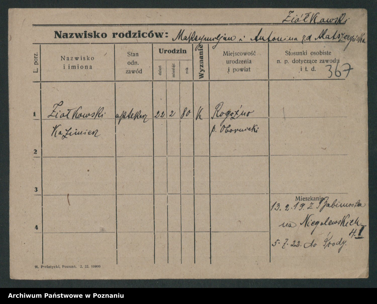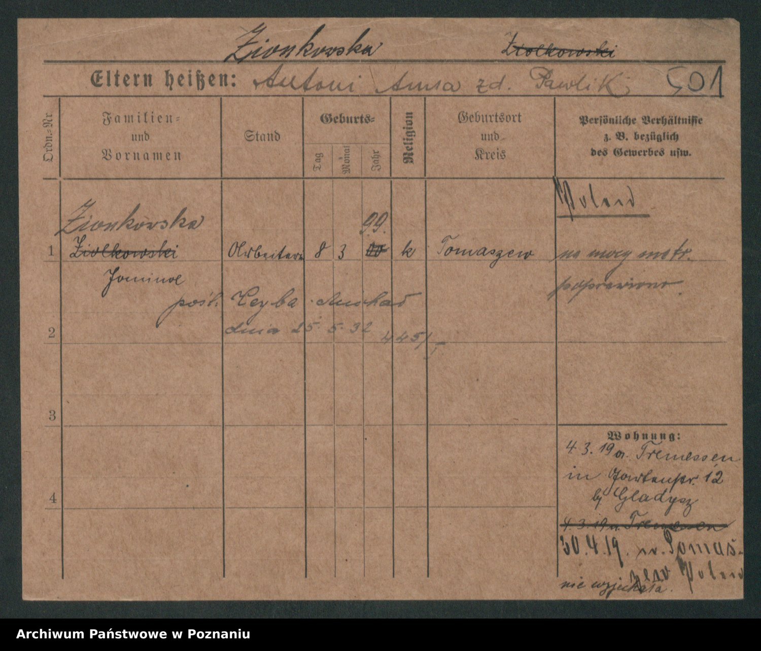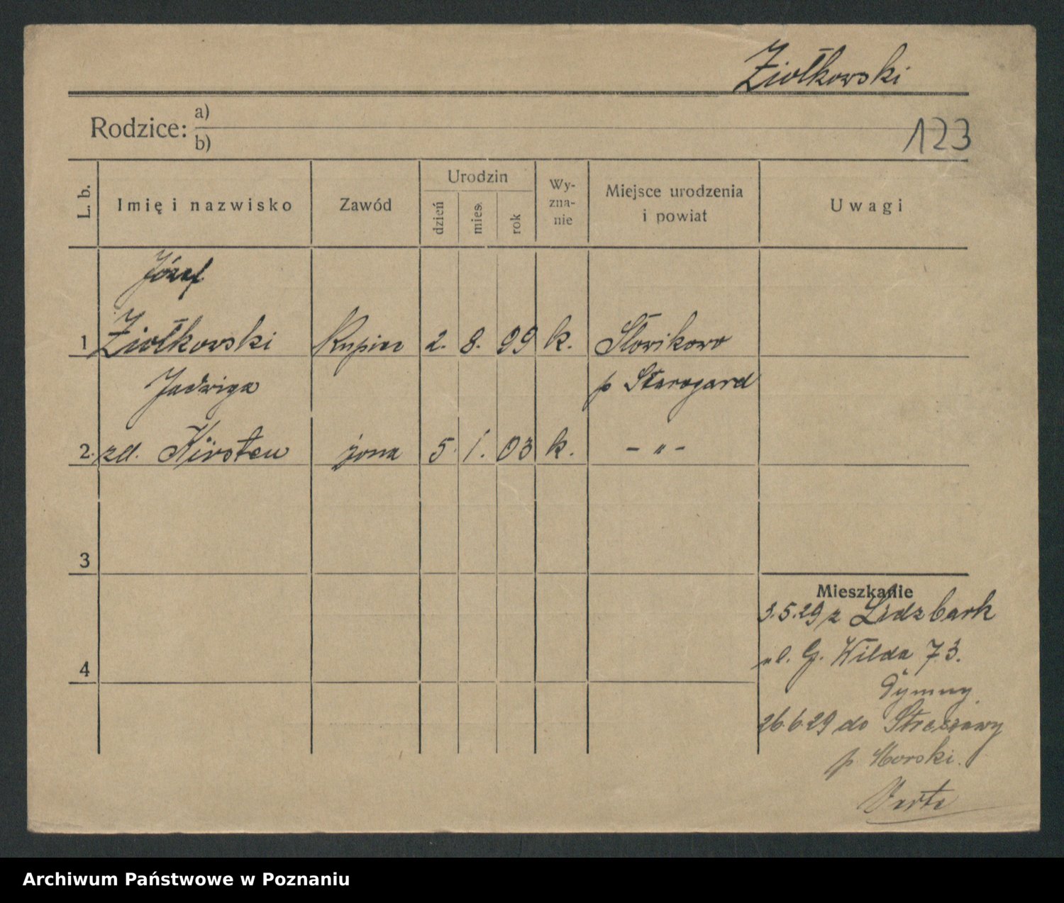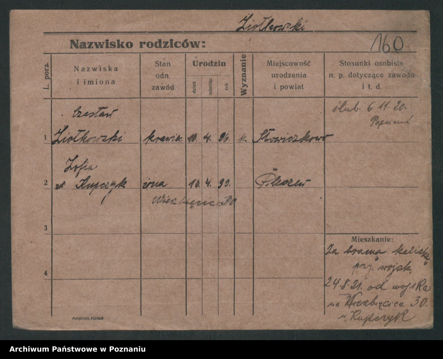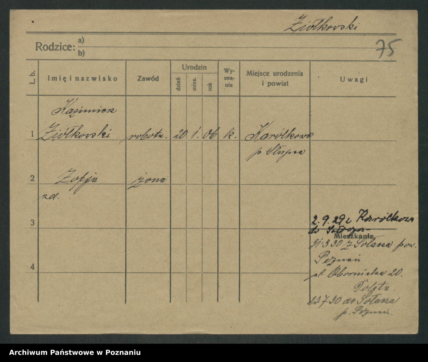 Podgląd karty osobowej dostępny jest po kliknięciu na nazwisko lub ikonkę karty. Można dokonywać powiększenia (ikony na górze) lub przechodzić między kolejnymi skanami (strzałki po bokach).
