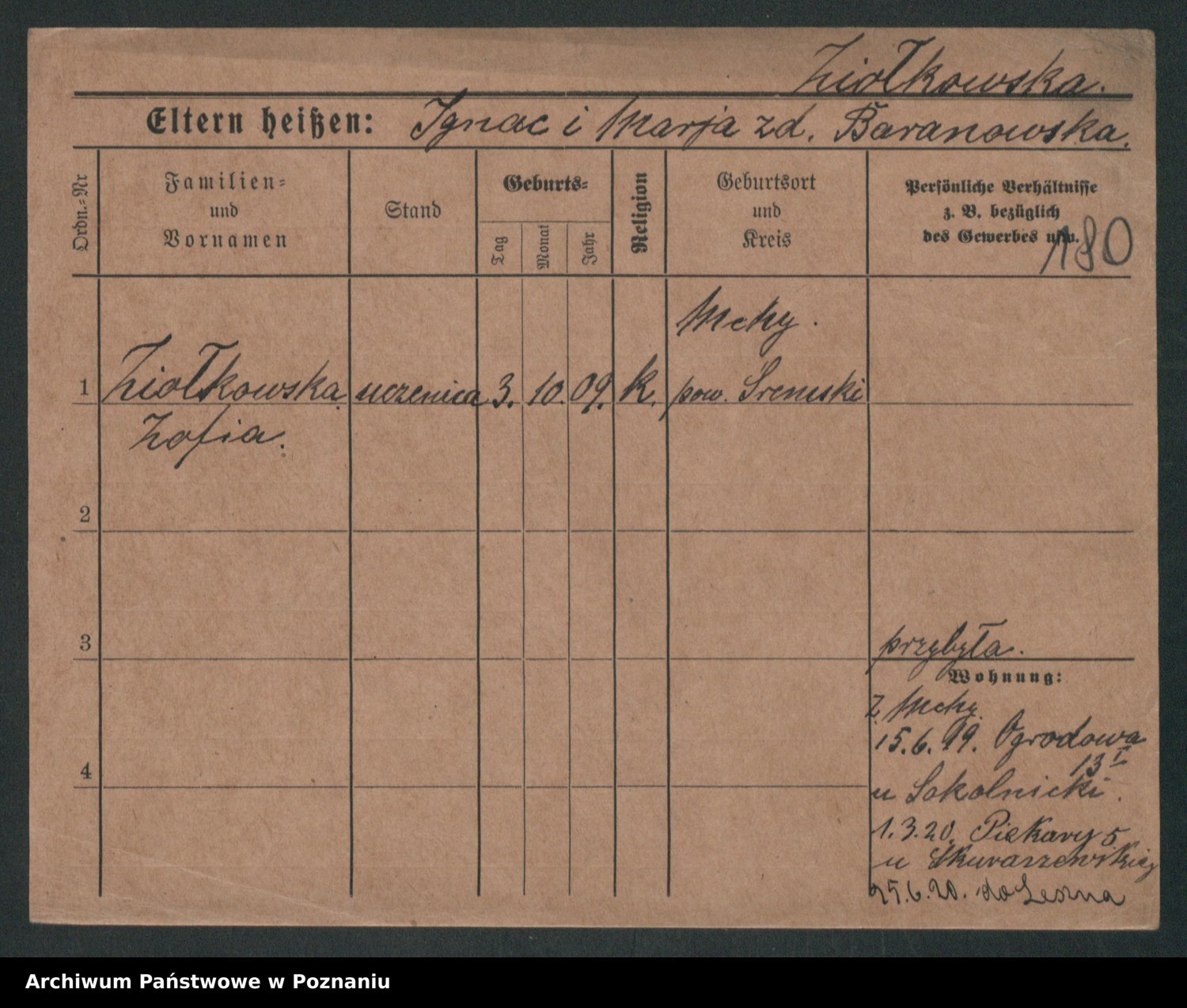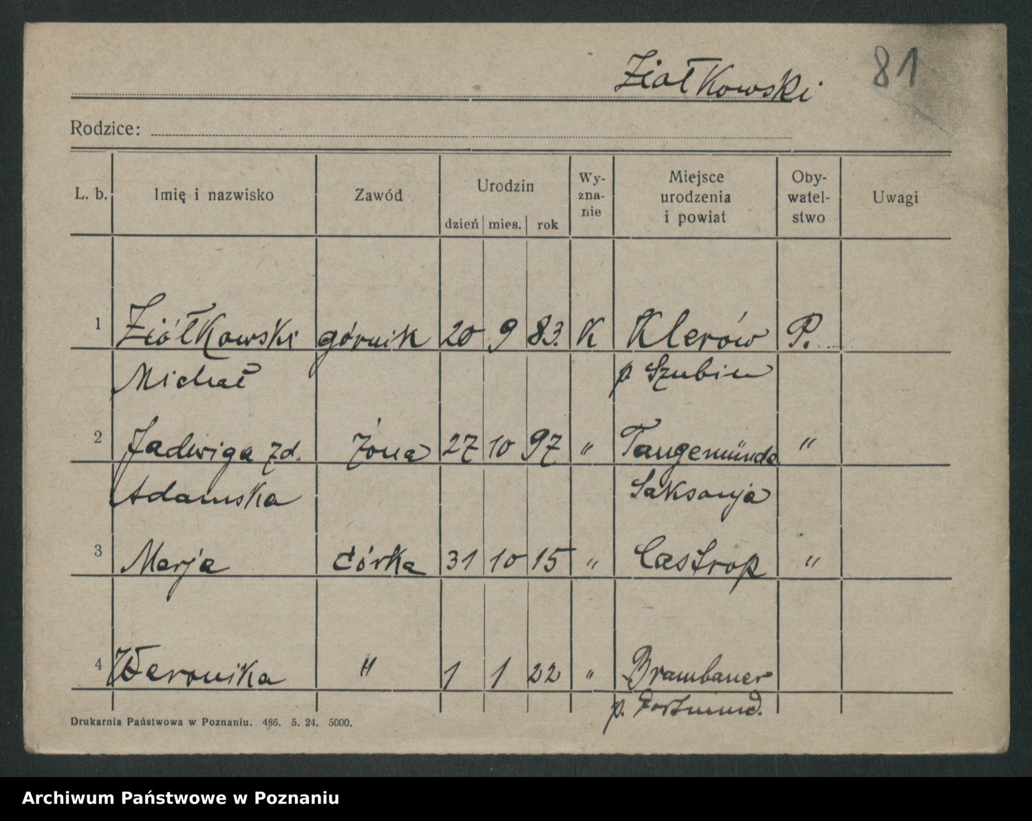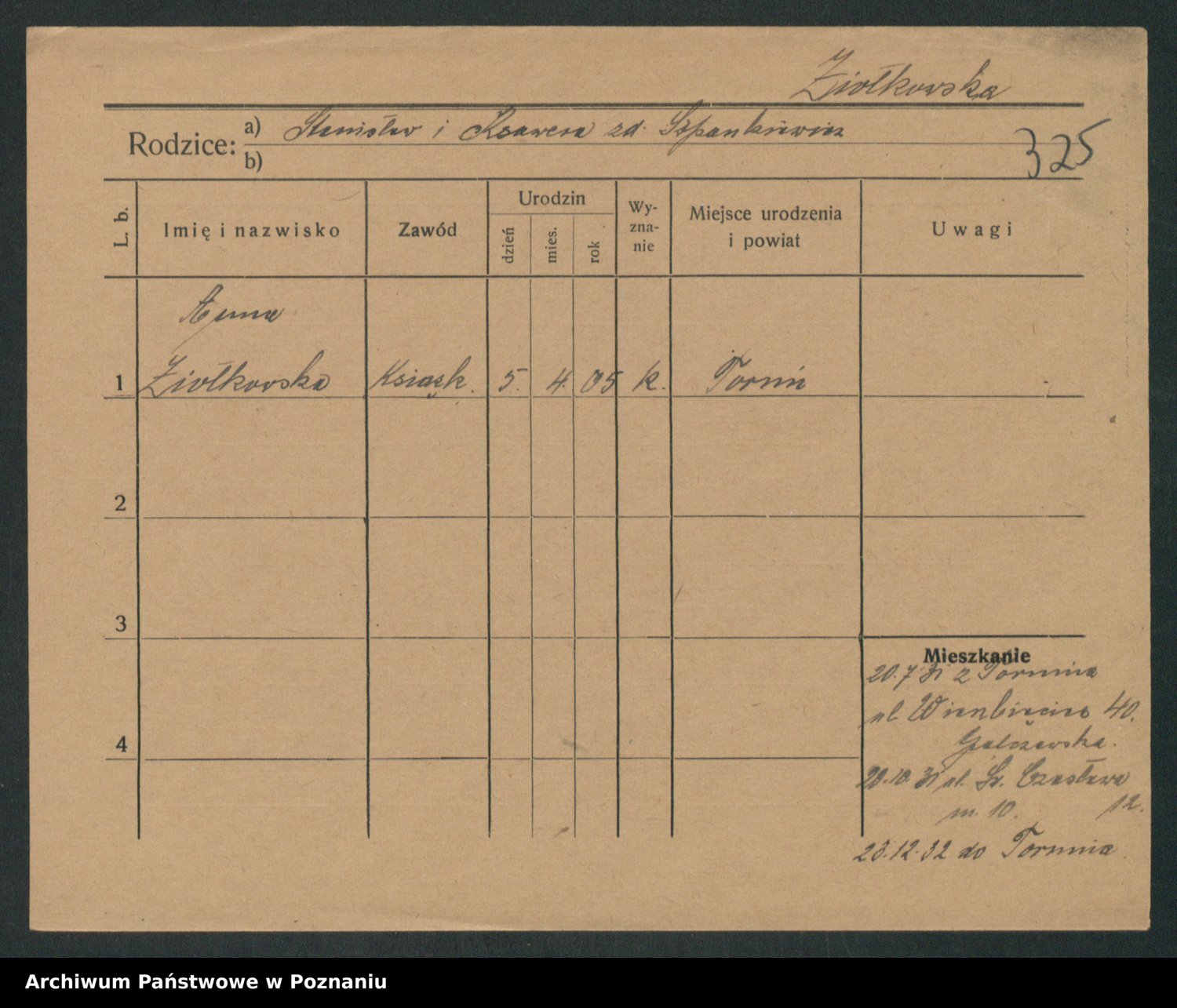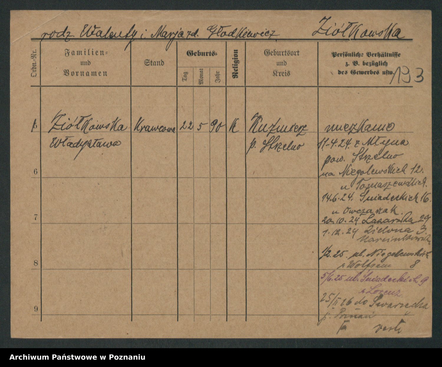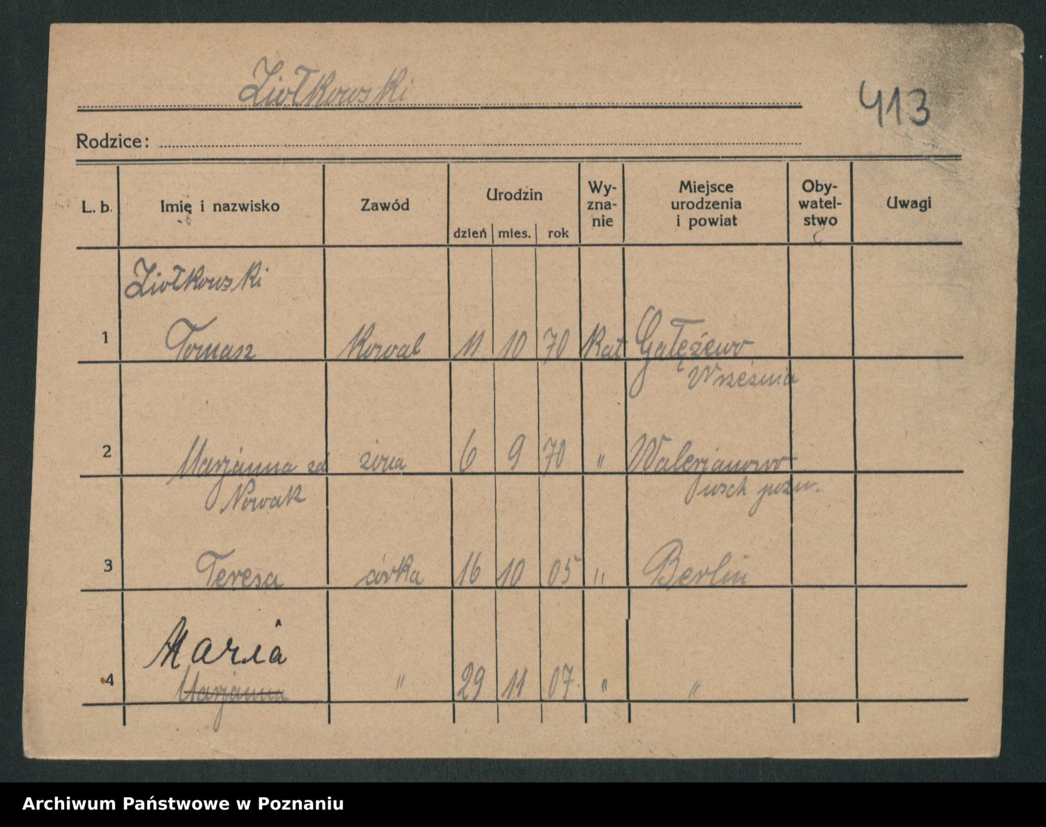 Podgląd karty osobowej dostępny jest po kliknięciu na nazwisko lub ikonkę karty. Można dokonywać powiększenia (ikony na górze) lub przechodzić między kolejnymi skanami (strzałki po bokach).