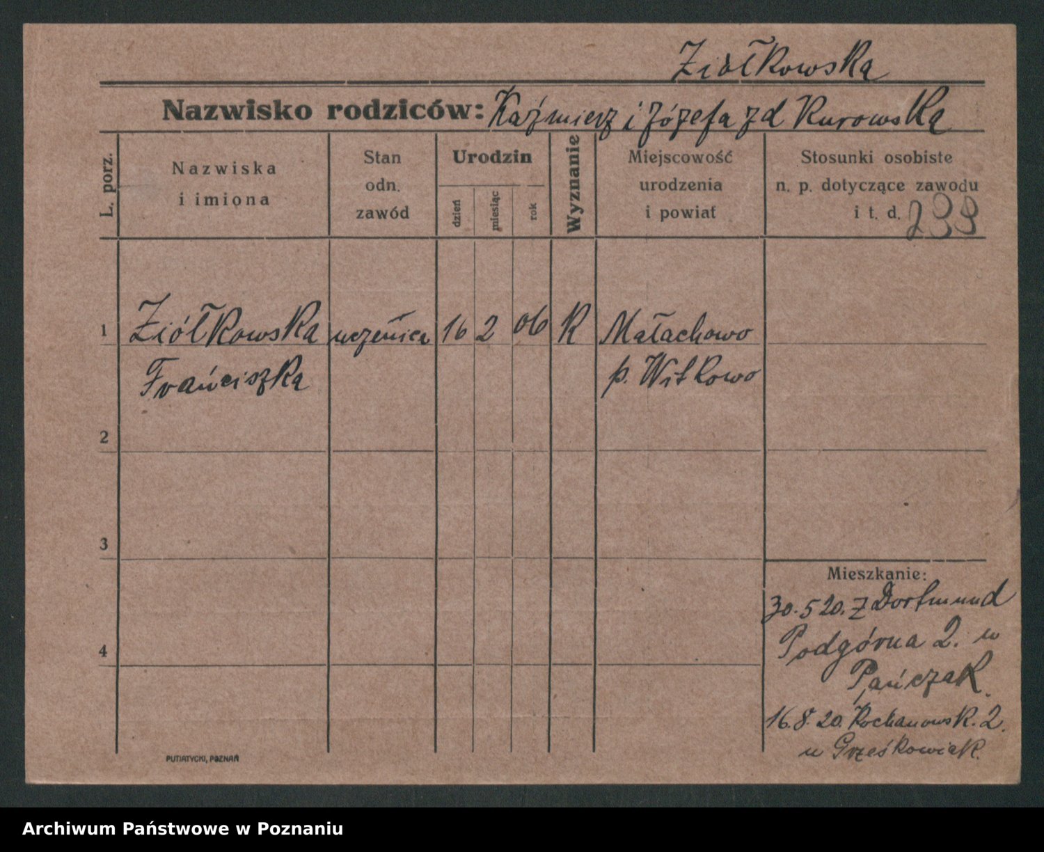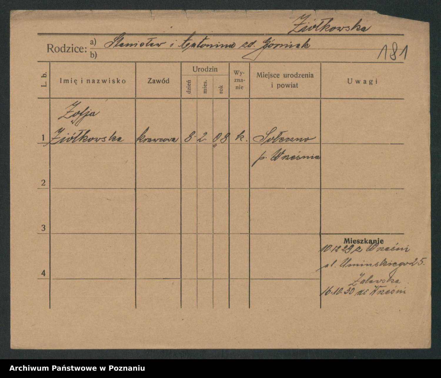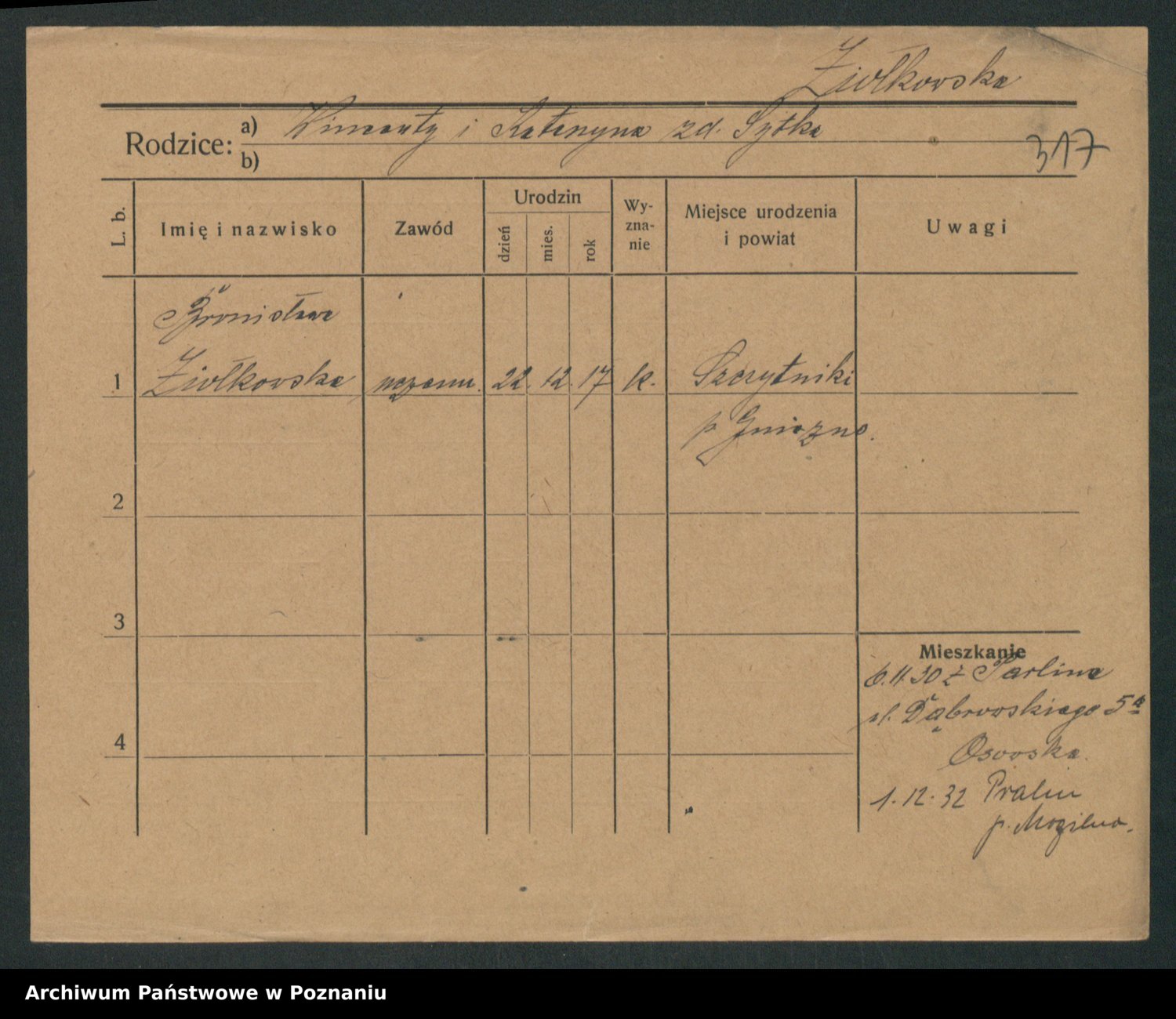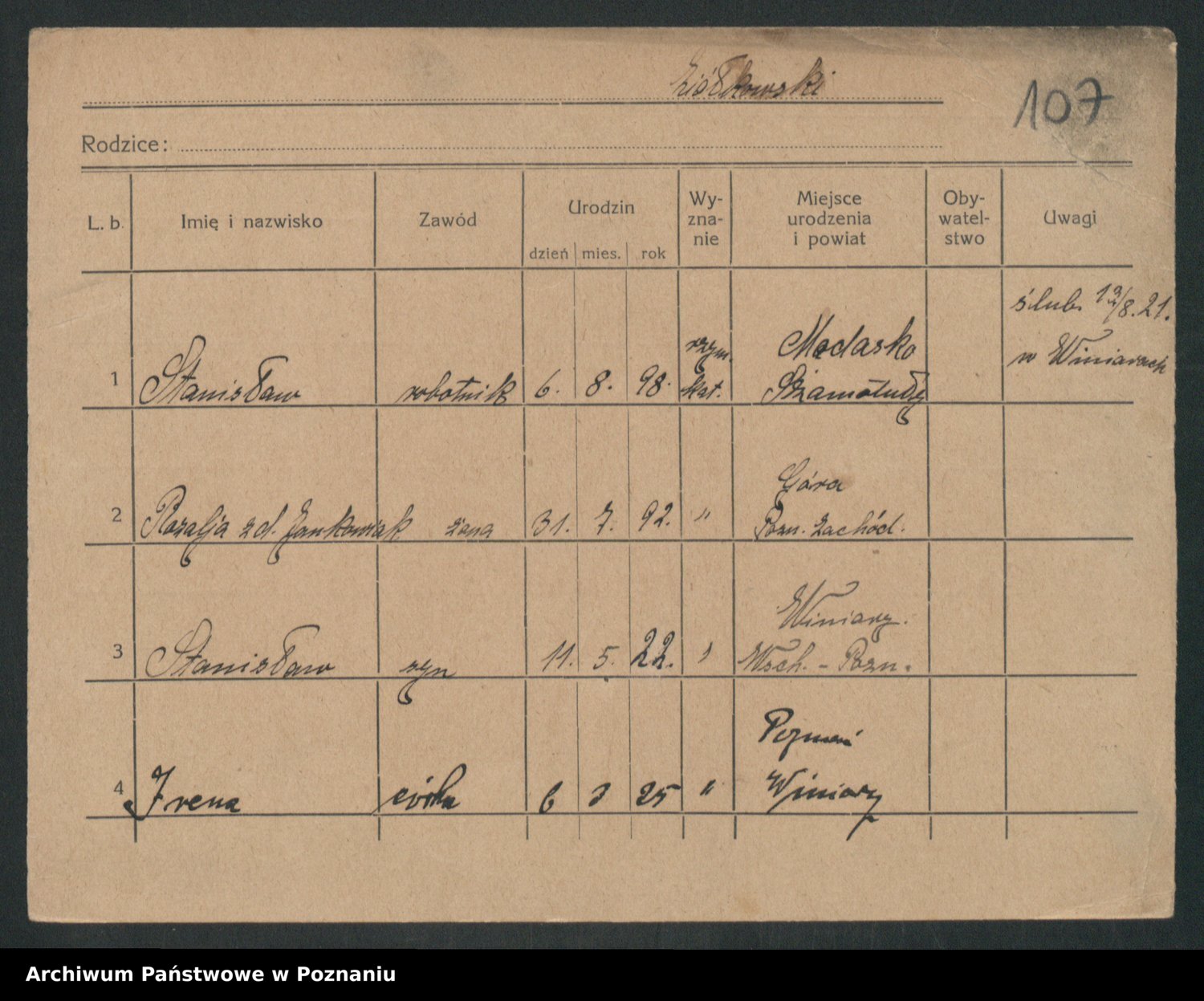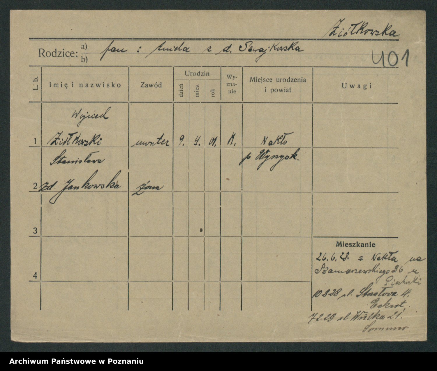 Podgląd karty osobowej dostępny jest po kliknięciu na nazwisko lub ikonkę karty. Można dokonywać powiększenia (ikony na górze) lub przechodzić między kolejnymi skanami (strzałki po bokach).