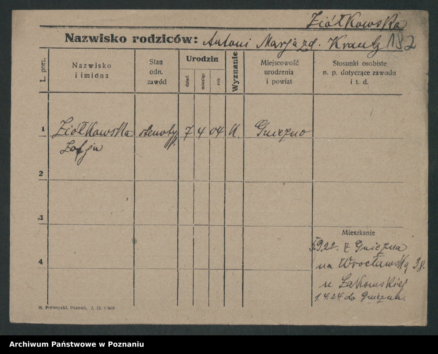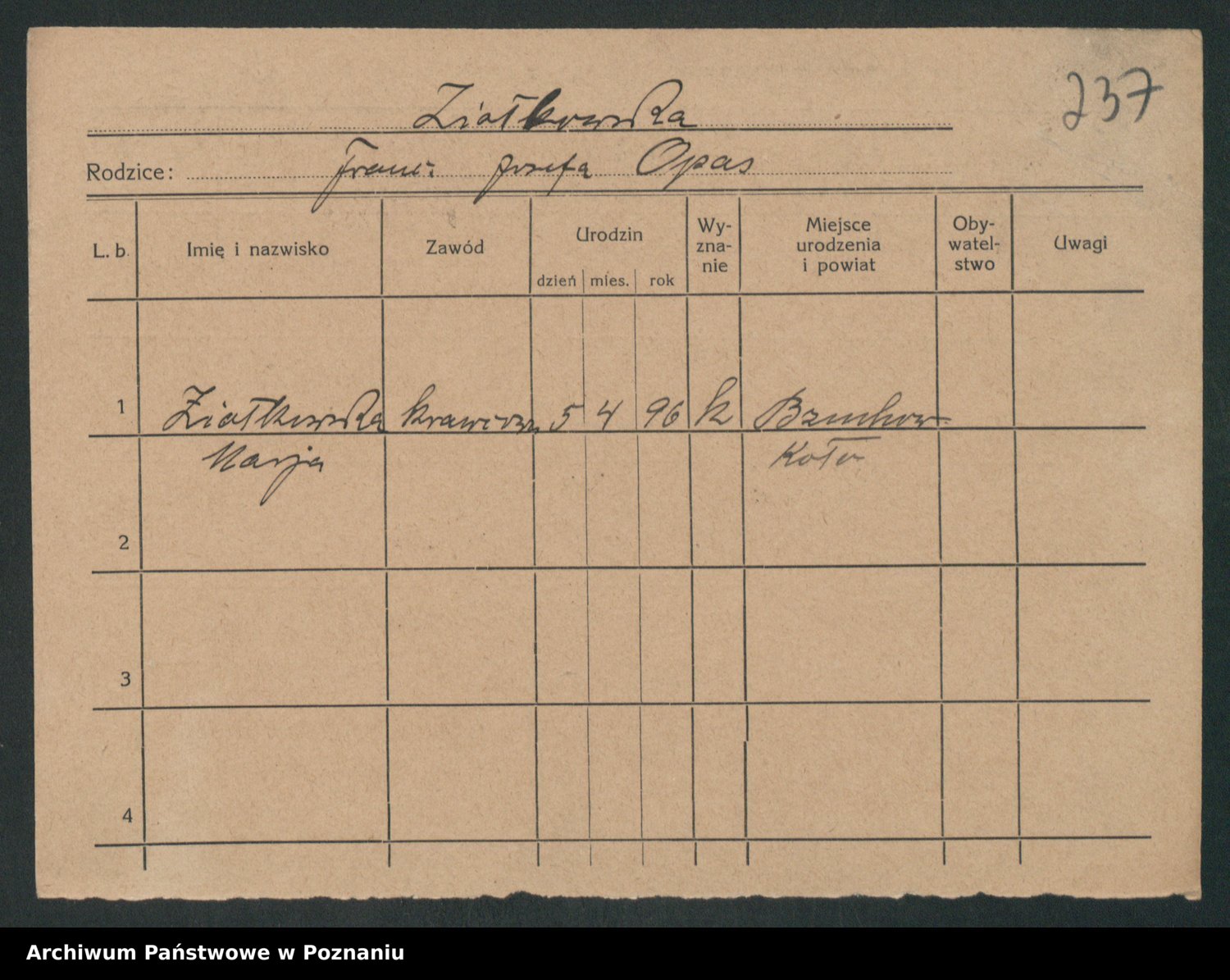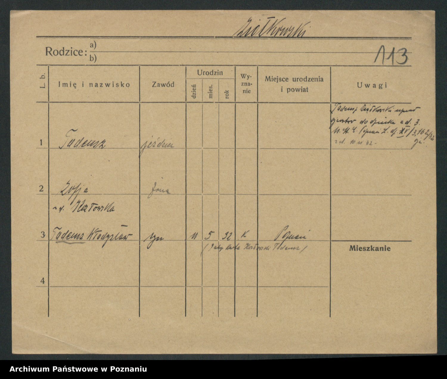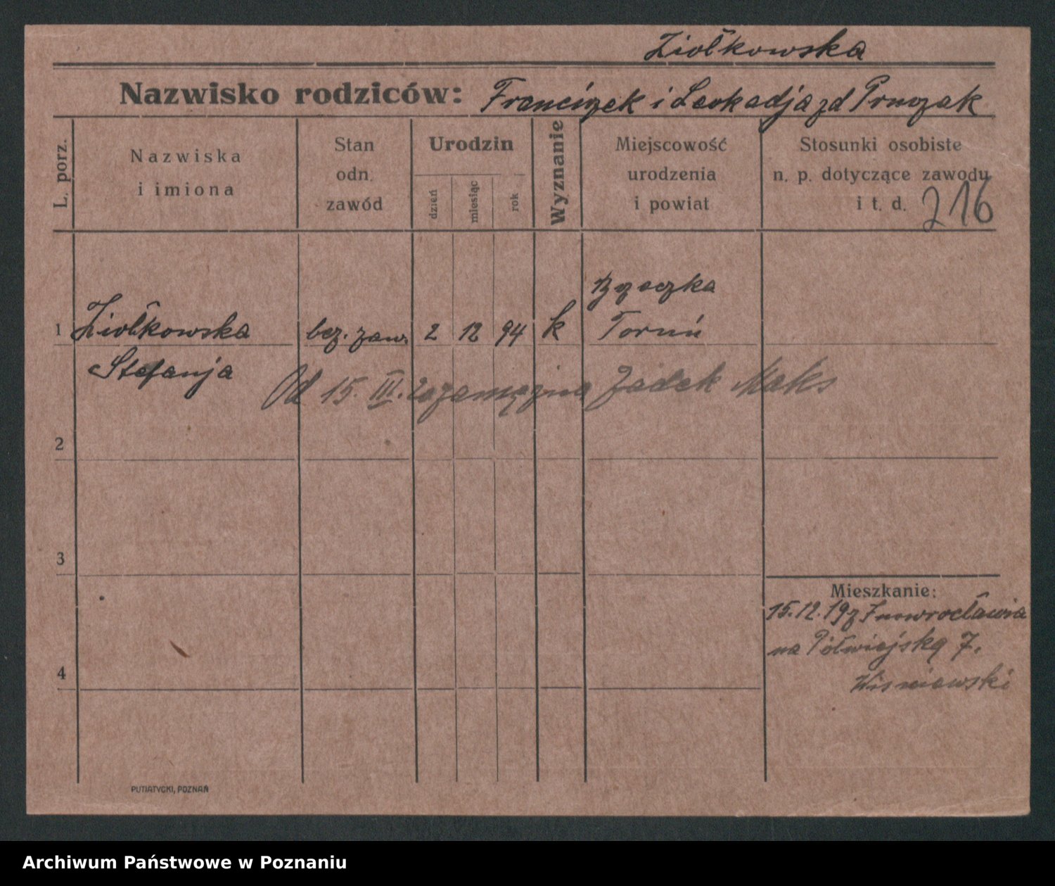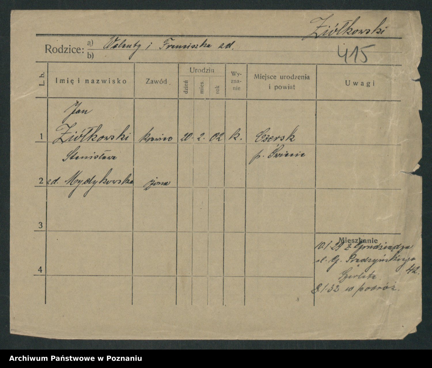 Podgląd karty osobowej dostępny jest po kliknięciu na nazwisko lub ikonkę karty. Można dokonywać powiększenia (ikony na górze) lub przechodzić między kolejnymi skanami (strzałki po bokach).