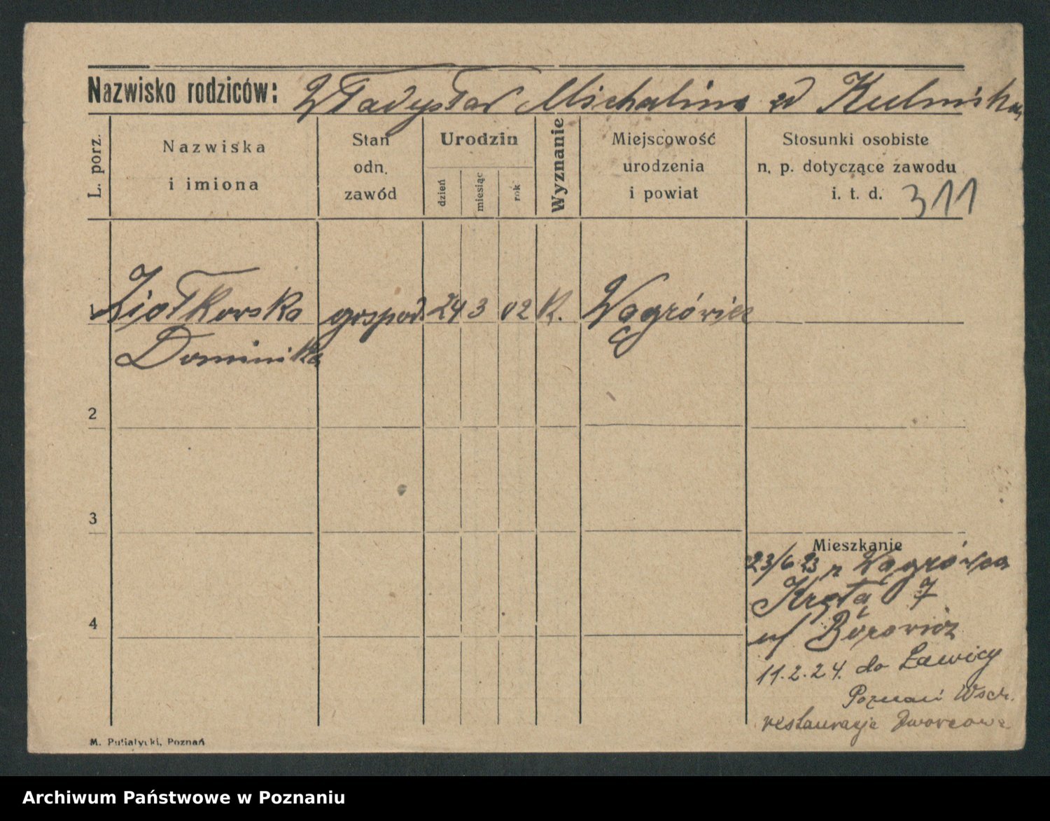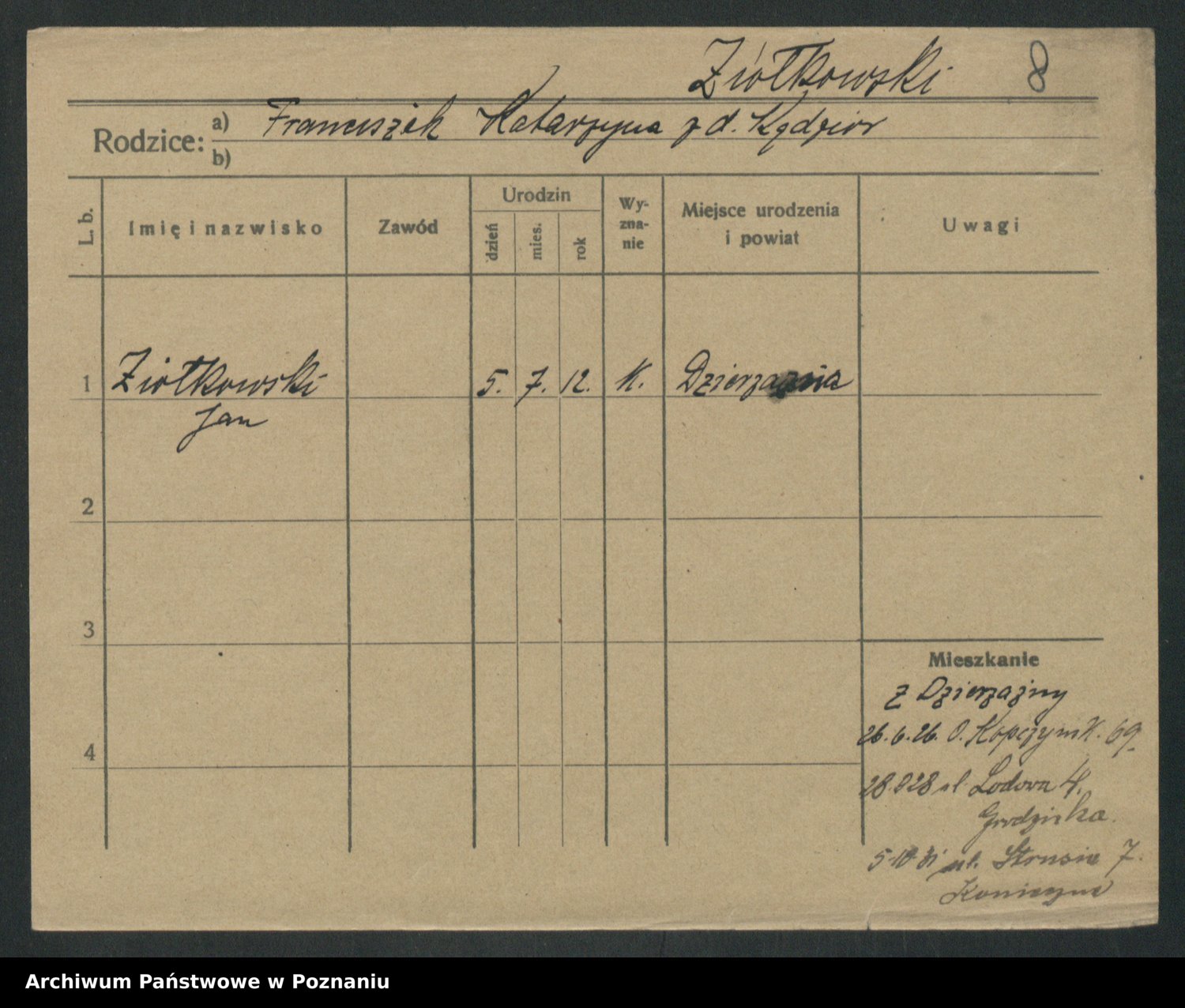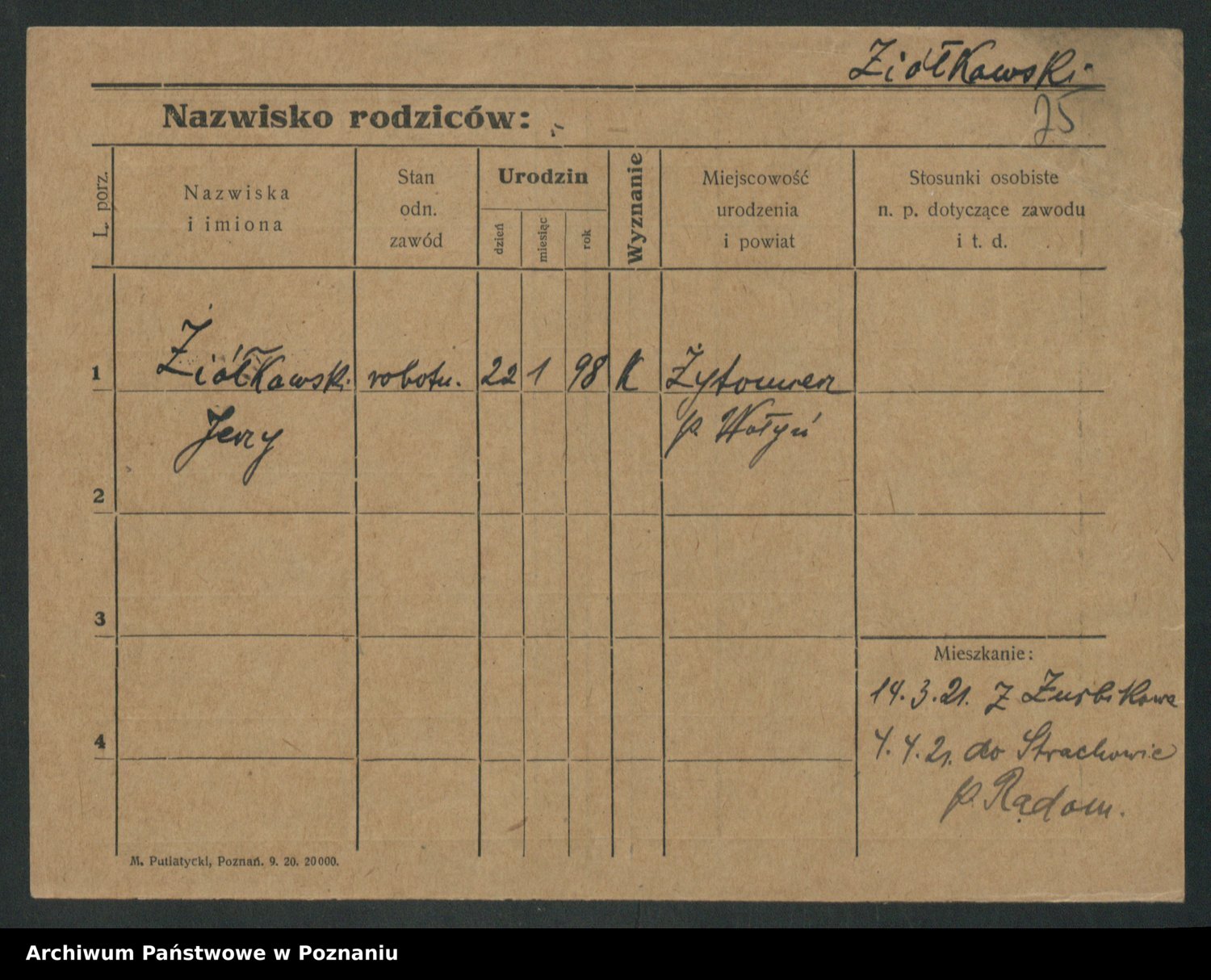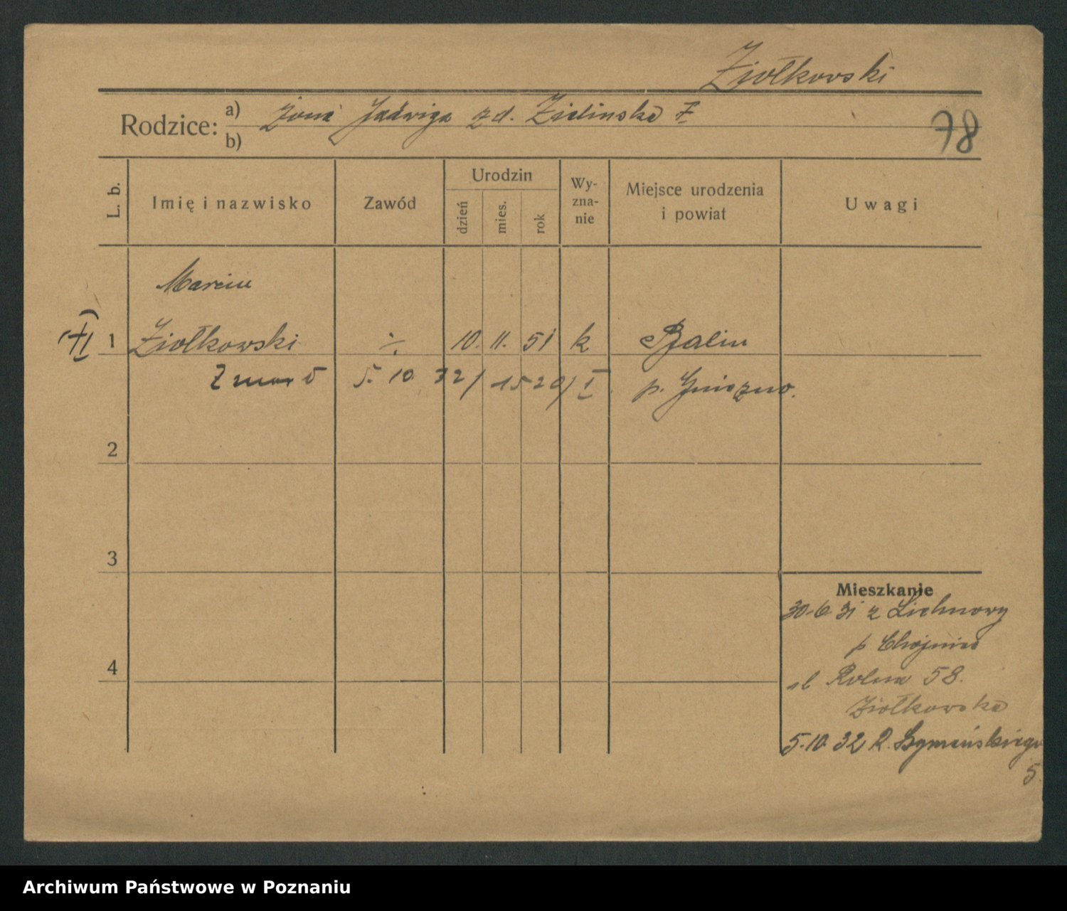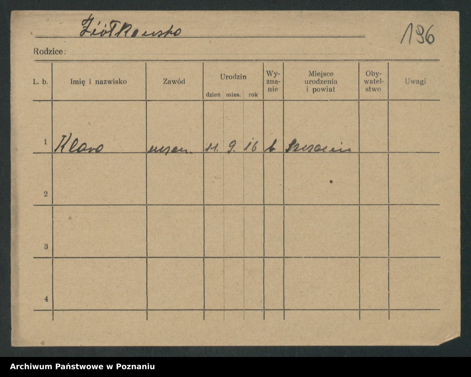 Podgląd karty osobowej dostępny jest po kliknięciu na nazwisko lub ikonkę karty. Można dokonywać powiększenia (ikony na górze) lub przechodzić między kolejnymi skanami (strzałki po bokach).