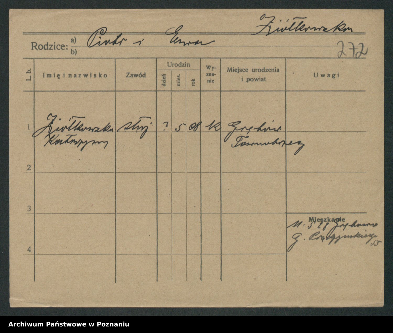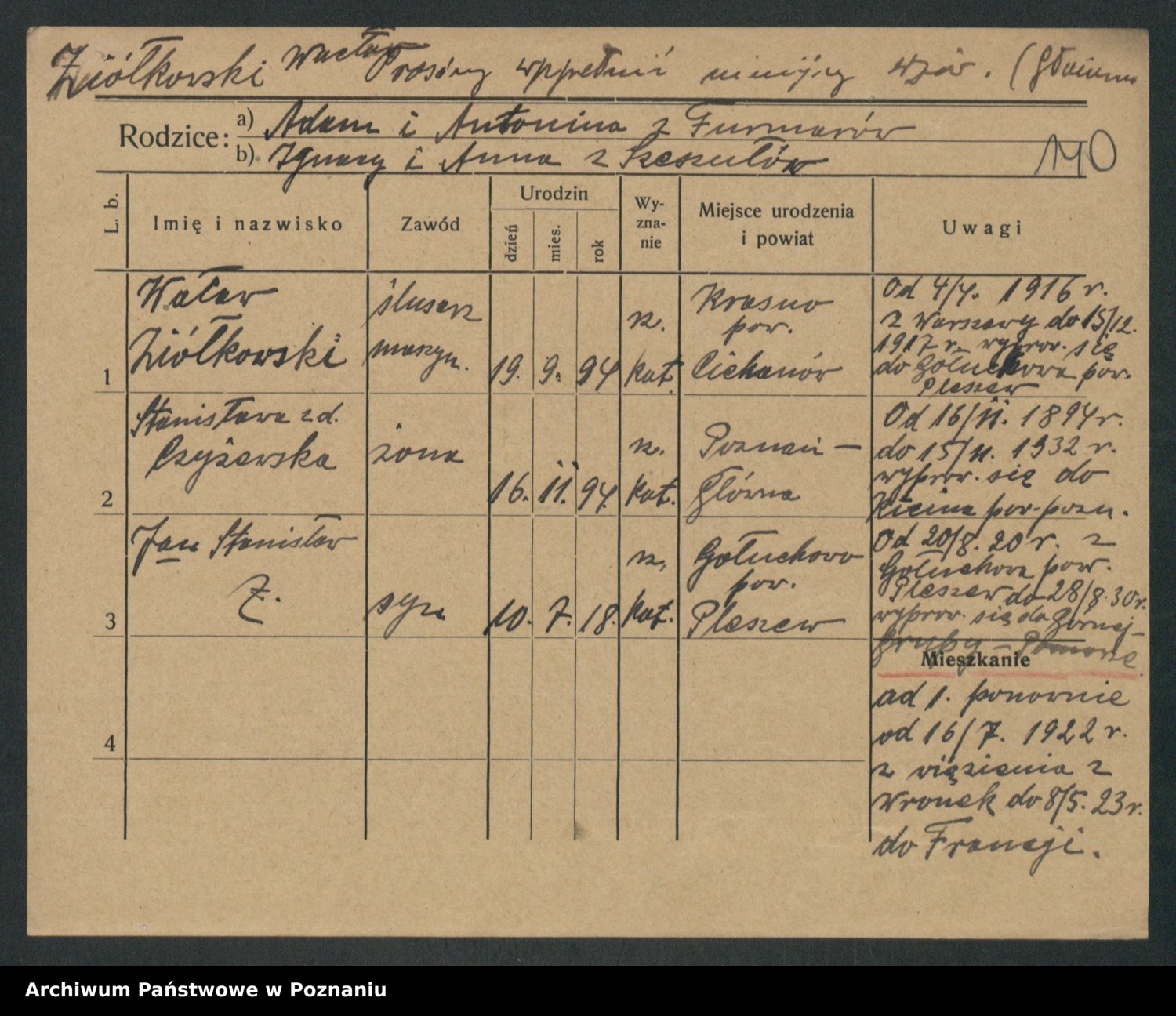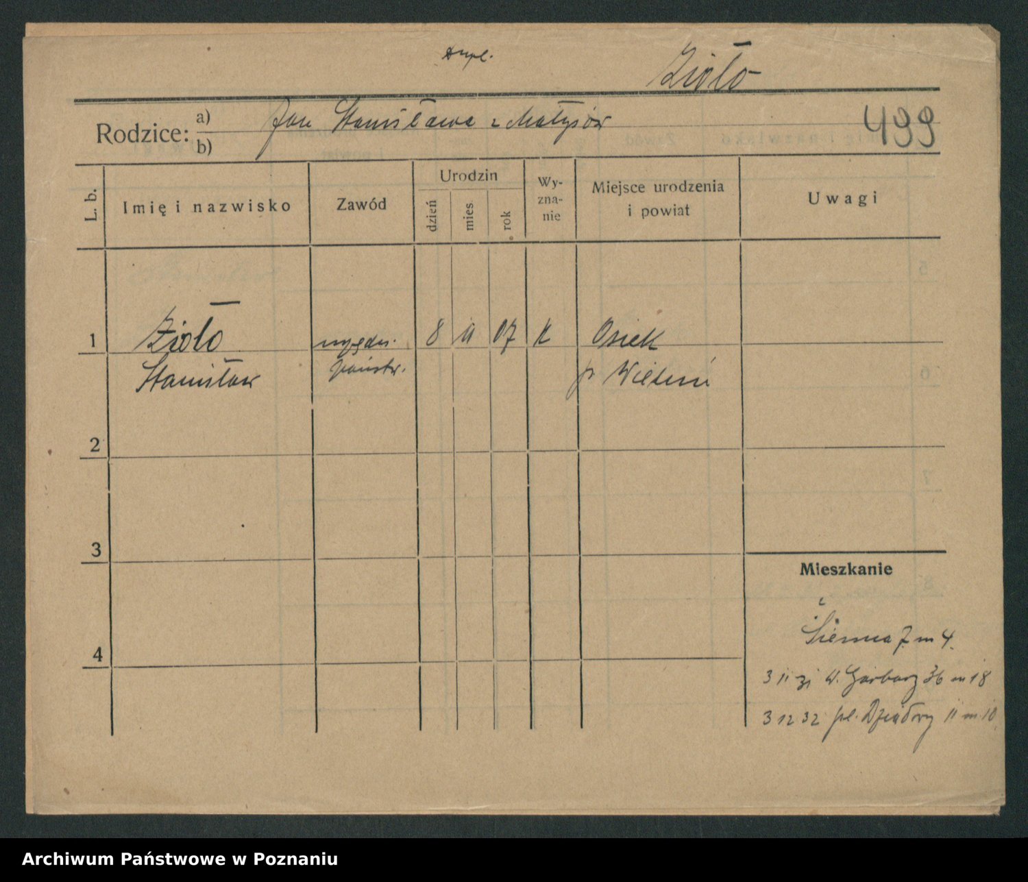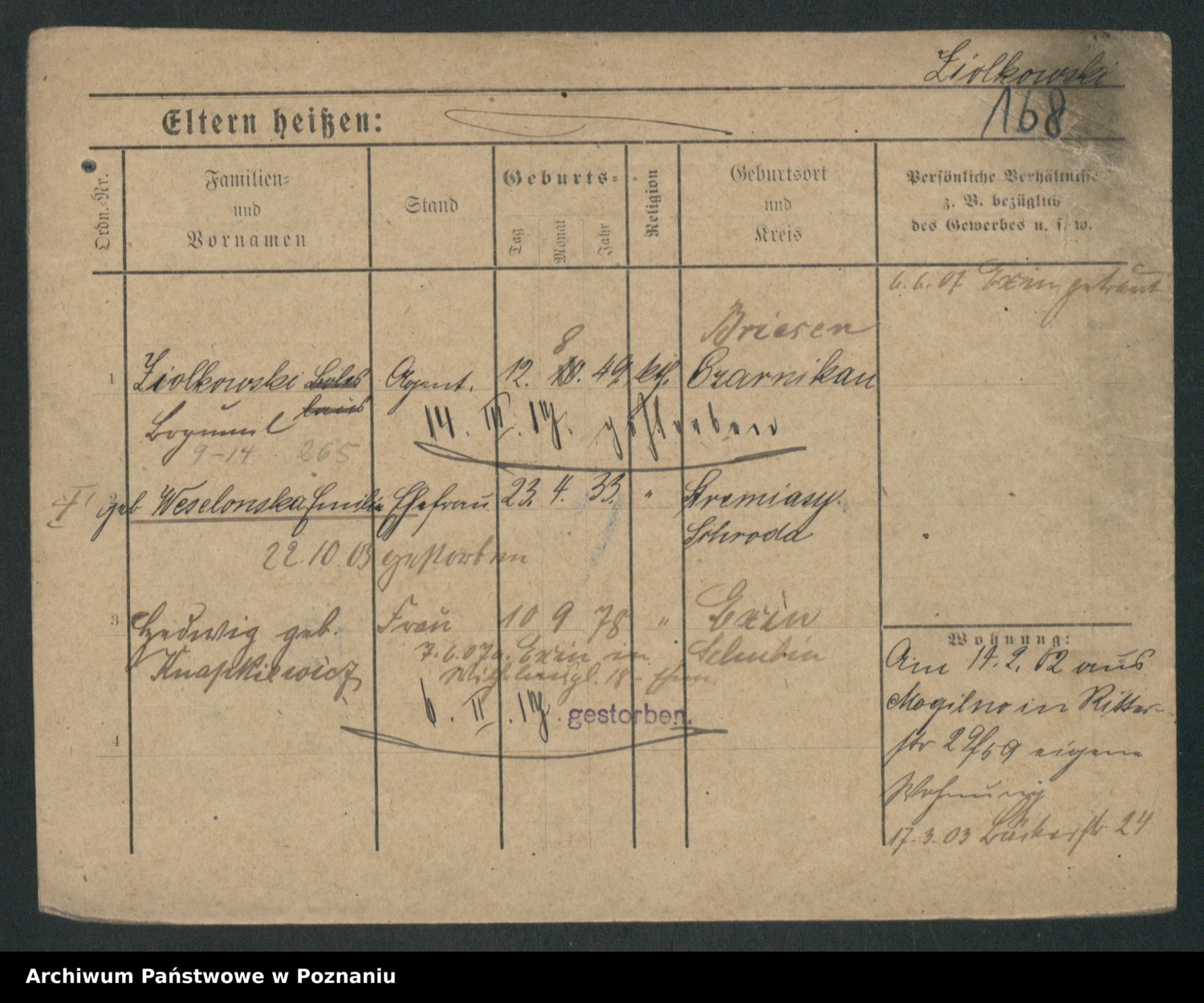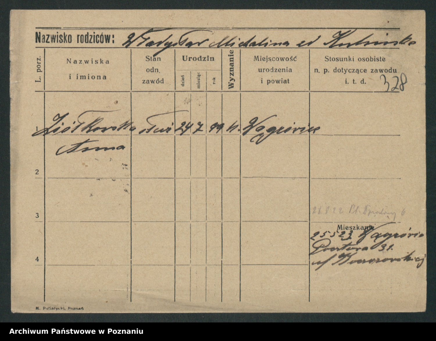 Podgląd karty osobowej dostępny jest po kliknięciu na nazwisko lub ikonkę karty. Można dokonywać powiększenia (ikony na górze) lub przechodzić między kolejnymi skanami (strzałki po bokach).