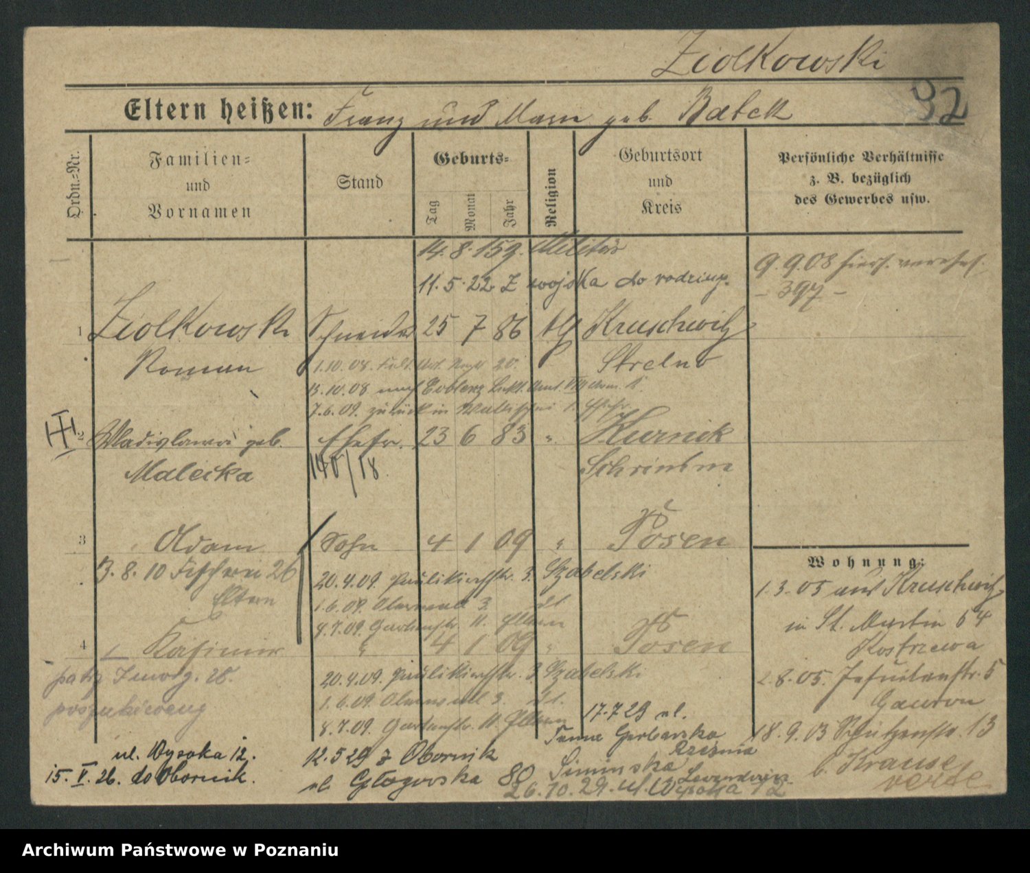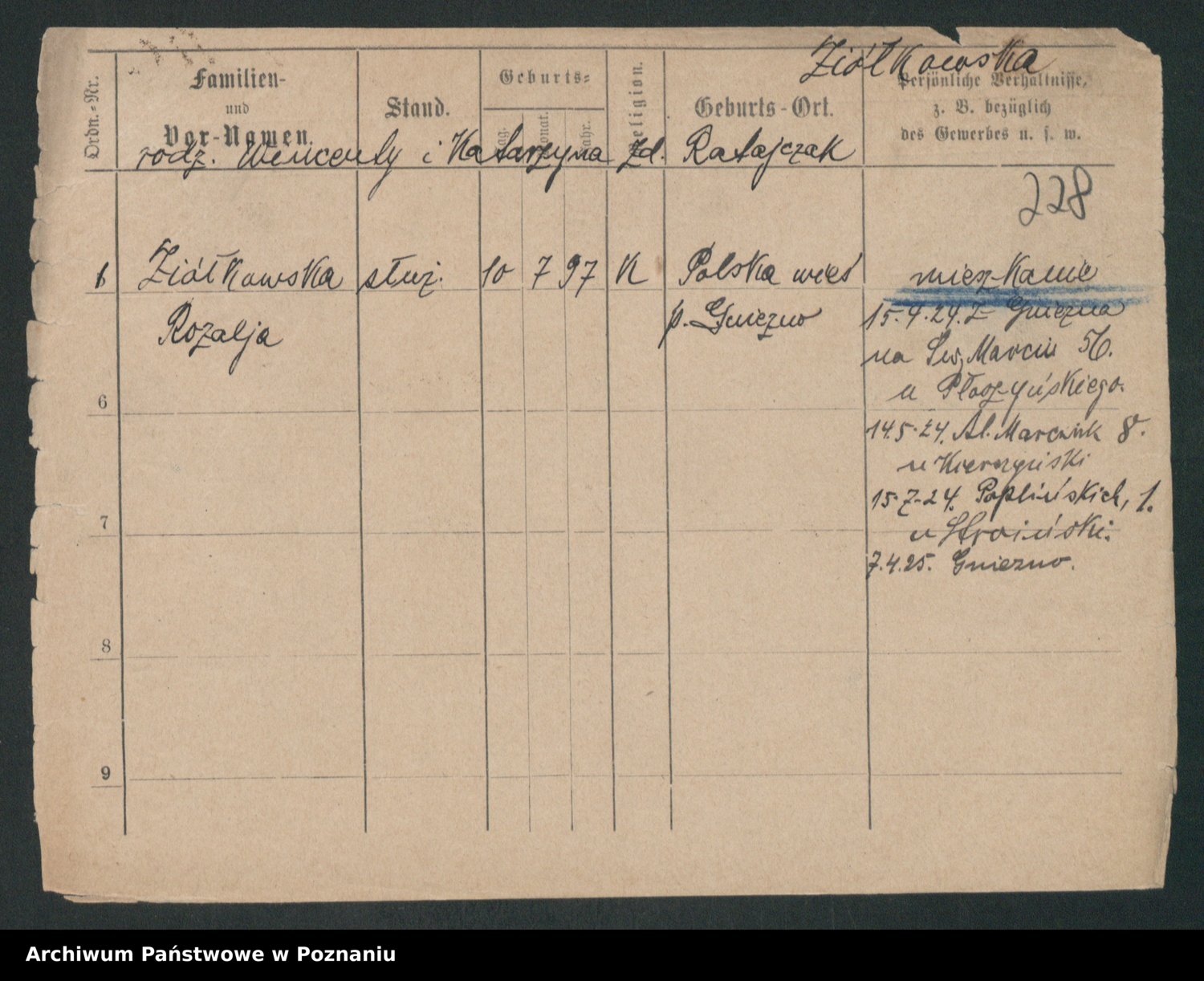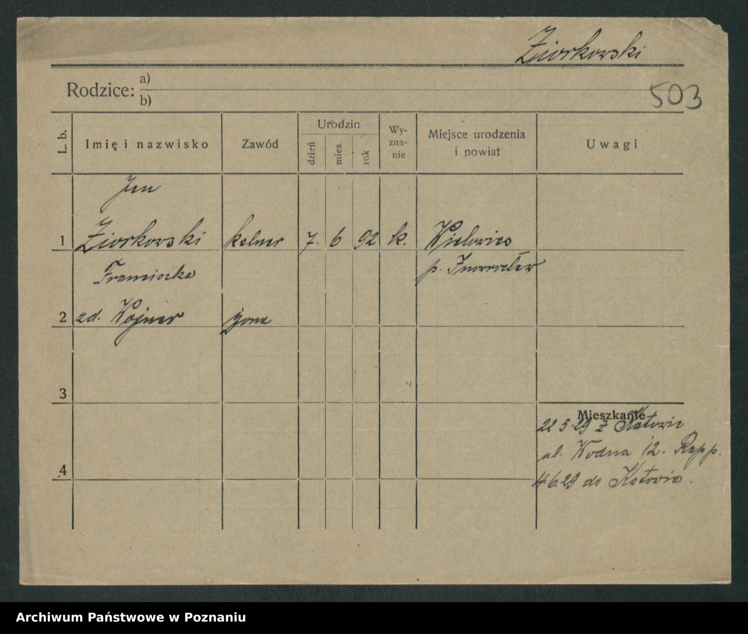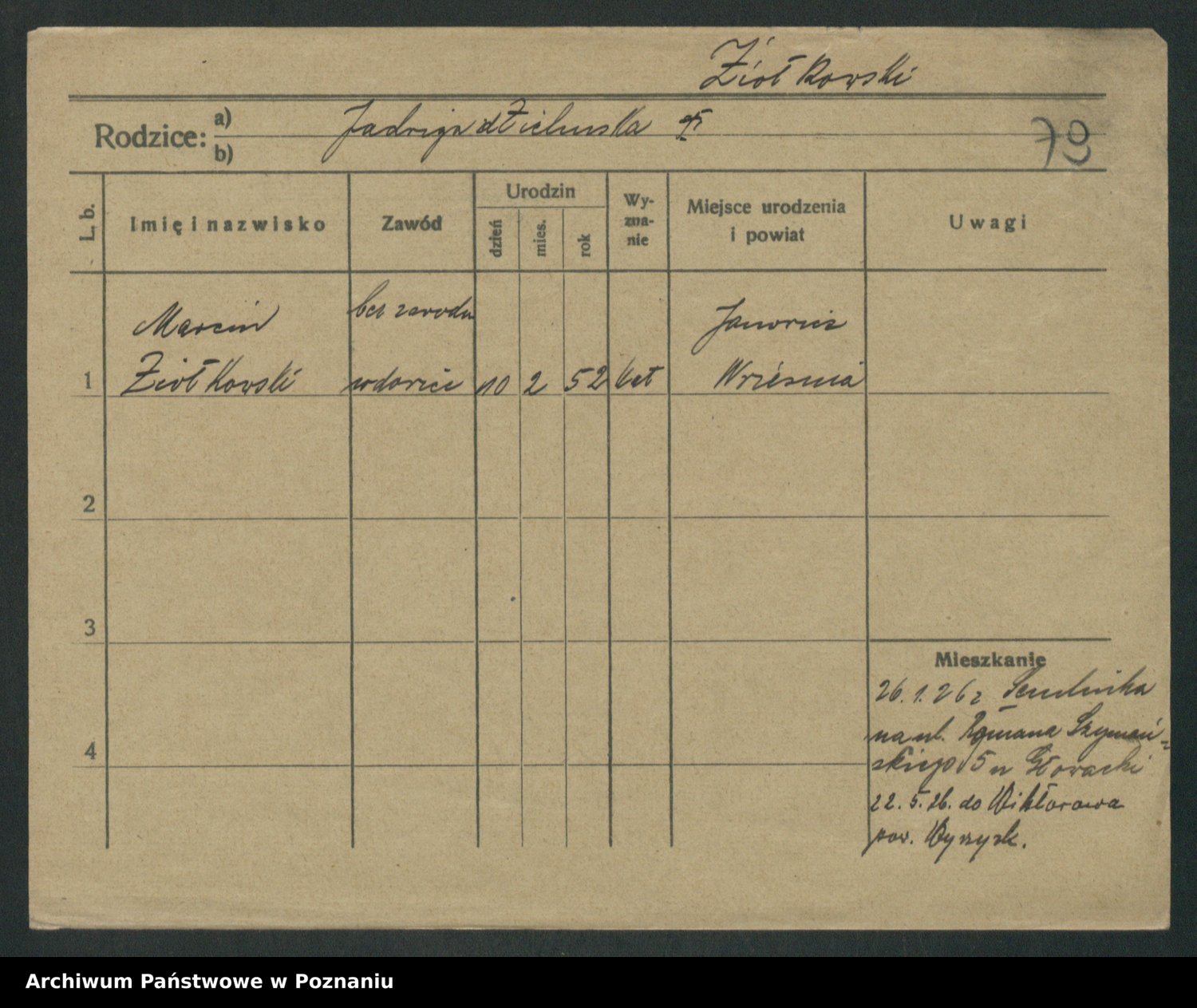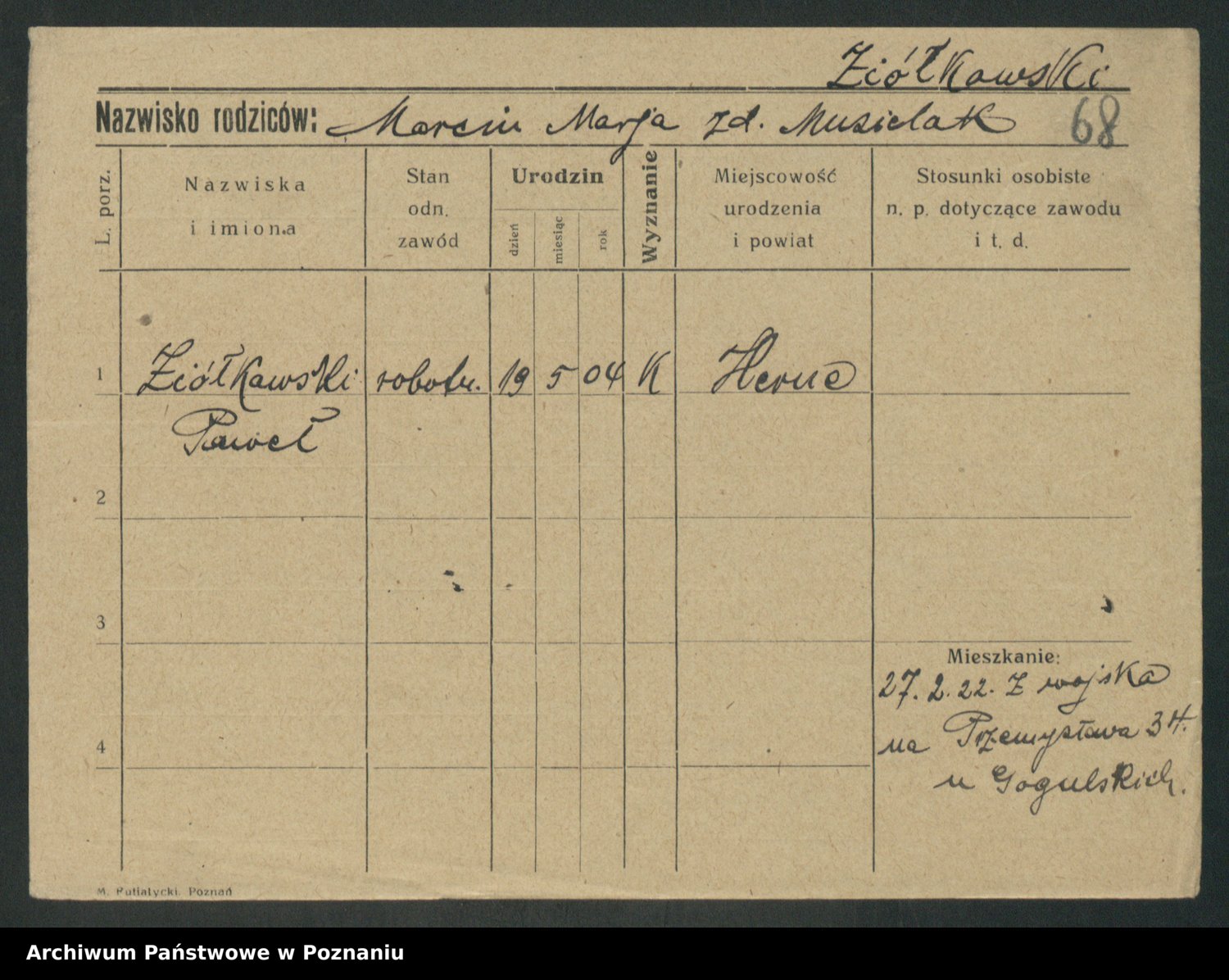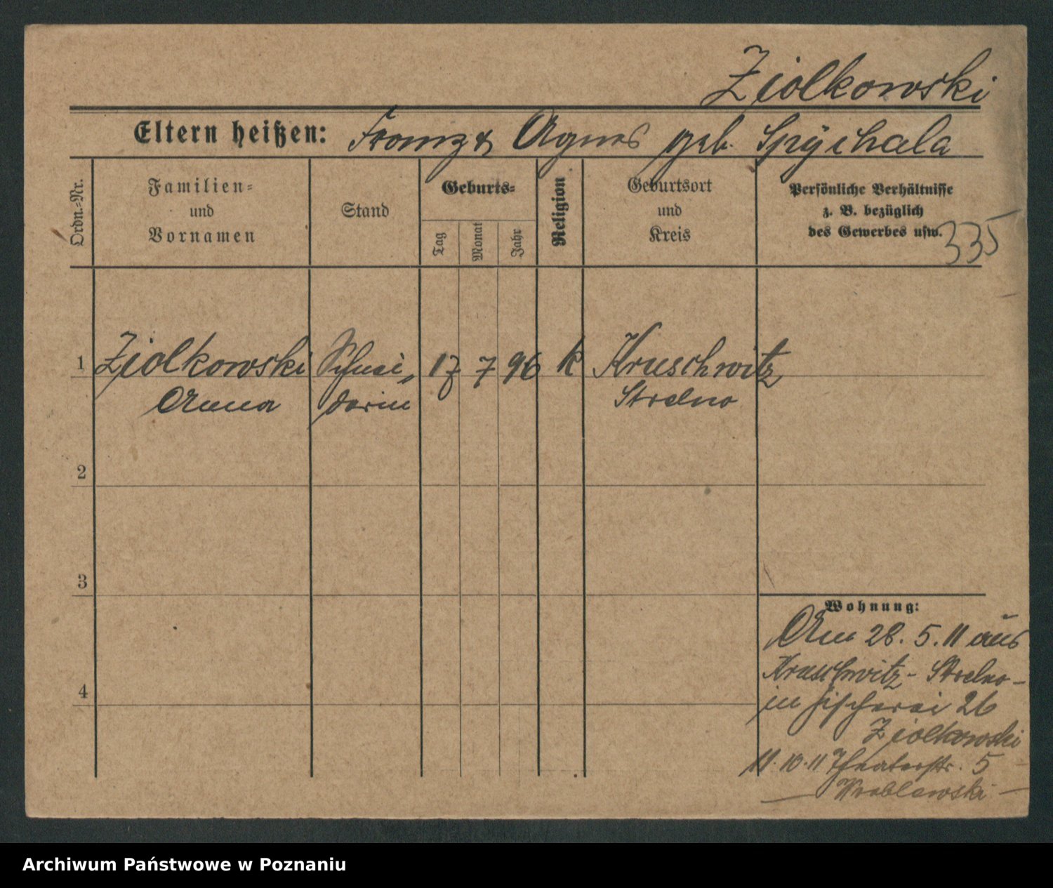 Podgląd karty osobowej dostępny jest po kliknięciu na nazwisko lub ikonkę karty. Można dokonywać powiększenia (ikony na górze) lub przechodzić między kolejnymi skanami (strzałki po bokach).